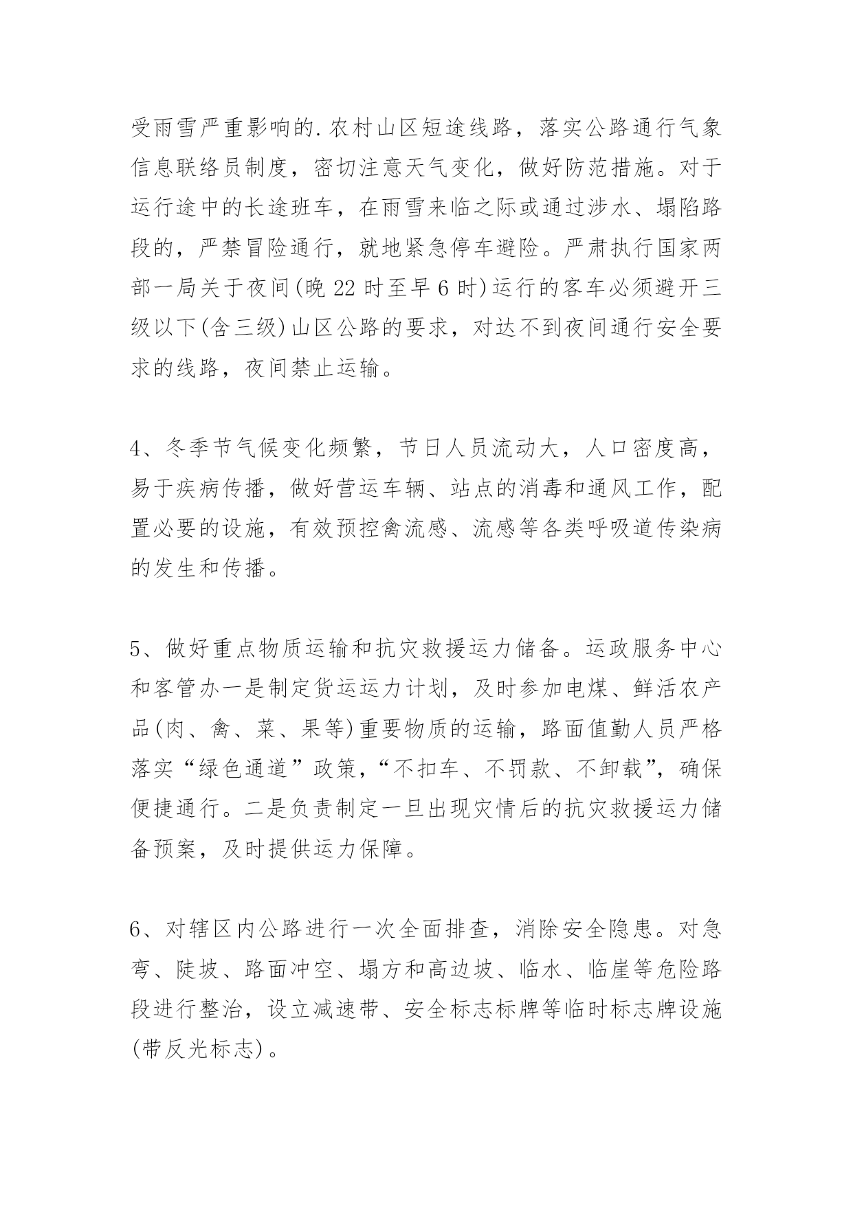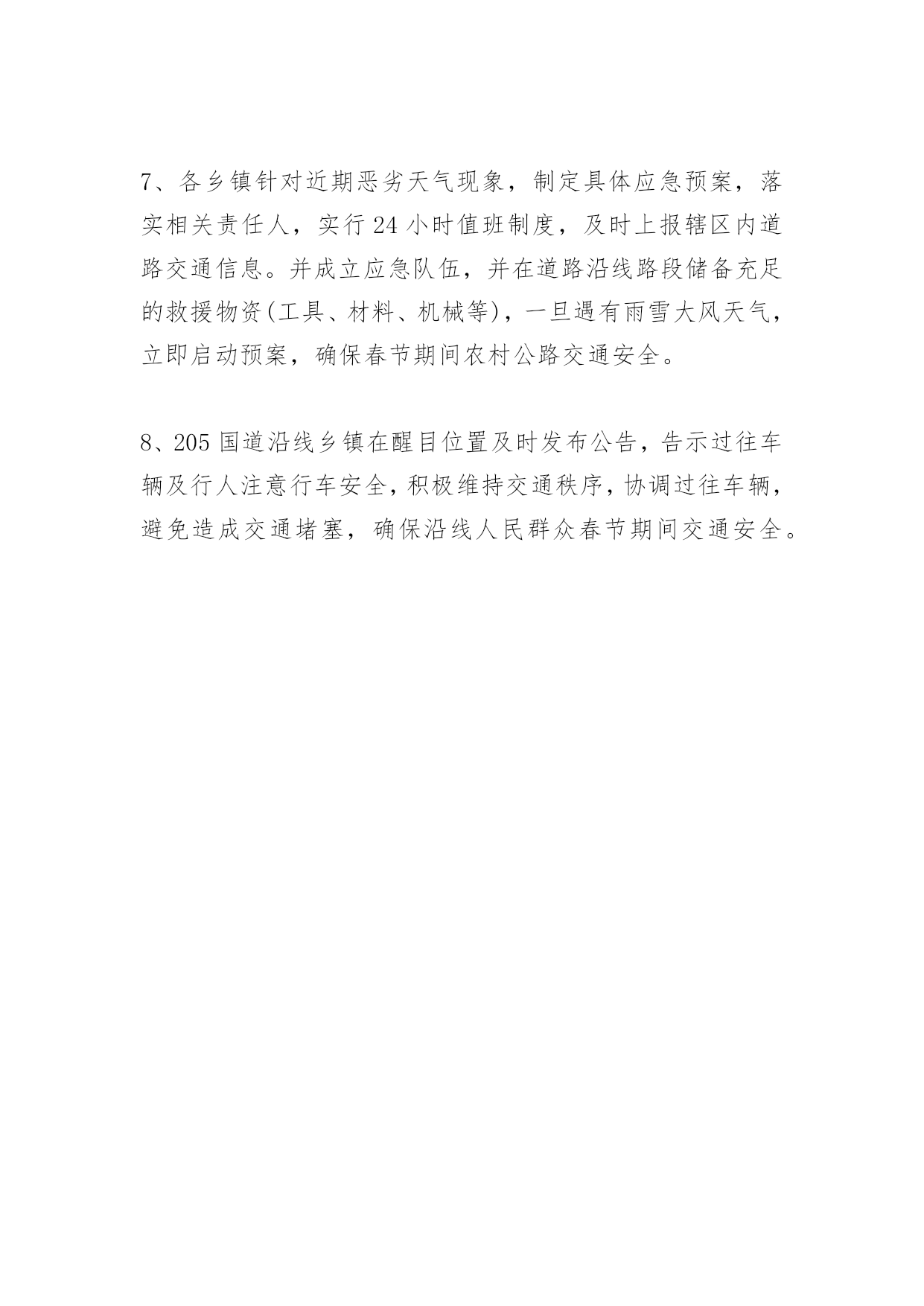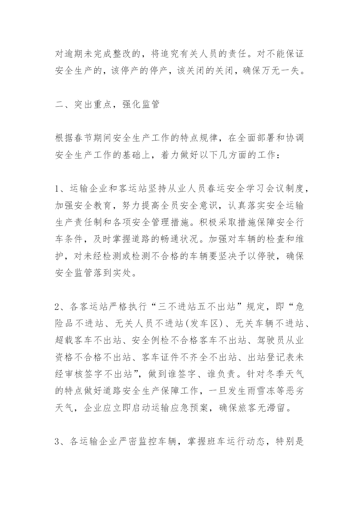 春节期间交通情况汇报春节期间交通情况汇报根据区委、区政府关于春节期间安全生产工作会议的精神,我局高度重视,召开专题会议认真研究部署节日期间的稳定和安全工作。现将有关情况汇报如下:一、领导重视,超前部署为切实做好春节期间的交通安全工作,先后制定下发了《关于开展交通系统春节前安全生产大检查的通知》、《关于认真做好2010年度春运工作的通知》、《关于做好近期防范恶劣天气确保运输安全的通知》、《**市**区紧急物资运输保障应急预案》等文件,要求将安全生产工作摆在突出位置,落实节日期间各项安全生产工作措施,着力创造和谐安定的节日氛围,同时对做好恶劣天气安全生产工作作出周密部署,要求系统各单位主要负责人作为安全生产第一责任人,全力确保节日期间安全生产。按照归口管理、分级负责的原则,在区交通系统范围内开展一次安全生产大检查活动,突出抓好道路交通、水上交通、危化品和烟花爆竹运输、森林防火、建筑施工等重点领域的安全生产工作。要求各责任单位对检查出的问题和事故隐患,严格按照“明确整改措施,明确整改时间,明确整改责任人”的原则进行整改,对短期内难以整改的,要采取有效防范措施,加强监控并及时跟踪落实。对逾期未完成整改的,将追究有关人员的责任。对不能保证安全生产的,该停产的停产,该关闭的关闭,确保万无一失。二、突出重点,强化监管根据春节期间安全生产工作的特点规律,在全面部署和协调安全生产工作的基础上,着力做好以下几方面的工作:1、运输企业和客运站坚持从业人员春运安全学习会议制度,加强安全教育,努力提高全员安全意识,认真落实安全运输生产责任制和各项安全管理措施。积极采取措施保障安全行车条件,及时掌握道路的畅通状况。加强对车辆的检查和维护,对未经检测或检测不合格的车辆要坚决予以停驶,确保安全监管落到实处。2、各客运站严格执行“三不进站五不出站”规定,即“危险品不进站、无关人员不进站(发车区)、无关车辆不进站、超载客车不出站、安全例检不合格客车不出站、驾驶员从业资格不合格不出站、客车证件不齐全不出站、出站登记表未经审核签字不出站”,做到谁签字、谁负责。针对冬季天气的特点做好道路安全生产保障工作,一旦发生雨雪冻等恶劣天气,企业应立即启动运输应急预案,确保旅客无滞留。3、各运输企业严密监控车辆,掌握班车运行动态,特别是受雨雪严重影响的.农村山区短途线路,落实公路通行气象信息联络员制度,密切注意天气变化,做好防范措施。对于运行途中的长途班车,在雨雪来临之际或通过涉水、塌陷路段的,严禁冒险通行,就地紧急停车避险。严肃执行国家两部一局关于夜间(晚22时至早6时)运行的客车必须避开三级以下(含三级)山区公路的要求,对达不到夜间通行安全要求的线路,夜间禁止运输。4、冬季节气候变化频繁,节日人员流动大,人口密度高,易于疾病传播,做好营运车辆、站点的消毒和通风工作,配置必要的设施,有效预控禽流感、流感等各类呼吸道传染病的发生和传播。5、做好重点物质运输和抗灾救援运力储备。运政服务中心和客管办一是制定货运运力计划,及时参加电煤、鲜活农产品(肉、禽、菜、果等)重要物质的运输,路面值勤人员严格落实“绿色通道”政策,“不扣车、不罚款、不卸载”,确保便捷通行。二是负责制定一旦出现灾情后的抗灾救援运力储备预案,及时提供运力保障。6、对辖区内公路进行一次全面排查,消除安全隐患。对急弯、陡坡、路面冲空、塌方和高边坡、临水、临崖等危险路段进行整治,设立减速带、安全标志标牌等临时标志牌设施(带反光标志)。7、各乡镇针对近期恶劣天气现象,制定具体应急预案,落实相关责任人,实行24小时值班制度,及时上报辖区内道路交通信息。并成立应急队伍,并在道路沿线路段储备充足的救援物资(工具、材料、机械等),一旦遇有雨雪大风天气,立即启动预案,确保春节期间农村公路交通安全。8、205国道沿线乡镇在醒目位置及时发布公告,告示过往车辆及行人注意行车安全,积极维持交通秩序,协调过往车辆,避免造成交通堵塞,确保沿线人民群众春节期间交通安全。