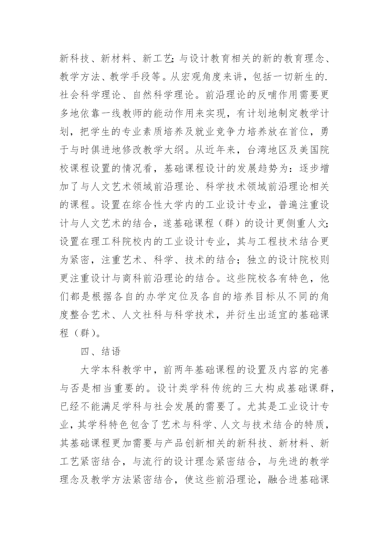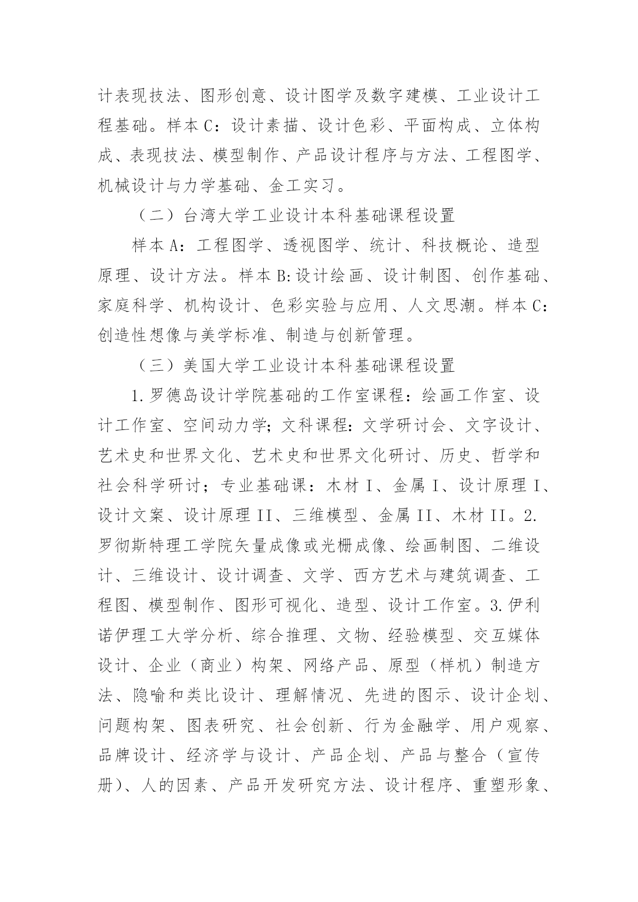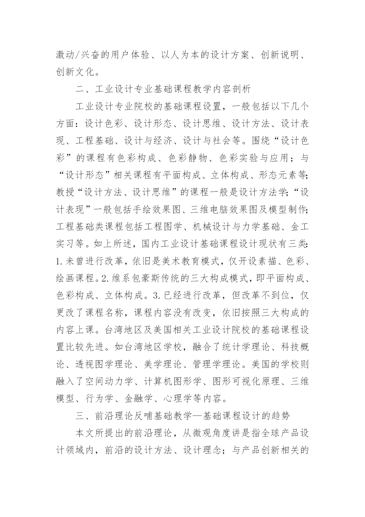 工业设计基础课程设计教学的趋势论文摘要:工业设计专业基础课程,在整个本科教育阶段,占有相当重要的地位。传统三大构成课程体系,已经不能满足学科发展的要求以及社会对于人才专业素质的需求了。本文运用比较研究的方法,对国内外工业设计院校基础课程的设计做了调研分析,探究了基础课程设计的趋势,发现艺术、人文社科与科学技术领域的前沿理论,被有机地整合进基础课程的教学,即前沿理论反哺基础教学。通过合理的课程设计,引导学生从艺术走向设计,从象牙塔走向社会与市场。关键词:前沿理论;基础教学;工业设计在教学过程中我们发现,传统三大构成基础课程模式培养出来的同学,在中高年级阶段切入专业的速度较慢,即基础课程与专业课程的衔接不够流畅,出现了基础课的老师不触及专业内容,专业课的老师又很难拔高的现象,影响了学生们专业的学习深度与精度,也削弱了学生们的就业竞争力。于是,我们开始思考基础教学的改革问题。我们用比较研究的方法对国内外工业设计领域中较有代表性的院校的基础课程做了调研与分析,初步形成一些观点。一、工业设计专业基础课程群教学概况(一)国内大学工业设计本科基础课程设置样本A:素描、视觉语言、形态研究、色彩静物、图案基础、平面设计表达、立体设计表达、造型基础、金工实习。样本B:基础素描与色彩、设计素描与色彩、设计速写、设计表现技法、图形创意、设计图学及数字建模、工业设计工程基础。样本C:设计素描、设计色彩、平面构成、立体构成、表现技法、模型制作、产品设计程序与方法、工程图学、机械设计与力学基础、金工实习。(二)台湾大学工业设计本科基础课程设置样本A:工程图学、透视图学、统计、科技概论、造型原理、设计方法。样本B:设计绘画、设计制图、创作基础、家庭科学、机构设计、色彩实验与应用、人文思潮。样本C:创造性想像与美学标准、制造与创新管理。(三)美国大学工业设计本科基础课程设置1.罗德岛设计学院基础的工作室课程:绘画工作室、设计工作室、空间动力学;文科课程:文学研讨会、文字设计、艺术史和世界文化、艺术史和世界文化研讨、历史、哲学和社会科学研讨;专业基础课:木材I、金属I、设计原理I、设计文案、设计原理II、三维模型、金属II、木材II。2.罗彻斯特理工学院矢量成像或光栅成像、绘画制图、二维设计、三维设计、设计调查、文学、西方艺术与建筑调查、工程图、模型制作、图形可视化、造型、设计工作室。3.伊利诺伊理工大学分析、综合推理、文物、经验模型、交互媒体设计、企业(商业)构架、网络产品、原型(样机)制造方法、隐喻和类比设计、理解情况、先进的图示、设计企划、问题构架、图表研究、社会创新、行为金融学、用户观察、品牌设计、经济学与设计、产品企划、产品与整合(宣传册)、人的因素、产品开发研究方法、设计程序、重塑形象、激动/兴奋的用户体验、以人为本的设计方案、创新说明、创新文化。二、工业设计专业基础课程教学内容剖析工业设计专业院校的基础课程设置,一般包括以下几个方面:设计色彩、设计形态、设计思维、设计方法、设计表现、工程基础、设计与经济、设计与社会等。围绕“设计色彩”的课程有色彩构成、色彩静物、色彩实验与应用;与“设计形态”相关课程有平面构成、立体构成、形态元素等;教授“设计方法、设计思维”的课程一般是设计方法学;“设计表现”一般包括手绘效果图、三维电脑效果图及模型制作;工程基础类课程包括工程图学、机械设计与力学基础、金工实习等。如上所述,国内工业设计基础课程设计现状有三类:1.未曾进行改革,依旧是美术教育模式,仅开设素描、色彩、绘画课程。2.维系包豪斯传统的三大构成模式,即平面构成、色彩构成、立体构成。3.已经进行改革,但改革不到位,仅更改了课程名称,课程内容没有改变,依旧按照三大构成的内容上课。台湾地区及美国相关工业设计院校的基础课程设置比较先进。如台湾地区学校,融合了统计学理论、科技概论、透视图学理论、美学理论、管理学理论。美国的学校则融入了空间动力学、计算机图形学、图形可视化原理、三维模型、行为学、金融学、心理学等内容。三、前沿理论反哺基础教学—基础课程设计的趋势本文所提出的前沿理论,从微观角度讲是指全球产品设计领域内,前沿的设计方法、设计理念;与产品创新相关的新科技、新材料、新工艺;与设计教育相关的新的教育理念、教学方法、教学手段等。从宏观角度来讲,包括一切新生的.社会科学理论、自然科学理论。前沿理论的反哺作用需要更多地依靠一线教师的能动作用来实现,有计划地制定教学计划,把学生的专业素质培养及就业竞争力培养放在首位,勇于与时俱进地修改教学大纲。从近年来,台湾地区及美国院校课程设置的情况看,基础课程设计的发展趋势为:逐步增加了与人文艺术领域前沿理论、科学技术领域前沿理论相关的课程。设置在综合性大学内的工业设计专业,普遍注重设计与人文艺术的结合,遂基础课程(群)的设计更侧