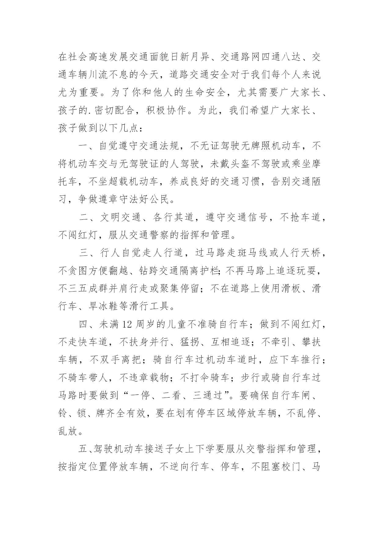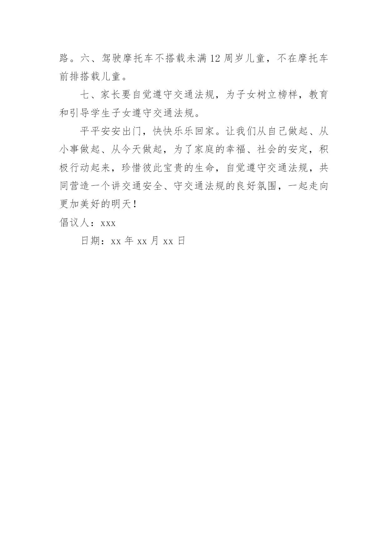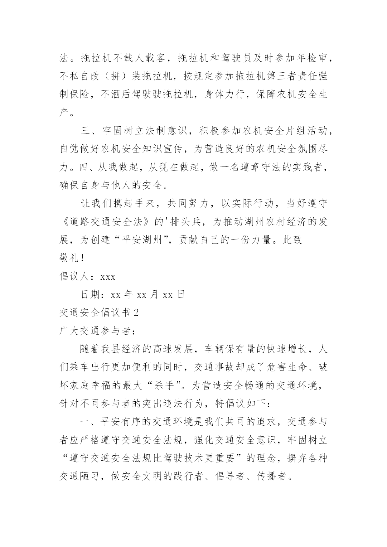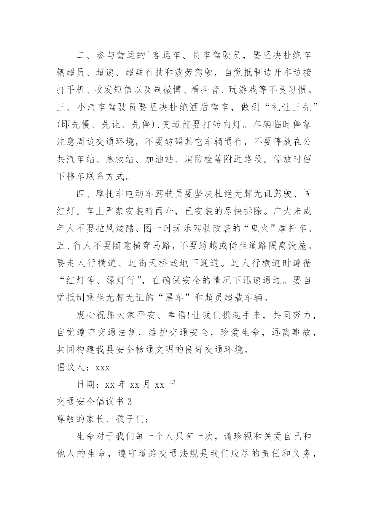 交通安全倡议书交通安全倡议书[热门]在当下社会,倡议书的使用越来越广泛,不同的倡议书内容同样也是不同的。那要怎么写好倡议书呢?以下是小编整理的交通安全倡议书,欢迎大家分享。交通安全倡议书1尊敬的拖拉机驾驶员:随着社会的不断进步,我市拖拉机拥有量越来越多,在农村经济发展中起着重要的作用,同时给交通安全带来了不少隐患。我们可以看到,由于部分拖拉机驾驶员法律意识淡薄,安全意识差,拖拉机道路交通违章行为时有发生,使农机事故逐渐上升。据统计,20__年全市已发生拖拉机事故120起,死亡43人,严重影响了农机安全生产。为了确保人民群众生命财产安全,作为交通参与者,我们深深感到:湖州是我们的家乡,她的平安与我们紧密相连,为预防和减少拖拉机道路交通事故,为农业、农村经济发展创造良好的环境,为打造“平安湖州”尽力尽责,我们向全市拖拉机驾驶员发出如下倡议:一、自觉学习和遵守《中华人民共和国道路交通安全法》,成为学法、知法和守法的拖拉机驾驶员。二、文明驾驶,依法行驶,在农机交通活动中,遵章守法。拖拉机不载人载客,拖拉机和驾驶员及时参加年检审,不私自改(拼)装拖拉机,按规定参加拖拉机第三者责任强制保险,不酒后驾驶驶拖拉机,身体力行,保障农机安全生产。三、牢固树立法制意识,积极参加农机安全片组活动,自觉做好农机安全知识宣传,为营造良好的农机安全氛围尽力。四、从我做起,从现在做起,做一名遵章守法的实践者,确保自身与他人的安全。让我们携起手来,共同努力,以实际行动,当好遵守《道路交通安全法》的'排头兵,为推动湖州农村经济的发展,为创建“平安湖州”,贡献自己的一份力量。此致敬礼!倡议人:xxx日期:xx年xx月xx日交通安全倡议书2广大交通参与者:随着我县经济的高速发展,车辆保有量的快速增长,人们乘车出行更加便利的同时,交通事故却成了危害生命、破坏家庭幸福的最大“杀手”。为营造安全畅通的交通环境,针对不同参与者的突出违法行为,特倡议如下:一、平安有序的交通环境是我们共同的追求,交通参与者应严格遵守交通安全法规,强化交通安全意识,牢固树立“遵守交通安全法规比驾驶技术更重要”的理念,摒弃各种交通陋习,做安全文明的践行者、倡导者、传播者。二、参与营运的`客运车、货车驾驶员,要坚决杜绝车辆超员、超速、超载行驶和疲劳驾驶,自觉抵制边开车边接打手机、收发短信以及刷微博、看抖音、玩游戏等不良习惯。三、小汽车驾驶员要坚决杜绝酒后驾车,做到“礼让三先”(即先慢、先让、先停),变道前要打转向灯。车辆临时停靠注意周边交通环境,不要妨碍其它车辆通行,不要停放在公共汽车站、急救站、加油站、消防栓等附近路段。停放时留下移车联系方式。四、摩托车电动车驾驶员要坚决杜绝无牌无证驾驶、闯红灯。车上严禁安装晴雨伞,已安装的尽快拆除。广大未成年人不要拉风炫酷、图一时玩乐驾驶改装的“鬼火”摩托车。五、行人不要随意横穿马路,不要跨越或倚坐道路隔离设施。要走人行横道、过街天桥或地下通道。过人行横道时遵循“红灯停、绿灯行”,在确保安全的情况下迅速通过。要自觉抵制乘坐无牌无证的“黑车”和超员超载车辆。衷心祝愿大家平安、幸福!让我们携起手来,共同努力,自觉遵守交通法规,维护交通安全,珍爱生命,远离事故,共同构建我县安全畅通文明的良好交通环境。倡议人:xxx日期:xx年xx月xx日交通安全倡议书3尊敬的家长、孩子们:生命对于我们每一个人只有一次,请珍视和关爱自己和他人的生命,遵守道路交通法规是我们应尽的责任和义务,在社会高速发展交通面貌日新月异、交通路网四通八达、交通车辆川流不息的今天,道路交通安全对于我们每个人来说尤为重要。为了你和他人的生命安全,尤其需要广大家长、孩子的.密切配合,积极协作。为此,我们希望广大家长、孩子做到以下几点:一、自觉遵守交通法规,不无证驾驶无牌照机动车,不将机动车交与无驾驶证的人驾驶,未戴头盔不驾驶或乘坐摩托车,不坐超载机动车,养成良好的交通习惯,告别交通陋习,争做遵章守法好公民。二、文明交通、各行其道,遵守交通信号,不抢车道,不闯红灯,服从交通警察的指挥和管理。三、行人自觉走人行道,过马路走斑马线或人行天桥,不贪图方便翻越、钻跨交通隔离护栏;不再马路上追逐玩耍,不三五成群并肩行走或聚集停留;不在道路上使用滑板、滑行车、旱冰鞋等滑行工具。四、未满12周岁的儿童不准骑自行车;做到不闯红灯,不走快车道,不扶身并行、猛拐、互相追逐;不牵引、攀扶车辆,不双手离把;骑自行车过机动车道时,应下车推行;不骑车带人,不违章载物;不打伞骑车;步行或骑自行车过马路时要做到“一停、二看、三通过”。要确保自行车闸、铃、锁、牌齐全有效,要在划有停车区域停放车辆,不乱停、乱放。五、驾驶机动车接送子女上下学要服从交警指挥和管理,按指定位置停放车辆,不逆向行车、停车,不阻塞校门、马路。六、驾驶摩托车不搭载未满1