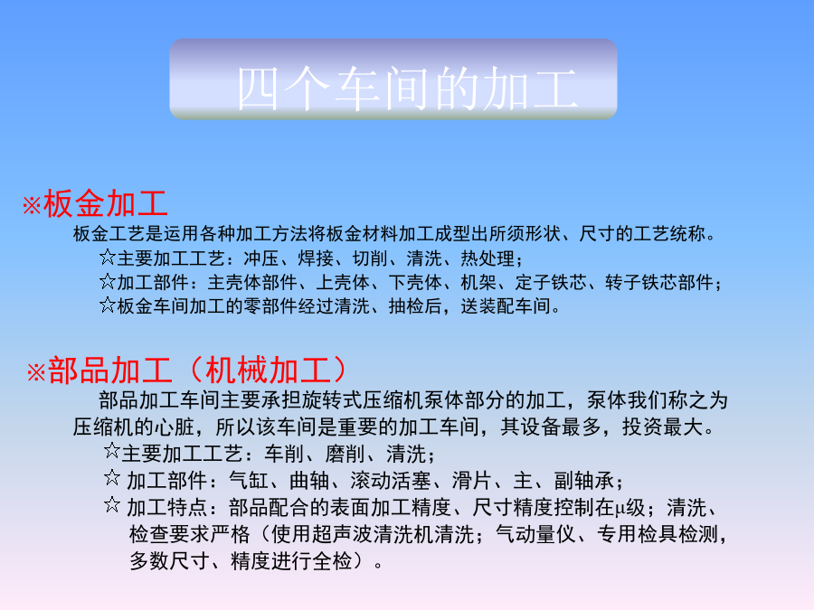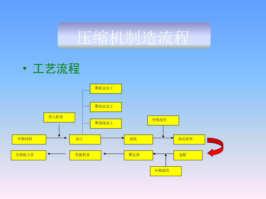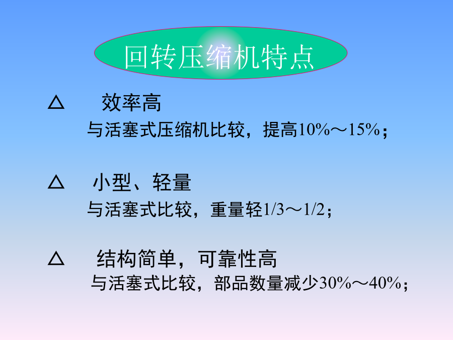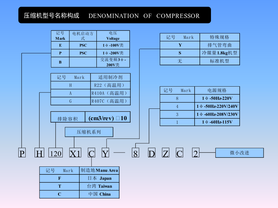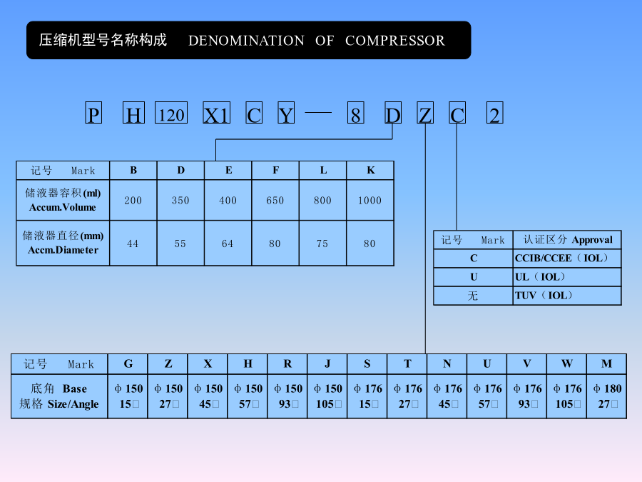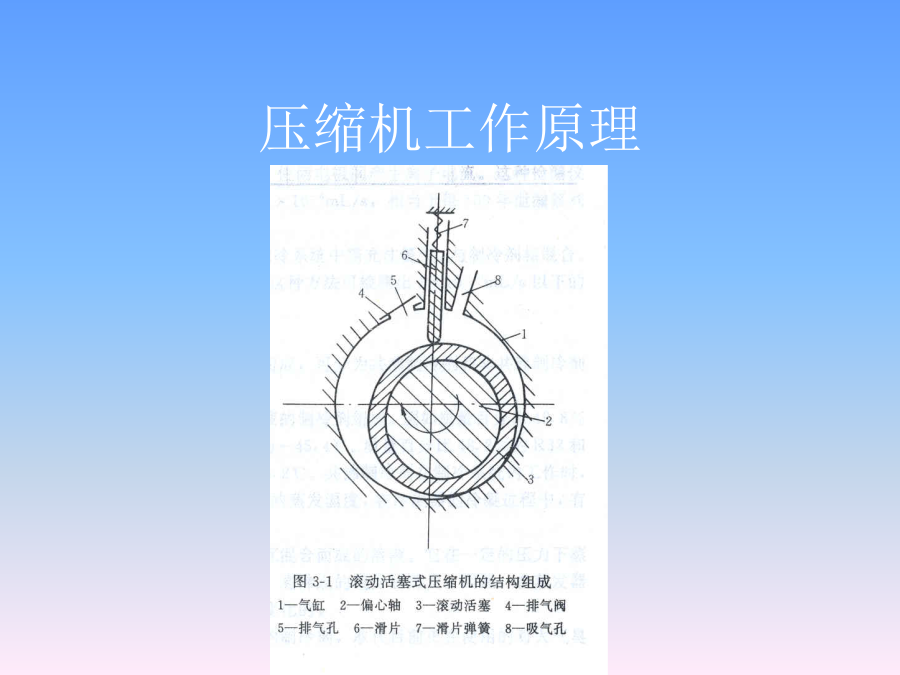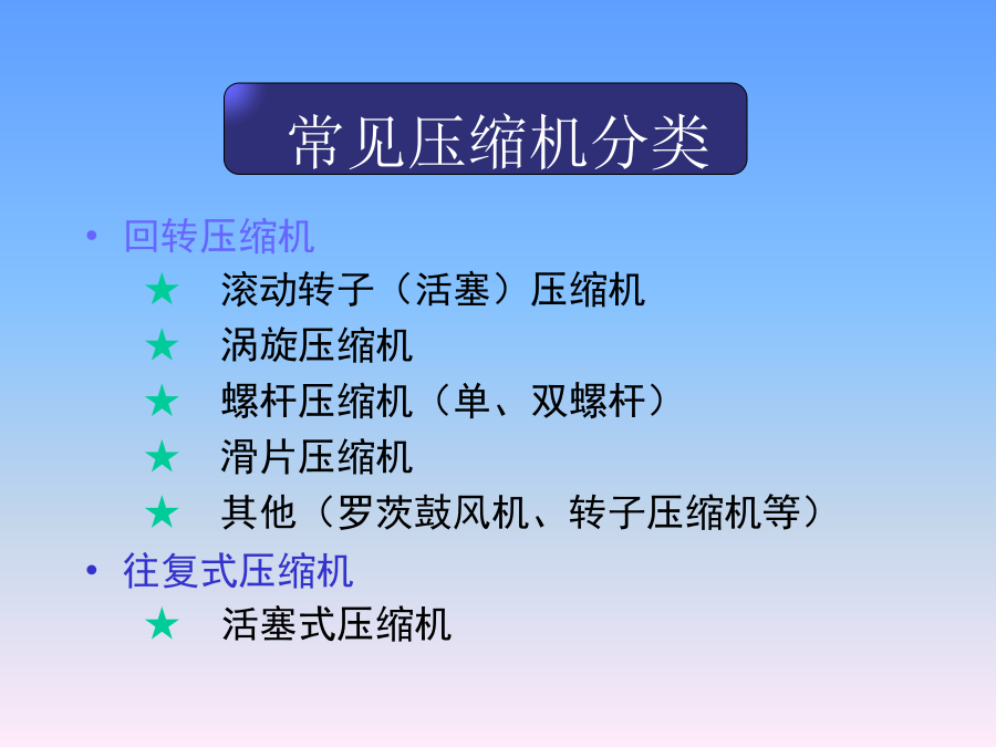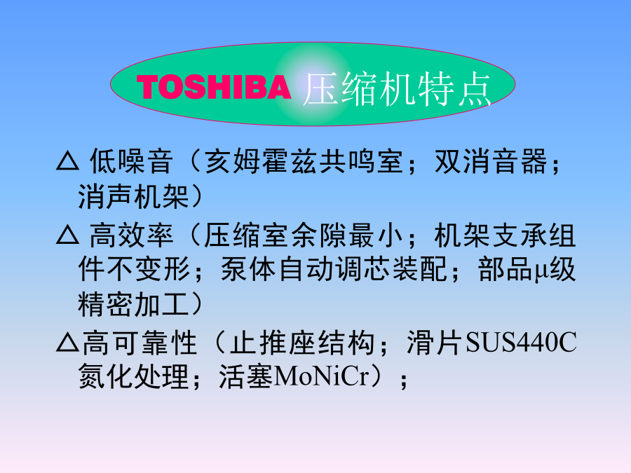 常见压缩机分类压缩机型号名称构成DENOMINATIONOFCOMPRESSOR压缩机型号名称构成DENOMINATIONOFCOMPRESSOR压缩机结构压缩机工作原理回转压缩机特点TOSHIBA压缩机特点压缩机制造流程四个车间的加工※卷线(电机)车间卷线车间进行电机定子绝缘纸、电磁线以及引出线的插入、整形和检查;目前有2条生产线,生产自动化程度高。※装配车间装配车间是将从机加工、板金、电机加工的部件进行选配、组装、壳体焊接、表面涂装、性能检测;涉及的检查项目有:工序间的装配尺寸检查、电气性能检查、整机密封性以及最终的安全和性能检查。装配是压缩机生产过程中的关键工序,压缩机装配无论从设备、工艺及装配环境、人员素质都有较高的要求。主要工艺流程如下:选配→阀片铆接→泵体装配→转子热套→壳体热套→壳体和储液器焊接→气密检查→涂装→真空干燥→在线试验压缩机性能及测试二、启动性能★试验设备使用指定的气体负荷试验装置★预备运转在表1的条件下对压缩机进行预备运转,停止时应满足表2的试验条件。停止时的平衡压力通过系统冷媒量的增减进行调整。表1:预备运转条件(压力为表压)排气压力2.05MPa吸入压力0.52MPa吸入温度18℃表2试验条件(压力为表压)排气压力1.0±0.05(Mpa)吸入压力1.0±0.05(Mpa)吸、排气压差0(Mpa)压缩机壳体温度60±20℃★测定方法在表2的条件下,使电源电压为额定电压-15%和+10%,分别起动三次。★判断基准使电源电压为额定电压-15%和+10%,分别能起动三次。★工程常见起动不良原因1、电源电压偏低;2、端子接线接触不良;3、接线顺序错误4、系统堵塞(毛细管、排气管);5、系统进水;6、压缩机不良。三、噪音1、试验设备:气体负荷试验装置;噪音测试装置。2、试验环境:半消音室;测试噪音与环境噪音相差+10Db(A)以上;3、试验测试条件:排气压力2.05MPa吸入压力0.52MPa吸入温度18℃☆压缩机测试时底座安装减震橡胶垫,配管用软管,避免配管造成的振动。4、测试方法:(1)声强测试:测试条件稳定后,在压缩机汽缸中心部,距滑片方向30±2cm处测定。(2)声功率级噪音测试:测试条件稳定后,在距压缩机中心位置1m的半圆周内,测定10点噪音值。(3)声压(强)噪音与声功率级噪音间的关系(半消音室):LW=LP+20lgr+8(分贝);LP=10lg((∑10)/N);LW——声功率级噪音;LP——声压级噪音;Lpi——每点测定值;r——测定半径(m);N——测定点数。(测定时采用1/3倍频程,A声级)5、工程常见噪音异常的原因:(1)听觉判断有无错误;(2)压缩机安装、管路联接是否正常;(3)噪音源的判断;(4)压缩机噪音不良;四、振动1、试验设备:气体负荷试验装置;振动测试装置(振动计、振动传感器等)。2、测试条件:压缩机实负荷振动测试条件与噪音测试条件相同。3、测定点压缩机在达到稳定工况后,按下图表示的点进行测量,取平均值。压缩机性能与测试压缩机性能与测试压缩机性能与测试压缩机的使用条件压缩机的使用条件压缩机的使用条件压缩机的使用条件压缩机的使用条件压缩机的使用条件三、温度在压缩机内部,有油和电机。如果运转中的压缩机超过了内藏物资的容许温度范围,会导致电机烧毁、轴承的异常磨损、油的碳化等,这些对于压缩机来讲是致命的故障。旋转式压缩机本身就是一个发热源。有电机的损伤热、压缩热、机械部分的摩擦热。要直接测试压缩机内部的温度很困难,所以常用电机绕组温度、排气温度、壳体下部温度来进行衡量。1、电机绕组温度☆使用条件:在最大负荷时,要在125℃以下☆测定方法在压缩机停止后3秒钟以内,用惠斯登电桥或数字欧姆表测定主绕组电阻,再根据下面公式计算:绕组温度t℃=[(R2-R1)/R1]*(234.5+20)+20R2:测定电阻;R1:20℃时的绕组电阻☆如果绕组温度超过使用条件,可能产生的不良:●绕组漆包线的老化速度加快(电机烧毁);●绝缘材料绑线、绝缘纸老化速度加快;●由于过热造成油的劣化(润滑性能下降);☆造成绕组温度增大的常见原因:电源的异常变动、电流过大。2、排气温度☆使用条件:要在115℃以下;☆如果排气温度超过使用条件,可能产生的不良与绕组温度过热一样;☆常见的引起排气温度过高的原因:●冷媒量过少,回气过热度大;●冷凝温度高;●压缩比大(空气进入、热交换不足、毛细管不合适)。☆排气温度的下限间接被下一项的ΔT限制。3、冷凝器中间部位与压缩机底部的温度差(ΔT)☆使用条件:在连续运转时,ΔT要在5℃以上;断续运转时ΔT要在0℃以上☆控制ΔT的意