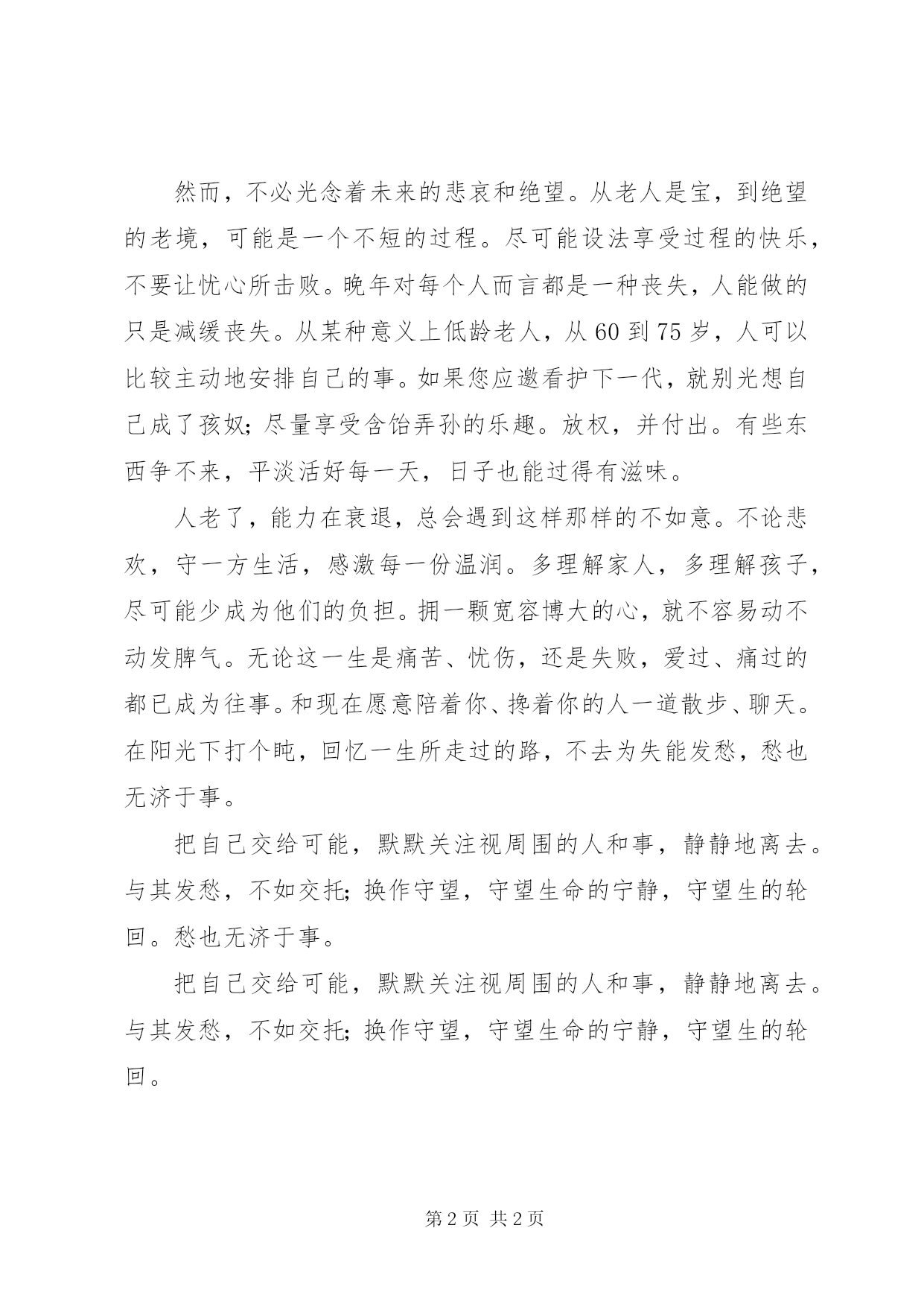 第PAGE\*Arabic\*MERGEFORMAT2页共NUMPAGES\*MERGEFORMAT2页无处安放的老年生活老,无论你愿意还是不愿意,它都朝你走来。当你未老之时,你并不留意,还对老者不以为然。不知不觉之中,老之将至。尤其会老到不能自理,甚至失去维持生存的能力。这种可怕谁都不愿意,不愿意到连做人的基本尊严都失去。有位儿女远在异国他乡的老人,她感觉自己慢慢变得不能自理,全仰仗冷漠心烦的保姆,靠别人的可怜与斥责之下的恩赐。问她为何不去儿女那里,她说到了外面,扑面而来的是文化差异、语言壁垒、经济压力以及种种说不出口的家庭纠纷,让人待着不舒服。问她为何不进老年公寓,她说,现在宾馆式的养老中心有,房间有各种风格,还配备有医院。可一个标间,自理的每月5000元,半自理的每月8000,不包餐费。如果需要特护,最高达15000。花费是退休金的几倍。让孩子去当房奴或者孩奴,他们会感觉再苦再累,也是升值投资,而让他们付钱住当养老奴,就未必乐意了。面对走向终极的过程,她长叹道:不怕死,就怕老。面对走向那种通往老到不能自理的绝望,老人该怎么办。首先是得正视,这是一段必然经历的过程,几乎每个人最后都得接受别人的照顾才能活下去。那时让谁来照顾。老伴儿、子女、保姆、社会养老机构hellip;hellip;反正得有人。有人说中国式养老,说来说去,最终都毁在缺钱上。最终无论采取什么方式,都只能面对。然而,不必光念着未来的悲哀和绝望。从老人是宝,到绝望的老境,可能是一个不短的过程。尽可能设法享受过程的快乐,不要让忧心所击败。晚年对每个人而言都是一种丧失,人能做的只是减缓丧失。从某种意义上低龄老人,从60到75岁,人可以比较主动地安排自己的事。如果您应邀看护下一代,就别光想自己成了孩奴;尽量享受含饴弄孙的乐趣。放权,并付出。有些东西争不来,平淡活好每一天,日子也能过得有滋味。人老了,能力在衰退,总会遇到这样那样的不如意。不论悲欢,守一方生活,感激每一份温润。多理解家人,多理解孩子,尽可能少成为他们的负担。拥一颗宽容博大的心,就不容易动不动发脾气。无论这一生是痛苦、忧伤,还是失败,爱过、痛过的都已成为往事。和现在愿意陪着你、搀着你的人一道散步、聊天。在阳光下打个盹,回忆一生所走过的路,不去为失能发愁,愁也无济于事。把自己交给可能,默默关注视周围的人和事,静静地离去。与其发愁,不如交托;换作守望,守望生命的宁静,守望生的轮回。愁也无济于事。把自己交给可能,默默关注视周围的人和事,静静地离去。与其发愁,不如交托;换作守望,守望生命的宁静,守望生的轮回。
