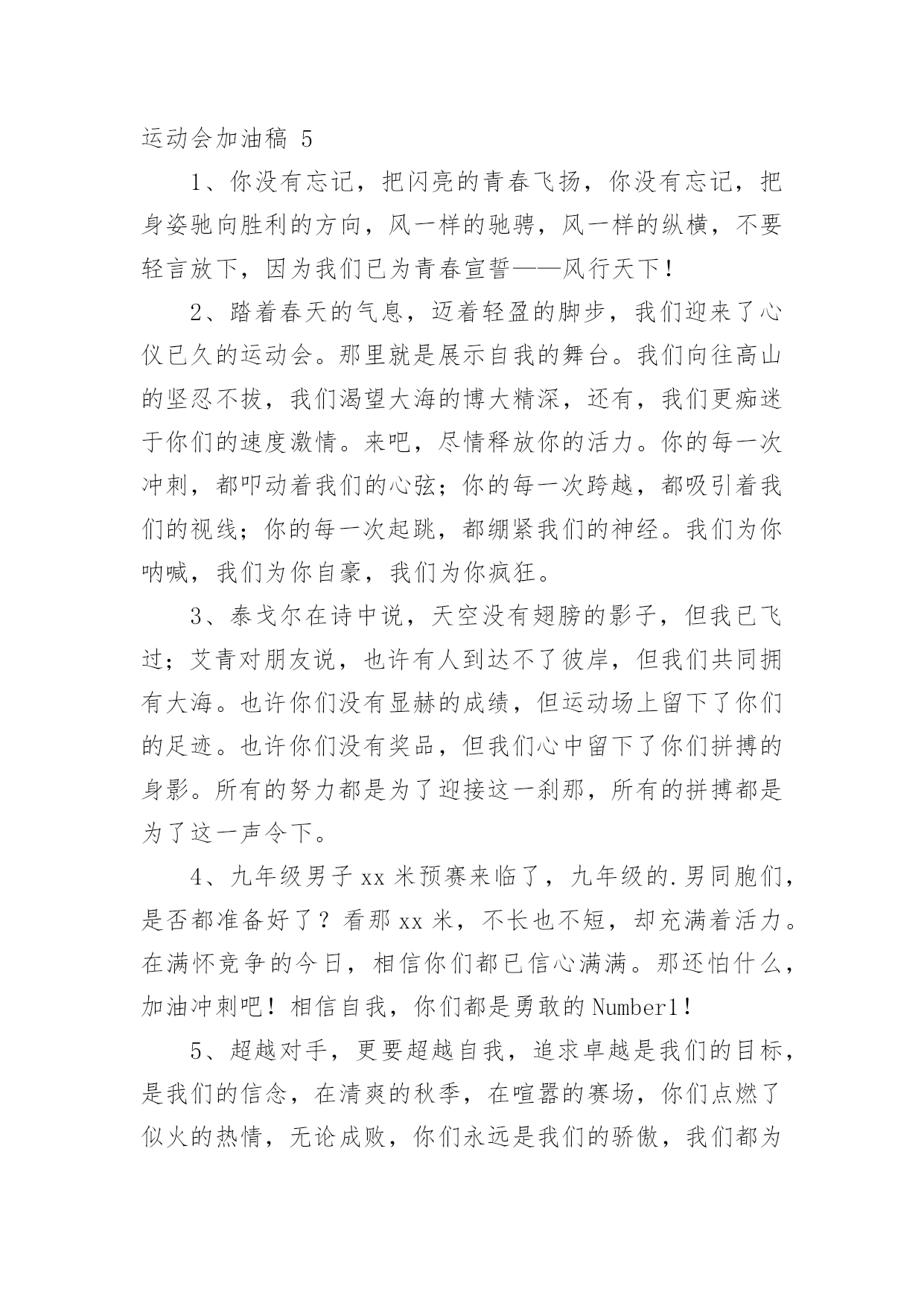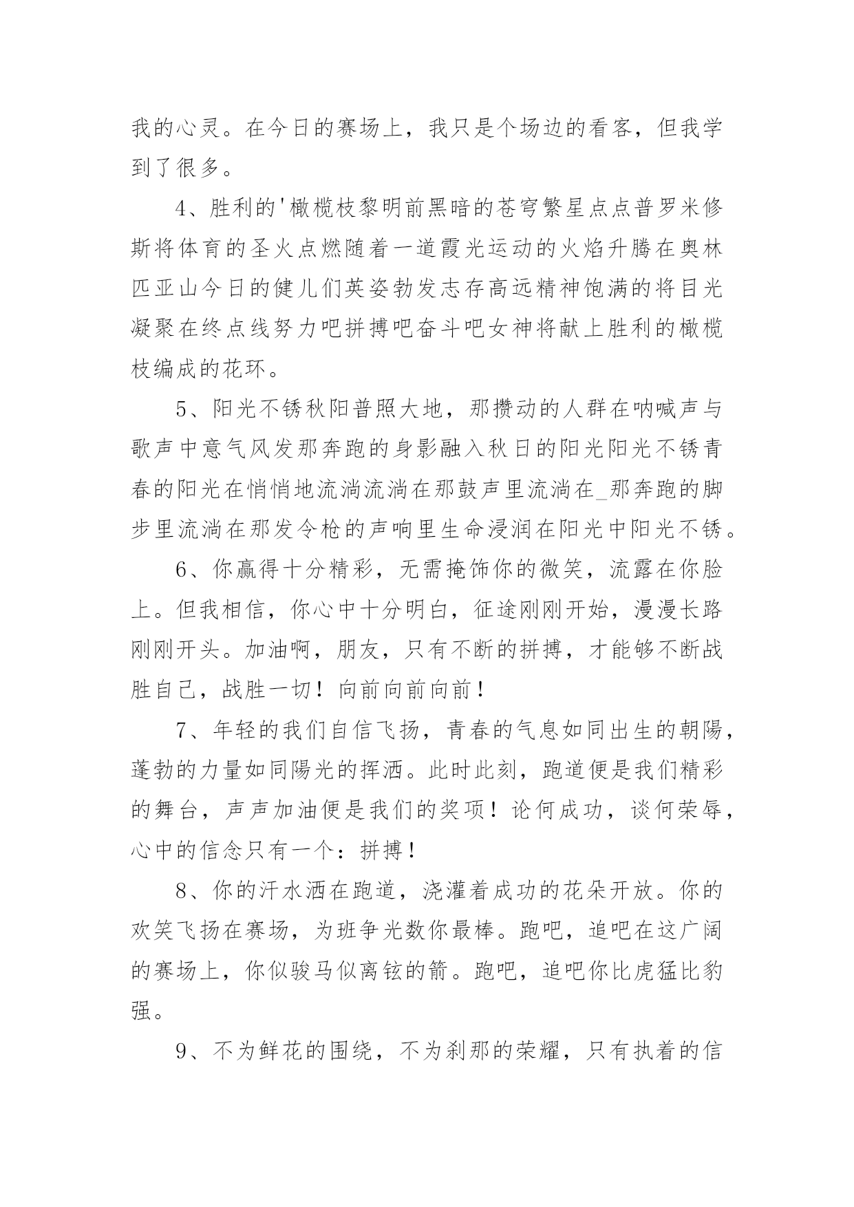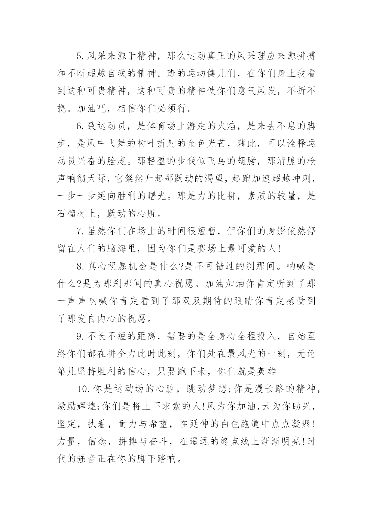 运动会加油稿运动会加油稿集合15篇在社会一步步向前发展的今天,接触并使用加油稿的人越来越多,借助加油稿可以激起人的希望,催人奋进。如何写一份恰当的加油稿呢?以下是小编为大家收集的运动会加油稿,欢迎大家分享。运动会加油稿11、风一样的步伐在烈日下微笑奔跑,没有啦啦队,甚至听不到呐喊,你依旧那么欢悦。骄阳似火,你的激情却胜似火,整个操场你是最亮的一点。加油!2、每一份辛劳都有一份收获,每一次的痛苦都是快乐的开始,没一声呐喊都是力量的呼唤。我们有着大浪拍岸的豪迈,所以你不必在乎小荷初露的恬静,我们有着春日的阳光明媚,所以不用去羡慕冬日乱玉碎琼,我们是雨天的一把伞,是寒冷冬日里的一盆碳火,温暖的不只是你我,而是大家的心。运动场上的健儿,掌声属于你们,鲜花属于你们,成功也是属于你们!3、在今日的赛场上,我只是个场边的看客。我用眼睛见证了赛场上的是非成败,用心灵感受了运动员的喜怒哀乐。他坚持跑完全程,我学到了坚持的可贵,他摔倒了再站起来,我学会了不怕失败的勇气。场上每一个点滴,都如此的震撼我的心灵。在今日的赛场上,我只是个场边的看客,但我学到了很多。4、胜利的'橄榄枝黎明前黑暗的苍穹繁星点点普罗米修斯将体育的圣火点燃随着一道霞光运动的火焰升腾在奥林匹亚山今日的健儿们英姿勃发志存高远精神饱满的将目光凝聚在终点线努力吧拼搏吧奋斗吧女神将献上胜利的橄榄枝编成的花环。5、阳光不锈秋阳普照大地,那攒动的人群在呐喊声与歌声中意气风发那奔跑的身影融入秋日的阳光阳光不锈青春的阳光在悄悄地流淌流淌在那鼓声里流淌在_那奔跑的脚步里流淌在那发令枪的声响里生命浸润在阳光中阳光不锈。6、你赢得十分精彩,无需掩饰你的微笑,流露在你脸上。但我相信,你心中十分明白,征途刚刚开始,漫漫长路刚刚开头。加油啊,朋友,只有不断的拼搏,才能够不断战胜自己,战胜一切!向前向前向前!7、年轻的我们自信飞扬,青春的气息如同出生的朝陽,蓬勃的力量如同陽光的挥洒。此时此刻,跑道便是我们精彩的舞台,声声加油便是我们的奖项!论何成功,谈何荣辱,心中的信念只有一个:拼搏!8、你的汗水洒在跑道,浇灌着成功的花朵开放。你的欢笑飞扬在赛场,为班争光数你最棒。跑吧,追吧在这广阔的赛场上,你似骏马似离铉的箭。跑吧,追吧你比虎猛比豹强。9、不为鲜花的围绕,不为刹那的荣耀,只有执着的信念,化作不停的奔跑,心中燃烧着梦想,脚下不停的步伐,你用行动述说着过程的重要,没有无尽的终点,没有无法攀登的险峰,希望载着终点在向你微笑,拼搏吧!经历是一种精彩,迸发你全部的能量。10、洒一把艰辛的汗水,继续抬起疲倦的脚步,爆发的一吼气贯长虹,继续向前,不论成功与否,你已曾经拥有,曾记否,在终点欢呼,震惊四周。11、致接力运动员一根小小的木棒,连接的是团结和友爱,一根小小的木棒,传递的是勇气和力量,一根小小的木棒,演绎的是奋斗和拼搏。12、超越对手,超越自我,是我们的目标,是我们的信念,在清凉的初冬,在喧嚣的田径场上。你们点燃了似火的热情,无论成败,我们都为你们感到自豪,你们永远是我们的骄傲!13、时间在流逝,赛道在延伸,成功在你面前展现,心脏在跳动,热血在沸腾,辉煌在你脚下铸就,加油吧,健儿们。14、生活中,我们每一天都在尝试;我们走向成功,品味失败,走过心灵的阴雨晴空。运动员们,不要放下尝试,无论失败与否,重要的是你勇于参与的精神,付出的背后是胜利;无论是否成功,我们永远赞美你,你们永远是我们的骄傲。15、百米战场,枪声炸响,你抬头是勇气是自信,低头是深沉是内敛,只需几秒,那就是永恒。运动会加油稿21.踏着春天的气息,迈着轻盈的脚步,我们迎来了心仪已久的运动会。这里就是展示自我的舞台。我们向往高山的坚忍不拔,我们渴望大海的博大精深,还有,我们更痴迷于你们的速度激|情。来吧,尽情释放你的活力。你的每一次冲刺,都叩动着我们的心弦;你的每一次跨越,都吸引着我们的视线;你的每一次起跳,都绷紧我们的神经。我们为你呐喊,我们为你自豪,我们为你疯狂。2.温暖的阳光洒在赛场上,男子乙组标枪的比赛即将开始。赛场上,一道道优美的弧线将轻盈地划过天空50字运动会广播稿50篇50字运动会广播稿50篇。健儿们用手中的标枪向距离的权限发起一轮又一轮的挑战。标枪在空中轻盈的姿态,是健儿们强健的力量和熟练的`技巧的结合。谁能在这场激烈的竞争中获胜?让我们拭目以待,让我们为他们呐喊、助威吧!只有将力量与技巧合二为一的人,才能获得胜利的桂冠!3.你用行动述说着成功的意义,运动场上有无数成绩的高峰,而我们只是选择向更高处攀登,希望载着过程中的快乐与终点时的微笑,拼搏吧!经历是一种精彩,迸发你全部的能量,向更高发起冲击。4.致裁判员柳树抽出新芽,怎能忘了春风的吹拂?小草钻出泥土,怎能忘了春雨的滋润?花儿绽放美丽的笑脸,怎能忘了太阳爱抚?孩子们的成长更不能忘记老