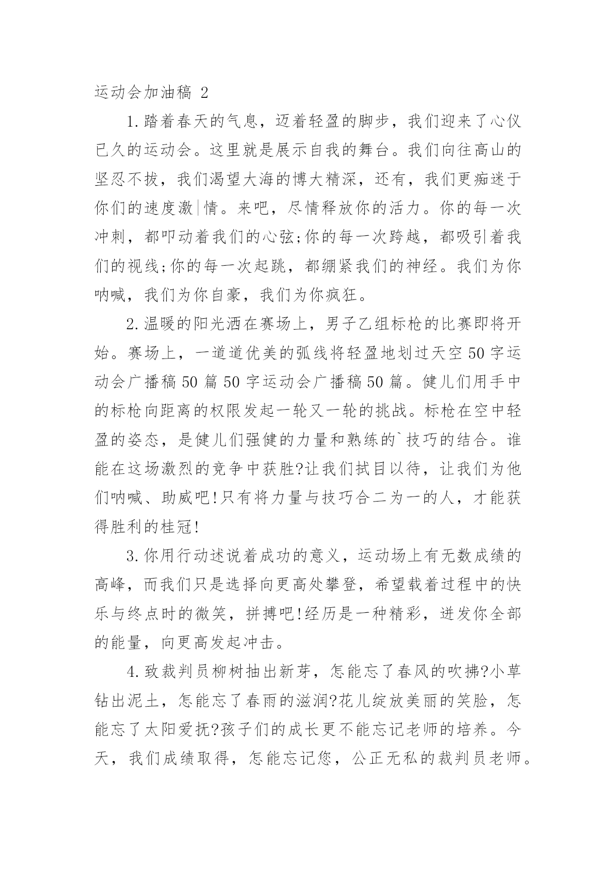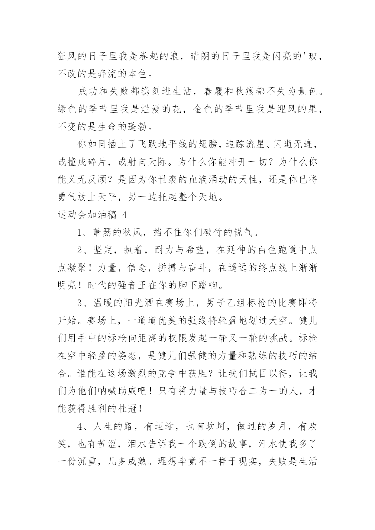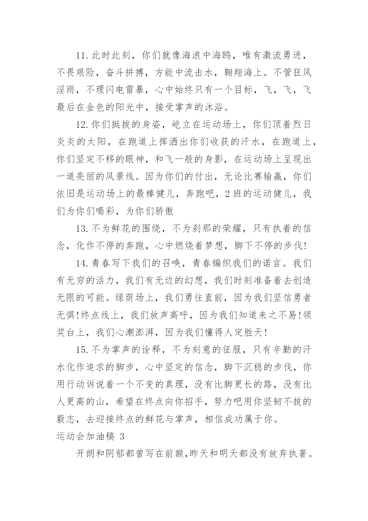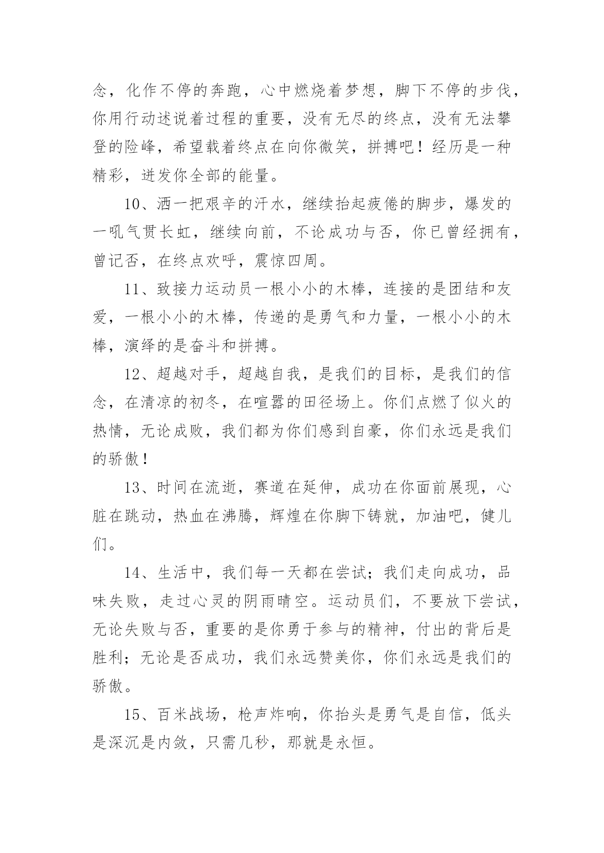 运动会加油稿运动会加油稿集合15篇在社会一步步向前发展的今天,接触并使用加油稿的人越来越多,借助加油稿可以激起人的希望,催人奋进。如何写一份恰当的加油稿呢?以下是小编为大家收集的运动会加油稿,欢迎大家分享。运动会加油稿11、风一样的步伐在烈日下微笑奔跑,没有啦啦队,甚至听不到呐喊,你依旧那么欢悦。骄阳似火,你的激情却胜似火,整个操场你是最亮的一点。加油!2、每一份辛劳都有一份收获,每一次的痛苦都是快乐的开始,没一声呐喊都是力量的呼唤。我们有着大浪拍岸的豪迈,所以你不必在乎小荷初露的恬静,我们有着春日的阳光明媚,所以不用去羡慕冬日乱玉碎琼,我们是雨天的一把伞,是寒冷冬日里的一盆碳火,温暖的不只是你我,而是大家的心。运动场上的健儿,掌声属于你们,鲜花属于你们,成功也是属于你们!3、在今日的赛场上,我只是个场边的看客。我用眼睛见证了赛场上的是非成败,用心灵感受了运动员的喜怒哀乐。他坚持跑完全程,我学到了坚持的可贵,他摔倒了再站起来,我学会了不怕失败的勇气。场上每一个点滴,都如此的震撼我的心灵。在今日的赛场上,我只是个场边的看客,但我学到了很多。4、胜利的'橄榄枝黎明前黑暗的苍穹繁星点点普罗米修斯将体育的圣火点燃随着一道霞光运动的火焰升腾在奥林匹亚山今日的健儿们英姿勃发志存高远精神饱满的将目光凝聚在终点线努力吧拼搏吧奋斗吧女神将献上胜利的橄榄枝编成的花环。5、阳光不锈秋阳普照大地,那攒动的人群在呐喊声与歌声中意气风发那奔跑的身影融入秋日的阳光阳光不锈青春的阳光在悄悄地流淌流淌在那鼓声里流淌在_那奔跑的脚步里流淌在那发令枪的声响里生命浸润在阳光中阳光不锈。6、你赢得十分精彩,无需掩饰你的微笑,流露在你脸上。但我相信,你心中十分明白,征途刚刚开始,漫漫长路刚刚开头。加油啊,朋友,只有不断的拼搏,才能够不断战胜自己,战胜一切!向前向前向前!7、年轻的我们自信飞扬,青春的气息如同出生的朝陽,蓬勃的力量如同陽光的挥洒。此时此刻,跑道便是我们精彩的舞台,声声加油便是我们的奖项!论何成功,谈何荣辱,心中的信念只有一个:拼搏!8、你的汗水洒在跑道,浇灌着成功的花朵开放。你的欢笑飞扬在赛场,为班争光数你最棒。跑吧,追吧在这广阔的赛场上,你似骏马似离铉的箭。跑吧,追吧你比虎猛比豹强。9、不为鲜花的围绕,不为刹那的荣耀,只有执着的信念,化作不停的奔跑,心中燃烧着梦想,脚下不停的步伐,你用行动述说着过程的重要,没有无尽的终点,没有无法攀登的险峰,希望载着终点在向你微笑,拼搏吧!经历是一种精彩,迸发你全部的能量。10、洒一把艰辛的汗水,继续抬起疲倦的脚步,爆发的一吼气贯长虹,继续向前,不论成功与否,你已曾经拥有,曾记否,在终点欢呼,震惊四周。11、致接力运动员一根小小的木棒,连接的是团结和友爱,一根小小的木棒,传递的是勇气和力量,一根小小的木棒,演绎的是奋斗和拼搏。12、超越对手,超越自我,是我们的目标,是我们的信念,在清凉的初冬,在喧嚣的田径场上。你们点燃了似火的热情,无论成败,我们都为你们感到自豪,你们永远是我们的骄傲!13、时间在流逝,赛道在延伸,成功在你面前展现,心脏在跳动,热血在沸腾,辉煌在你脚下铸就,加油吧,健儿们。14、生活中,我们每一天都在尝试;我们走向成功,品味失败,走过心灵的阴雨晴空。运动员们,不要放下尝试,无论失败与否,重要的是你勇于参与的精神,付出的背后是胜利;无论是否成功,我们永远赞美你,你们永远是我们的骄傲。15、百米战场,枪声炸响,你抬头是勇气是自信,低头是深沉是内敛,只需几秒,那就是永恒。运动会加油稿21.踏着春天的气息,迈着轻盈的脚步,我们迎来了心仪已久的运动会。这里就是展示自我的舞台。我们向往高山的坚忍不拔,我们渴望大海的博大精深,还有,我们更痴迷于你们的速度激|情。来吧,尽情释放你的活力。你的每一次冲刺,都叩动着我们的心弦;你的每一次跨越,都吸引着我们的视线;你的每一次起跳,都绷紧我们的神经。我们为你呐喊,我们为你自豪,我们为你疯狂。2.温暖的阳光洒在赛场上,男子乙组标枪的比赛即将开始。赛场上,一道道优美的弧线将轻盈地划过天空50字运动会广播稿50篇50字运动会广播稿50篇。健儿们用手中的标枪向距离的权限发起一轮又一轮的挑战。标枪在空中轻盈的姿态,是健儿们强健的力量和熟练的`技巧的结合。谁能在这场激烈的竞争中获胜?让我们拭目以待,让我们为他们呐喊、助威吧!只有将力量与技巧合二为一的人,才能获得胜利的桂冠!3.你用行动述说着成功的意义,运动场上有无数成绩的高峰,而我们只是选择向更高处攀登,希望载着过程中的快乐与终点时的微笑,拼搏吧!经历是一种精彩,迸发你全部的能量,向更高发起冲击。4.致裁判员柳树抽出新芽,怎能忘了春风的吹拂?小草钻出泥土,怎能忘了春雨的滋润?花儿绽放美丽的笑脸,怎能忘了太阳爱抚?孩子们的成长更不能忘记老