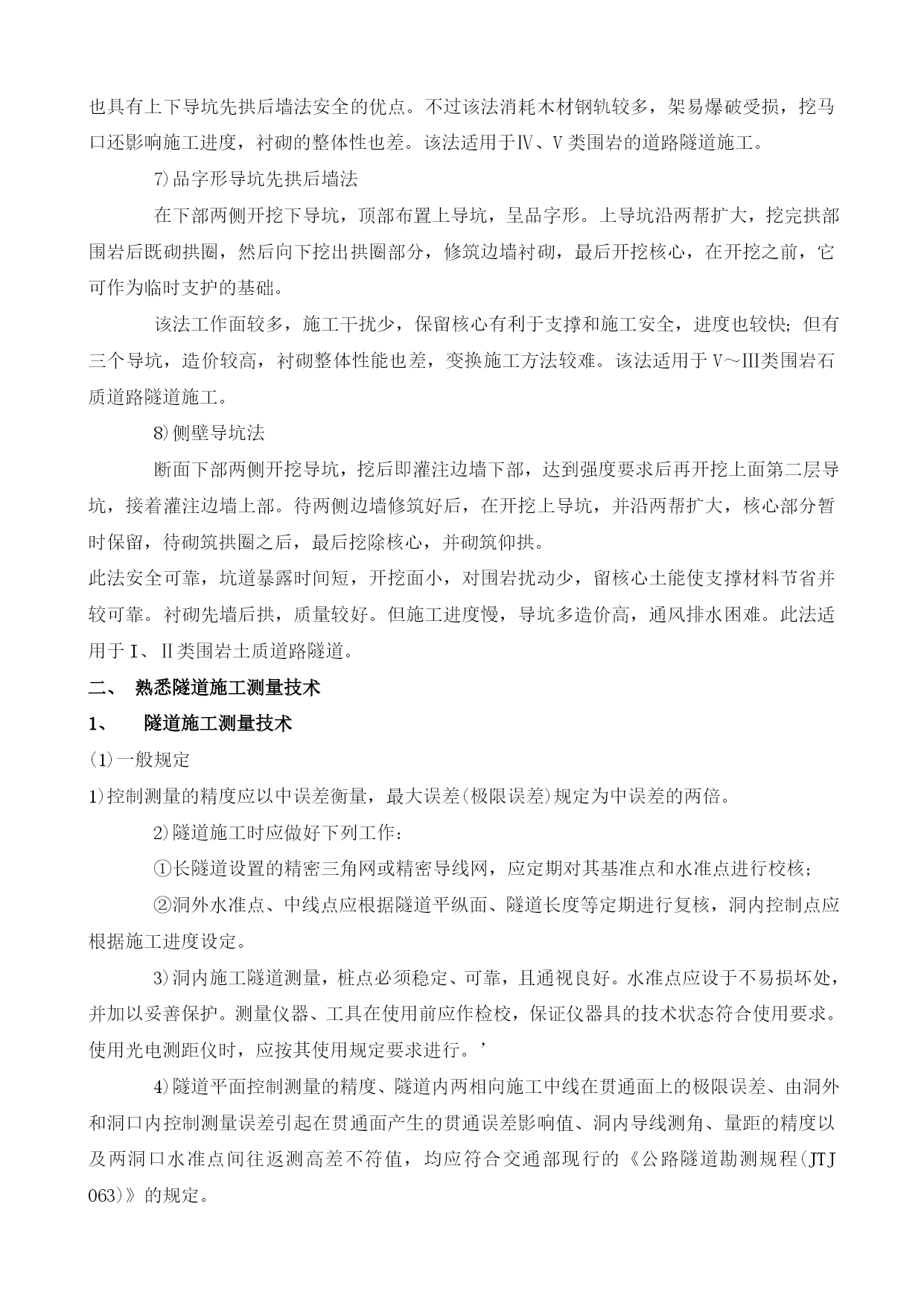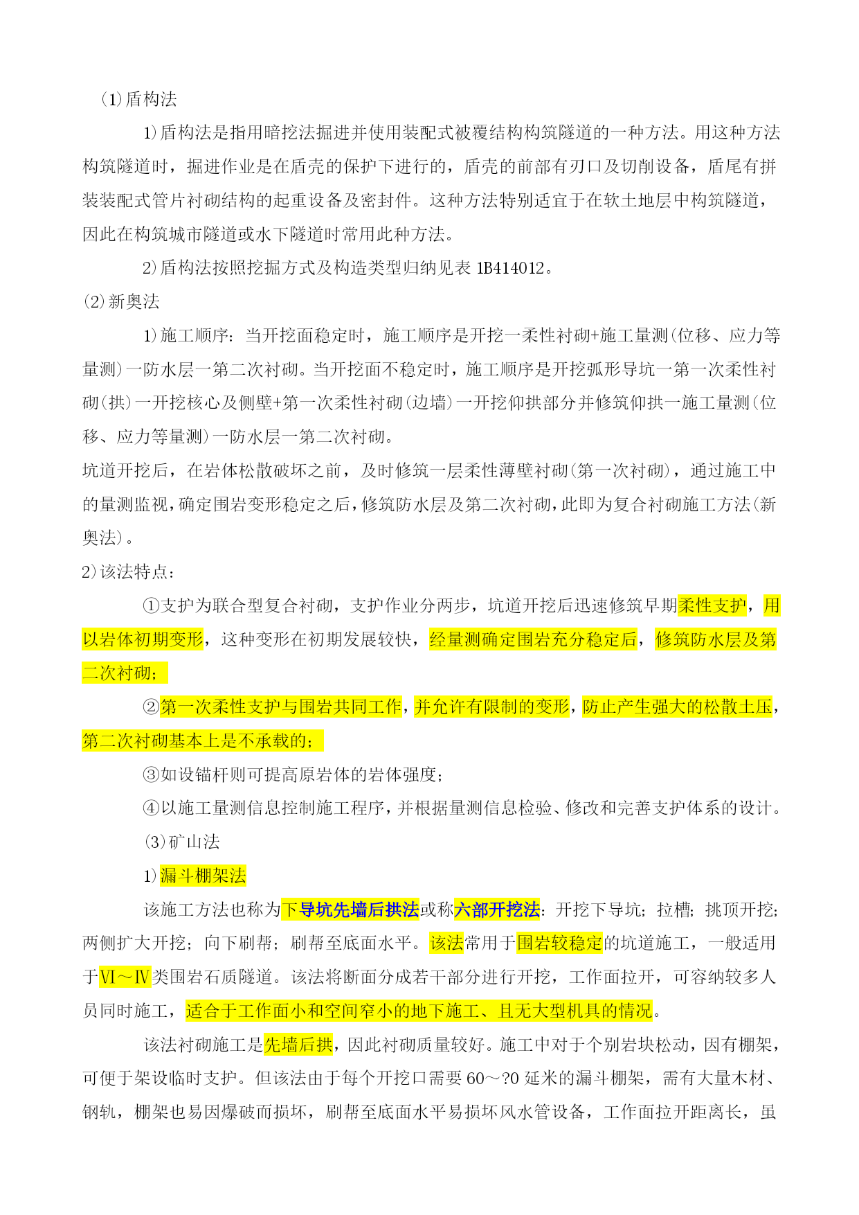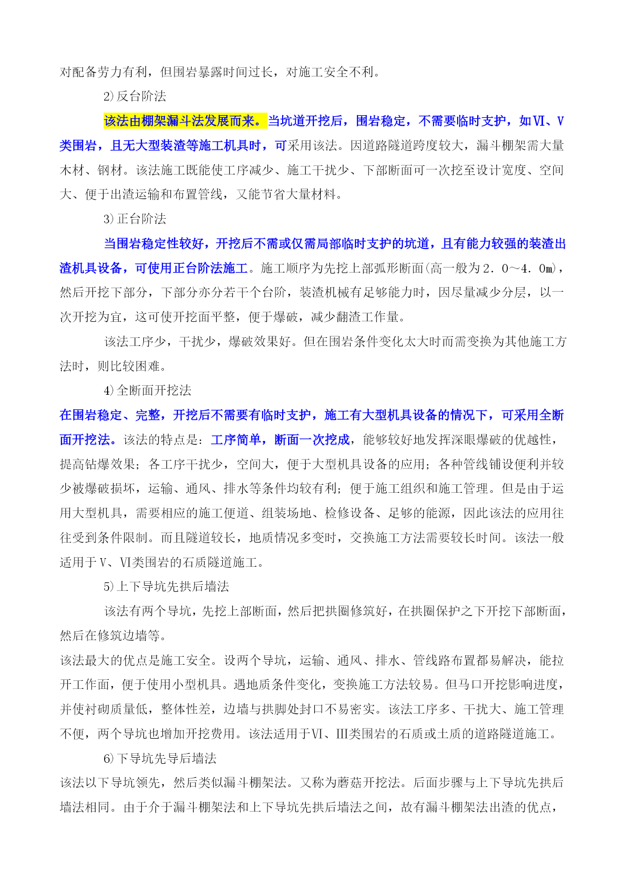 隧道工程施工技术一、隧道工程基础知识1、隧道组成(1)种类:隧道通常指用作地下通道的工程建筑物,一般可分为两大类,一类是修建在岩层中的,称为岩石隧道;一类是修建在土层中的,称为软土隧道。岩石隧道修建在山体中的较多,故又称山岭隧道;软土隧道常常修建在水底和城市立交,故称为水底隧道和城市道路隧道。埋置较浅的隧道,一般采用明挖法施工,埋置较深的隧道则多采用暗挖法施工。用作地下通道的有道路隧道、水底隧道、城市道路隧道、地下铁道、铁路隧道和航运隧道等。(2)组成:隧道是地下工程建筑物,为保持坑道岩体的稳定,保证行车安全,通常需要修建主体建筑物和附属建筑物。前者包括洞身衬砌和洞门,后者包括通风、照明、防排水、安全设备等。洞身衬砌的作用是承受围岩压力,结构自重及其他荷载,防止围岩风化,崩塌和洞内的防水、防潮等。洞门的主要作用是防止洞口坍方落石、保持仰坡和边坡的稳定。通风照明、防排水、安全设备等的作用是确保行车安全、舒适。2、围岩分类(1)道路隧道是道路穿越山岭修建的工程结构物,它与周围的岩(土)体(一般简称为围岩)有密切关系,相互影响、相互作用。不同的围岩在修建隧道时会有不同的地质现象会表现出不同的稳定性。为满足工程设计、施工等的需要,对于各种不同的具体要求,例如爆破、支护、挖掘、编制定额等,把与这些不同的要求相应的地质条件归类,这就是围岩分类。(2)分类中主要考虑下述三个分类指标:1)坑道围岩的结构特征和完整状态,即围岩被各种结构面切割的破碎程度及其组合状态;2)岩石的物理力学性质,即坑道围岩的岩石强度、物理、水理性质,在分类中主要是岩石单轴饱和极限强度Rb较有意义,以Rb=30MPa作为软、硬岩的分界指标,Rb<5MPa的岩(土)体属于半岩质,或略具有结构强度的土体;3)地下水的影响。分类中采用了“遇水降级”的经验处理方法,即视围岩性质、地下水性质及大小、流通条件、浸润情,况等考虑,将围岩类别适当降级,一般情况按降1级考虑。仅在软岩、水理性质差的、极度破碎的、地下水又经常存在的情况下可降2级;Ⅲ类围岩中的软岩,在涌水量较大时可考虑.降2级,划为工类。对于Ⅵ类及V类围岩,因水的影响小,一般情况下可不作降级处理。(3)道路隧道根据《公路隧道设计规范》(JTJ026—1990)中围岩分类方法,可分为6类进行工程设计。3、隧道施工的主要技术(1)盾构法1)盾构法是指用暗挖法掘进并使用装配式被覆结构构筑隧道的一种方法。用这种方法构筑隧道时,掘进作业是在盾壳的保护下进行的,盾壳的前部有刃口及切削设备,盾尾有拼装装配式管片衬砌结构的起重设备及密封件。这种方法特别适宜于在软土地层中构筑隧道,因此在构筑城市隧道或水下隧道时常用此种方法。2)盾构法按照挖掘方式及构造类型归纳见表1B414012。(2)新奥法1)施工顺序:当开挖面稳定时,施工顺序是开挖一柔性衬砌+施工量测(位移、应力等量测)一防水层一第二次衬砌。当开挖面不稳定时,施工顺序是开挖弧形导坑一第一次柔性衬砌(拱)一开挖核心及侧壁+第一次柔性衬砌(边墙)一开挖仰拱部分并修筑仰拱一施工量测(位移、应力等量测)一防水层一第二次衬砌。坑道开挖后,在岩体松散破坏之前,及时修筑一层柔性薄壁衬砌(第一次衬砌),通过施工中的量测监视,确定围岩变形稳定之后,修筑防水层及第二次衬砌,此即为复合衬砌施工方法(新奥法)。2)该法特点:①支护为联合型复合衬砌,支护作业分两步,坑道开挖后迅速修筑早期柔性支护,用以岩体初期变形,这种变形在初期发展较快,经量测确定围岩充分稳定后,修筑防水层及第二次衬砌;②第一次柔性支护与围岩共同工作,并允许有限制的变形,防止产生强大的松散土压,第二次衬砌基本上是不承载的;③如设锚杆则可提高原岩体的岩体强度;④以施工量测信息控制施工程序,并根据量测信息检验、修改和完善支护体系的设计。(3)矿山法1)漏斗棚架法该施工方法也称为下导坑先墙后拱法或称六部开挖法:开挖下导坑;拉槽;挑顶开挖;两侧扩大开挖;向下刷帮;刷帮至底面水平。该法常用于围岩较稳定的坑道施工,一般适用于Ⅵ~Ⅳ类围岩石质隧道。该法将断面分成若干部分进行开挖,工作面拉开,可容纳较多人员同时施工,适合于工作面小和空间窄小的地下施工、且无大型机具的情况。该法衬砌施工是先墙后拱,因此衬砌质量较好。施工中对于个别岩块松动,因有棚架,可便于架设临时支护。但该法由于每个开挖口需要60~?0延米的漏斗棚架,需有大量木材、钢轨,棚架也易因爆破而损坏,刷帮至底面水平易损坏风水管设备,工作面拉开距离长,虽对配备劳力有利,但围岩暴露时间过长,对施工安全不利。2)反台阶法该法由棚架漏斗法发展而来。当坑道开挖后,围岩稳定,不需要临时支护,如Ⅵ、V类围岩,且无大型装渣等施工机具时,可采用该法。因道路隧道跨度较大,漏斗棚架需大量木材、钢材。该法施工既能使工序