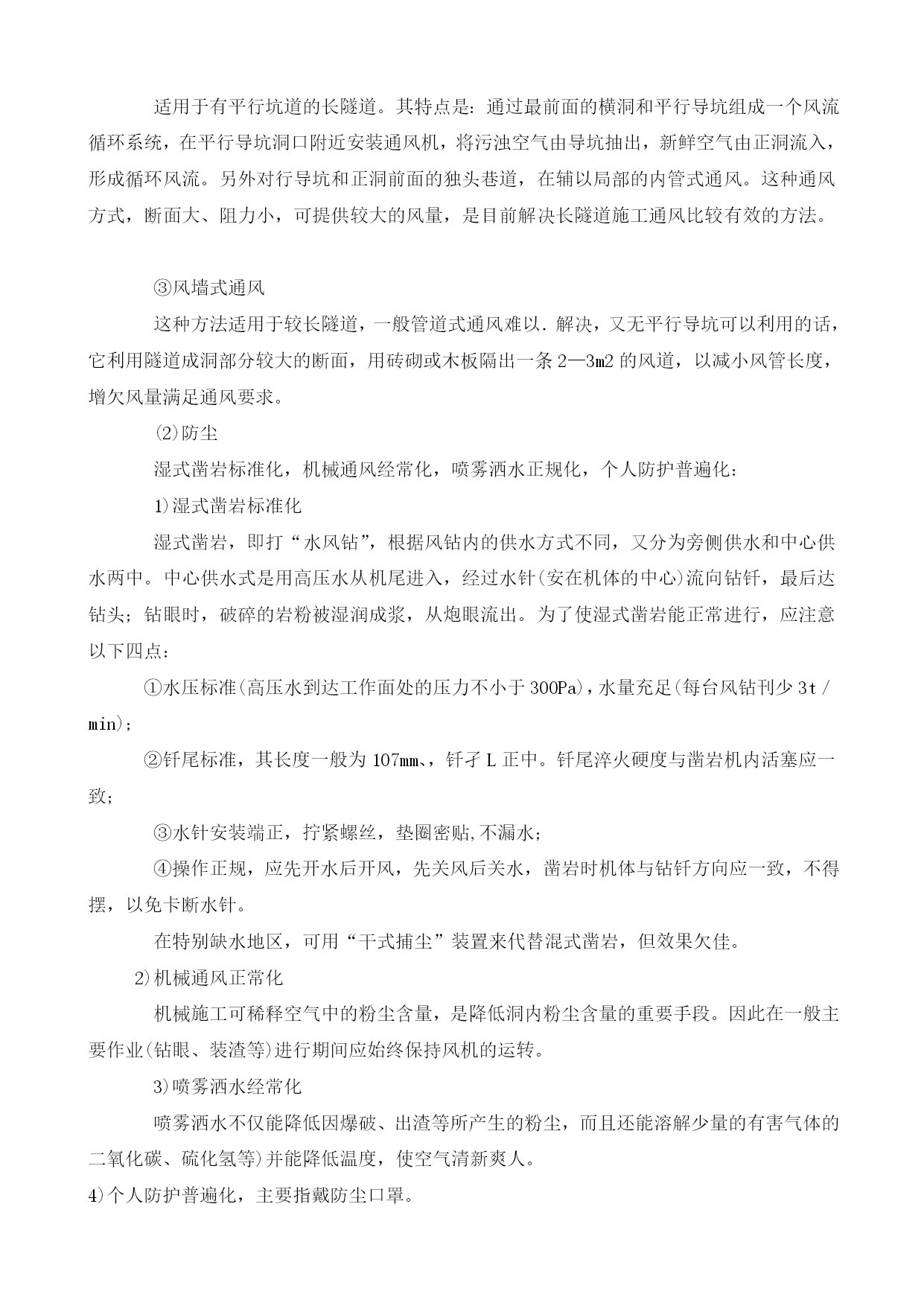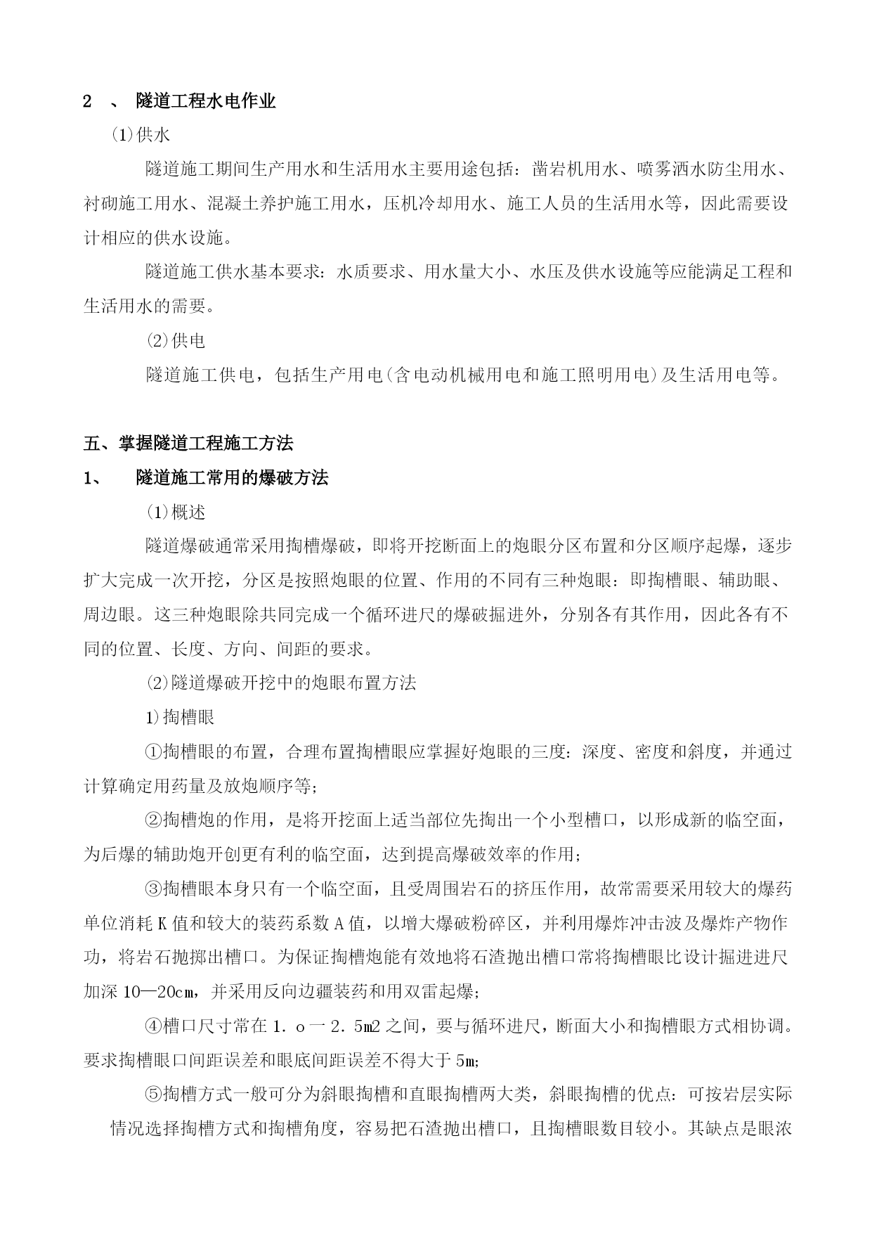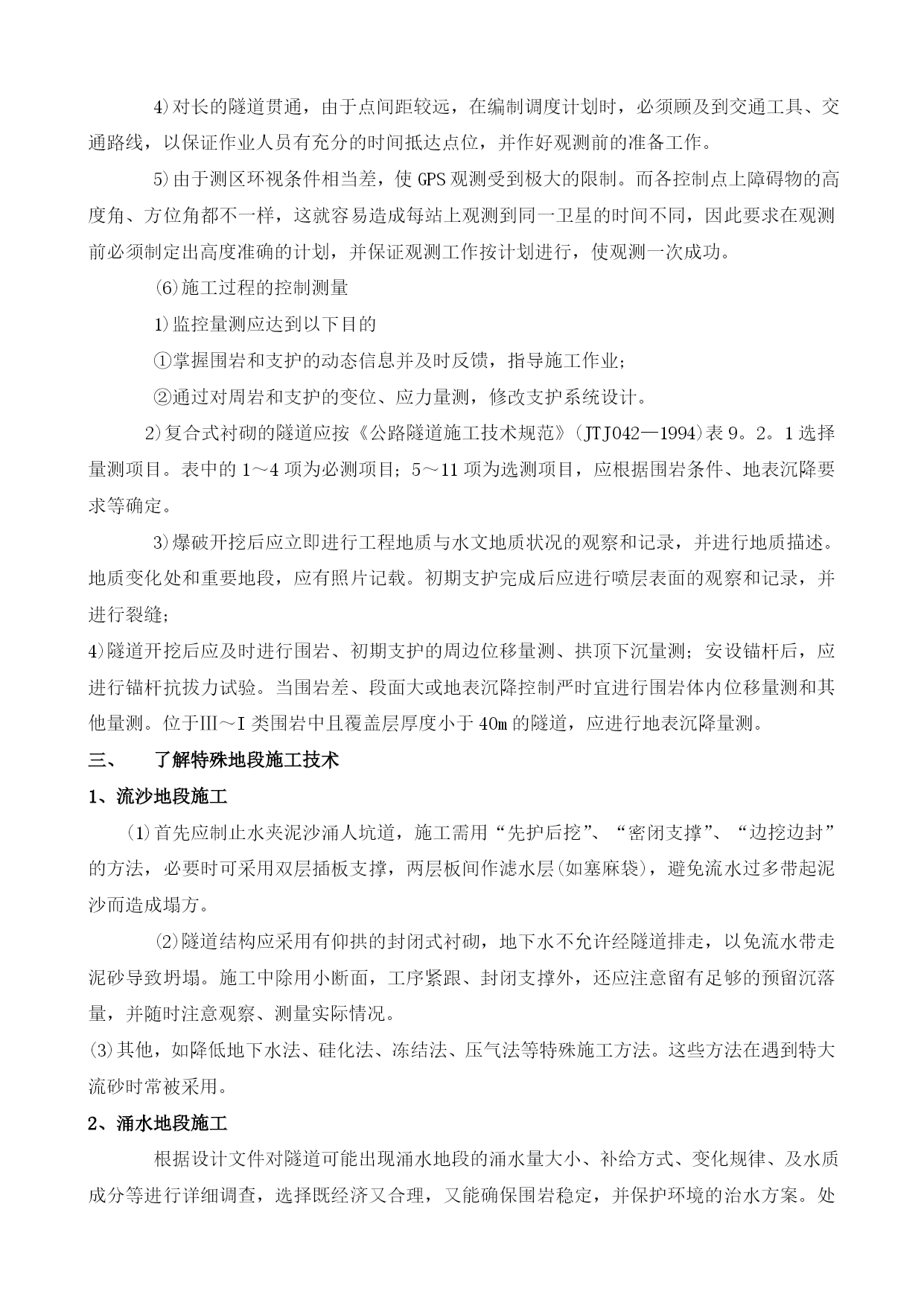 隧道工程施工技术一、隧道工程基础知识1、隧道组成(1)种类:隧道通常指用作地下通道的工程建筑物,一般可分为两大类,一类是修建在岩层中的,称为岩石隧道;一类是修建在土层中的,称为软土隧道。岩石隧道修建在山体中的较多,故又称山岭隧道;软土隧道常常修建在水底和城市立交,故称为水底隧道和城市道路隧道。埋置较浅的隧道,一般采用明挖法施工,埋置较深的隧道则多采用暗挖法施工。用作地下通道的有道路隧道、水底隧道、城市道路隧道、地下铁道、铁路隧道和航运隧道等。(2)组成:隧道是地下工程建筑物,为保持坑道岩体的稳定,保证行车安全,通常需要修建主体建筑物和附属建筑物。前者包括洞身衬砌和洞门,后者包括通风、照明、防排水、安全设备等。洞身衬砌的作用是承受围岩压力,结构自重及其他荷载,防止围岩风化,崩塌和洞内的防水、防潮等。洞门的主要作用是防止洞口坍方落石、保持仰坡和边坡的稳定。通风照明、防排水、安全设备等的作用是确保行车安全、舒适。2、围岩分类(1)道路隧道是道路穿越山岭修建的工程结构物,它与周围的岩(土)体(一般简称为围岩)有密切关系,相互影响、相互作用。不同的围岩在修建隧道时会有不同的地质现象会表现出不同的稳定性。为满足工程设计、施工等的需要,对于各种不同的具体要求,例如爆破、支护、挖掘、编制定额等,把与这些不同的要求相应的地质条件归类,这就是围岩分类。(2)分类中主要考虑下述三个分类指标:1)坑道围岩的结构特征和完整状态,即围岩被各种结构面切割的破碎程度及其组合状态;2)岩石的物理力学性质,即坑道围岩的岩石强度、物理、水理性质,在分类中主要是岩石单轴饱和极限强度Rb较有意义,以Rb=30MPa作为软、硬岩的分界指标,Rb<5MPa的岩(土)体属于半岩质,或略具有结构强度的土体;3)地下水的影响。分类中采用了“遇水降级”的经验处理方法,即视围岩性质、地下水性质及大小、流通条件、浸润情,况等考虑,将围岩类别适当降级,一般情况按降1级考虑。仅在软岩、水理性质差的、极度破碎的、地下水又经常存在的情况下可降2级;Ⅲ类围岩中的软岩,在涌水量较大时可考虑.降2级,划为工类。对于Ⅵ类及V类围岩,因水的影响小,一般情况下可不作降级处理。(3)道路隧道根据《公路隧道设计规范》(JTJ026—1990)中围岩分类方法,可分为6类进行工程设计。3、隧道施工的主要技术(1)盾构法1)盾构法是指用暗挖法掘进并使用装配式被覆结构构筑隧道的一种方法。用这种方法构筑隧道时,掘进作业是在盾壳的保护下进行的,盾壳的前部有刃口及切削设备,盾尾有拼装装配式管片衬砌结构的起重设备及密封件。这种方法特别适宜于在软土地层中构筑隧道,因此在构筑城市隧道或水下隧道时常用此种方法。2)盾构法按照挖掘方式及构造类型归纳见表1B414012。(2)新奥法1)施工顺序:当开挖面稳定时,施工顺序是开挖一柔性衬砌+施工量测(位移、应力等量测)一防水层一第二次衬砌。当开挖面不稳定时,施工顺序是开挖弧形导坑一第一次柔性衬砌(拱)一开挖核心及侧壁+第一次柔性衬砌(边墙)一开挖仰拱部分并修筑仰拱一施工量测(位移、应力等量测)一防水层一第二次衬砌。坑道开挖后,在岩体松散破坏之前,及时修筑一层柔性薄壁衬砌(第一次衬砌),通过施工中的量测监视,确定围岩变形稳定之后,修筑防水层及第二次衬砌,此即为复合衬砌施工方法(新奥法)。2)该法特点:①支护为联合型复合衬砌,支护作业分两步,坑道开挖后迅速修筑早期柔性支护,用以岩体初期变形,这种变形在初期发展较快,经量测确定围岩充分稳定后,修筑防水层及第二次衬砌;②第一次柔性支护与围岩共同工作,并允许有限制的变形,防止产生强大的松散土压,第二次衬砌基本上是不承载的;③如设锚杆则可提高原岩体的岩体强度;④以施工量测信息控制施工程序,并根据量测信息检验、修改和完善支护体系的设计。(3)矿山法1)漏斗棚架法该施工方法也称为下导坑先墙后拱法或称六部开挖法:开挖下导坑;拉槽;挑顶开挖;两侧扩大开挖;向下刷帮;刷帮至底面水平。该法常用于围岩较稳定的坑道施工,一般适用于Ⅵ~Ⅳ类围岩石质隧道。该法将断面分成若干部分进行开挖,工作面拉开,可容纳较多人员同时施工,适合于工作面小和空间窄小的地下施工、且无大型机具的情况。该法衬砌施工是先墙后拱,因此衬砌质量较好。施工中对于个别岩块松动,因有棚架,可便于架设临时支护。但该法由于每个开挖口需要60~?0延米的漏斗棚架,需有大量木材、钢轨,棚架也易因爆破而损坏,刷帮至底面水平易损坏风水管设备,工作面拉开距离长,虽对配备劳力有利,但围岩暴露时间过长,对施工安全不利。2)反台阶法该法由棚架漏斗法发展而来。当坑道开挖后,围岩稳定,不需要临时支护,如Ⅵ、V类围岩,且无大型装渣等施工机具时,可采用该法。因道路隧道跨度较大,漏斗棚架需大量木材、钢材。该法施工既能使工序