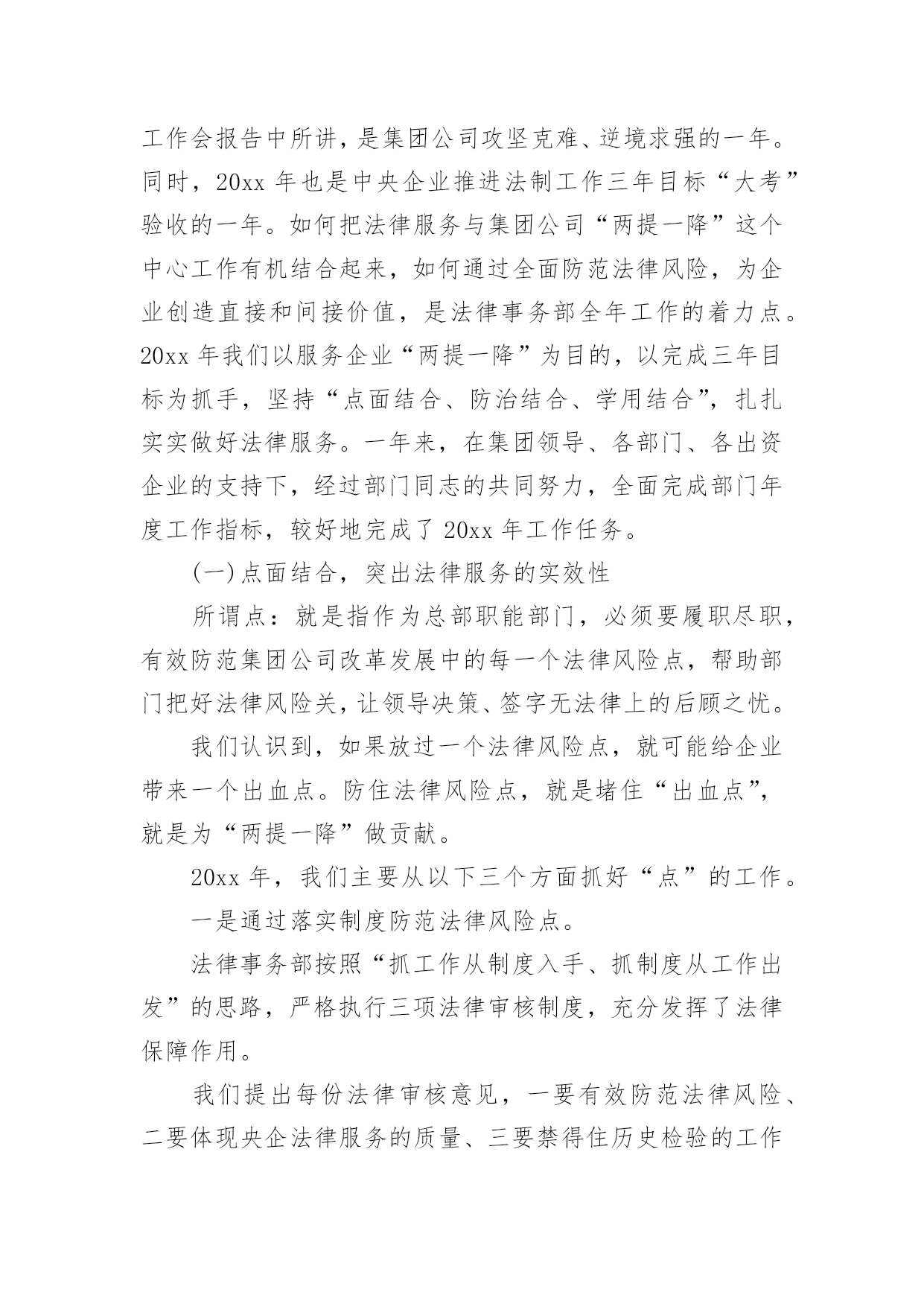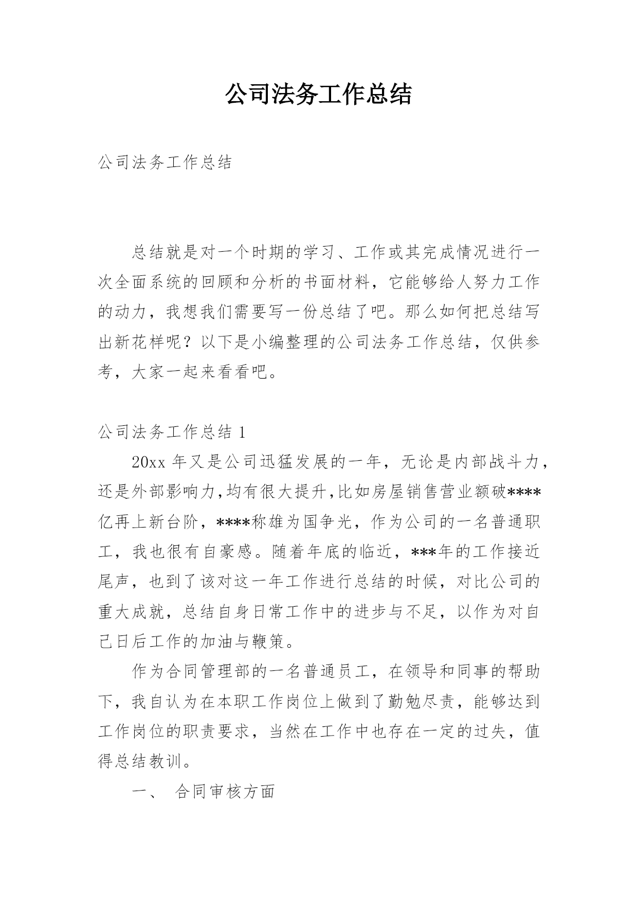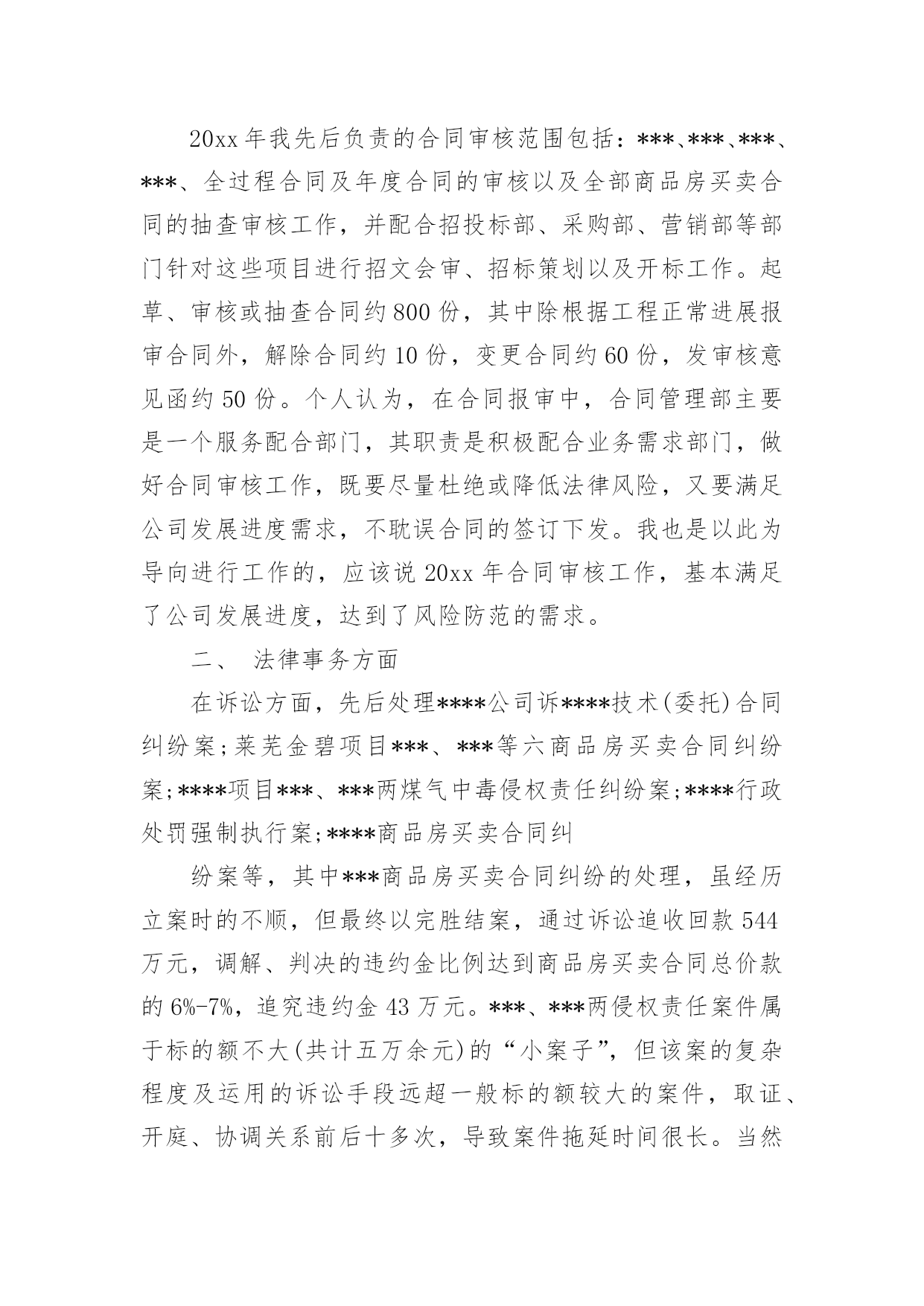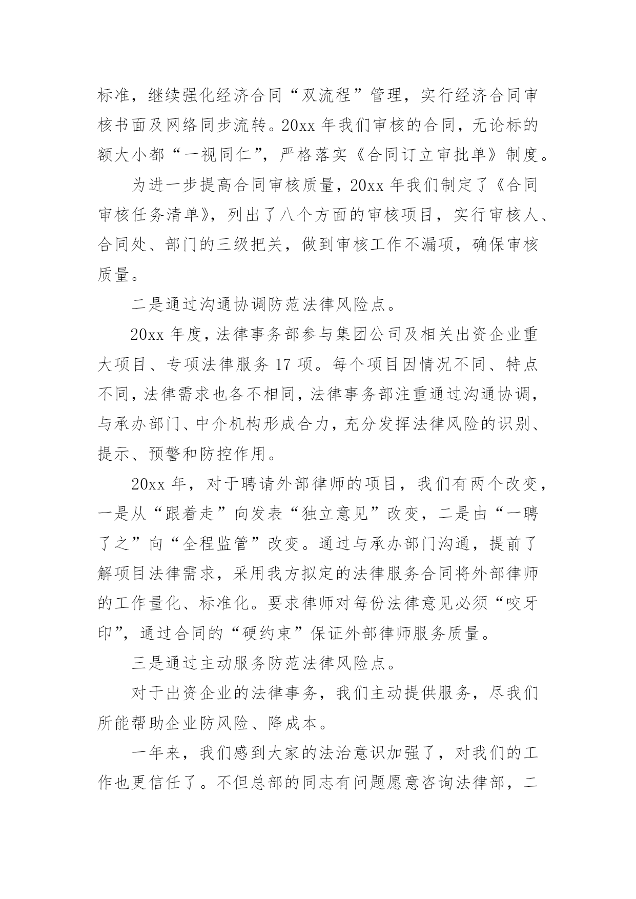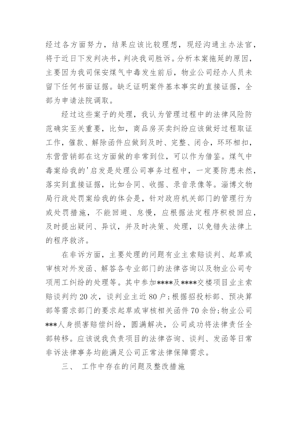 公司法务工作总结公司法务工作总结总结就是对一个时期的学习、工作或其完成情况进行一次全面系统的回顾和分析的书面材料,它能够给人努力工作的动力,我想我们需要写一份总结了吧。那么如何把总结写出新花样呢?以下是小编整理的公司法务工作总结,仅供参考,大家一起来看看吧。公司法务工作总结120xx年又是公司迅猛发展的一年,无论是内部战斗力,还是外部影响力,均有很大提升,比如房屋销售营业额破****亿再上新台阶,****称雄为国争光,作为公司的一名普通职工,我也很有自豪感。随着年底的临近,***年的工作接近尾声,也到了该对这一年工作进行总结的时候,对比公司的重大成就,总结自身日常工作中的进步与不足,以作为对自己日后工作的加油与鞭策。作为合同管理部的一名普通员工,在领导和同事的帮助下,我自认为在本职工作岗位上做到了勤勉尽责,能够达到工作岗位的职责要求,当然在工作中也存在一定的过失,值得总结教训。一、合同审核方面20xx年我先后负责的合同审核范围包括:***、***、***、***、全过程合同及年度合同的审核以及全部商品房买卖合同的抽查审核工作,并配合招投标部、采购部、营销部等部门针对这些项目进行招文会审、招标策划以及开标工作。起草、审核或抽查合同约800份,其中除根据工程正常进展报审合同外,解除合同约10份,变更合同约60份,发审核意见函约50份。个人认为,在合同报审中,合同管理部主要是一个服务配合部门,其职责是积极配合业务需求部门,做好合同审核工作,既要尽量杜绝或降低法律风险,又要满足公司发展进度需求,不耽误合同的签订下发。我也是以此为导向进行工作的,应该说20xx年合同审核工作,基本满足了公司发展进度,达到了风险防范的需求。二、法律事务方面在诉讼方面,先后处理****公司诉****技术(委托)合同纠纷案;莱芜金碧项目***、***等六商品房买卖合同纠纷案;****项目***、***两煤气中毒侵权责任纠纷案;****行政处罚强制执行案;****商品房买卖合同纠纷案等,其中***商品房买卖合同纠纷的处理,虽经历立案时的不顺,但最终以完胜结案,通过诉讼追收回款544万元,调解、判决的违约金比例达到商品房买卖合同总价款的6%-7%,追究违约金43万元。***、***两侵权责任案件属于标的额不大(共计五万余元)的“小案子”,但该案的复杂程度及运用的诉讼手段远超一般标的额较大的案件,取证、开庭、协调关系前后十多次,导致案件拖延时间很长。当然经过各方面努力,结果应该比较理想,现经沟通主办法官,将于近日下发判决书,判决我司胜诉。分析本案拖延的原因,主要因为我司保安煤气中毒发生前后,物业公司经办人员未留下任何书面证据。缺乏证明案件基本事实的直接证据,全部为申请法院调取。经过这些案子的处理,我认为管理过程中的法律风险防范确实至关重要,比如,商品房买卖纠纷应该做好过程取证工作,催款、解除函件应做到及时、完整、闭合,环环相扣,东营营销部在这方面做的非常到位,可以作为借鉴。煤气中毒案给我的'启发是处理公司事务过程中,一定要防患未然,落实到直接证据,比如合同、收据、录音录像等。淄博文物局行政处罚案给我的体会是,针对政府机关部门的管理行为或处罚措施,不能回避、怠慢,应根据法定程序积极回应,及时提出疑问、异议,并及时决策、处理,以免错失法律上的程序救济。在非诉方面,主要处理的问题有业主索赔谈判、起草或审核对外发函、解答各专业部门的法律咨询以及物业公司专项用工纠纷的处理等。其中参加****及****交楼项目业主索赔谈判约20次,谈判业主近80户;根据招投标部、预决算部等需求部门的要求起草或审核相关函件70余份;物业公司***人身损害赔偿纠纷,圆满解决,公司成功将法律责任全部转移。应该说我负责项目的法律咨询、谈判、发函等日常非诉法律事务均能满足公司正常法律保障需求。三、工作中存在的问题及整改措施20xx年的工作中,虽然能够在合同审核、法律事务处理中满足公司工作需求,没有实质性大的错误,但确实存在一定的过失,被问责过两次,值得反思与检讨。其中一次问责是因为****商品房案件未能与同一批次的其他地区同类案件同时立案;另一次问责,是因为开发部进度紧急,未按照正常程序走审批流程,盖章时的合同版本被对方篡改,未能及时发现,虽然后来得以弥补,但毕竟给领导工作带来了被动。尽管都是事出有因,比如第一次是因为****法院立案庭受被告业主社会关系影响违法办案(故意刁难、拖延立案),直到我司到当地人民代表大会控告督办,才得以成功立案。但作为公司管理来讲,公司或领导要的是结果,解决问题是关键,过程如何特殊是次要的。所以,不管原因如何,结果出了问题,就应该承担相应的责任,日后的工作就应该接受教训。一件事情的失败或过错,先不要讲原因,不需要为失败找理由,而应该尽快为成功找出路。我相信,总结过去一年的
