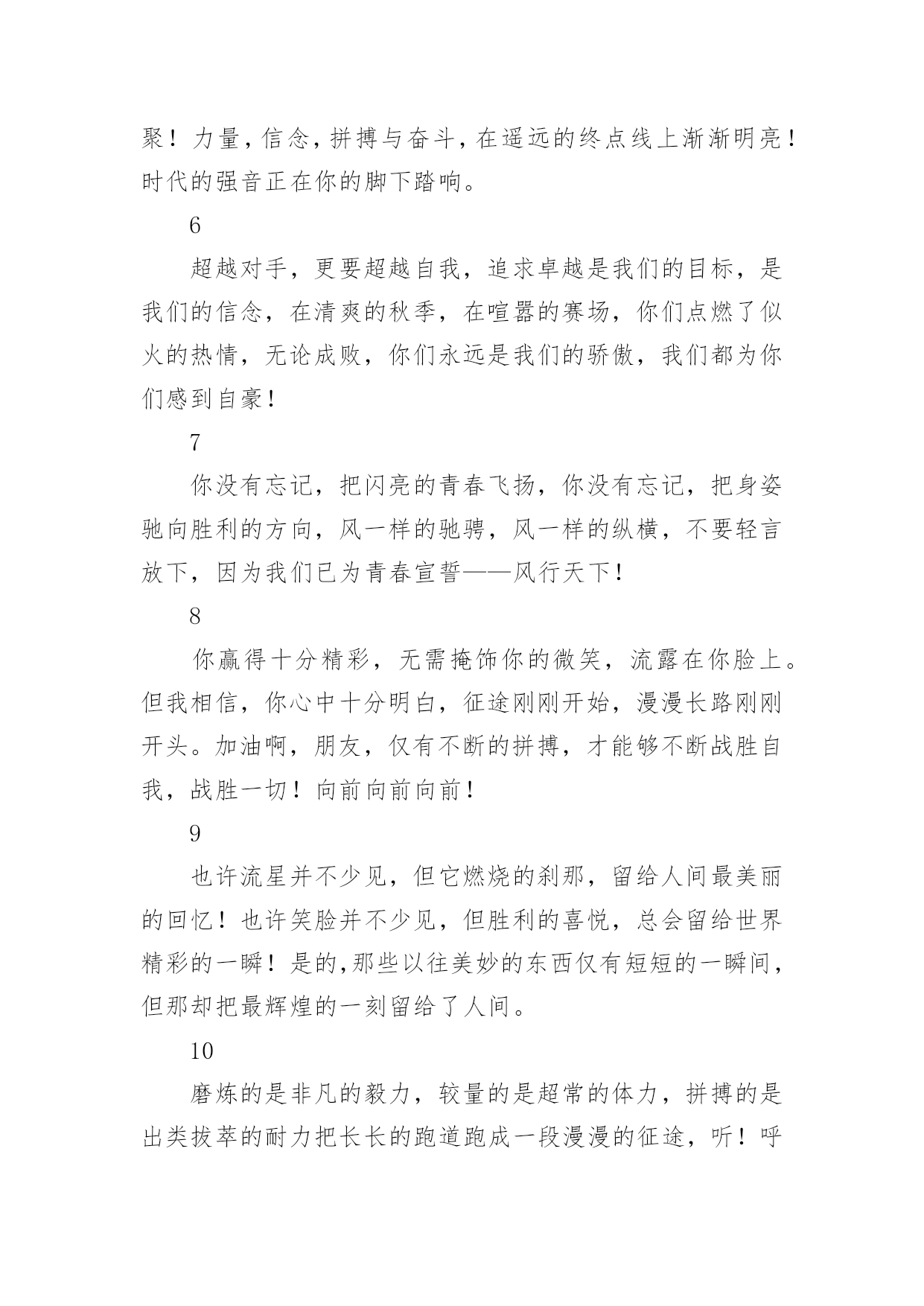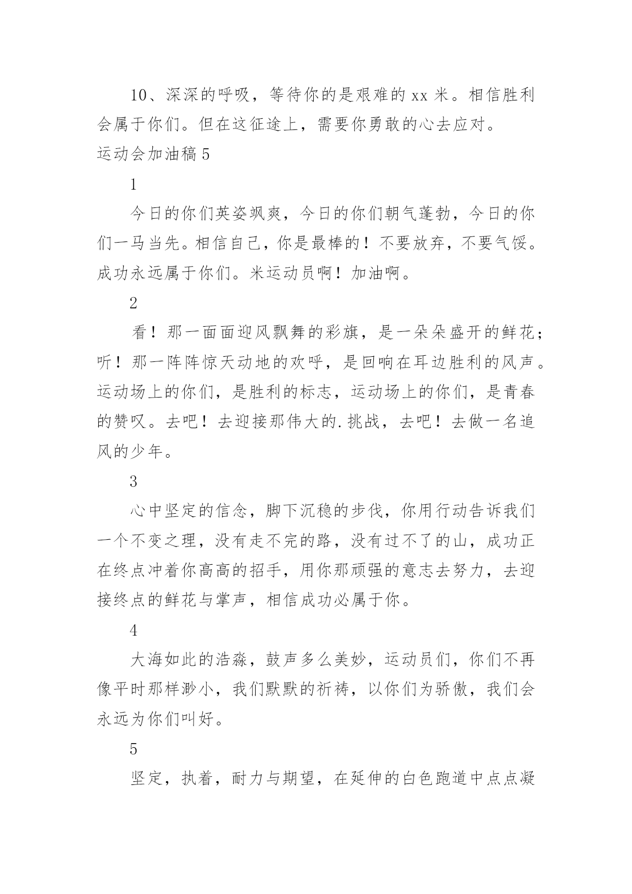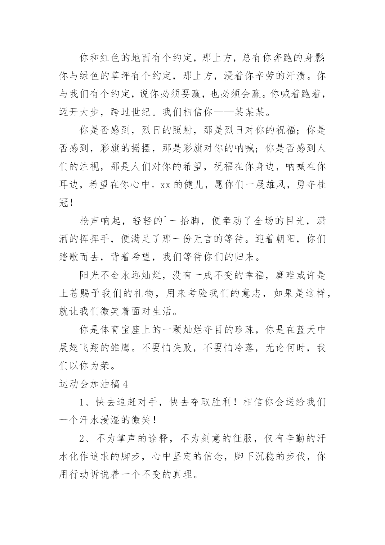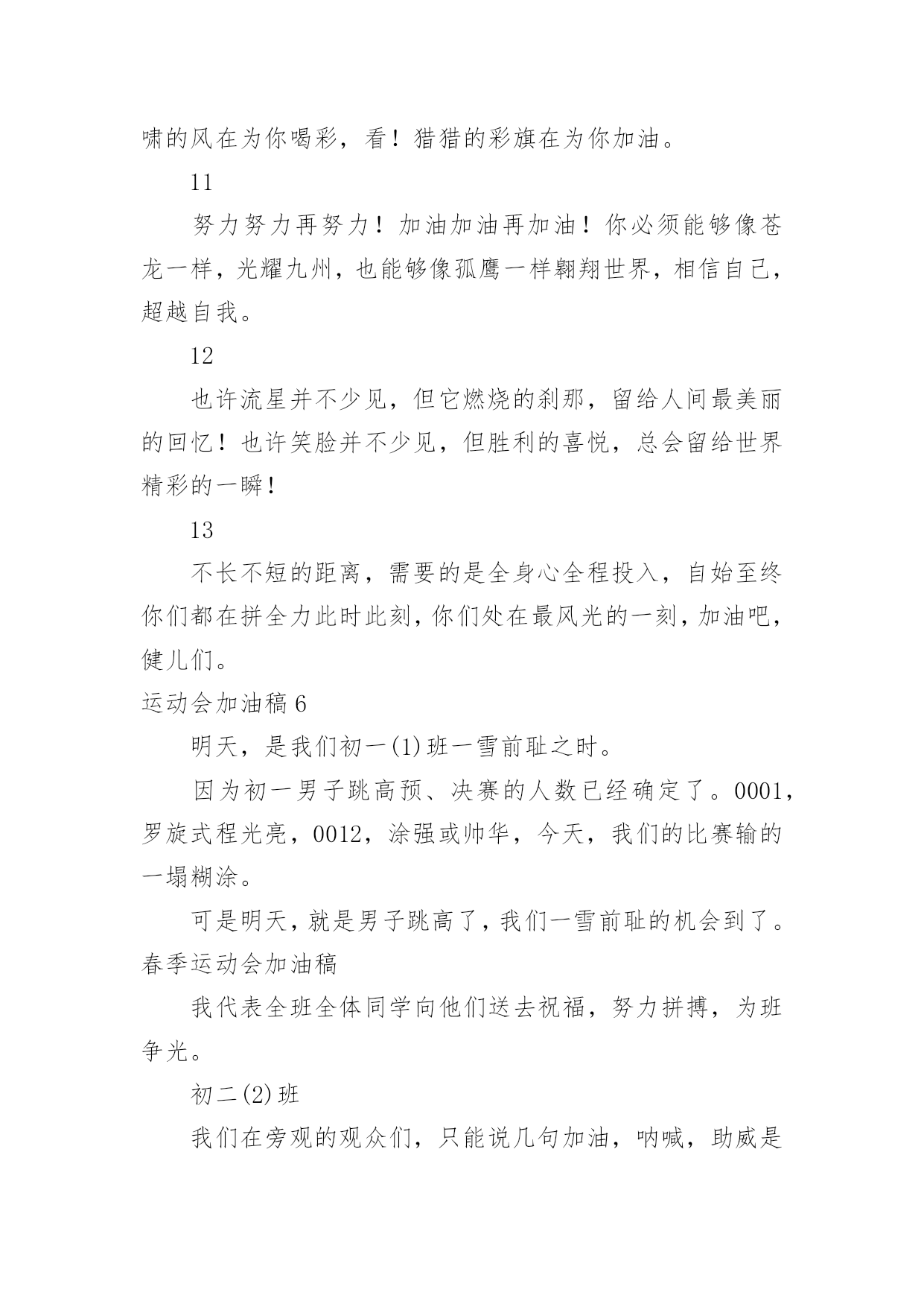运动会加油稿运动会加油稿在现实社会中,用到加油稿的地方越来越多,加油稿可以增添对方必胜的勇气和信心。你知道加油稿怎样写才规范吗?下面是小编帮大家整理的运动会加油稿,仅供参考,大家一起来看看吧。运动会加油稿1运动员那矫健的身姿,在1500米跑道上飞翔着,加油、加油、再加油……一滴滴的汗水,一丝丝的希望,人生能有几次搏,千百双眼睛在鼓励着你们,努力拼搏吧!胜利就在眼前!运动场上有你们的`飒爽英姿,运动场上有你们的拼搏身影,面对漫漫的征途,你没有畏惧和退缩,任汗水打湿脊背,任疲惫爬满全身,依然奋力追赶,只有一个目标,只有一个信念,为班级赢得荣誉,拼搏吧!为我你们呐喊!加油!是种子就该有绿色的希望,是种子就该有金色的梦想,不要躺在封闭的暖房。怕什么秋日薄薄的风霜,既然已走上了运动场,心里就不要多想,跑道已洒满阳光,不要羞涩、不要紧张,听秋雁在空中为你歌唱,快去拾取片片金黄充满信心,就有希望。悄悄的,我退居一旁避开所有的掌声和目光,远离胜利者的灿烂和辉煌。如果说生命也是一场竞争我参与也曾把竞争的滋味品尝。那么,让我也抬起头甩掉心中的压抑,下次运动员我仍会同你较量。这里需要激情,这里需要呐喊,这里同样需要掌声。当你乘胜而归,我们为你鼓掌,为你祝贺,当你失败而来,我们同样为你鼓掌,为你骄傲。当掌声再一次想起的时候,你已经站在了起跑线上,朋友,向前冲!我们在为你鼓掌。运动会加油稿21、老师们、同学们,体育从来都是人类社会的兴奋点,也是热血青少年张扬个性、展示风采的舞台,体育是力量的角逐;体育是智慧的较量;体育是美丽的展示。在紧张激烈的赛场上,我希望全体运动健儿要以奥运体育健儿为榜样,以饱满的激情,昂扬的斗志,勇于拼搏的信念,团结向上的精神投入到本届运动会中去。在运动会上,赛出成绩,赛出水平,赛出新风尚!用实际行动去追求更高、更快、更强!2、漫漫长路,你愿一人独撑,忍受着孤独与寂寞,承受着体力与精神的压迫,只任汗水溶于泪水,可脚步却从不停歇。好样的,纵然得不了桂冠,可坚持的你,定会赢得最后的掌声。柳树抽出新芽,怎能忘了春风的吹拂?小草钻出泥土,怎能忘了春雨的滋润?花儿绽开美丽笑脸,怎能忘了太阳爱抚?孩子们的成长更不能忘记老师的培养。今天,我们成绩的取得,怎能忘记您,公正无私的裁判员老师您是运动场上正义的化身,您是比赛场中公证的使者,您手中挥动的`令旗,为比赛增添一道亮丽的风景线!我们为你高歌,我们为你欢唱,我们衷心地道一声:“辛苦了,敬爱的裁判。”3、也许,震天的呼声于你们无缘,但,挚起那片欢呼声的是你们的目光!也许,炙热的高阳不曾怜悯你们,但,烈阳底下是你们高大的身影。也许,赞美与期盼总于你们擦肩而过,但,真正的感激未尝不在每个人心中流淌。无声的话语化作一声:老师,荣誉有你的一份。4、温暖的阳光洒在赛场上,男子乙组标枪的比赛即将开始。赛场上,一道道优美的弧线将轻盈地划过天空。健儿们用手中的标枪向距离的权限发起一轮又一轮的挑战。标枪在空中轻盈的姿态,是健儿们强健的力量和熟练的技巧的结合。谁能在这场激烈的竞争中获胜?让我们拭目以待,让我们为他们呐喊、助威吧!只有将力量与技巧合二为一的人,才能获得胜利的桂冠!5、多少次挥汗如雨,伤痛曾添满记忆,只因为始终相信,去拼搏才能胜利。总在鼓舞自己,要成功就得努力。热血在赛场沸腾,巨人在赛场升起。相信自己,你将赢得胜利,创造奇迹;相信自己,梦想在你手中,这是你的天地。当一切过去,你们将是第一。相信自己,你们将超越极限,超越自己!相信自己,加油吧,健儿们,相信你自己。运动会加油稿3你和红色的地面有个约定,那上方,总有你奔跑的身影;你与绿色的草坪有个约定,那上方,浸着你辛劳的汗渍。你与我们有个约定,说你必须要赢,也必须会赢。你喊着跑着,迈开大步,跨过世纪。我们相信你——某某某。你是否感到,烈日的照射,那是烈日对你的祝福;你是否感到,彩旗的摇摆,那是彩旗对你的呐喊;你是否感到人们的注视,那是人们对你的希望,祝福在你身边,呐喊在你耳边,希望在你心中。xx的健儿,愿你们一展雄风,勇夺桂冠!枪声响起,轻轻的`一抬脚,便牵动了全场的目光,潇洒的挥挥手,便满足了那一份无言的等待。迎着朝阳,你们踏歌而去,背着希望,我们等待你们的归来。阳光不会永远灿烂,没有一成不变的幸福,磨难或许是上苍赐予我们的礼物,用来考验我们的意志,如果是这样,就让我们微笑着面对生活。你是体育宝座上的一颗灿烂夺目的珍珠,你是在蓝天中展翅飞翔的雏鹰。不要怕失败,不要怕冷落,无论何时,我们以你为荣。运动会加油稿41、快去追赶对手,快去夺取胜利!相信你会送给我们一个汗水浸湿的微笑!2、不为掌声的诠释,不为刻意的征服,仅有辛勤的汗水化作追求的脚步,心中坚定的信念,脚下沉稳的步伐,你用行动诉说着一个不变的真理。3、泥泞的'路走过无数,累了,告诉自我:快了,再坚持