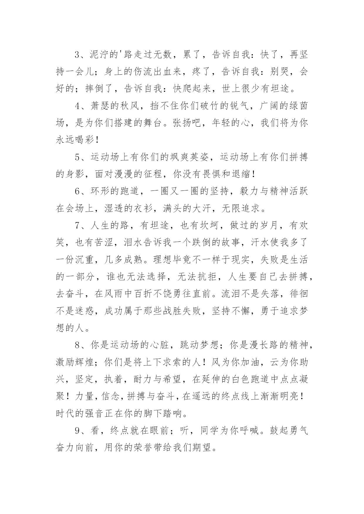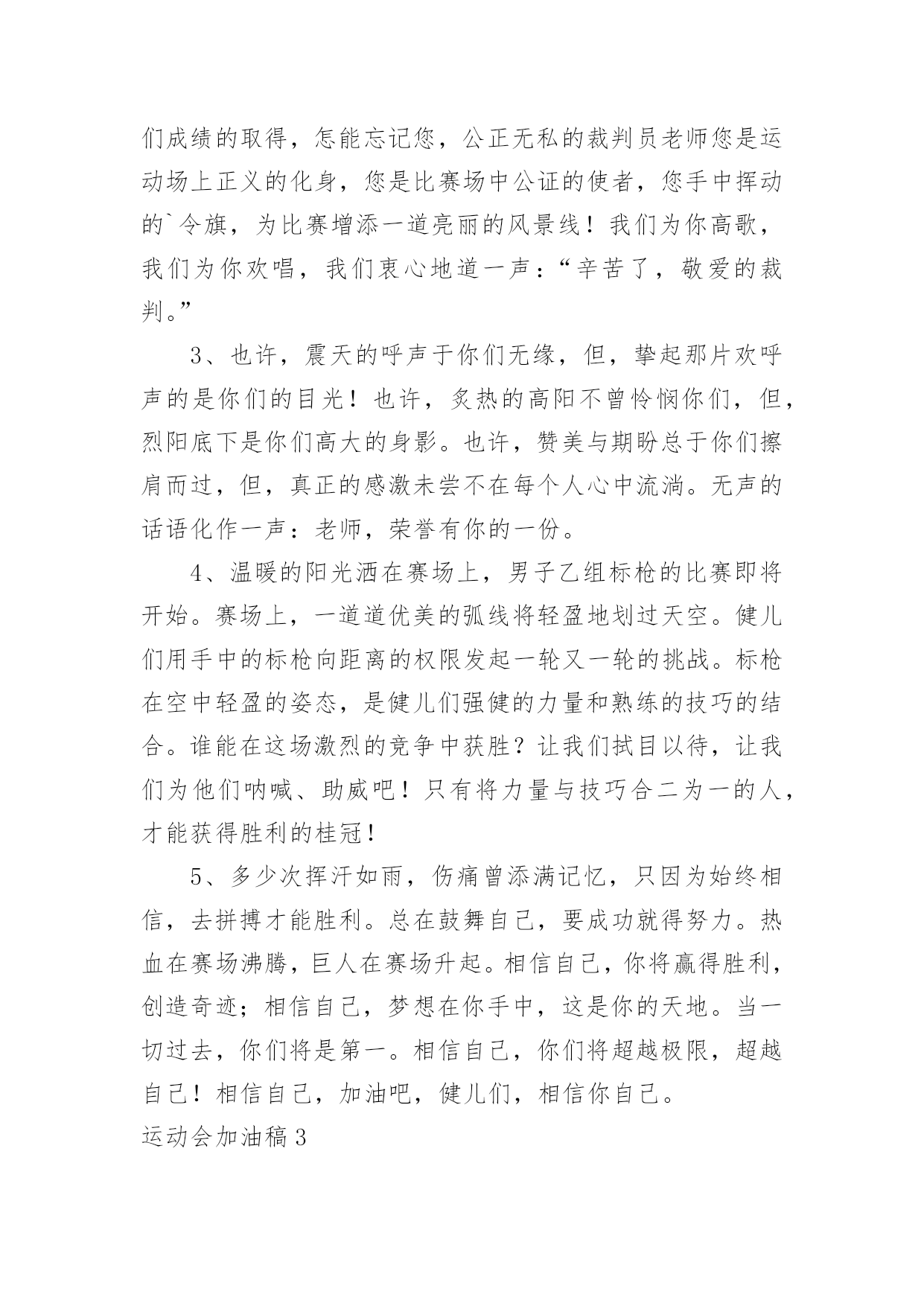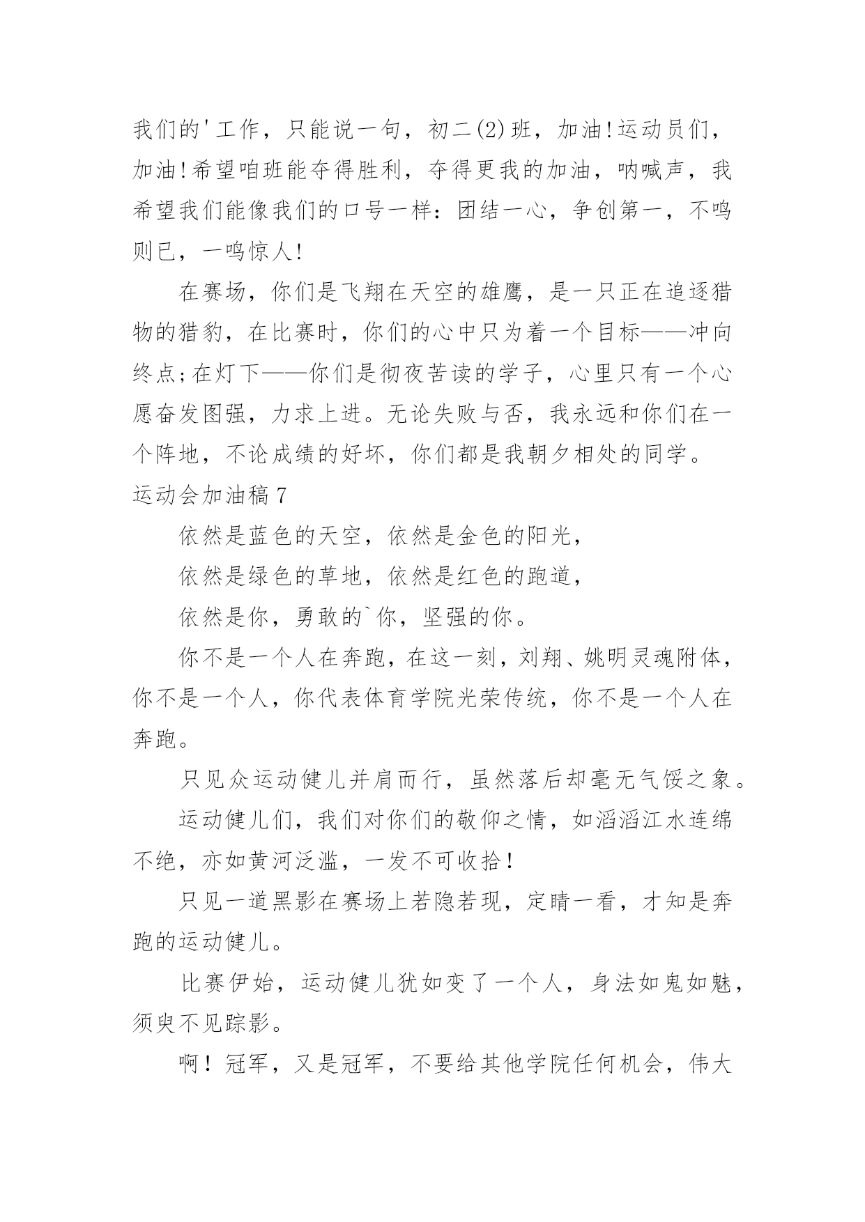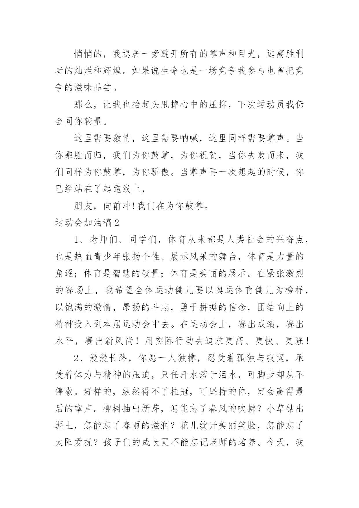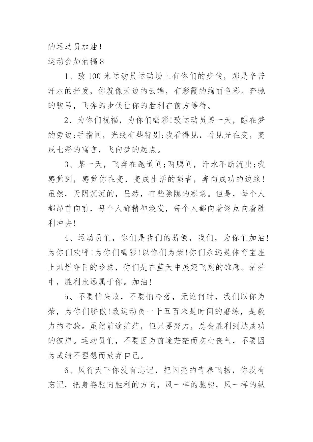 运动会加油稿运动会加油稿在现实社会中,用到加油稿的地方越来越多,加油稿可以增添对方必胜的勇气和信心。你知道加油稿怎样写才规范吗?下面是小编帮大家整理的运动会加油稿,仅供参考,大家一起来看看吧。运动会加油稿1运动员那矫健的身姿,在1500米跑道上飞翔着,加油、加油、再加油……一滴滴的汗水,一丝丝的希望,人生能有几次搏,千百双眼睛在鼓励着你们,努力拼搏吧!胜利就在眼前!运动场上有你们的`飒爽英姿,运动场上有你们的拼搏身影,面对漫漫的征途,你没有畏惧和退缩,任汗水打湿脊背,任疲惫爬满全身,依然奋力追赶,只有一个目标,只有一个信念,为班级赢得荣誉,拼搏吧!为我你们呐喊!加油!是种子就该有绿色的希望,是种子就该有金色的梦想,不要躺在封闭的暖房。怕什么秋日薄薄的风霜,既然已走上了运动场,心里就不要多想,跑道已洒满阳光,不要羞涩、不要紧张,听秋雁在空中为你歌唱,快去拾取片片金黄充满信心,就有希望。悄悄的,我退居一旁避开所有的掌声和目光,远离胜利者的灿烂和辉煌。如果说生命也是一场竞争我参与也曾把竞争的滋味品尝。那么,让我也抬起头甩掉心中的压抑,下次运动员我仍会同你较量。这里需要激情,这里需要呐喊,这里同样需要掌声。当你乘胜而归,我们为你鼓掌,为你祝贺,当你失败而来,我们同样为你鼓掌,为你骄傲。当掌声再一次想起的时候,你已经站在了起跑线上,朋友,向前冲!我们在为你鼓掌。运动会加油稿21、老师们、同学们,体育从来都是人类社会的兴奋点,也是热血青少年张扬个性、展示风采的舞台,体育是力量的角逐;体育是智慧的较量;体育是美丽的展示。在紧张激烈的赛场上,我希望全体运动健儿要以奥运体育健儿为榜样,以饱满的激情,昂扬的斗志,勇于拼搏的信念,团结向上的精神投入到本届运动会中去。在运动会上,赛出成绩,赛出水平,赛出新风尚!用实际行动去追求更高、更快、更强!2、漫漫长路,你愿一人独撑,忍受着孤独与寂寞,承受着体力与精神的压迫,只任汗水溶于泪水,可脚步却从不停歇。好样的,纵然得不了桂冠,可坚持的你,定会赢得最后的掌声。柳树抽出新芽,怎能忘了春风的吹拂?小草钻出泥土,怎能忘了春雨的滋润?花儿绽开美丽笑脸,怎能忘了太阳爱抚?孩子们的成长更不能忘记老师的培养。今天,我们成绩的取得,怎能忘记您,公正无私的裁判员老师您是运动场上正义的化身,您是比赛场中公证的使者,您手中挥动的`令旗,为比赛增添一道亮丽的风景线!我们为你高歌,我们为你欢唱,我们衷心地道一声:“辛苦了,敬爱的裁判。”3、也许,震天的呼声于你们无缘,但,挚起那片欢呼声的是你们的目光!也许,炙热的高阳不曾怜悯你们,但,烈阳底下是你们高大的身影。也许,赞美与期盼总于你们擦肩而过,但,真正的感激未尝不在每个人心中流淌。无声的话语化作一声:老师,荣誉有你的一份。4、温暖的阳光洒在赛场上,男子乙组标枪的比赛即将开始。赛场上,一道道优美的弧线将轻盈地划过天空。健儿们用手中的标枪向距离的权限发起一轮又一轮的挑战。标枪在空中轻盈的姿态,是健儿们强健的力量和熟练的技巧的结合。谁能在这场激烈的竞争中获胜?让我们拭目以待,让我们为他们呐喊、助威吧!只有将力量与技巧合二为一的人,才能获得胜利的桂冠!5、多少次挥汗如雨,伤痛曾添满记忆,只因为始终相信,去拼搏才能胜利。总在鼓舞自己,要成功就得努力。热血在赛场沸腾,巨人在赛场升起。相信自己,你将赢得胜利,创造奇迹;相信自己,梦想在你手中,这是你的天地。当一切过去,你们将是第一。相信自己,你们将超越极限,超越自己!相信自己,加油吧,健儿们,相信你自己。运动会加油稿3你和红色的地面有个约定,那上方,总有你奔跑的身影;你与绿色的草坪有个约定,那上方,浸着你辛劳的汗渍。你与我们有个约定,说你必须要赢,也必须会赢。你喊着跑着,迈开大步,跨过世纪。我们相信你——某某某。你是否感到,烈日的照射,那是烈日对你的祝福;你是否感到,彩旗的摇摆,那是彩旗对你的呐喊;你是否感到人们的注视,那是人们对你的希望,祝福在你身边,呐喊在你耳边,希望在你心中。xx的健儿,愿你们一展雄风,勇夺桂冠!枪声响起,轻轻的`一抬脚,便牵动了全场的目光,潇洒的挥挥手,便满足了那一份无言的等待。迎着朝阳,你们踏歌而去,背着希望,我们等待你们的归来。阳光不会永远灿烂,没有一成不变的幸福,磨难或许是上苍赐予我们的礼物,用来考验我们的意志,如果是这样,就让我们微笑着面对生活。你是体育宝座上的一颗灿烂夺目的珍珠,你是在蓝天中展翅飞翔的雏鹰。不要怕失败,不要怕冷落,无论何时,我们以你为荣。运动会加油稿41、快去追赶对手,快去夺取胜利!相信你会送给我们一个汗水浸湿的微笑!2、不为掌声的诠释,不为刻意的征服,仅有辛勤的汗水化作追求的脚步,心中坚定的信念,脚下沉稳的步伐,你用行动诉说着一个不变的真理。3、泥泞的'路走过无数,累了,告诉自我:快了,再坚持