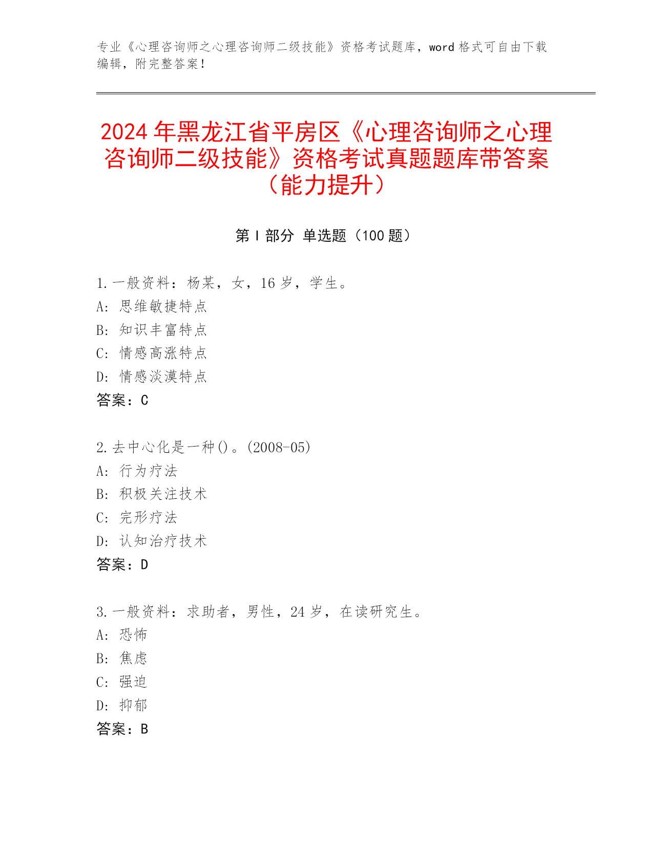 2024年黑龙江省平房区《心理咨询师之心理咨询师二级技能》资格考试真题题库带答案(能力提升)