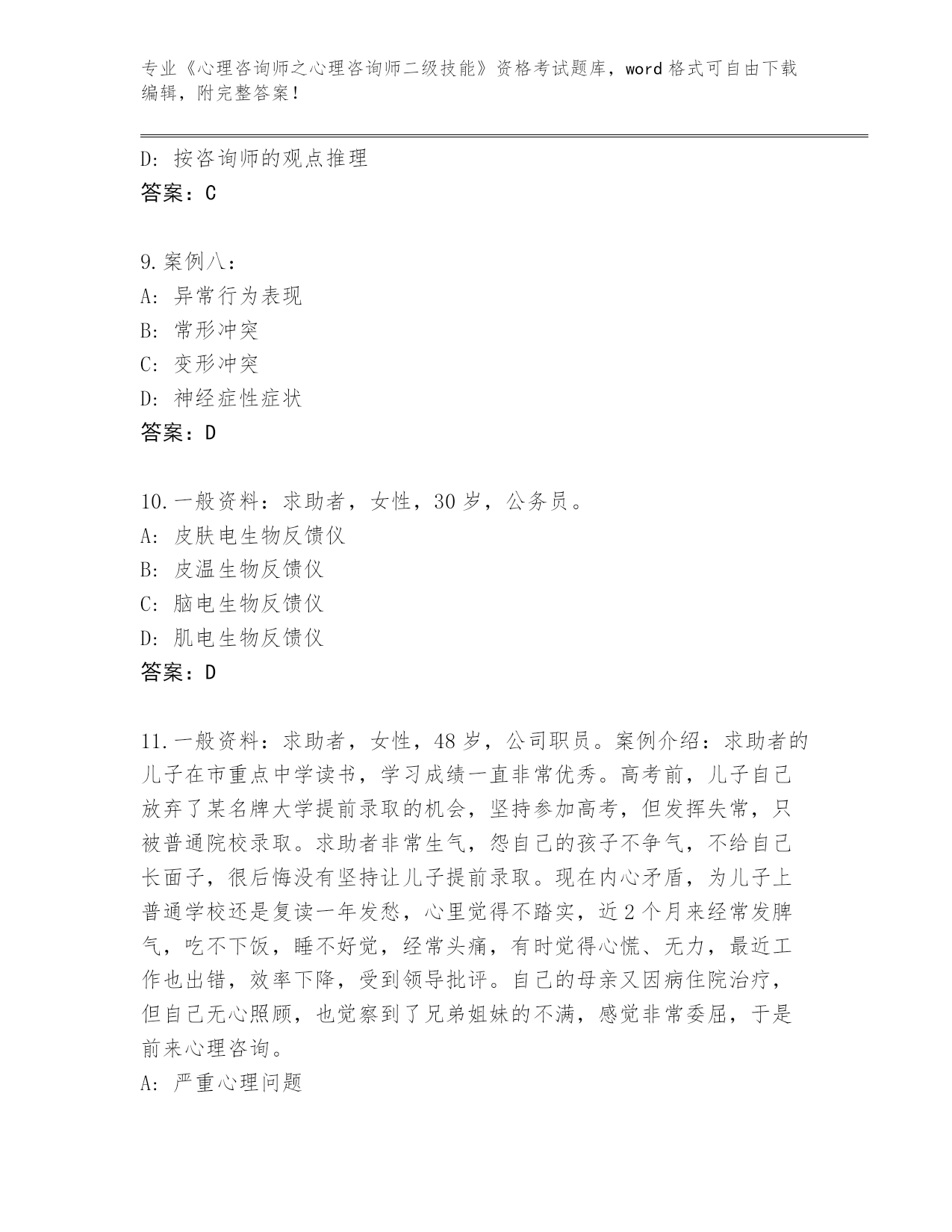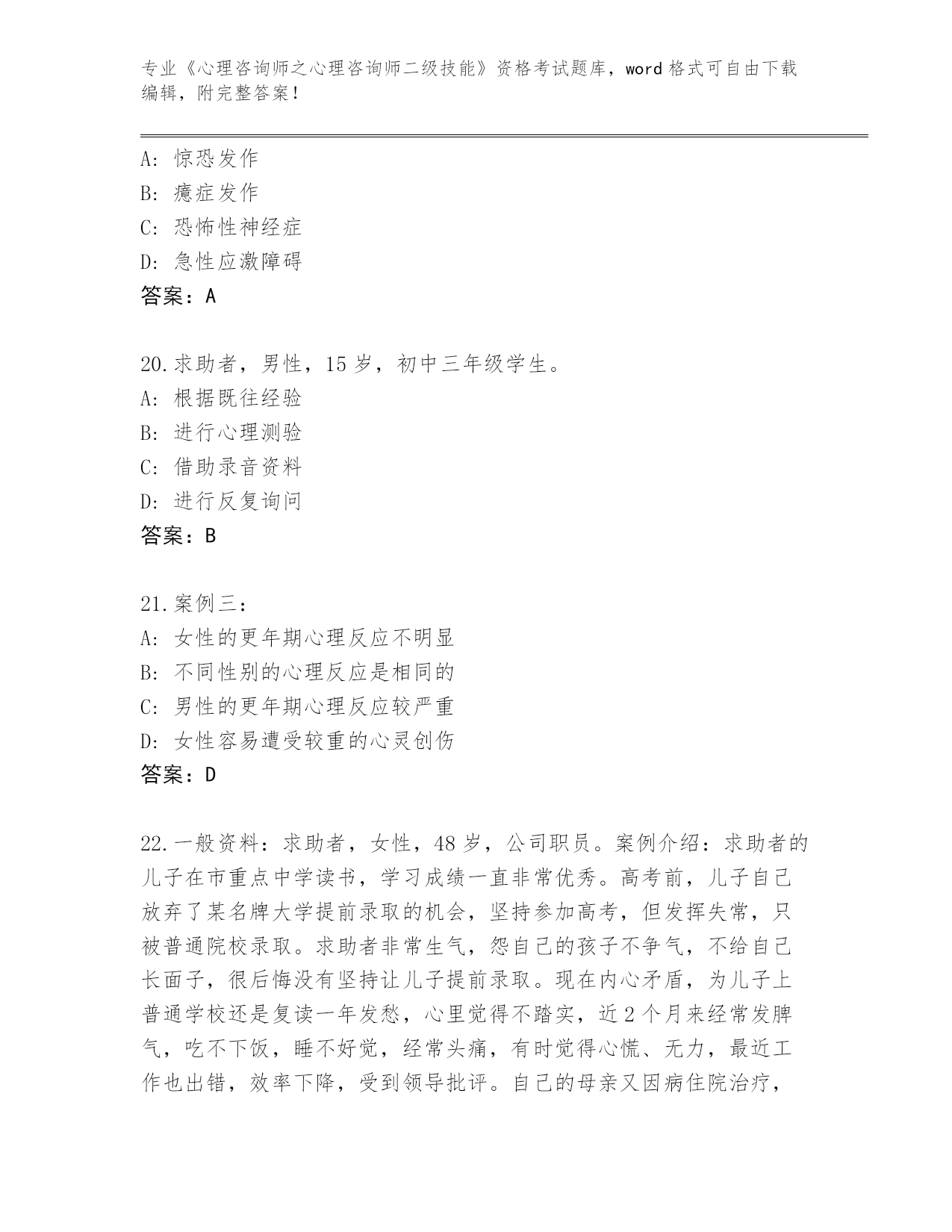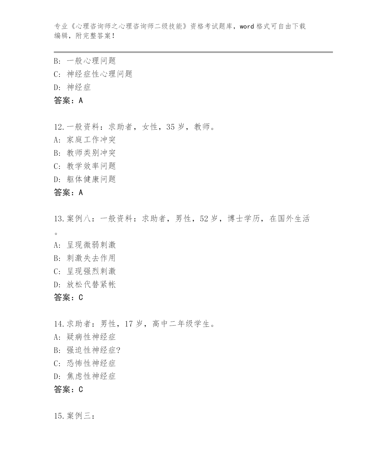 2024年安徽省《心理咨询师之心理咨询师二级技能》资格考试必背200题真题带答案(能力提升)