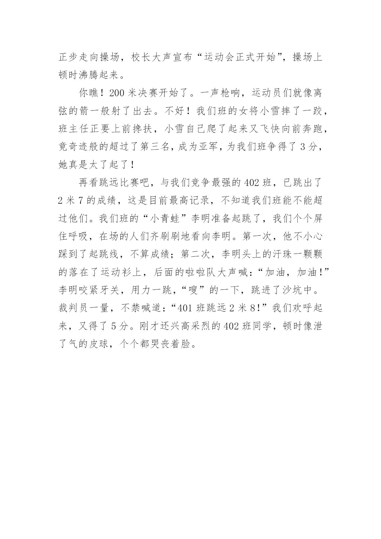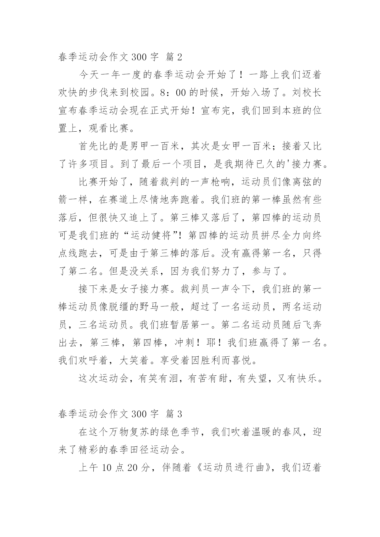 春季运动会作文300字【精选】春季运动会作文300字三篇在平平淡淡的日常中,大家或多或少都会接触过作文吧,作文可分为小学作文、中学作文、大学作文(论文)。那么你有了解过作文吗?以下是小编收集整理的春季运动会作文300字3篇,希望能够帮助到大家。春季运动会作文300字篇1星期四上午,我高兴不已,异常兴奋,因为我们学校第四届春季运动会即将拉开序幕。首先是每个班的出场秀,大家排着整整齐齐队伍入场,我们班与众不同,主要有李钦鹏做代表,表演武术。裁判员,运动员回到自己的位置,紧接着激烈的比赛开始了。运动员在赛场上为班级争夺荣誉,其他同学作为拉拉队员,队长喊运动员的名字,大家喊加油,加油,配合的特别密切,我们的嗓子都快要很破了,喊着喊着紧张的运动会就快要结束了。在这次运动会上,最激动人心的时刻到了,老师开始颁发奖状,我们屏住呼吸,竖起耳朵听着,我们班得了团体第一名,出场秀第一名,我们班顿时掌声雷动,热热烈烈划破长空,掌声响起来,为二二班喝彩,这是运动员和全班同学用汗水换来的,只有团结一致,才能取得好成绩。春季运动会作文300字篇2今天一年一度的春季运动会开始了!一路上我们迈着欢快的步伐来到校园。8:00的时候,开始入场了。刘校长宣布春季运动会现在正式开始!宣布完,我们回到本班的位置上,观看比赛。首先比的是男甲一百米,其次是女甲一百米;接着又比了许多项目。到了最后一个项目,是我期待已久的'接力赛。比赛开始了,随着裁判的一声枪响,运动员们像离弦的箭一样,在赛道上尽情地奔跑着。我们班的第一棒虽然有些落后,但很快又追上了。第三棒又落后了,第四棒的运动员可是我们班的“运动健将”!第四棒的运动员拼尽全力向终点线跑去,可是由于第三棒的落后。没有赢得第一名,只得了第二名。但是没关系,因为我们努力了,参与了。接下来是女子接力赛。裁判员一声令下,我们班的第一棒运动员像脱缰的野马一般,超过了一名运动员,两名运动员,三名运动员。我们班暂居第一。第二名运动员随后飞奔出去,第三棒,第四棒,冲刺!耶!我们班赢得了第一名。我们欢呼着,大笑着。享受着因胜利而喜悦。这次运动会,有笑有泪,有苦有甜,有失望,又有快乐。春季运动会作文300字篇3在这个万物复苏的绿色季节,我们吹着温暖的春风,迎来了精彩的春季田径运动会。上午10点20分,伴随着《运动员进行曲》,我们迈着正步走向操场,校长大声宣布“运动会正式开始”,操场上顿时沸腾起来。你瞧!200米决赛开始了。一声枪响,运动员们就像离弦的箭一般射了出去。不好!我们班的女将小雪摔了一跤,班主任正要上前搀扶,小雪自己爬了起来又飞快向前奔跑,竟奇迹般的超过了第三名,成为亚军,为我们班争得了3分,她真是太了起了!再看跳远比赛吧,与我们竞争最强的402班,已跳出了2米7的成绩,这是目前最高记录,不知道我们班能不能超过他们。我们班的“小青蛙”李明准备起跳了,我们个个屏住呼吸,在场的人们齐刷刷地看向李明。第一次,他不小心踩到了起跳线,不算成绩;第二次,李明头上的汗珠一颗颗的落在了运动衫上,后面的啦啦队大声喊:“加油,加油!”李明咬紧牙关,用力一跳,“嗖”的一下,跳进了沙坑中。裁判员一量,不禁喊道:“401班跳远2米8!”我们欢呼起来,又得了5分。刚才还兴高采烈的402班同学,顿时像泄了气的皮球,个个都哭丧着脸。