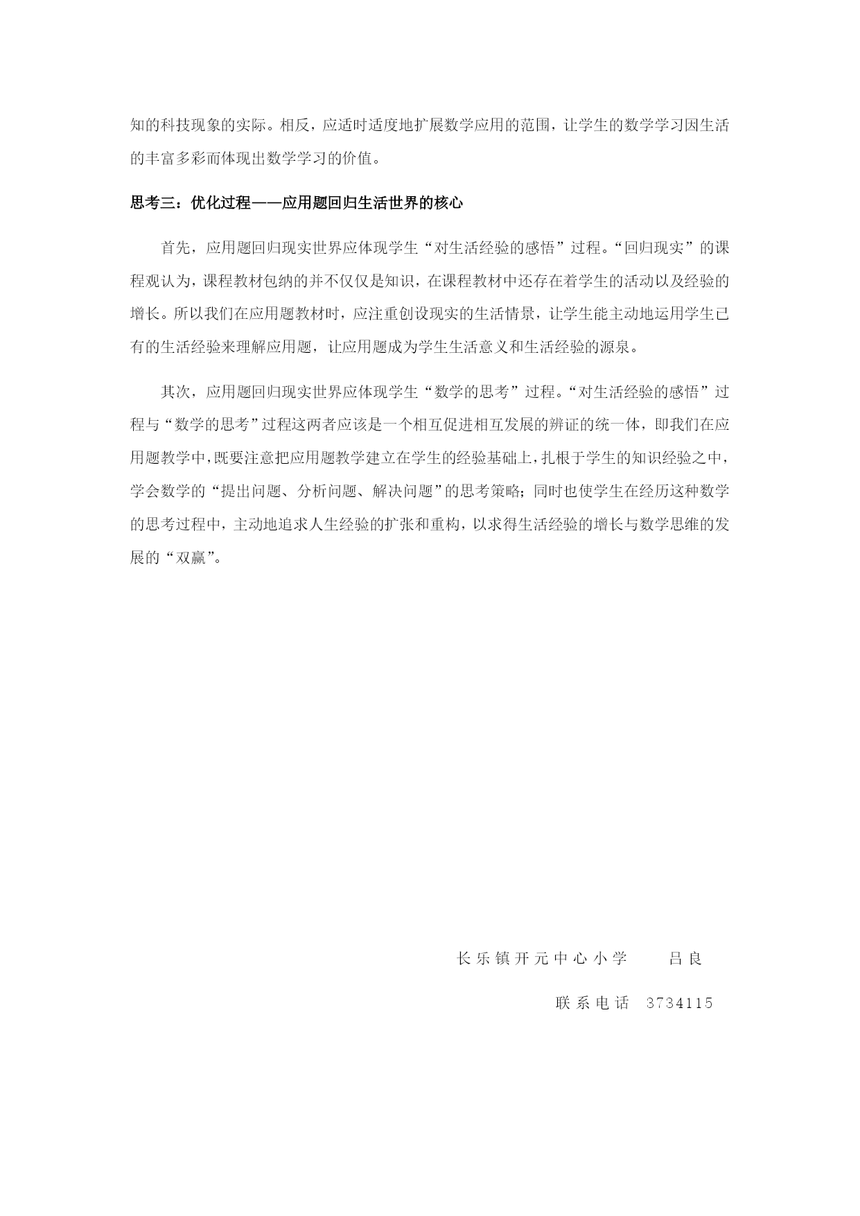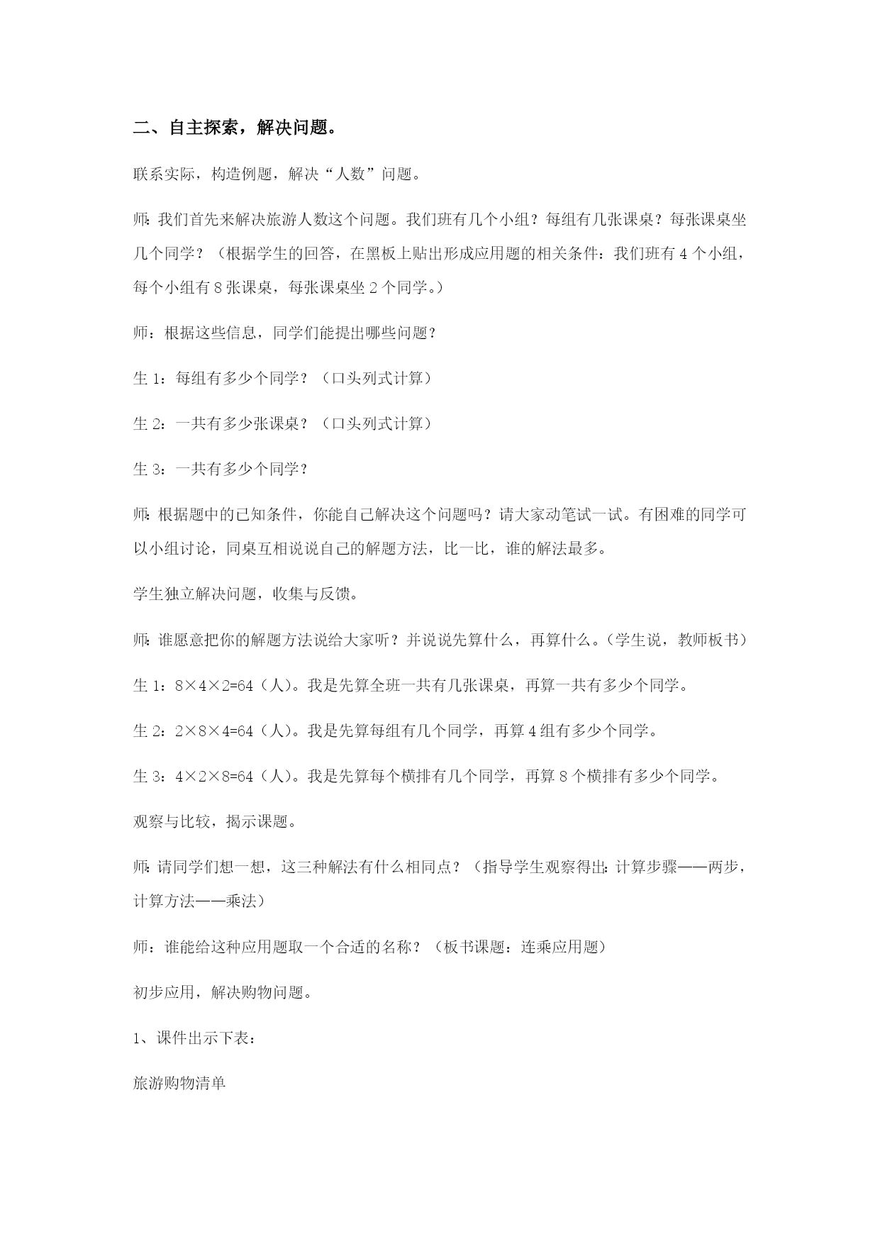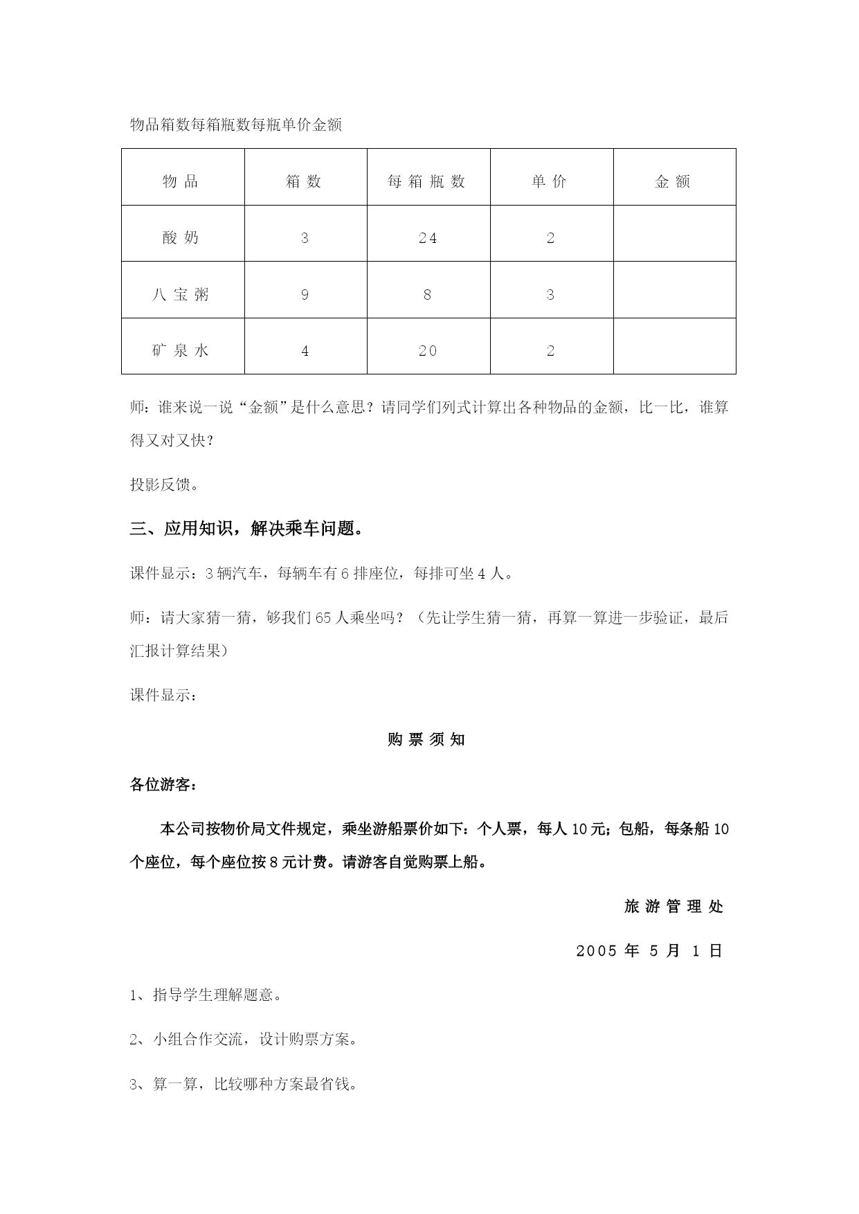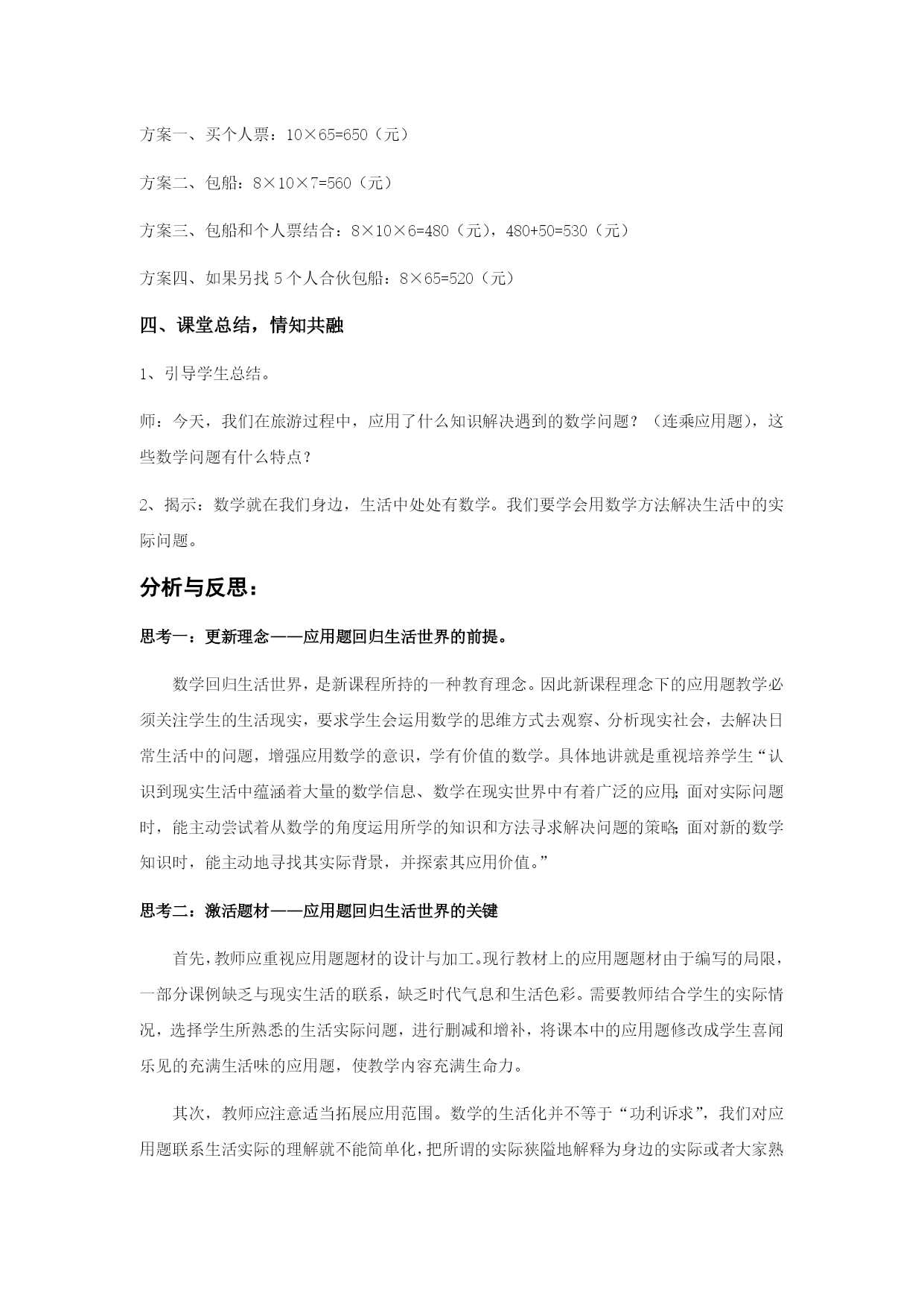 让数学回归生活引言与背景:让数学回归生活,是新课程所持的一种教育理念。因此新课程理念下的应用题教学必须关注学生的生活现实,要求学生会运用数学的思维方式去观察、分析现实社会,去解决日常生活中的问题,增强应用数学的意识,学有价值的数学。培养学生应用意识的最有效办法应该是让学生有机会亲身实践。教学中,教师应该努力发掘有价值的专题活动、实习作业,让学生在现实中寻求解决方案;也可以不到校外,而通过模拟现实,培养学生的应用意识。连乘应用题是第六册第二单元里的内容,之所以选择这堂课开展教学研究是想尝试着对新课标“数学来源于生活,而又服务于生活”这个理念进行探究。本节课的教学目标是让学生感知一般连乘应用题的特征,会口述解题思路,能用两种不同方法解答。能根据现实情景和信息提出问题,通过观察、思考,设想出不同的解决问题的方法,培养学生探索意识和求异思维。使学生感受到生活种处处有数学问题,激发学生学习数学的兴趣,培养学生进一步的数学应用意识。过程:一、创设情境,引发问题师:同学们,你到过美丽的“南山湖风景区”吗?你能向同学们介绍一下那里有哪些美丽的景点?(学生介绍)听了大家的介绍,我想请同学们当老师的导游,我们一起去游览“南山湖”,大家同意吗?师:出门旅游,要考虑哪些问题呢?生1:我们要带食物和钱。生2:我们要考虑怎样去?生3:我们首先要考虑旅游的人数。……师板书需要解决的问题:人数、物品、乘车、购票二、自主探索,解决问题。联系实际,构造例题,解决“人数”问题。师:我们首先来解决旅游人数这个问题。我们班有几个小组?每组有几张课桌?每张课桌坐几个同学?(根据学生的回答,在黑板上贴出形成应用题的相关条件:我们班有4个小组,每个小组有8张课桌,每张课桌坐2个同学。)师:根据这些信息,同学们能提出哪些问题?生1:每组有多少个同学?(口头列式计算)生2:一共有多少张课桌?(口头列式计算)生3:一共有多少个同学?师:根据题中的已知条件,你能自己解决这个问题吗?请大家动笔试一试。有困难的同学可以小组讨论,同桌互相说说自己的解题方法,比一比,谁的解法最多。学生独立解决问题,收集与反馈。师:谁愿意把你的解题方法说给大家听?并说说先算什么,再算什么。(学生说,教师板书)生1:8×4×2=64(人)。我是先算全班一共有几张课桌,再算一共有多少个同学。生2:2×8×4=64(人)。我是先算每组有几个同学,再算4组有多少个同学。生3:4×2×8=64(人)。我是先算每个横排有几个同学,再算8个横排有多少个同学。观察与比较,揭示课题。师:请同学们想一想,这三种解法有什么相同点?(指导学生观察得出:计算步骤——两步,计算方法——乘法)师:谁能给这种应用题取一个合适的名称?(板书课题:连乘应用题)初步应用,解决购物问题。1、课件出示下表:旅游购物清单物品箱数每箱瓶数每瓶单价金额物品箱数每箱瓶数单价金额酸奶3242八宝粥983矿泉水4202师:谁来说一说“金额”是什么意思?请同学们列式计算出各种物品的金额,比一比,谁算得又对又快?投影反馈。三、应用知识,解决乘车问题。课件显示:3辆汽车,每辆车有6排座位,每排可坐4人。师:请大家猜一猜,够我们65人乘坐吗?(先让学生猜一猜,再算一算进一步验证,最后汇报计算结果)课件显示:购票须知各位游客:本公司按物价局文件规定,乘坐游船票价如下:个人票,每人10元;包船,每条船10个座位,每个座位按8元计费。请游客自觉购票上船。旅游管理处2005年5月1日1、指导学生理解题意。2、小组合作交流,设计购票方案。3、算一算,比较哪种方案最省钱。方案一、买个人票:10×65=650(元)方案二、包船:8×10×7=560(元)方案三、包船和个人票结合:8×10×6=480(元),480+50=530(元)方案四、如果另找5个人合伙包船:8×65=520(元)四、课堂总结,情知共融1、引导学生总结。师:今天,我们在旅游过程中,应用了什么知识解决遇到的数学问题?(连乘应用题),这些数学问题有什么特点?2、揭示:数学就在我们身边,生活中处处有数学。我们要学会用数学方法解决生活中的实际问题。分析与反思:思考一:更新理念——应用题回归生活世界的前提。数学回归生活世界,是新课程所持的一种教育理念。因此新课程理念下的应用题教学必须关注学生的生活现实,要求学生会运用数学的思维方式去观察、分析现实社会,去解决日常生活中的问题,增强应用数学的意识,学有价值的数学。具体地讲就是重视培养学生“认识到现实生活中蕴涵着大量的数学信息、数学在现实世界中有着广泛的应用;面对实际问题时,能主动尝试着从数学的角度运用所学的知识和方法寻求解决问题的策略;面对新的数学知识时,能主