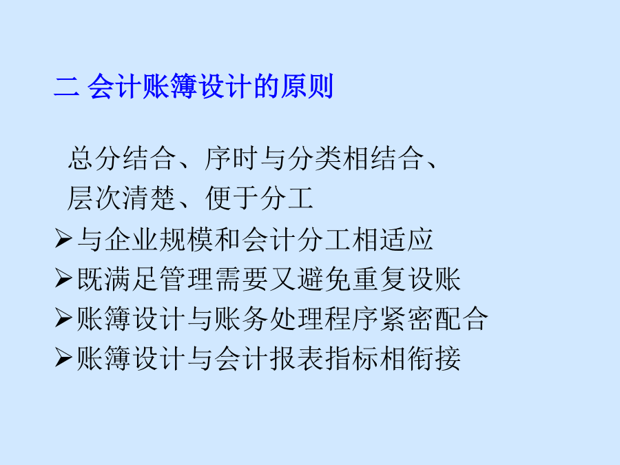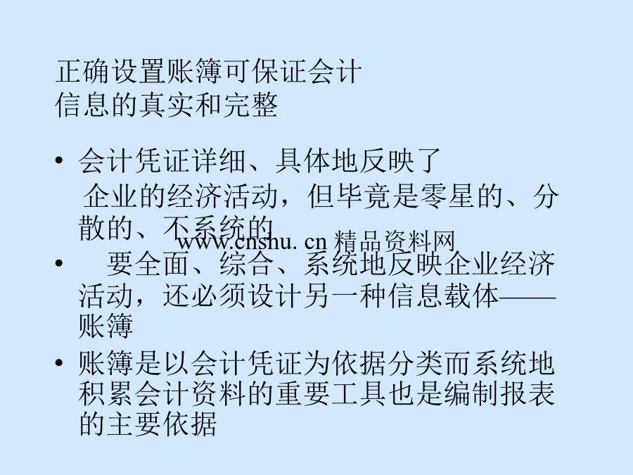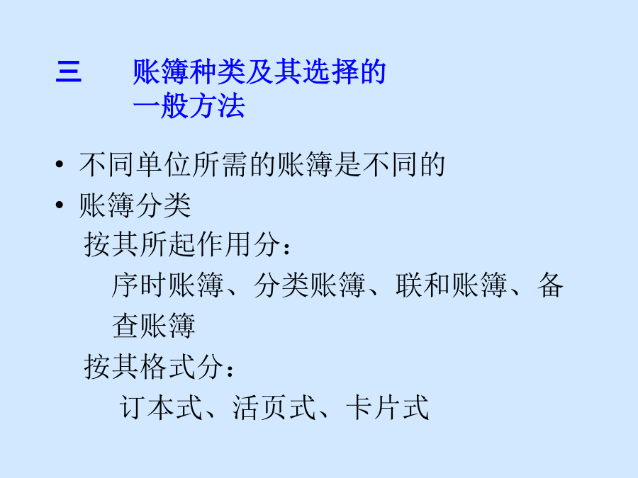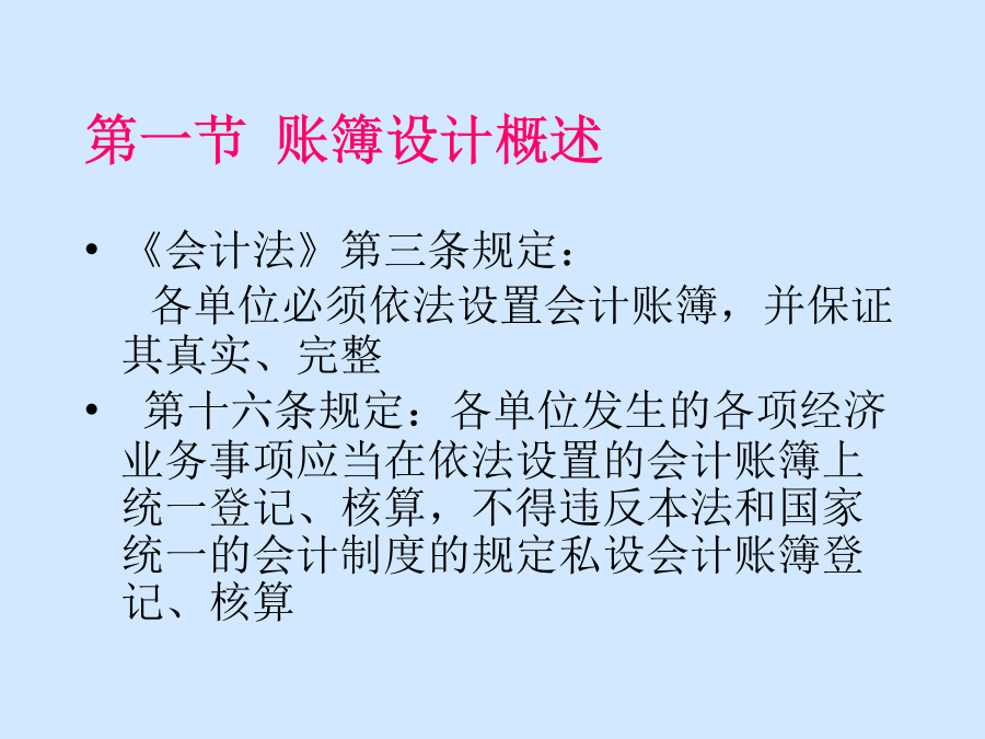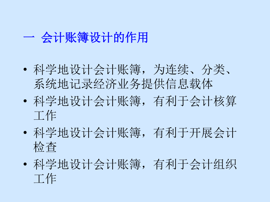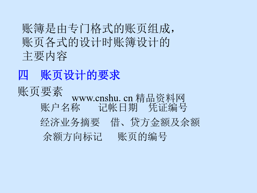 会计制度设计第二章会计科目设计第一节账簿设计概述正确设置账簿可保证会计信息的真实和完整一会计账簿设计的作用二会计账簿设计的原则账簿种类及其选择的一般方法核算形式与账簿设置参考图单位特点账簿是由专门格式的账页组成,账页各式的设计时账簿设计的主要内容账页设计除了具备以上要素外还应符合以下要求印制凭证、账表格式的注意事项第二节日记账簿的设计二设计日记账簿的基本要求三日记账簿的设计三栏式现金日记账第页银行存款日记账第页现金收入日记账借:现金第页2特种日记账购货日记账第页销货日记账第页购货日记账第页销货日记账第页为了考察产品赊销情况和应收帐款的回收情况,如单位赊销业务大、业务频繁可设应收帐款日记账应收帐款日记账第页有的单位规模小,业务不多可设计“共同性”账户,既登记现金收付业务,又登记银行存款收付业务出纳日记账第页中外合计企业的银行存款涉及外币需要折算成人民币,可使用特种日记账银行存款日记账外币银行:账号第三节分类账簿的设计总分类账的基本作用二分类账簿设计的基本内容会计制度设计三总分类账格式设计与比较总分类账(分户式)会计科目第页总分类账(非分户式)年月份第页多栏式总分类账第页非分户式总帐优缺点四明细分类账设计特殊明细账设计第四节备查账簿的设计三备查账簿反映的主要业务本章小结会计制度设计习题练习会计科目的设计1除五家合股外,还准备向银行贷款和吸收他人投资,但他人投资不作为股份至作为长期应付款,按银行同期存款利率高20%付息2商场和茶座厅均须重新装修后方能营业3需购入货架、柜台、音响设备、桌椅等设备,运输汽车一辆。4商场购销活动中,库存商品按售价记账,可以赊购赊销。5茶座厅的收入作为附营业务处理6雇请店员若干人,每月按计时工资计发报酬,奖金视营销情况而定7房屋按月交纳租金8按规定缴纳增值税和所得税(其他税种从略),税率按国家规定执行9公司要求管理费用等共同费用应在商场和茶座厅之间分摊10利润要按商场和茶座分别计算;税后利润按规定提取公益金和公积金11本公司名称为长江有限责任公司12已在银行开立账号13购进商品的包装物出售给废品公司要求:为长江有限责任公司设计会计科目并对使用中的问题作必要说明对现有资料进行分析其固定资产原则上可按小型企业的固定资产单价起点即1000元来确定,音像等电子设备可以用加速法提取折旧,汽车用工作量法提取折旧,其与固定资产用直线法提取折旧考虑到桌椅等单价较低,但数量较多,故可列入递延资产,按国家规定摊销期定为5年他人投资按公司规定,应设计长期应付款科目进行处理,所付利息计入“财务费用”科目购进商品包装物出售后的收入可设计“营业外收入”科目处理全部科目体系按企业会计制度设计科目设计,采用四位数编号会计科目表一资产类1001现金1002银行存款1131应收账款1141坏账准备1201商品采购1243库存商品1244商品进销差价1233库存物资1231低值易耗品1301待摊费用1501固定资产1502累计折旧1901长期待摊费用二负债类2101短期借款2121应付账款2151应付工资2153应付福利费2171应交税金(增值税、所得税)2161应付股利2321长期应付款三所有者权益3101股本3121公积金3122公益金3131本年利润3141利润分配四损益类5101商品销售收入5102附营业务收入5301营业外收入5401商品销售成本5405附营业务成本5501经营费用5502管理费用5503财务费用5701所得税5601营业外支出主要业务举例1合股投资存入银行借银行存款贷股本2向银行借款借银行存款贷短期借款3吸收他人投资借银行存款贷长期应付款4提取备用金借现金贷银行存款5支付开办费借长期待摊费用贷银行存款(现金)购入固定资产借固定资产贷银行存款购入物料用品借库存物料贷银行存款购入低耗品借低值易耗品贷现金(银行存款)购入各种商品借商品采购应交税金(增值税)贷银行存款(应付帐款)10商品验收入库借库存商品贷商品采购商品进销差价11支付采购费用借经营费用贷银行存款12登记零售收入借现金贷商品销售收入应交税金(销项税)13登记附营业务收入借现金贷附营业务收入14结转已售商品成本借商品销售成本商品进销差价贷库存商品15结转附营消耗借附营业成本贷库存商品16支付管理费用借管理费用贷现金17支付借款利息借财务费用贷银行存款18支付工资借应付工贷现金19摊销开办费借管理费用贷长期待摊费用20提取折旧借经营费用贷累计折旧21领用低值易耗品借待摊费用贷低值易耗品22摊销领用低值易耗品借经营费用贷待摊费用23结转