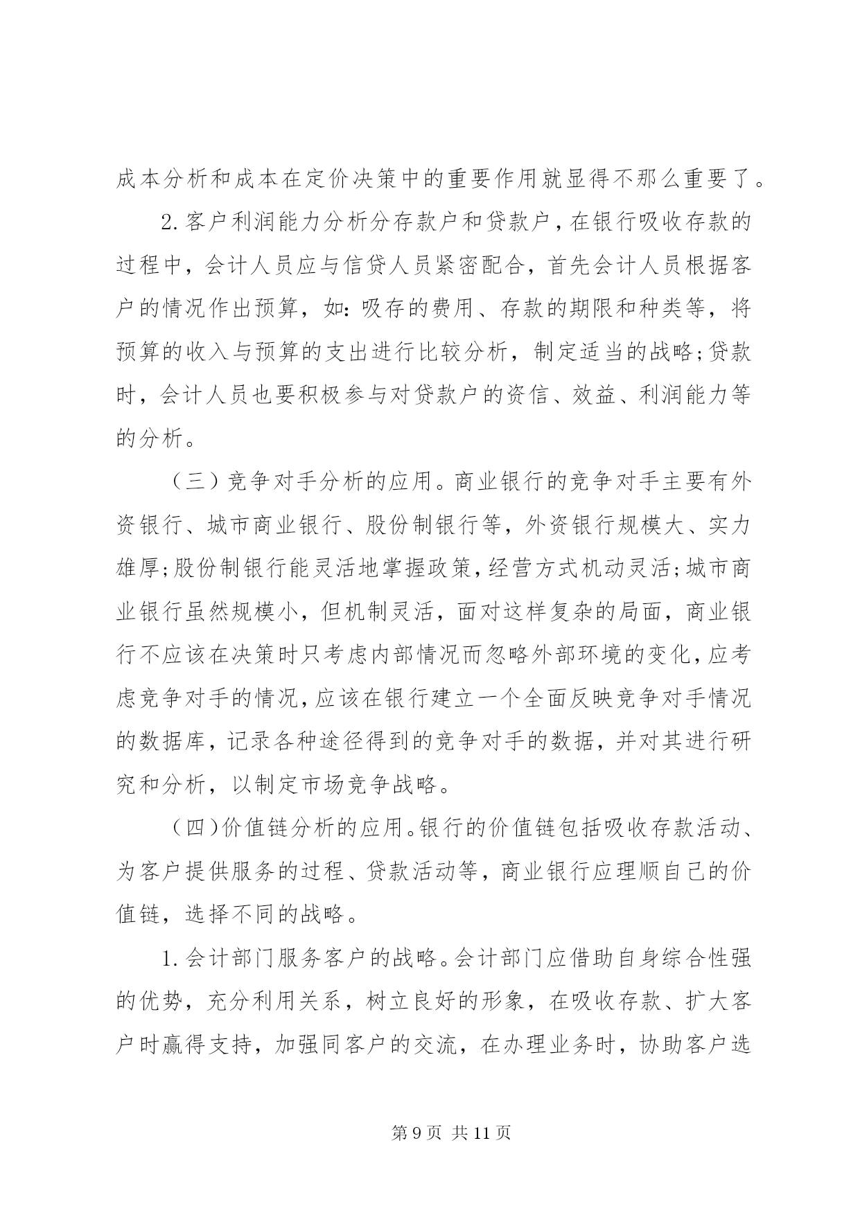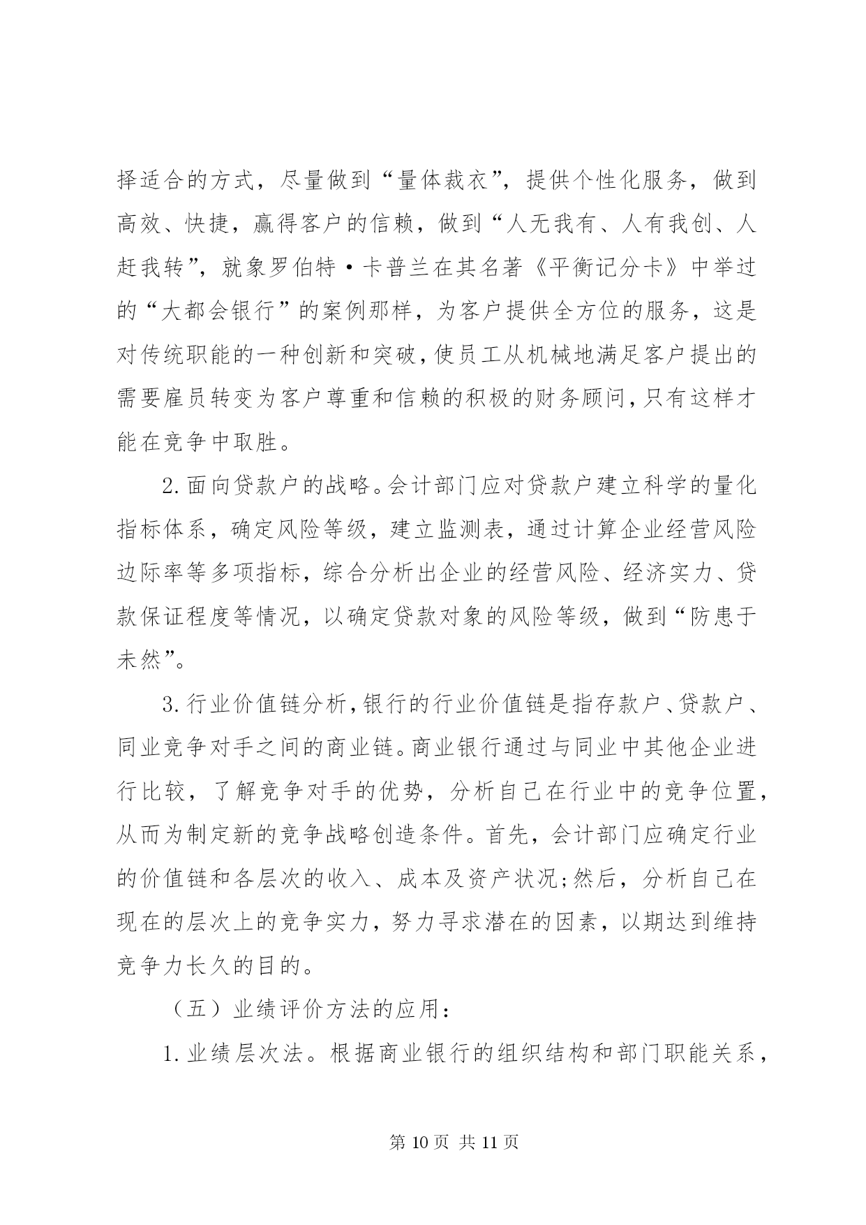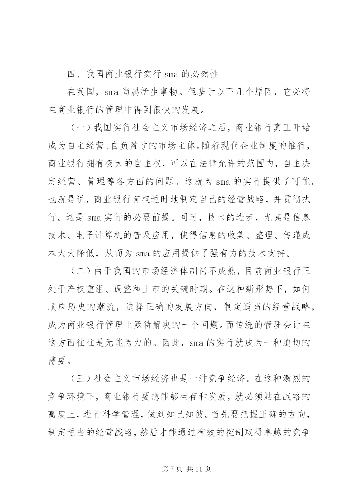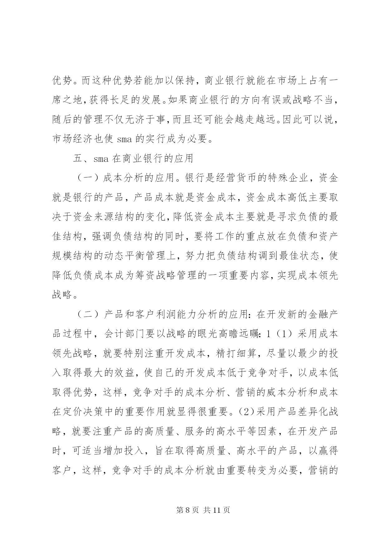 第PAGE\*Arabic\*MERGEFORMAT11页共NUMPAGES\*MERGEFORMAT11页战略管理商业银行思考摘要。本文将围绕战略管理会计(简称sma)理论和技术方法在商业银行的应用这两个层面来进行分析和探讨,使之能成为推动商业银行制度创新和管理发展的有力工具。关键词:战略管理;管理会计;商业银行abstract:thisarticlewillrevolvestrategymanagementaccounting(i.e.sma)thetheoryandthecomputingtechniquecarriesontheanalysisandthediscussionincommercialbank''''sapplicationthesetwostratificationplanes,enablesittobecometheimpetuscommercialbankinstitutionalinnovationsandthemanagementdevelopmentpowerfultool.keyword:strategicmanagement;managementaccounting;commercialbank前言近年来,各种创新的会计理论与实践正随着经济的高速发展和全球经济一体化进程的加快而层出不穷。理论和实践均不再局限于原有的理论框架与模式,边缘化的现象日趋明显。战略管理会计(简称sma)理论与实践正是在此背景下应运而生。目前,sma在我国仍处于理论研究和学术探讨阶段。一、背景我国的管理会计是在上世纪80年代初,在引进西方管理会计理论的基础上发展起来的,经过众多学者的研究,虽然取得了一定成效,但是发展还不尽如人意,主要表现为:在企业中的地位及其对企业发展的作用并没有达到预期的效果。管理会计有依附性的缩小化倾向,被看作是对财务信息的深加工和再利用。由于在一定程度上要依附于财务信息这个主体,所以其本身就成为了一种辅助行为。使我国的管理会计从一个独立的过程缩小为依附性的后继活动,在本质上就限制了管理会计的深层次发展。管理会计的应用,需要借助于数学、统计学、计量经济学中的一些分析方法。譬如回归分析等,这些方法不但要求有大量准确可靠的数据资料,而且还要有一定的计量软件操作,这就决定了会计工作不仅有繁杂的计算过程,还要具有这方面知识的专业人才。更重要的是:通过这些方法得出的分析预测数据还要包含着一些假设条件,还要再进行进一步的分析、处理和修正,不能直接与市场环境接轨。这就很容易造成“貌似天仙”的分析模型,却不食“人间烟火”的效果,从而阻碍了我国管理会计的发展,在实务中造成了一系列的“并发症”,如专业人员缺乏造成组织性不强、理论模糊造成工作目的性不强等等,使管理会计的发展障碍重重,处于一种地位重要、效果不显著的尴尬境地。随着市场经济的发展,管理会计作为企业管理的重要手段,特别是它对企业运行的贡献已在西方经济的发展中得到印证。但同时,西方理论也发现了其自身的一些缺点,于是管理会计有了新的发展和突破,使得sma横空出世。二、sma与传统管理会计的区别从sma的产生来看,它弥补了传统管理会计“轻战略、重战术”的不足,对传统管理会计提出了挑战。与传统管理会计相比,战略管理会计具有以下几个特点:(一)sma更注重企业外部环境。sm成功的企业就是要创造和保持持久的相对竞争优势。管理会计应该指出企业在市场竞争中所处的相对地位,提供有利于企业进行战略调整的各种信息,但传统的管理会计却未能提供这种信息。sma跳出了单一企业这一狭小的空间范围,将视角更多地投向影响企业的外部环境,提供超越企业本身的更广泛、更有用的信息。其中。有关竞争对手的信息对企业保持竞争优势至关重要。因此,sma特别强调各类相对指标或比较指标的计算和分析,如相对价格、相对成本、相对现金流量以及相对市场份额等等,使企业管理者做到知己知彼,以采取相应的措施,使企业保持长久的竞争优势。(二)sma提供更多的与战略有关的非财务信息。在目前激烈的竞争环境中,衡量竞争优势的指标除财务指标之外,还有大量的非财务指标。企业要想获得持续的竞争优势,还必须依靠众多的非财务指标。如产品质量、生产弹性、顾客满意程度、从接受订单到交付使用的时间等。传统管理会计所提供的信息更多的是财务信息,忽略了非财务信息对企业的影响,使企业的管理者忽视市场、sm等方面的许多重要因素。而sma则提供了大量极为重要的非财务信息,包括战略财务信息和经营业绩信息、竞争对手信息以及与企业战略相关的背景信息,如市场占有率、与战略成本有关的数据、企业经营业务、企业资产的范围和内容、产业结构对企业的影响等。(三)sma更加注重长远目标和全局利益。传统的管理会计着眼于有限的会计期间,以“利润最大化”