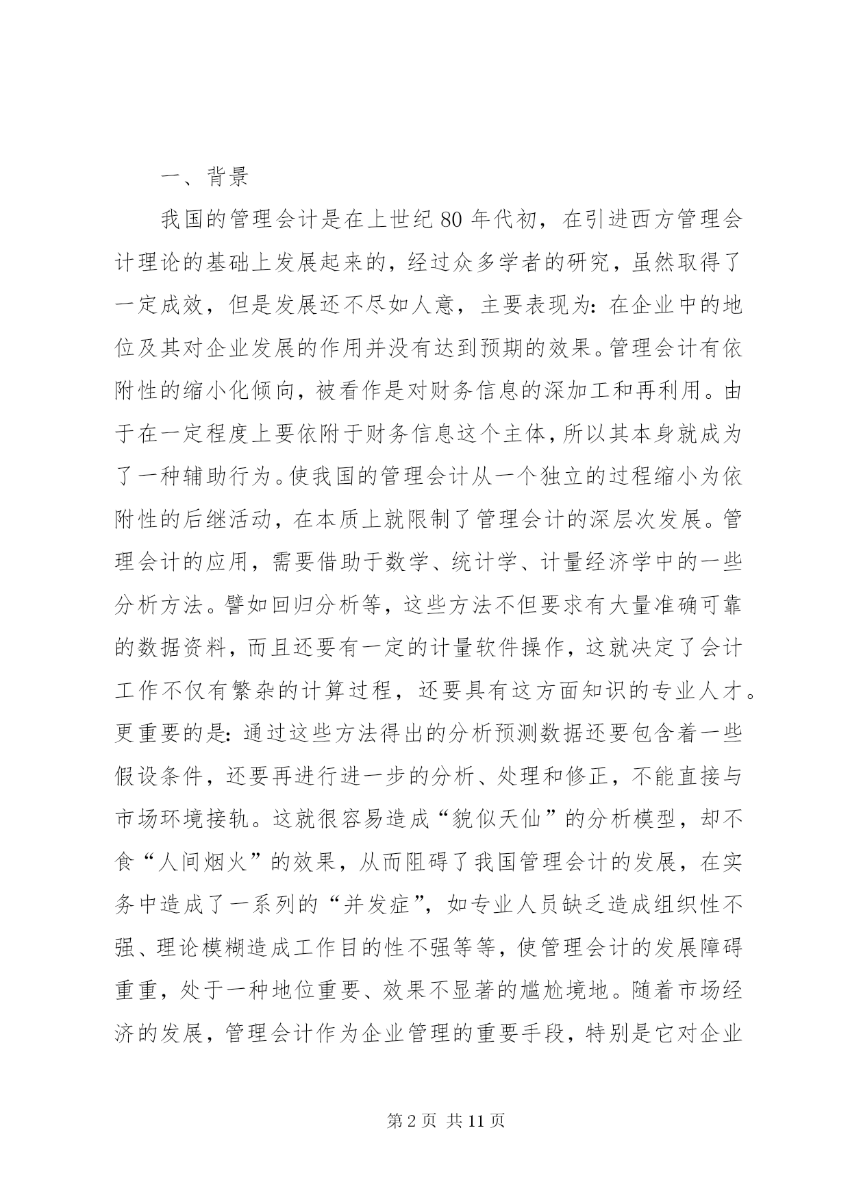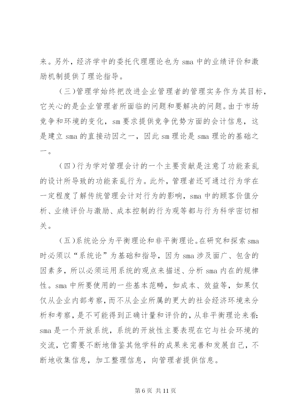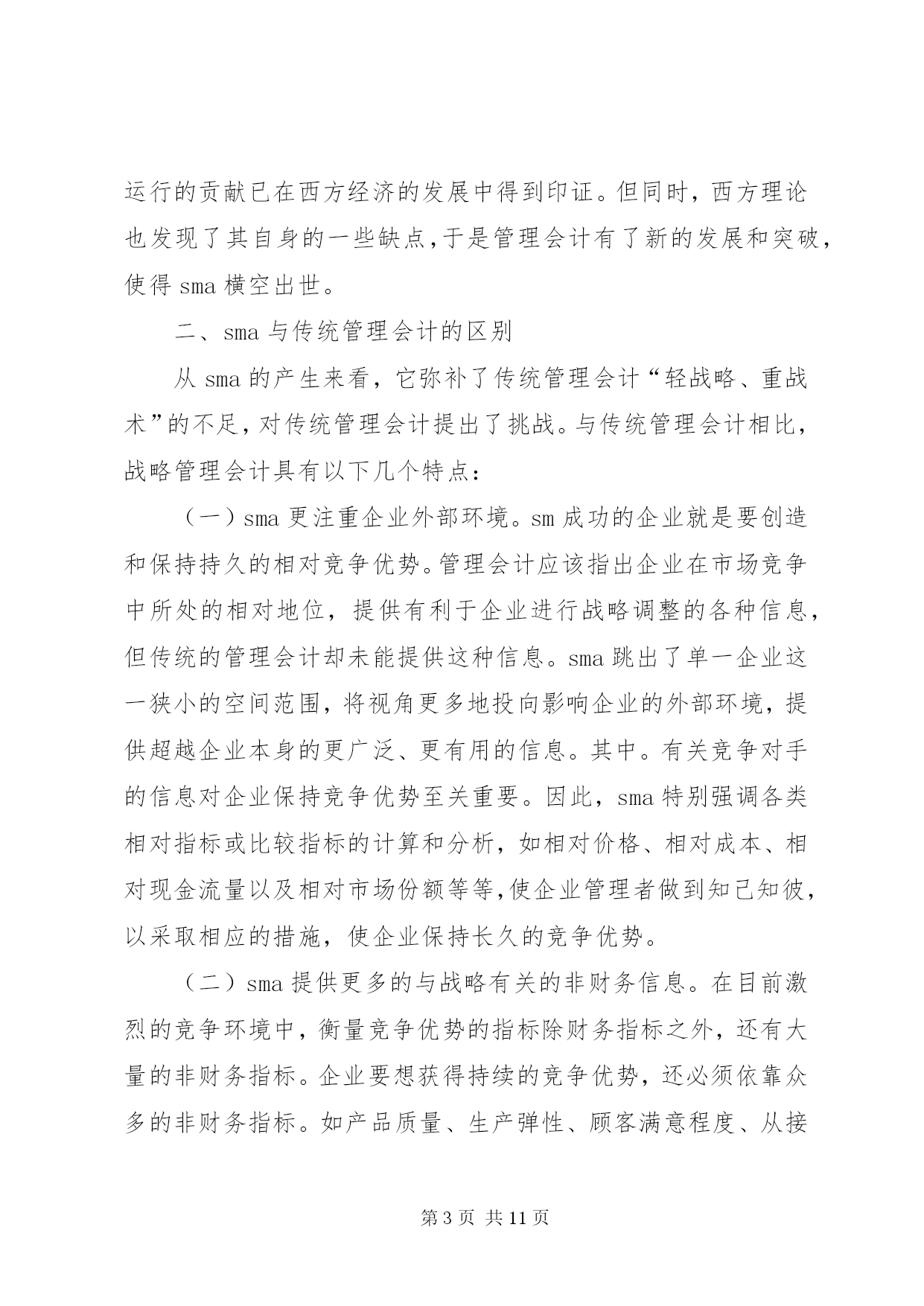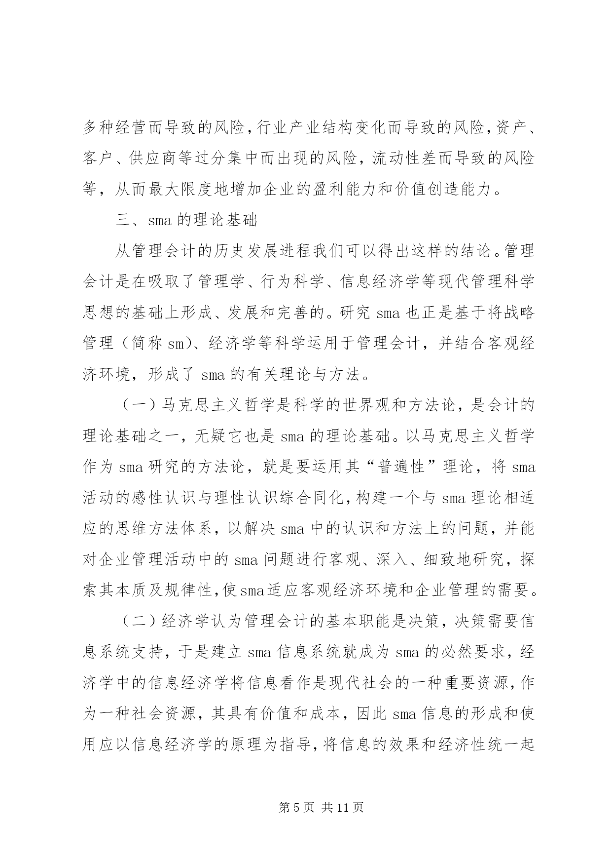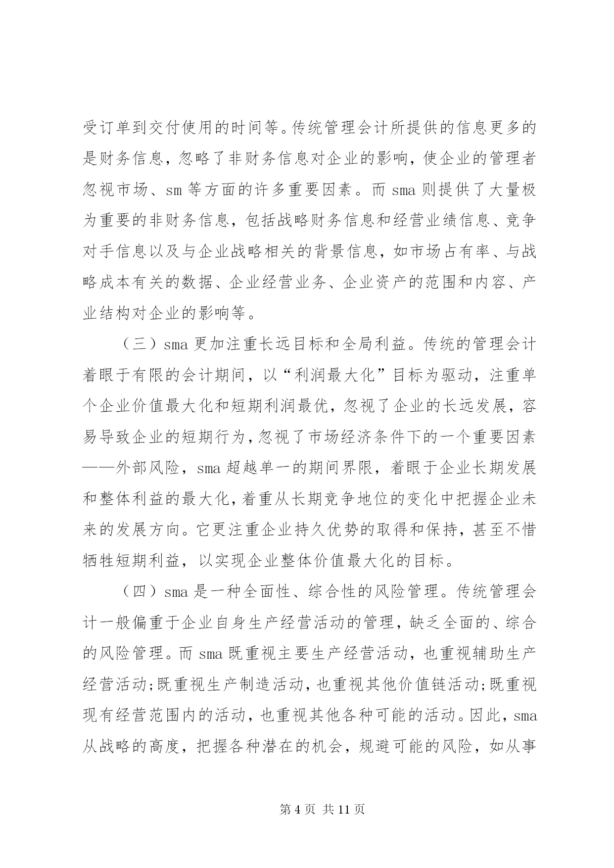 第PAGE\*Arabic\*MERGEFORMAT11页共NUMPAGES\*MERGEFORMAT11页战略管理商业银行思考摘要。本文将围绕战略管理会计(简称sma)理论和技术方法在商业银行的应用这两个层面来进行分析和探讨,使之能成为推动商业银行制度创新和管理发展的有力工具。关键词:战略管理;管理会计;商业银行abstract:thisarticlewillrevolvestrategymanagementaccounting(i.e.sma)thetheoryandthecomputingtechniquecarriesontheanalysisandthediscussionincommercialbank''''sapplicationthesetwostratificationplanes,enablesittobecometheimpetuscommercialbankinstitutionalinnovationsandthemanagementdevelopmentpowerfultool.keyword:strategicmanagement;managementaccounting;commercialbank前言近年来,各种创新的会计理论与实践正随着经济的高速发展和全球经济一体化进程的加快而层出不穷。理论和实践均不再局限于原有的理论框架与模式,边缘化的现象日趋明显。战略管理会计(简称sma)理论与实践正是在此背景下应运而生。目前,sma在我国仍处于理论研究和学术探讨阶段。一、背景我国的管理会计是在上世纪80年代初,在引进西方管理会计理论的基础上发展起来的,经过众多学者的研究,虽然取得了一定成效,但是发展还不尽如人意,主要表现为:在企业中的地位及其对企业发展的作用并没有达到预期的效果。管理会计有依附性的缩小化倾向,被看作是对财务信息的深加工和再利用。由于在一定程度上要依附于财务信息这个主体,所以其本身就成为了一种辅助行为。使我国的管理会计从一个独立的过程缩小为依附性的后继活动,在本质上就限制了管理会计的深层次发展。管理会计的应用,需要借助于数学、统计学、计量经济学中的一些分析方法。譬如回归分析等,这些方法不但要求有大量准确可靠的数据资料,而且还要有一定的计量软件操作,这就决定了会计工作不仅有繁杂的计算过程,还要具有这方面知识的专业人才。更重要的是:通过这些方法得出的分析预测数据还要包含着一些假设条件,还要再进行进一步的分析、处理和修正,不能直接与市场环境接轨。这就很容易造成“貌似天仙”的分析模型,却不食“人间烟火”的效果,从而阻碍了我国管理会计的发展,在实务中造成了一系列的“并发症”,如专业人员缺乏造成组织性不强、理论模糊造成工作目的性不强等等,使管理会计的发展障碍重重,处于一种地位重要、效果不显著的尴尬境地。随着市场经济的发展,管理会计作为企业管理的重要手段,特别是它对企业运行的贡献已在西方经济的发展中得到印证。但同时,西方理论也发现了其自身的一些缺点,于是管理会计有了新的发展和突破,使得sma横空出世。二、sma与传统管理会计的区别从sma的产生来看,它弥补了传统管理会计“轻战略、重战术”的不足,对传统管理会计提出了挑战。与传统管理会计相比,战略管理会计具有以下几个特点:(一)sma更注重企业外部环境。sm成功的企业就是要创造和保持持久的相对竞争优势。管理会计应该指出企业在市场竞争中所处的相对地位,提供有利于企业进行战略调整的各种信息,但传统的管理会计却未能提供这种信息。sma跳出了单一企业这一狭小的空间范围,将视角更多地投向影响企业的外部环境,提供超越企业本身的更广泛、更有用的信息。其中。有关竞争对手的信息对企业保持竞争优势至关重要。因此,sma特别强调各类相对指标或比较指标的计算和分析,如相对价格、相对成本、相对现金流量以及相对市场份额等等,使企业管理者做到知己知彼,以采取相应的措施,使企业保持长久的竞争优势。(二)sma提供更多的与战略有关的非财务信息。在目前激烈的竞争环境中,衡量竞争优势的指标除财务指标之外,还有大量的非财务指标。企业要想获得持续的竞争优势,还必须依靠众多的非财务指标。如产品质量、生产弹性、顾客满意程度、从接受订单到交付使用的时间等。传统管理会计所提供的信息更多的是财务信息,忽略了非财务信息对企业的影响,使企业的管理者忽视市场、sm等方面的许多重要因素。而sma则提供了大量极为重要的非财务信息,包括战略财务信息和经营业绩信息、竞争对手信息以及与企业战略相关的背景信息,如市场占有率、与战略成本有关的数据、企业经营业务、企业资产的范围和内容、产业结构对企业的影响等。(三)sma更加注重长远目标和全局利益。传统的管理会计着眼于有限的会计期间,以“利润最大化”