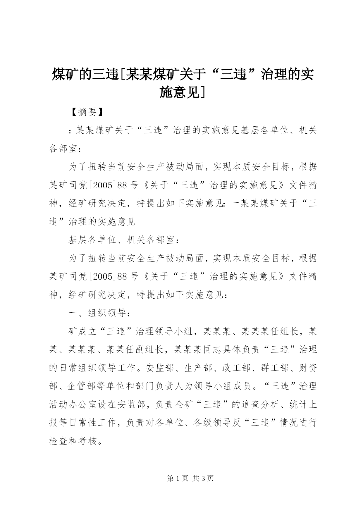 煤矿的三违[某某煤矿关于“三违”治理的实施意见]