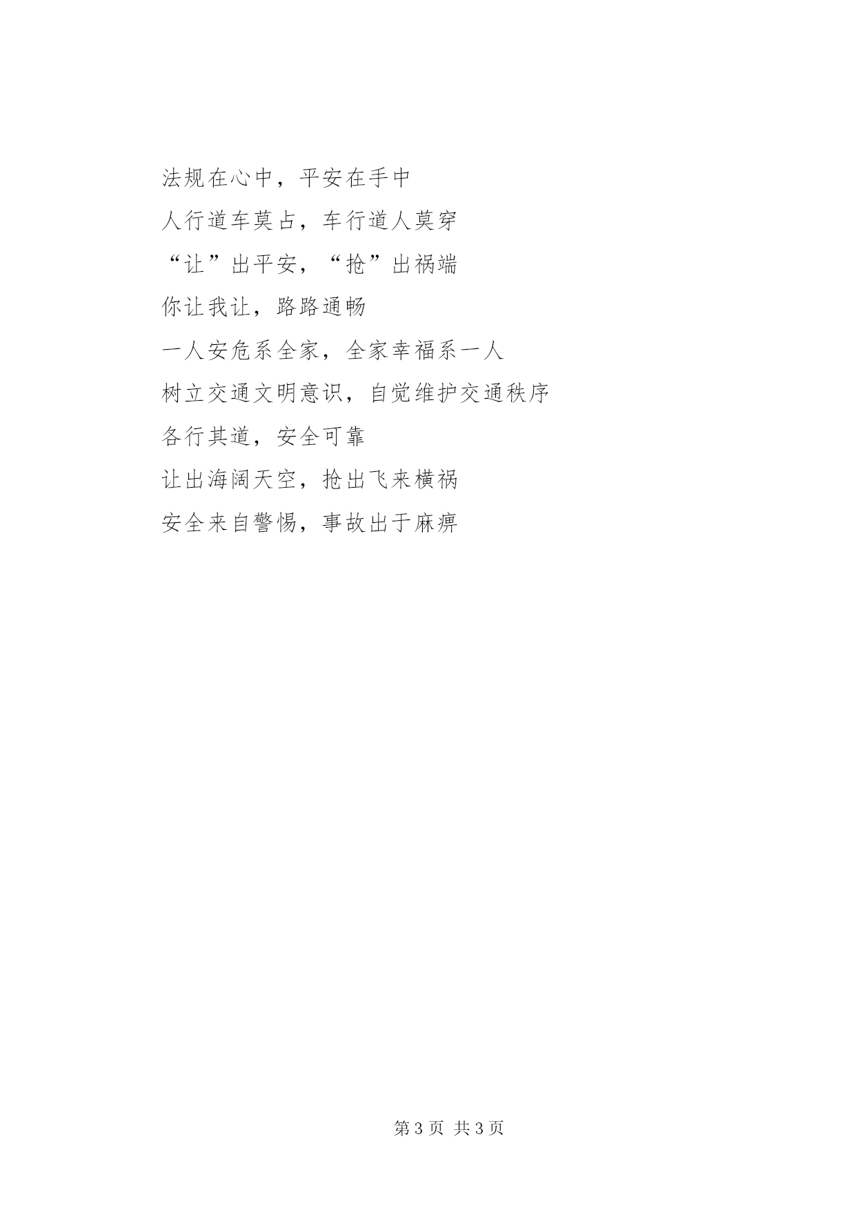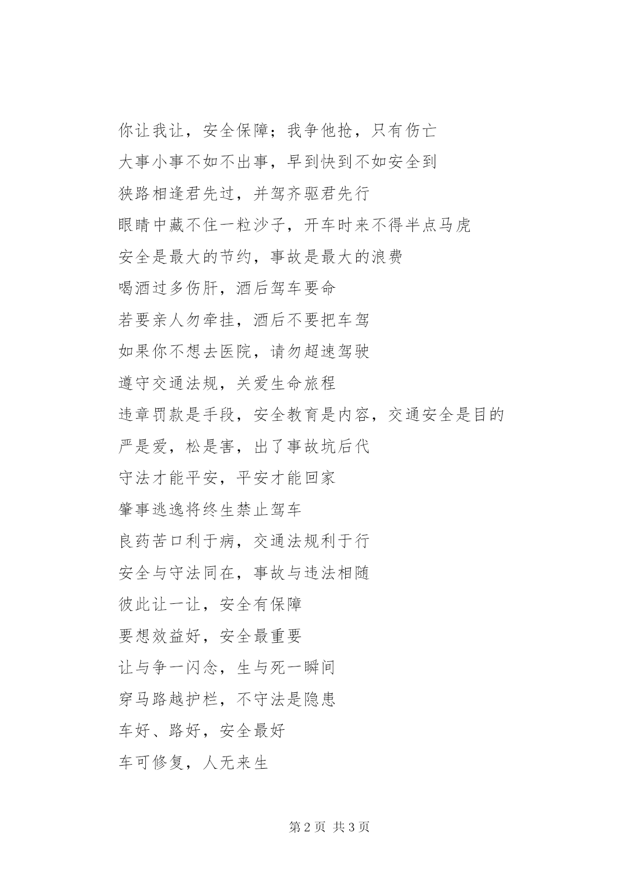 第PAGE\*Arabic\*MERGEFORMAT3页共NUMPAGES\*MERGEFORMAT3页交通安全宣传标语集锦文明礼让安全在,瞬间麻痹事故来人要安全靠右行,车要安全靠慢行横过公路,一慢二看实线虚线斑马线,都是生命安全线遵守交通法规是您对社会安宁的一份贡献虽为坦途——超速者戒;纵有捷径——乱穿者止超车超速痛快一时,酿成车祸悔恨一生礼让三分平安在,抢行一秒后悔迟道路非比球场,不要合理冲撞无证(或持假证)驾驶机动车辆的,将予以拘留或罚款骑车请戴安全帽,流汗总比流血好爱妻爱子爱家庭,无视交规等于零人病不上车,病车不上路客运车超员20%以上的,对车主和司机实行治安拘留安全带常系生命线,红绿灯常护遵章人乱穿马路最危险,文明行路保安全马走**,象走田,人行横道最安全违章横穿高速路,难免踏上黄泉路心无交规,路有坎坷狭路相逢“让”者胜你让我让,安全保障;我争他抢,只有伤亡大事小事不如不出事,早到快到不如安全到狭路相逢君先过,并驾齐驱君先行眼睛中藏不住一粒沙子,开车时来不得半点马虎安全是最大的节约,事故是最大的浪费喝酒过多伤肝,酒后驾车要命若要亲人勿牵挂,酒后不要把车驾如果你不想去医院,请勿超速驾驶遵守交通法规,关爱生命旅程违章罚款是手段,安全教育是内容,交通安全是目的严是爱,松是害,出了事故坑后代守法才能平安,平安才能回家肇事逃逸将终生禁止驾车良药苦口利于病,交通法规利于行安全与守法同在,事故与违法相随彼此让一让,安全有保障要想效益好,安全最重要让与争一闪念,生与死一瞬间穿马路越护栏,不守法是隐患车好、路好,安全最好车可修复,人无来生法规在心中,平安在手中人行道车莫占,车行道人莫穿“让”出平安,“抢”出祸端你让我让,路路通畅一人安危系全家,全家幸福系一人树立交通文明意识,自觉维护交通秩序各行其道,安全可靠让出海阔天空,抢出飞来横祸安全来自警惕,事故出于麻痹