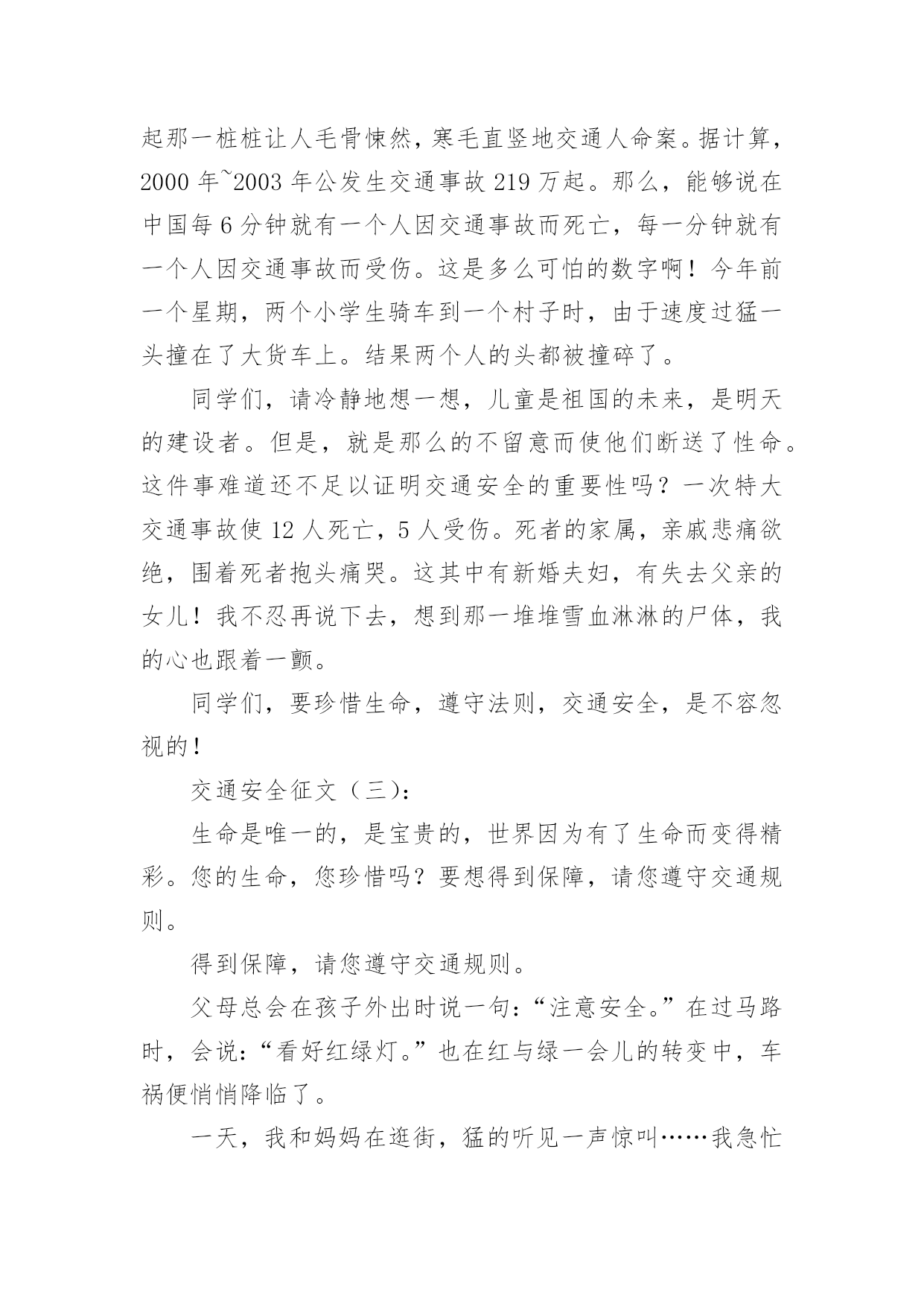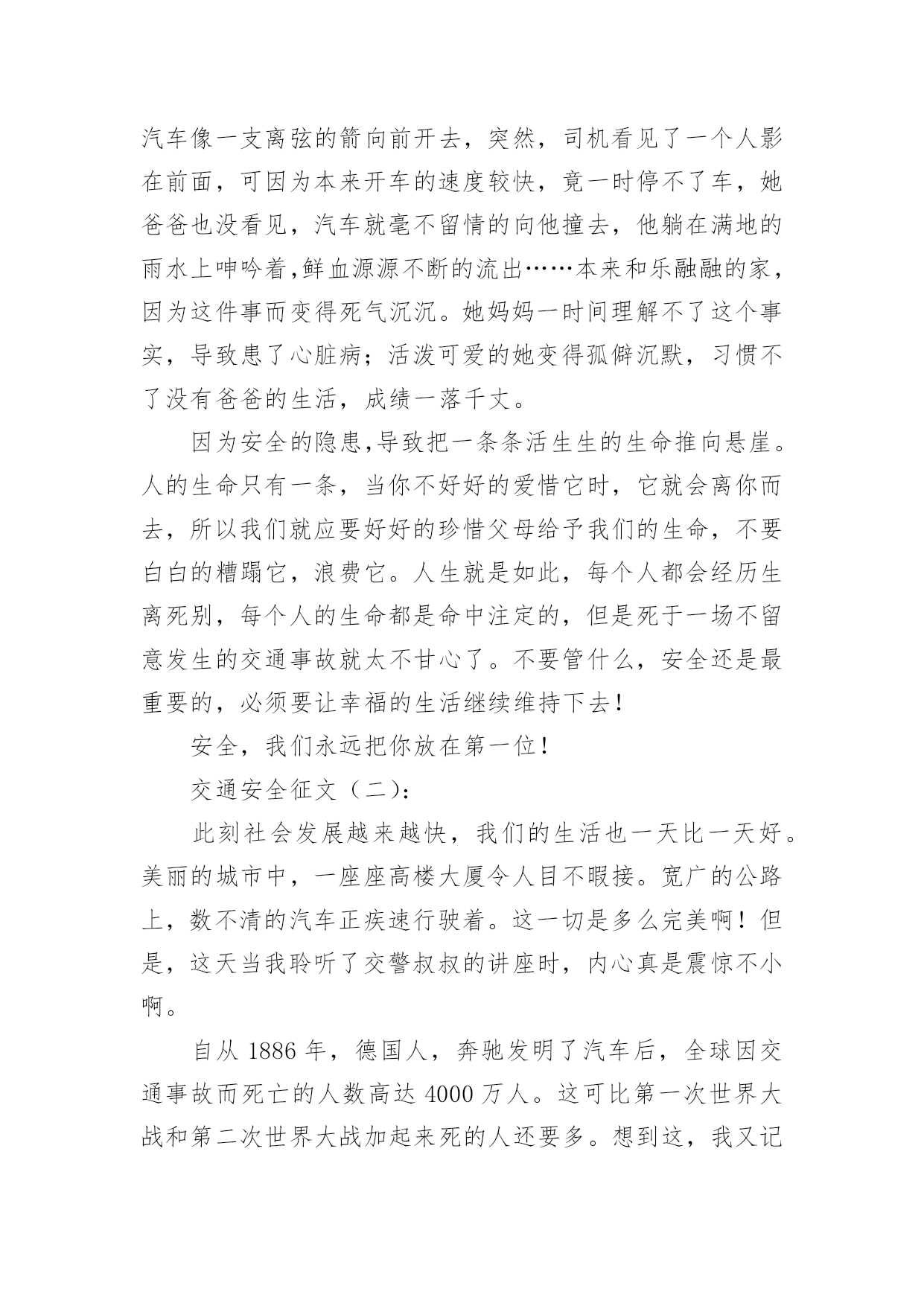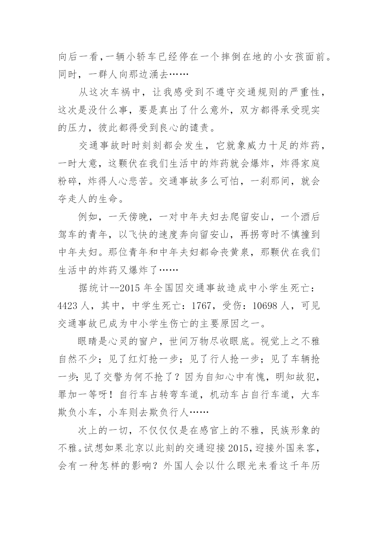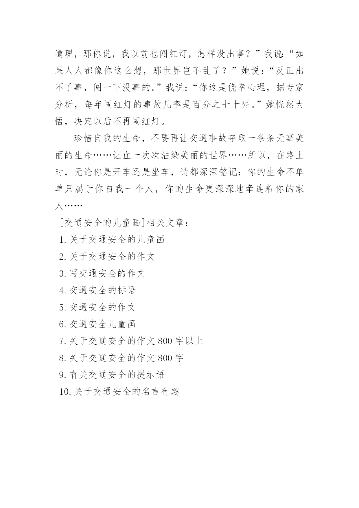 交通安全的儿童画交通安全的儿童画导语:交通安全是指人们在道路上进行活动、玩耍时,要按照交通法规的规定,安全地行车、走路,避免发生人身伤亡或财物损失。下面是小编整理的交通安全的儿童画,希望对大家有所帮助。儿童画交通安全的绘画1儿童画交通安全的绘画2儿童画交通安全的绘画3儿童画交通安全的绘画4儿童画交通安全的绘画5儿童画交通安全的绘画6交通安全征文(一):每一天大约有100人死于交通安全,安全对我们来讲固然重要。而因为每一天死神都会降临,一个个幸福美满的家庭而因此变得支离破碎。在我家旁边住着一家温馨的人。每一天当她的爸爸下班时都会去学校接她,她妈妈一回到家就做饭,吃完饭后都会去公园散散步、聊聊家事,所以每一天他们家都过得和乐融融。可这一切却被一场突如其来的交通事故而打破。那件事是发生在星期三的下午,天下着倾盆大雨,她爸爸一如既往的去学校接她,在过人行道的时候,他正好在听电话,一辆汽车像一支离弦的箭向前开去,突然,司机看见了一个人影在前面,可因为本来开车的速度较快,竟一时停不了车,她爸爸也没看见,汽车就毫不留情的向他撞去,他躺在满地的雨水上呻吟着,鲜血源源不断的流出……本来和乐融融的家,因为这件事而变得死气沉沉。她妈妈一时间理解不了这个事实,导致患了心脏病;活泼可爱的她变得孤僻沉默,习惯不了没有爸爸的生活,成绩一落千丈。因为安全的隐患,导致把一条条活生生的生命推向悬崖。人的生命只有一条,当你不好好的爱惜它时,它就会离你而去,所以我们就应要好好的珍惜父母给予我们的生命,不要白白的糟蹋它,浪费它。人生就是如此,每个人都会经历生离死别,每个人的生命都是命中注定的,但是死于一场不留意发生的交通事故就太不甘心了。不要管什么,安全还是最重要的,必须要让幸福的生活继续维持下去!安全,我们永远把你放在第一位!交通安全征文(二):此刻社会发展越来越快,我们的生活也一天比一天好。美丽的城市中,一座座高楼大厦令人目不暇接。宽广的公路上,数不清的汽车正疾速行驶着。这一切是多么完美啊!但是,这天当我聆听了交警叔叔的讲座时,内心真是震惊不小啊。自从1886年,德国人,奔驰发明了汽车后,全球因交通事故而死亡的人数高达4000万人。这可比第一次世界大战和第二次世界大战加起来死的人还要多。想到这,我又记起那一桩桩让人毛骨悚然,寒毛直竖地交通人命案。据计算,2000年~2003年公发生交通事故219万起。那么,能够说在中国每6分钟就有一个人因交通事故而死亡,每一分钟就有一个人因交通事故而受伤。这是多么可怕的数字啊!今年前一个星期,两个小学生骑车到一个村子时,由于速度过猛一头撞在了大货车上。结果两个人的头都被撞碎了。同学们,请冷静地想一想,儿童是祖国的未来,是明天的建设者。但是,就是那么的不留意而使他们断送了性命。这件事难道还不足以证明交通安全的重要性吗?一次特大交通事故使12人死亡,5人受伤。死者的家属,亲戚悲痛欲绝,围着死者抱头痛哭。这其中有新婚夫妇,有失去父亲的女儿!我不忍再说下去,想到那一堆堆雪血淋淋的尸体,我的心也跟着一颤。同学们,要珍惜生命,遵守法则,交通安全,是不容忽视的!交通安全征文(三):生命是唯一的,是宝贵的,世界因为有了生命而变得精彩。您的生命,您珍惜吗?要想得到保障,请您遵守交通规则。得到保障,请您遵守交通规则。父母总会在孩子外出时说一句:“注意安全。”在过马路时,会说:“看好红绿灯。”也在红与绿一会儿的转变中,车祸便悄悄降临了。一天,我和妈妈在逛街,猛的听见一声惊叫……我急忙向后一看,一辆小轿车已经停在一个摔倒在地的小女孩面前。同时,一群人向那边涌去……从这次车祸中,让我感受到不遵守交通规则的严重性,这次是没什么事,要是真出了什么意外,双方都得承受现实的压力,彼此都得受到良心的谴责。交通事故时时刻刻都会发生,它就象威力十足的炸药,一时大意,这颗伏在我们生活中的炸药就会爆炸,炸得家庭粉碎,炸得人心悲苦。交通事故多么可怕,一刹那间,就会夺走人的生命。例如,一天傍晚,一对中年夫妇去爬留安山,一个酒后驾车的青年,以飞快的速度奔向留安山,再拐弯时不慎撞到中年夫妇。那位青年和中年夫妇都命丧黄泉,那颗伏在我们生活中的炸药又爆炸了……据统计--2015年全国因交通事故造成中小学生死亡:4423人,其中,中学生死亡:1767,受伤:10698人,可见交通事故已成为中小学生伤亡的主要原因之一。眼睛是心灵的窗户,世间万物尽收眼底。视觉上之不雅自然不少;见了红灯抢一步;见了行人抢一步;见了车辆抢一步;见了交警为何不抢了?因为自知心中有愧,明知故犯,罪加一等呀!自行车占转弯车道,机动车占自行车道,大车欺负小车,小车则去欺负行人……次上的一切,不仅仅仅是在感官上的不雅,民族形象的不雅。试想如果北京以此刻的交通迎接2015,迎接外国来客,会有一种怎样的影响?外国人会以什