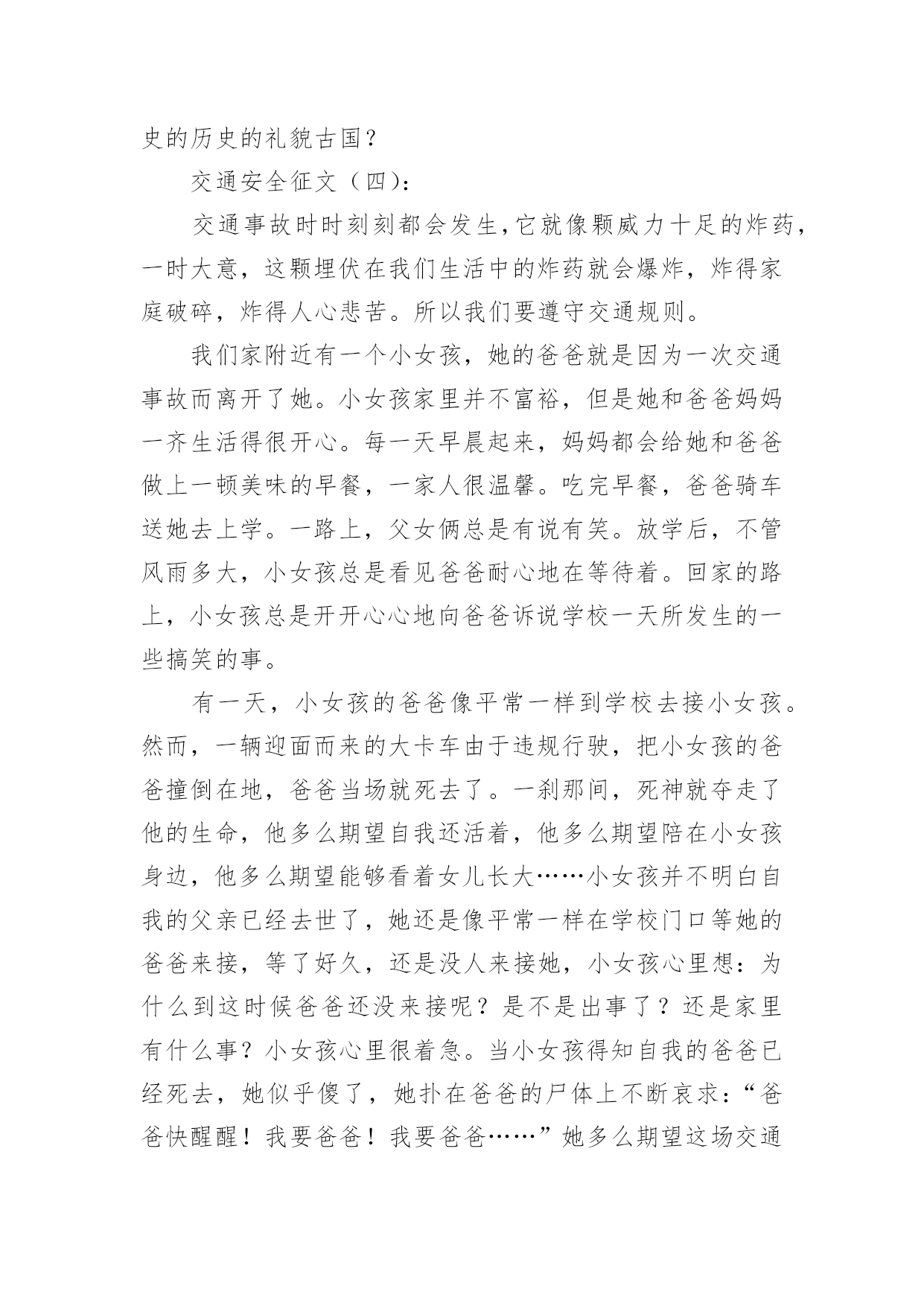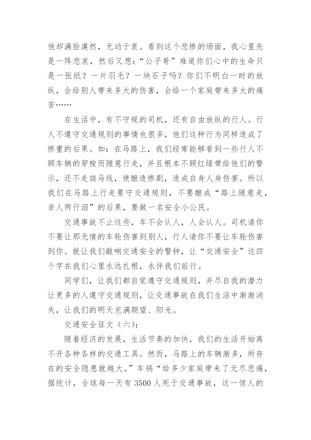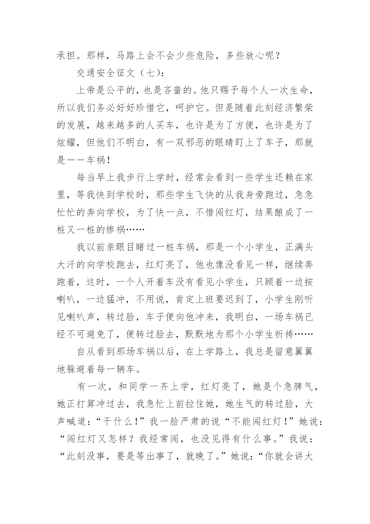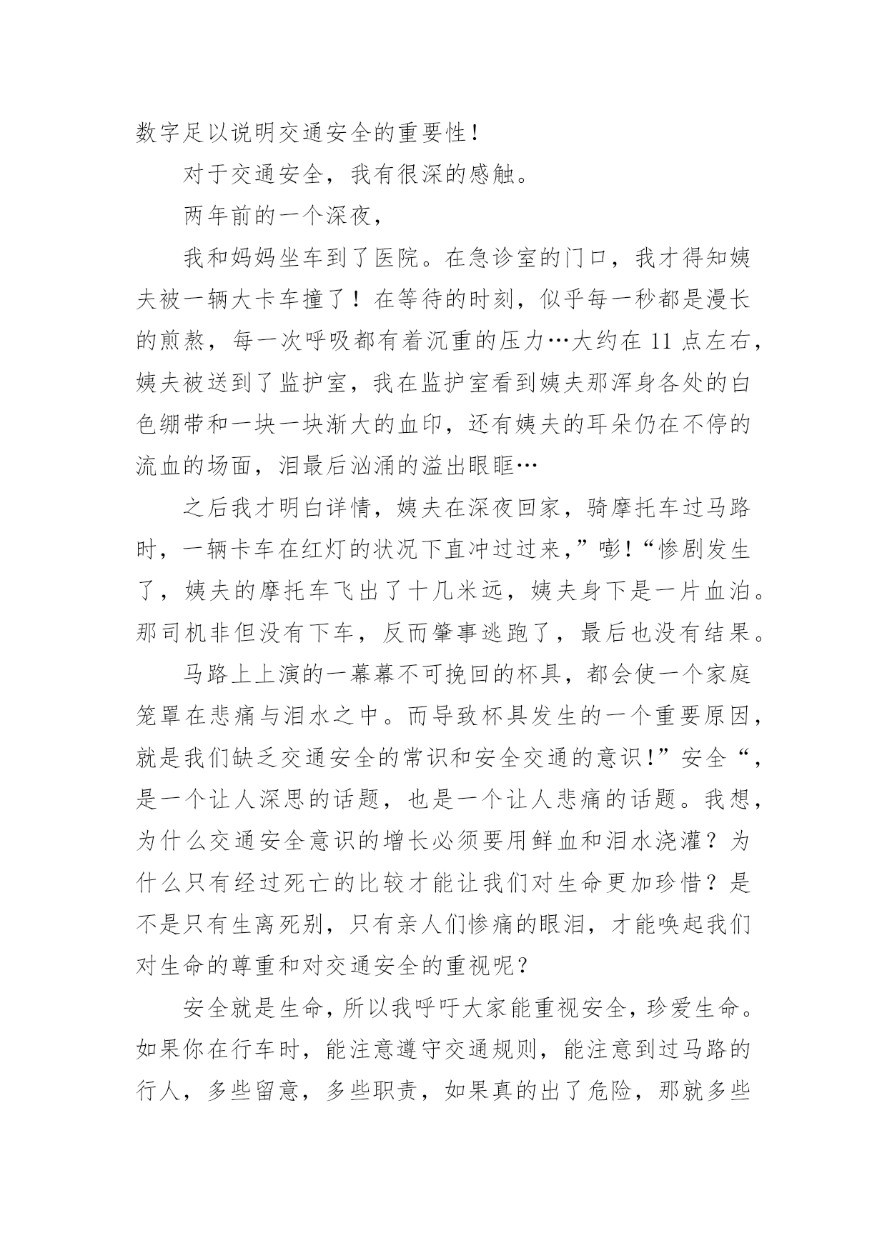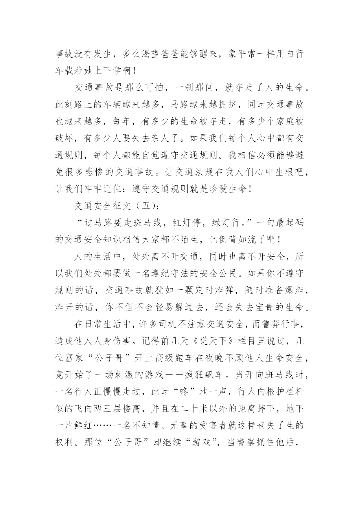 交通安全的儿童画交通安全的儿童画导语:交通安全是指人们在道路上进行活动、玩耍时,要按照交通法规的规定,安全地行车、走路,避免发生人身伤亡或财物损失。下面是小编整理的交通安全的儿童画,希望对大家有所帮助。儿童画交通安全的绘画1儿童画交通安全的绘画2儿童画交通安全的绘画3儿童画交通安全的绘画4儿童画交通安全的绘画5儿童画交通安全的绘画6交通安全征文(一):每一天大约有100人死于交通安全,安全对我们来讲固然重要。而因为每一天死神都会降临,一个个幸福美满的家庭而因此变得支离破碎。在我家旁边住着一家温馨的人。每一天当她的爸爸下班时都会去学校接她,她妈妈一回到家就做饭,吃完饭后都会去公园散散步、聊聊家事,所以每一天他们家都过得和乐融融。可这一切却被一场突如其来的交通事故而打破。那件事是发生在星期三的下午,天下着倾盆大雨,她爸爸一如既往的去学校接她,在过人行道的时候,他正好在听电话,一辆汽车像一支离弦的箭向前开去,突然,司机看见了一个人影在前面,可因为本来开车的速度较快,竟一时停不了车,她爸爸也没看见,汽车就毫不留情的向他撞去,他躺在满地的雨水上呻吟着,鲜血源源不断的流出……本来和乐融融的家,因为这件事而变得死气沉沉。她妈妈一时间理解不了这个事实,导致患了心脏病;活泼可爱的她变得孤僻沉默,习惯不了没有爸爸的生活,成绩一落千丈。因为安全的隐患,导致把一条条活生生的生命推向悬崖。人的生命只有一条,当你不好好的爱惜它时,它就会离你而去,所以我们就应要好好的珍惜父母给予我们的生命,不要白白的糟蹋它,浪费它。人生就是如此,每个人都会经历生离死别,每个人的生命都是命中注定的,但是死于一场不留意发生的交通事故就太不甘心了。不要管什么,安全还是最重要的,必须要让幸福的生活继续维持下去!安全,我们永远把你放在第一位!交通安全征文(二):此刻社会发展越来越快,我们的生活也一天比一天好。美丽的城市中,一座座高楼大厦令人目不暇接。宽广的公路上,数不清的汽车正疾速行驶着。这一切是多么完美啊!但是,这天当我聆听了交警叔叔的讲座时,内心真是震惊不小啊。自从1886年,德国人,奔驰发明了汽车后,全球因交通事故而死亡的人数高达4000万人。这可比第一次世界大战和第二次世界大战加起来死的人还要多。想到这,我又记起那一桩桩让人毛骨悚然,寒毛直竖地交通人命案。据计算,2000年~2003年公发生交通事故219万起。那么,能够说在中国每6分钟就有一个人因交通事故而死亡,每一分钟就有一个人因交通事故而受伤。这是多么可怕的数字啊!今年前一个星期,两个小学生骑车到一个村子时,由于速度过猛一头撞在了大货车上。结果两个人的头都被撞碎了。同学们,请冷静地想一想,儿童是祖国的未来,是明天的建设者。但是,就是那么的不留意而使他们断送了性命。这件事难道还不足以证明交通安全的重要性吗?一次特大交通事故使12人死亡,5人受伤。死者的家属,亲戚悲痛欲绝,围着死者抱头痛哭。这其中有新婚夫妇,有失去父亲的女儿!我不忍再说下去,想到那一堆堆雪血淋淋的尸体,我的心也跟着一颤。同学们,要珍惜生命,遵守法则,交通安全,是不容忽视的!交通安全征文(三):生命是唯一的,是宝贵的,世界因为有了生命而变得精彩。您的生命,您珍惜吗?要想得到保障,请您遵守交通规则。得到保障,请您遵守交通规则。父母总会在孩子外出时说一句:“注意安全。”在过马路时,会说:“看好红绿灯。”也在红与绿一会儿的转变中,车祸便悄悄降临了。一天,我和妈妈在逛街,猛的听见一声惊叫……我急忙向后一看,一辆小轿车已经停在一个摔倒在地的小女孩面前。同时,一群人向那边涌去……从这次车祸中,让我感受到不遵守交通规则的严重性,这次是没什么事,要是真出了什么意外,双方都得承受现实的压力,彼此都得受到良心的谴责。交通事故时时刻刻都会发生,它就象威力十足的炸药,一时大意,这颗伏在我们生活中的炸药就会爆炸,炸得家庭粉碎,炸得人心悲苦。交通事故多么可怕,一刹那间,就会夺走人的生命。例如,一天傍晚,一对中年夫妇去爬留安山,一个酒后驾车的青年,以飞快的速度奔向留安山,再拐弯时不慎撞到中年夫妇。那位青年和中年夫妇都命丧黄泉,那颗伏在我们生活中的炸药又爆炸了……据统计--2015年全国因交通事故造成中小学生死亡:4423人,其中,中学生死亡:1767,受伤:10698人,可见交通事故已成为中小学生伤亡的主要原因之一。眼睛是心灵的窗户,世间万物尽收眼底。视觉上之不雅自然不少;见了红灯抢一步;见了行人抢一步;见了车辆抢一步;见了交警为何不抢了?因为自知心中有愧,明知故犯,罪加一等呀!自行车占转弯车道,机动车占自行车道,大车欺负小车,小车则去欺负行人……次上的一切,不仅仅仅是在感官上的不雅,民族形象的不雅。试想如果北京以此刻的交通迎接2015,迎接外国来客,会有一种怎样的影响?外国人会以什