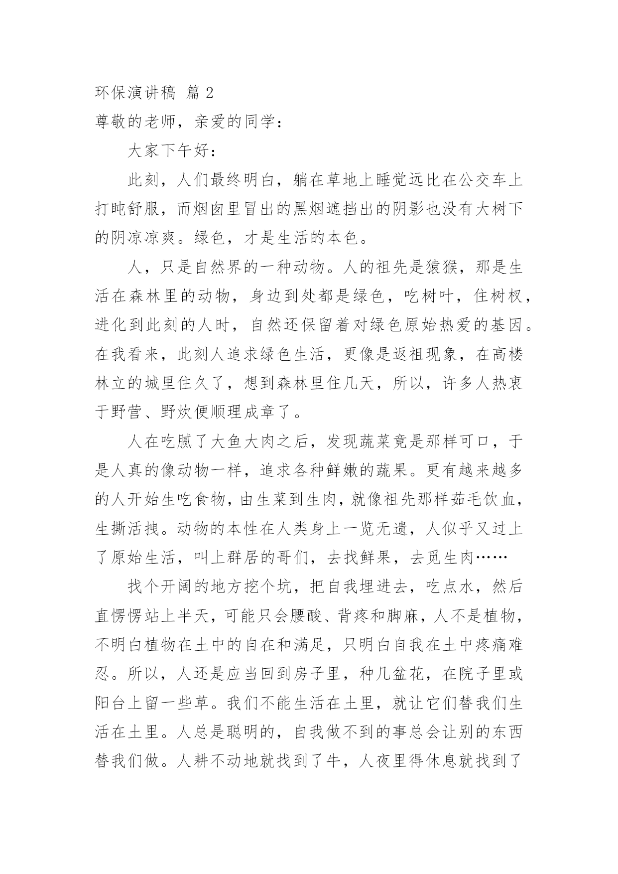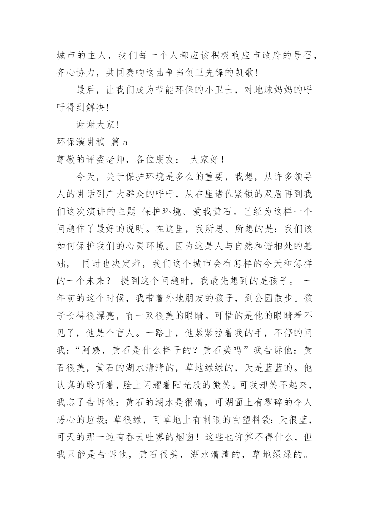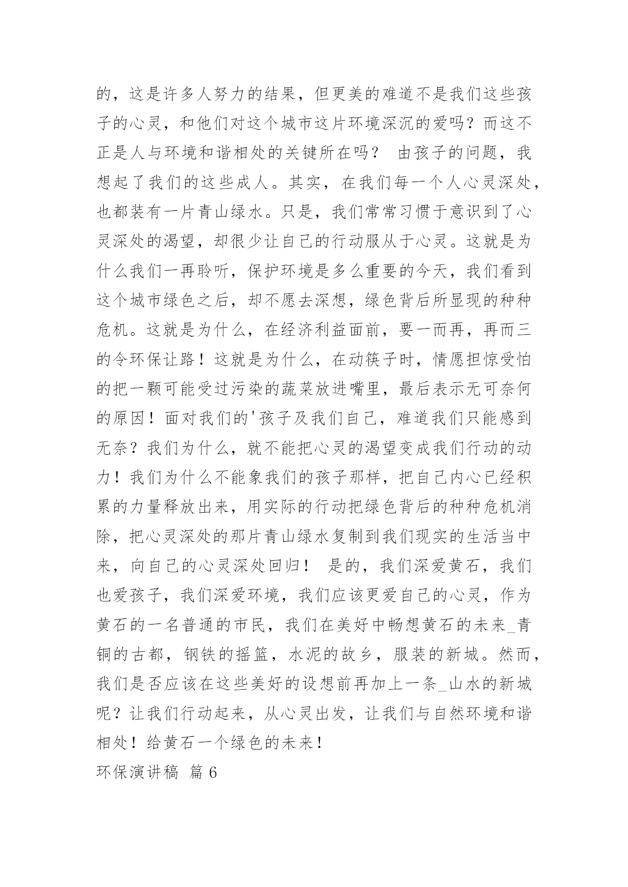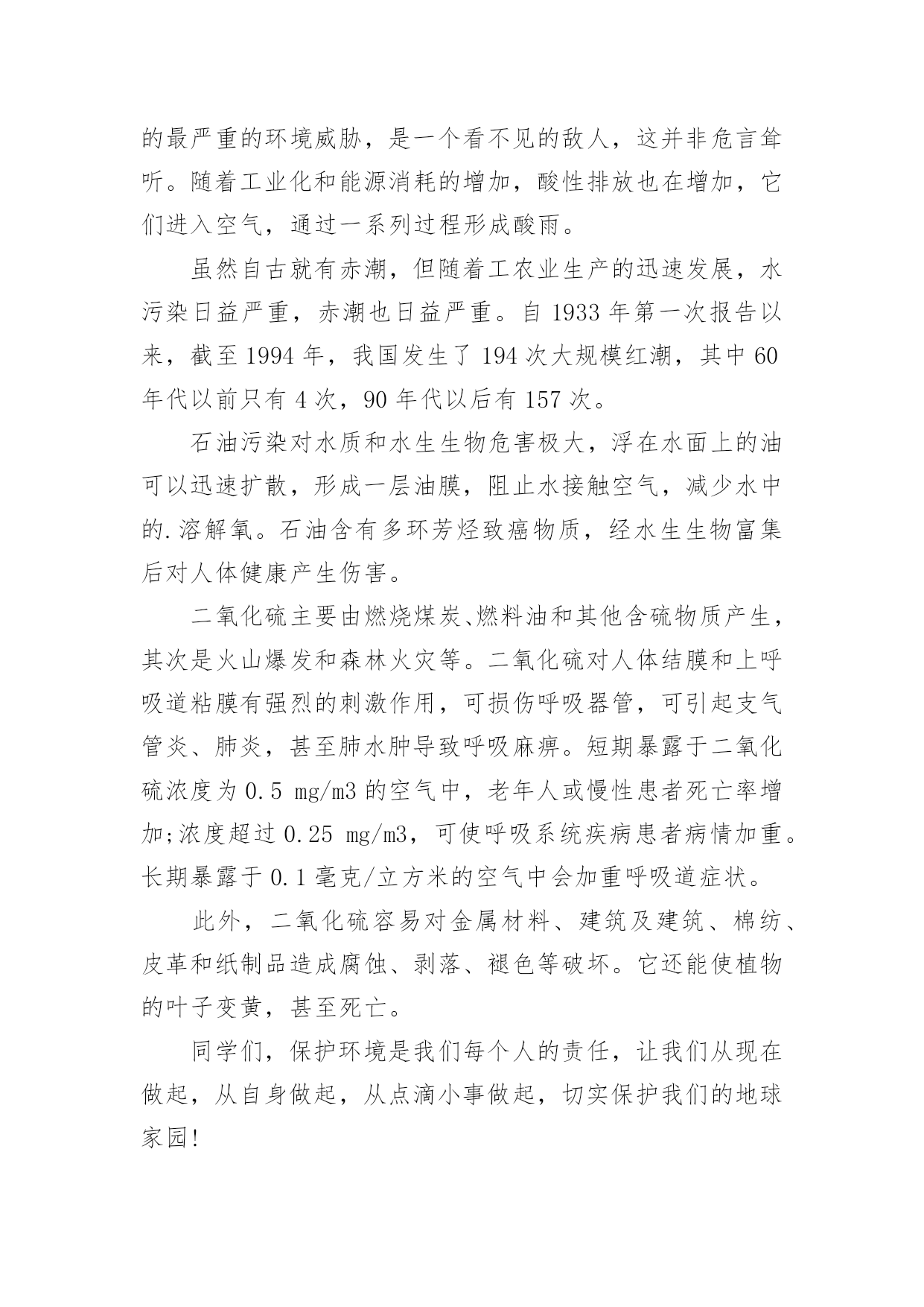 环保演讲稿【精选】环保演讲稿模板汇总8篇演讲稿具有观点鲜明,内容具有鼓动性的特点。在社会一步步向前发展的今天,需要使用演讲稿的事情愈发增多,你写演讲稿时总是没有新意?下面是小编整理的环保演讲稿10篇,供大家参考借鉴,希望可以帮助到有需要的朋友。环保演讲稿篇1老师们、同学们:放眼看去,只有凹凸不平的土地,大面积的树木被砍伐,成为人们生活上的木制品。人们为了自己的利益,使成群的动物流离失所,不得不漂泊他方。这不是一个错误的幻想,这是一个血腥的事实。曾经,世界上有大量的动植物灭绝了,有许多动植物濒临灭绝,这是为什么呢?这都是因为人类砍伐树木,破坏生态环境,这是根本原因。土地资源作为三大地质资源(矿产资源、水资源和土地资源)之一,是人类生产活动中最基本的资源和劳动对象。人类土地利用程度反映了人类文明的发展,但也直接破坏了土地资源,主要表现为不合理的开垦引起的水土流失、土地沙漠化、土地次生盐碱化和土壤污染,其中特别严重是的水土流失,这是当今世界面临的一个严重的危机。据估计,世界可耕地表土流失量每年约为230亿吨。有人认为酸雨是一场无声的危机,是历史上对我们造成的最严重的环境威胁,是一个看不见的敌人,这并非危言耸听。随着工业化和能源消耗的增加,酸性排放也在增加,它们进入空气,通过一系列过程形成酸雨。虽然自古就有赤潮,但随着工农业生产的迅速发展,水污染日益严重,赤潮也日益严重。自1933年第一次报告以来,截至1994年,我国发生了194次大规模红潮,其中60年代以前只有4次,90年代以后有157次。石油污染对水质和水生生物危害极大,浮在水面上的油可以迅速扩散,形成一层油膜,阻止水接触空气,减少水中的.溶解氧。石油含有多环芳烃致癌物质,经水生生物富集后对人体健康产生伤害。二氧化硫主要由燃烧煤炭、燃料油和其他含硫物质产生,其次是火山爆发和森林火灾等。二氧化硫对人体结膜和上呼吸道粘膜有强烈的刺激作用,可损伤呼吸器管,可引起支气管炎、肺炎,甚至肺水肿导致呼吸麻痹。短期暴露于二氧化硫浓度为0.5mg/m3的空气中,老年人或慢性患者死亡率增加;浓度超过0.25mg/m3,可使呼吸系统疾病患者病情加重。长期暴露于0.1毫克/立方米的空气中会加重呼吸道症状。此外,二氧化硫容易对金属材料、建筑及建筑、棉纺、皮革和纸制品造成腐蚀、剥落、褪色等破坏。它还能使植物的叶子变黄,甚至死亡。同学们,保护环境是我们每个人的责任,让我们从现在做起,从自身做起,从点滴小事做起,切实保护我们的地球家园!环保演讲稿篇2尊敬的老师,亲爱的同学:大家下午好:此刻,人们最终明白,躺在草地上睡觉远比在公交车上打盹舒服,而烟囱里冒出的黑烟遮挡出的阴影也没有大树下的阴凉凉爽。绿色,才是生活的本色。人,只是自然界的一种动物。人的祖先是猿猴,那是生活在森林里的动物,身边到处都是绿色,吃树叶,住树杈,进化到此刻的人时,自然还保留着对绿色原始热爱的基因。在我看来,此刻人追求绿色生活,更像是返祖现象,在高楼林立的城里住久了,想到森林里住几天,所以,许多人热衷于野营、野炊便顺理成章了。人在吃腻了大鱼大肉之后,发现蔬菜竟是那样可口,于是人真的像动物一样,追求各种鲜嫩的蔬果。更有越来越多的人开始生吃食物,由生菜到生肉,就像祖先那样茹毛饮血,生撕活拽。动物的本性在人类身上一览无遗,人似乎又过上了原始生活,叫上群居的哥们,去找鲜果,去觅生肉……找个开阔的地方挖个坑,把自我埋进去,吃点水,然后直愣愣站上半天,可能只会腰酸、背疼和脚麻,人不是植物,不明白植物在土中的自在和满足,只明白自我在土中疼痛难忍。所以,人还是应当回到房子里,种几盆花,在院子里或阳台上留一些草。我们不能生活在土里,就让它们替我们生活在土里。人总是聪明的,自我做不到的事总会让别的东西替我们做。人耕不动地就找到了牛,人夜里得休息就找到了狗看门,人不能每一天定时起床就找到了鸡打鸣。所以,当人发现自我不能在土中生根发芽时,就出现了盆景。绿色,是充满活力的颜色。当人看到大片绿色时,心中会有一种压抑许久的冲动,那是老祖先留在我们心中的东西,一向在支配着我们,流露在生活的每个地方,如院墙外的几棵树,阳台上的一盆花,碗里新鲜的青菜,玻璃缸里的'水藻和金鱼,等等。其实,我们一向在追求“绿色生活”,只是此刻的污染和机械的工业礼貌让这种追求更加冲动,表现得更加淋漓尽致。百年来追求经济发展的工业化的趋势,最终放缓,先污染后治理的思想最终受到阻击。人们开始关注自我生活的绿色,意识到工业和科技不是生活的全部,仅有护卫好生活中的绿色,才能得自然之理,发展科技和工业!追求绿色生活,是祖先遗传下来的天然基因的爆发,是一种人与自然“和好”的聪明之举,值得表扬。环保演讲稿篇3亲爱的同学们:我们的地球家园已经受到了严重的破坏。最直接被感受到的后果就是环境的质量下降,影响着人类的生