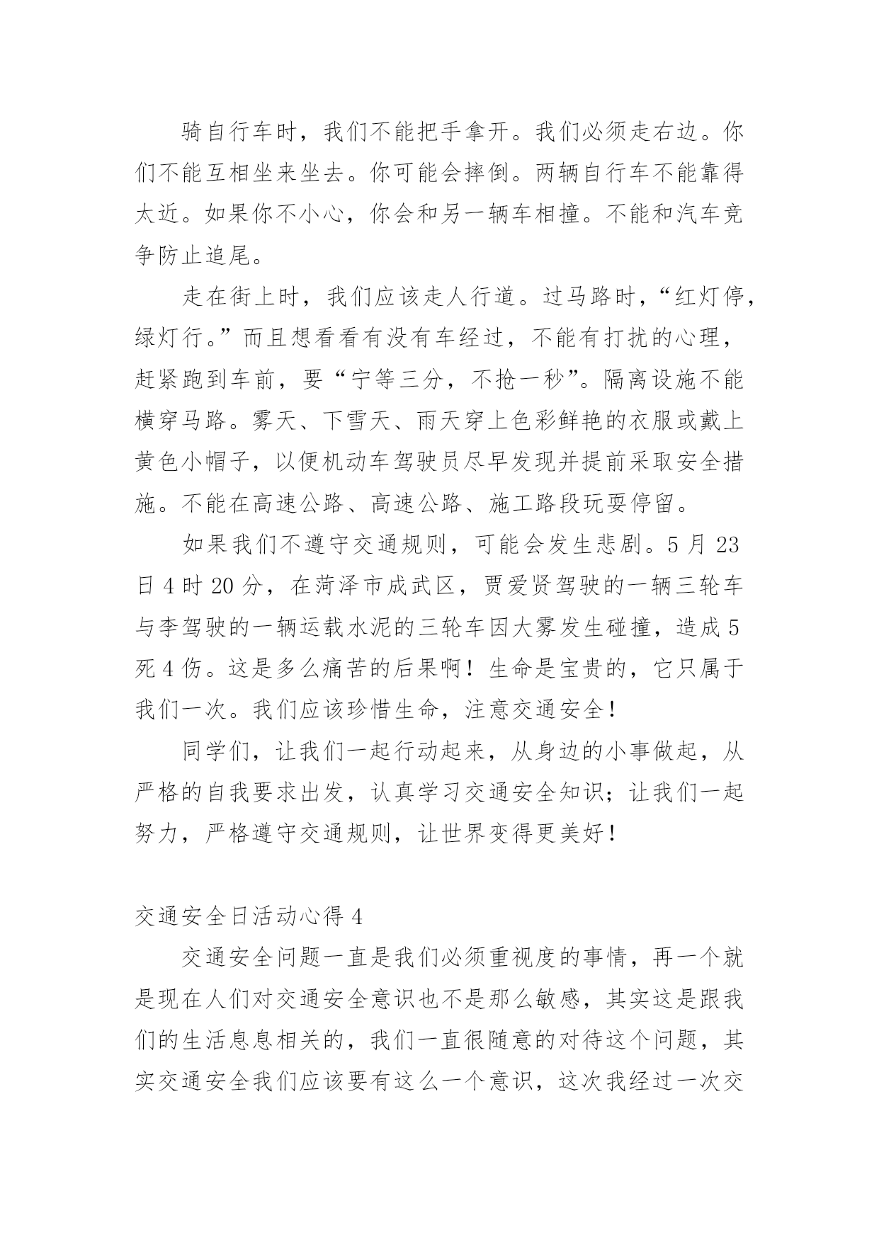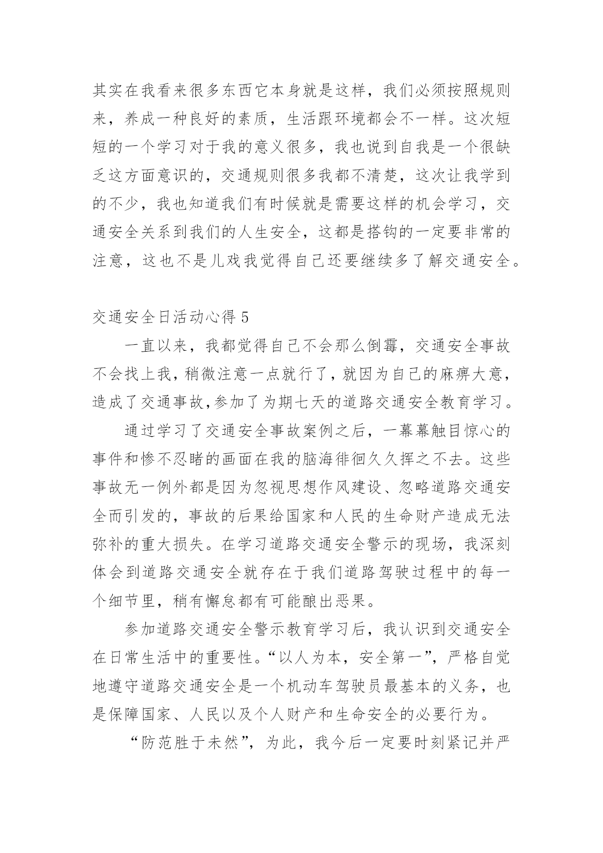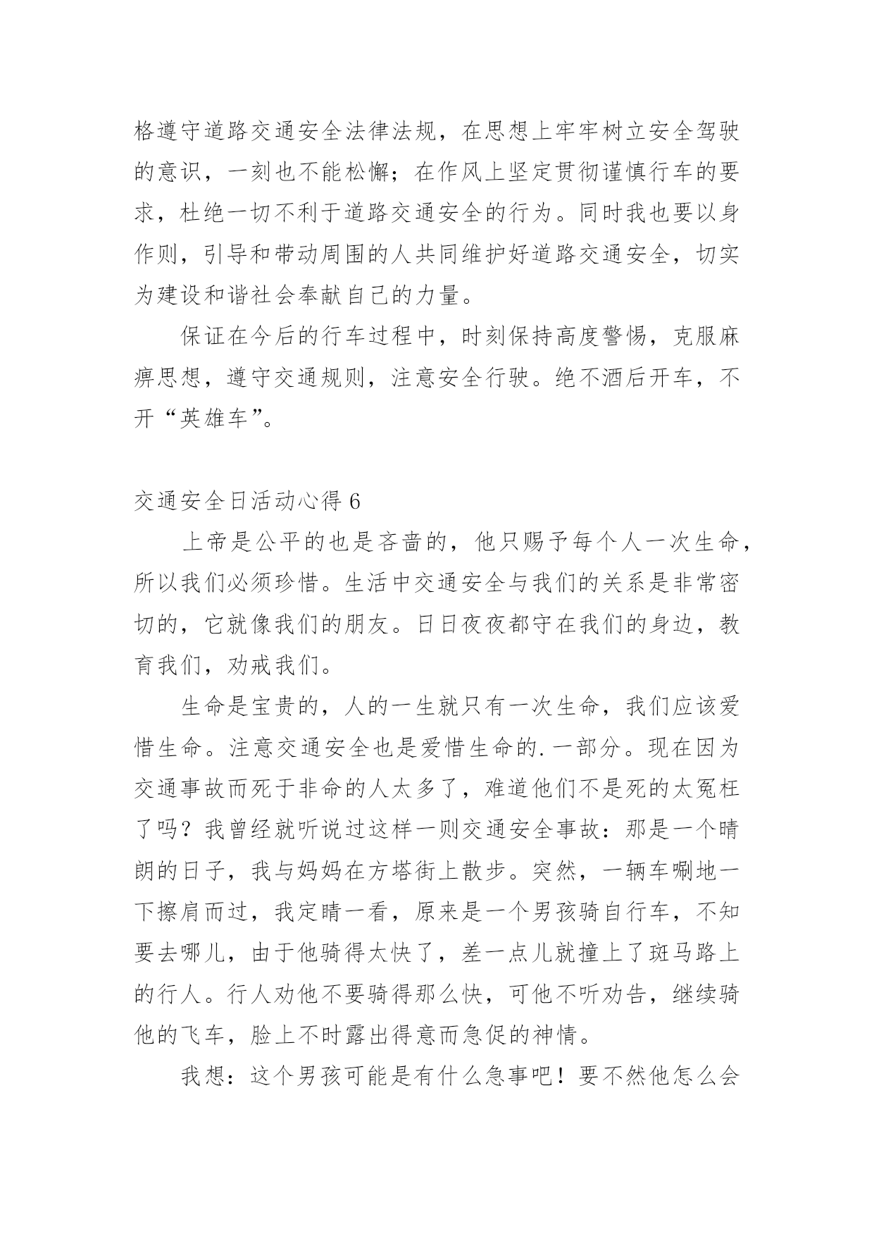 交通安全日活动心得从某件事情上得到收获以后,可以将其记录在心得体会中,这么做能够提升我们的书面表达能力。那么写心得体会要注意的内容有什么呢?下面是小编精心整理的交通安全日活动心得,供大家参考借鉴,希望可以帮助到有需要的朋友。交通安全日活动心得1“嘟嘟,嘟嘟”救护车飞驰而过,路上出现了一片血迹,交通事故再次出现。在这个快速发展的世界里,人们的生活节奏越来越快。各种交通工具的出现给人们带来了前所未有的便利,但在便利和快捷的同时,也存在着巨大的安全隐患——交通事故。一个接一个,第一秒生命活蹦乱跳,第二秒鲜血淋漓。这是多么恐怖的一幕,多么令人震惊。很多人认为交通事故离自己很远,不会发生。其实也没那么简单。交通事故就像潜伏在周围的炸弹。一不小心就会爆炸,炸了一个和谐的家庭。有句话说得好:“宁可等三分,不要抢一秒。”为什么会有交通事故?也就是说,有些人为了抢几秒钟的时间,与汽车相撞,给世界留下一个鲜活的生命。如果再多等几秒钟,这些悲剧能避免吗?我曾经听说过这样一个交通事故:一个男孩在高速公路上骑自行车,速度很快,有几次差点撞到行人。路边的人指着“超速男孩”说:“你看那个孩子,不要遵守交通规则,你要注意,不要被撞。”“飞天少年”一边骑着自行车一边得意洋洋地回头看,仿佛在炫耀自己的驾驶技术有多么娴熟高超。这时,一辆大卡车驶来,让他措手不及。结果,悲剧发生了,男孩倒在血泊中。过了一会儿,一对夫妇匆匆赶来,他们是男孩的父母,却无能为力。他们只能眼睁睁看着儿子魂飞魄散,父母伤心欲绝。同学们,为了我们能在美丽的校园里继续快乐的学习;为了我们健康成长,让生命之花继续绽放;为了让我们实现美好的理想,成为新世纪的接班人,肩负起建设祖国的光荣使命,请遵守交通规则!让我们记住这句话“我宁愿等三分,也不愿抢一秒”。交通安全日活动心得2交通安全直接关系到学生的健康成长,学生的安全,关系到千家万户的幸福。我校一直十分重视交通安全教育,从领导到班主任,到老师,一直到学生,层层落实,做了许多有关安全的工作和活动。1、学校应举办有关“交通安全法”的宣传图片展,让学生认识到交通安全方面的知识。2、学校应定期安排老师向同学传授交通安全知识。通过该活动可以使同学们认识常见的交通标志,知道自己平时参与交通时的错误,了解相关的交通法律,懂得相关交通知识,与争做知法守法的小公民拉近了距离。3、平时在网上或书报杂志上看到有关安全方面的报道,及时地向同学们反讲解。4、和学们一起学习已实施的新交通法。经过安全教育课,可以使安全意识深深地烙在老师和每个学生的心中。学生们提高了安全防范意识,懂得了一些基本的安全知识,也懂得了自我保护的方法。通过学习让同学了解更多更新的交通法规,懂得自觉遵守交通规则。自由与规则同行,生命与自律同在。生命弥足珍贵。安全提供保障。安全维系着社会的稳定,牵动着家庭的幸福,关系着广大学生的健康成长。在学校的正确领导和统一布署下学习交通安全教育,广大师生积极配合,热情参与,交通安全知识深入人心,得到广大师生的一致好评。交通安全日活动心得3交通安全对我们在无尽的交通世界中旅行非常重要。那怎么才能遵守交通安全法呢?现在我来说说我个人的观点。我们在旅行时,决不能乘坐超载车辆或无经营资格证的车辆,也不能携带易燃、易爆、有毒等危险品上车。骑车时,我们应该系安全带。我们不能看书,不能玩手机,不能在车里走来走去。我们不能和司机说话,分散司机的注意力。如果没有座位了,抓住把手或椅子。不要把头或四肢伸出窗外,以免被抓伤或拉出窗外。不要向车外扔垃圾,以免撞到路上行人或挡住其他车辆的车窗。下车时要听从乘务员的指示,根据两边是否有车辆行驶,依次下车,以免下车时被车撞。骑自行车时,我们不能把手拿开。我们必须走右边。你们不能互相坐来坐去。你可能会摔倒。两辆自行车不能靠得太近。如果你不小心,你会和另一辆车相撞。不能和汽车竞争防止追尾。走在街上时,我们应该走人行道。过马路时,“红灯停,绿灯行。”而且想看看有没有车经过,不能有打扰的心理,赶紧跑到车前,要“宁等三分,不抢一秒”。隔离设施不能横穿马路。雾天、下雪天、雨天穿上色彩鲜艳的衣服或戴上黄色小帽子,以便机动车驾驶员尽早发现并提前采取安全措施。不能在高速公路、高速公路、施工路段玩耍停留。如果我们不遵守交通规则,可能会发生悲剧。5月23日4时20分,在菏泽市成武区,贾爱贤驾驶的一辆三轮车与李驾驶的一辆运载水泥的三轮车因大雾发生碰撞,造成5死4伤。这是多么痛苦的后果啊!生命是宝贵的,它只属于我们一次。我们应该珍惜生命,注意交通安全!同学们,让我们一起行动起来,从身边的小事做起,从严格的自我要求出发,认真学习交通安全知识;让我们一起努力,严格遵守交通规则,让世界变得更美好!交通安全日活动心得4交通安全问题一直是我们必须重视度的事情,再一个就是现在人们对交通