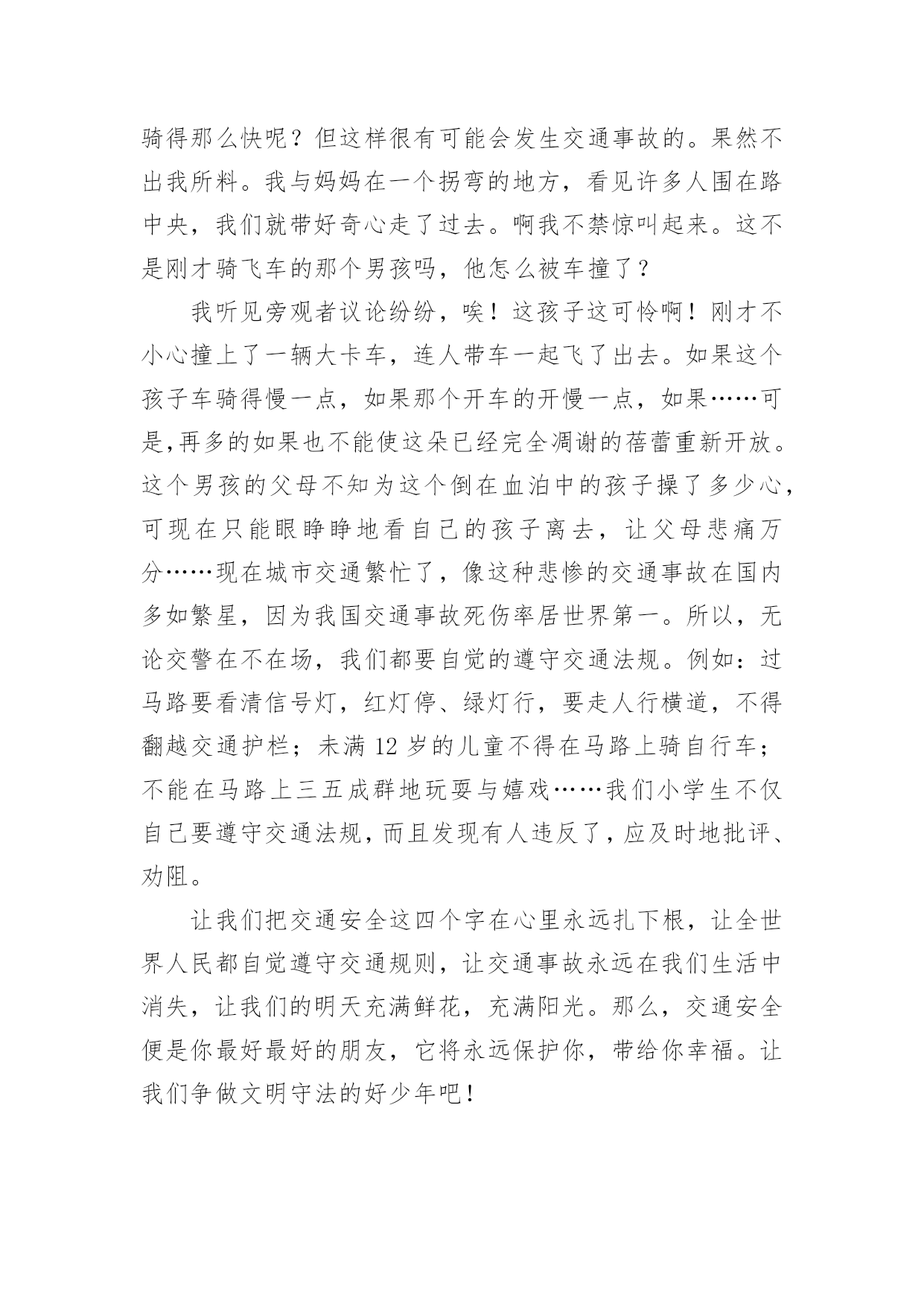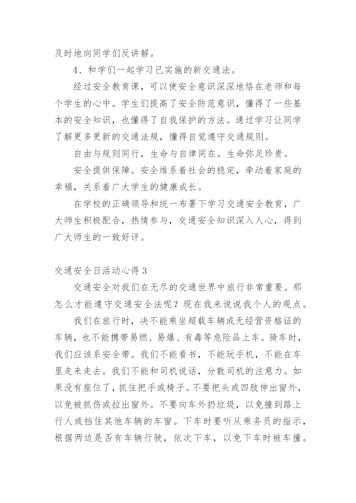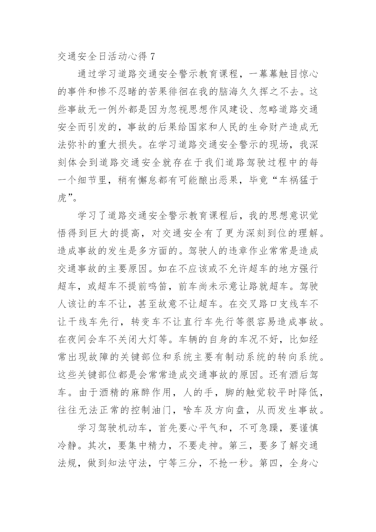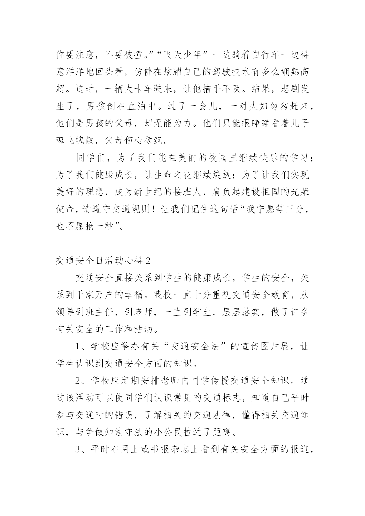 交通安全日活动心得从某件事情上得到收获以后,可以将其记录在心得体会中,这么做能够提升我们的书面表达能力。那么写心得体会要注意的内容有什么呢?下面是小编精心整理的交通安全日活动心得,供大家参考借鉴,希望可以帮助到有需要的朋友。交通安全日活动心得1“嘟嘟,嘟嘟”救护车飞驰而过,路上出现了一片血迹,交通事故再次出现。在这个快速发展的世界里,人们的生活节奏越来越快。各种交通工具的出现给人们带来了前所未有的便利,但在便利和快捷的同时,也存在着巨大的安全隐患——交通事故。一个接一个,第一秒生命活蹦乱跳,第二秒鲜血淋漓。这是多么恐怖的一幕,多么令人震惊。很多人认为交通事故离自己很远,不会发生。其实也没那么简单。交通事故就像潜伏在周围的炸弹。一不小心就会爆炸,炸了一个和谐的家庭。有句话说得好:“宁可等三分,不要抢一秒。”为什么会有交通事故?也就是说,有些人为了抢几秒钟的时间,与汽车相撞,给世界留下一个鲜活的生命。如果再多等几秒钟,这些悲剧能避免吗?我曾经听说过这样一个交通事故:一个男孩在高速公路上骑自行车,速度很快,有几次差点撞到行人。路边的人指着“超速男孩”说:“你看那个孩子,不要遵守交通规则,你要注意,不要被撞。”“飞天少年”一边骑着自行车一边得意洋洋地回头看,仿佛在炫耀自己的驾驶技术有多么娴熟高超。这时,一辆大卡车驶来,让他措手不及。结果,悲剧发生了,男孩倒在血泊中。过了一会儿,一对夫妇匆匆赶来,他们是男孩的父母,却无能为力。他们只能眼睁睁看着儿子魂飞魄散,父母伤心欲绝。同学们,为了我们能在美丽的校园里继续快乐的学习;为了我们健康成长,让生命之花继续绽放;为了让我们实现美好的理想,成为新世纪的接班人,肩负起建设祖国的光荣使命,请遵守交通规则!让我们记住这句话“我宁愿等三分,也不愿抢一秒”。交通安全日活动心得2交通安全直接关系到学生的健康成长,学生的安全,关系到千家万户的幸福。我校一直十分重视交通安全教育,从领导到班主任,到老师,一直到学生,层层落实,做了许多有关安全的工作和活动。1、学校应举办有关“交通安全法”的宣传图片展,让学生认识到交通安全方面的知识。2、学校应定期安排老师向同学传授交通安全知识。通过该活动可以使同学们认识常见的交通标志,知道自己平时参与交通时的错误,了解相关的交通法律,懂得相关交通知识,与争做知法守法的小公民拉近了距离。3、平时在网上或书报杂志上看到有关安全方面的报道,及时地向同学们反讲解。4、和学们一起学习已实施的新交通法。经过安全教育课,可以使安全意识深深地烙在老师和每个学生的心中。学生们提高了安全防范意识,懂得了一些基本的安全知识,也懂得了自我保护的方法。通过学习让同学了解更多更新的交通法规,懂得自觉遵守交通规则。自由与规则同行,生命与自律同在。生命弥足珍贵。安全提供保障。安全维系着社会的稳定,牵动着家庭的幸福,关系着广大学生的健康成长。在学校的正确领导和统一布署下学习交通安全教育,广大师生积极配合,热情参与,交通安全知识深入人心,得到广大师生的一致好评。交通安全日活动心得3交通安全对我们在无尽的交通世界中旅行非常重要。那怎么才能遵守交通安全法呢?现在我来说说我个人的观点。我们在旅行时,决不能乘坐超载车辆或无经营资格证的车辆,也不能携带易燃、易爆、有毒等危险品上车。骑车时,我们应该系安全带。我们不能看书,不能玩手机,不能在车里走来走去。我们不能和司机说话,分散司机的注意力。如果没有座位了,抓住把手或椅子。不要把头或四肢伸出窗外,以免被抓伤或拉出窗外。不要向车外扔垃圾,以免撞到路上行人或挡住其他车辆的车窗。下车时要听从乘务员的指示,根据两边是否有车辆行驶,依次下车,以免下车时被车撞。骑自行车时,我们不能把手拿开。我们必须走右边。你们不能互相坐来坐去。你可能会摔倒。两辆自行车不能靠得太近。如果你不小心,你会和另一辆车相撞。不能和汽车竞争防止追尾。走在街上时,我们应该走人行道。过马路时,“红灯停,绿灯行。”而且想看看有没有车经过,不能有打扰的心理,赶紧跑到车前,要“宁等三分,不抢一秒”。隔离设施不能横穿马路。雾天、下雪天、雨天穿上色彩鲜艳的衣服或戴上黄色小帽子,以便机动车驾驶员尽早发现并提前采取安全措施。不能在高速公路、高速公路、施工路段玩耍停留。如果我们不遵守交通规则,可能会发生悲剧。5月23日4时20分,在菏泽市成武区,贾爱贤驾驶的一辆三轮车与李驾驶的一辆运载水泥的三轮车因大雾发生碰撞,造成5死4伤。这是多么痛苦的后果啊!生命是宝贵的,它只属于我们一次。我们应该珍惜生命,注意交通安全!同学们,让我们一起行动起来,从身边的小事做起,从严格的自我要求出发,认真学习交通安全知识;让我们一起努力,严格遵守交通规则,让世界变得更美好!交通安全日活动心得4交通安全问题一直是我们必须重视度的事情,再一个就是现在人们对交通