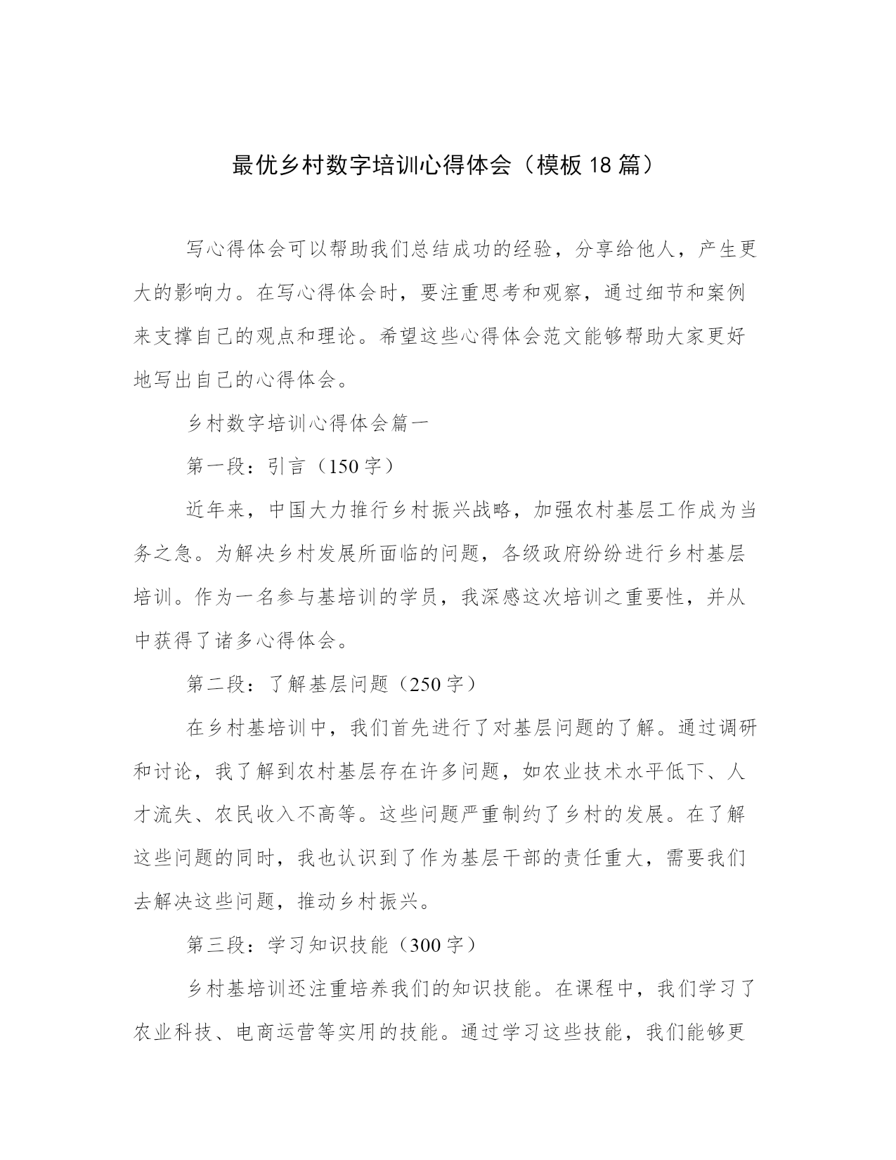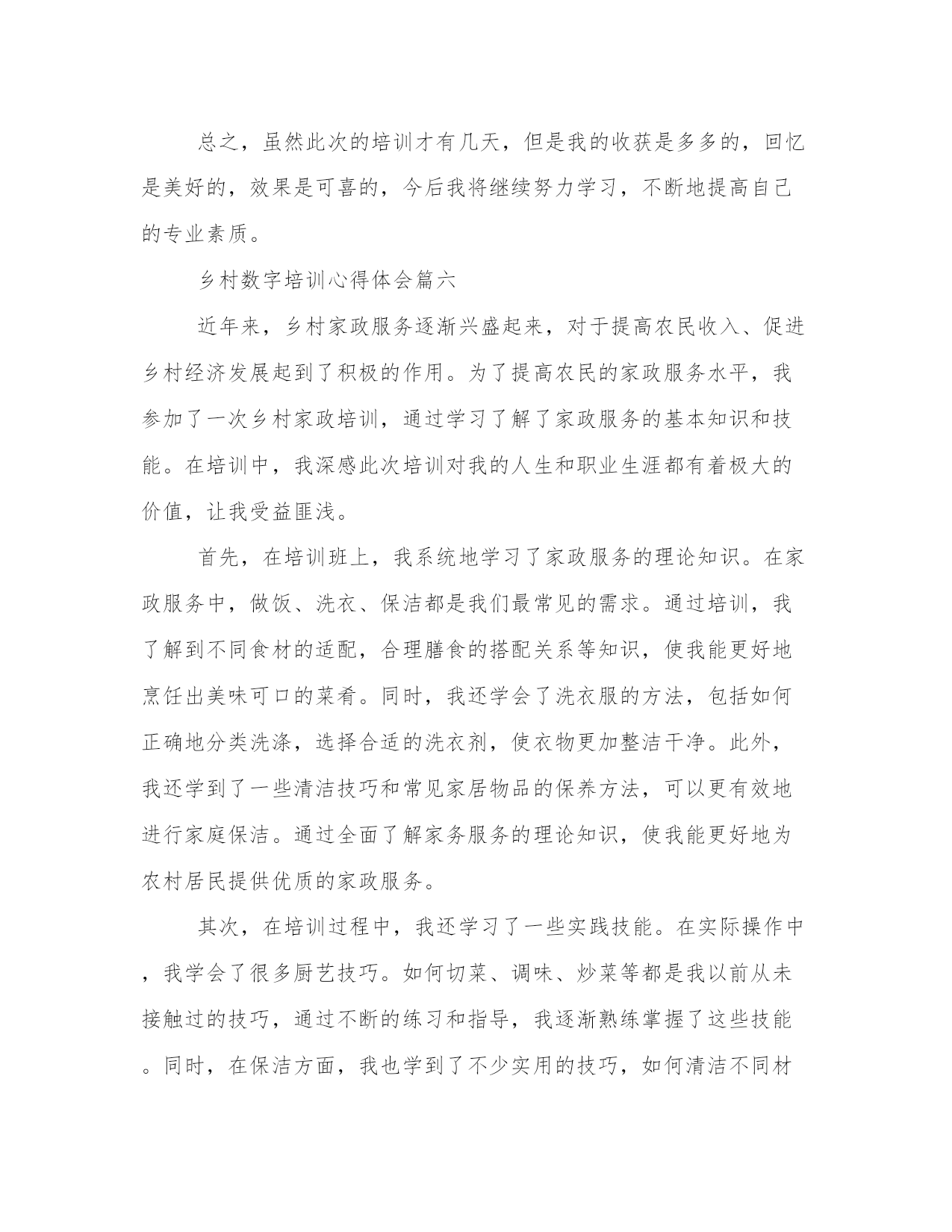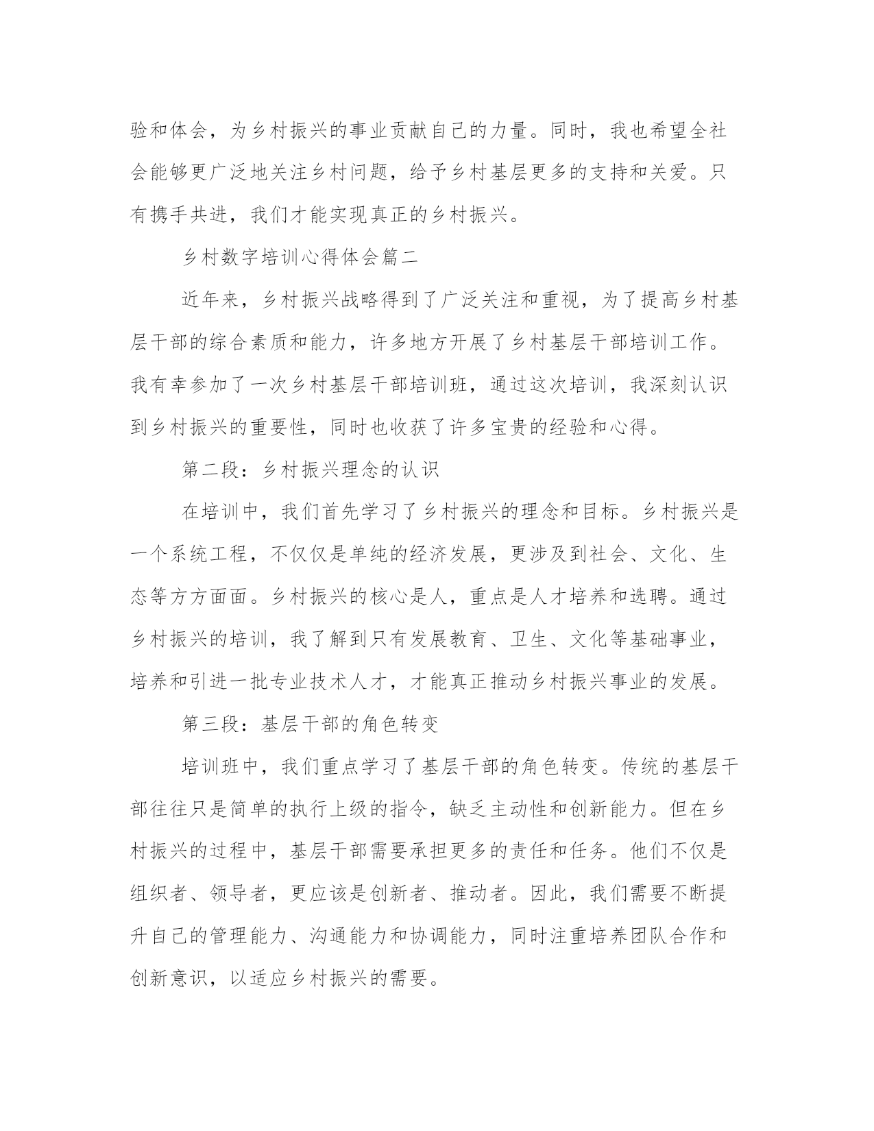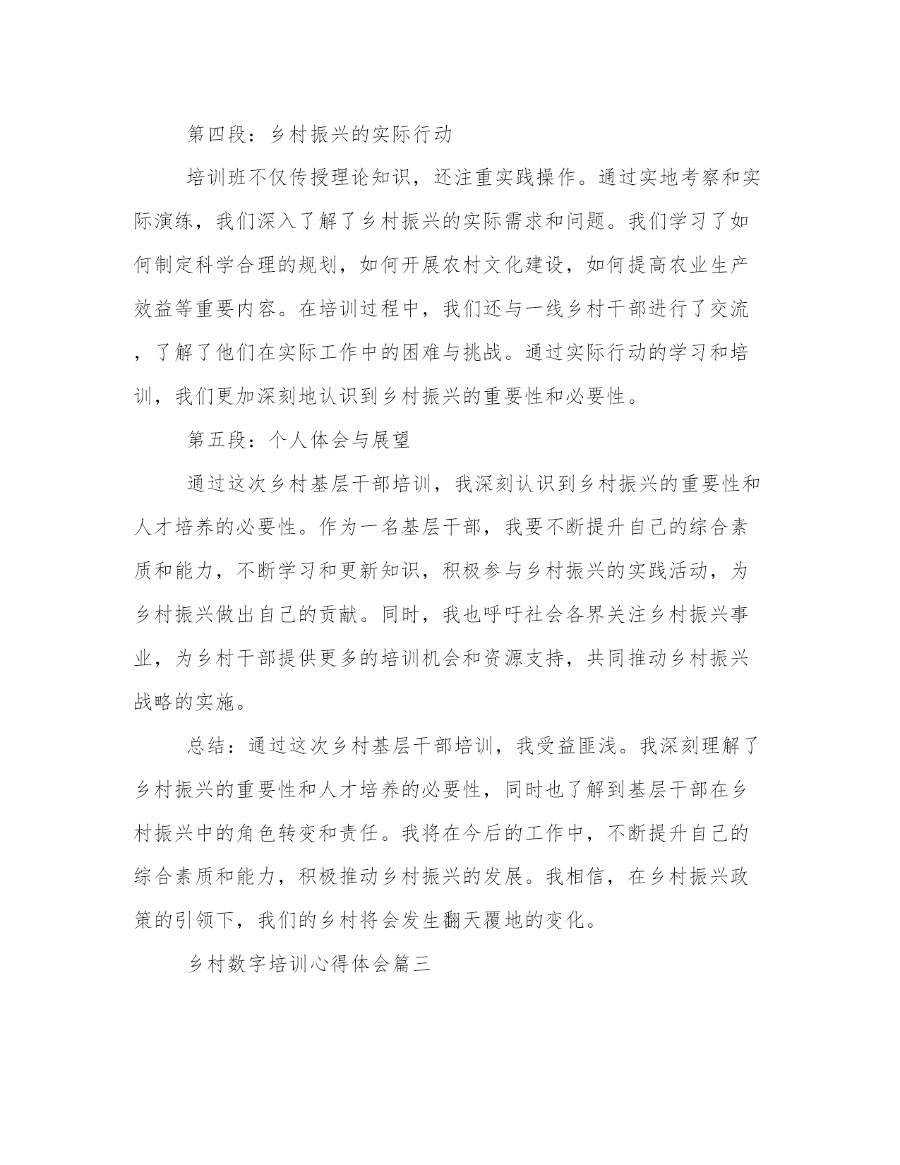 最优乡村数字培训心得体会(模板18篇)写心得体会可以帮助我们总结成功的经验,分享给他人,产生更大的影响力。在写心得体会时,要注重思考和观察,通过细节和案例来支撑自己的观点和理论。希望这些心得体会范文能够帮助大家更好地写出自己的心得体会。乡村数字培训心得体会篇一第一段:引言(150字)近年来,中国大力推行乡村振兴战略,加强农村基层工作成为当务之急。为解决乡村发展所面临的问题,各级政府纷纷进行乡村基层培训。作为一名参与基培训的学员,我深感这次培训之重要性,并从中获得了诸多心得体会。第二段:了解基层问题(250字)在乡村基培训中,我们首先进行了对基层问题的了解。通过调研和讨论,我了解到农村基层存在许多问题,如农业技术水平低下、人才流失、农民收入不高等。这些问题严重制约了乡村的发展。在了解这些问题的同时,我也认识到了作为基层干部的责任重大,需要我们去解决这些问题,推动乡村振兴。第三段:学习知识技能(300字)乡村基培训还注重培养我们的知识技能。在课程中,我们学习了农业科技、电商运营等实用的技能。通过学习这些技能,我们能够更好地指导农民开展生产,提高农业效益。此外,我们还学习了基础的领导能力和沟通技巧,在与农民的交流中,能更好地理解他们的需求和困难,并给予合理的建议和解决方案。这些知识技能的学习,为我们未来的工作提供了极大的帮助。第四段:实践演练(300字)乡村基培训的最重要环节是实践演练。我们参观了先进的农业生产示范点,并与当地农民交流,深入了解他们的实际困难和需求。此外,我们还组织了一些实践活动,如田间试验、农产品展销,让我们亲身体验乡村工作的艰辛和乐趣。通过实践演练,我们不仅更加深入地了解了乡村工作的实际情况,也进一步锻炼了我们的能力和技巧。第五段:体会与展望(200字)通过乡村基培训,我深深感到乡村基层工作的重要性和挑战性。乡村振兴不仅需要政府的支持和投入,更需要一支专业化、高素质的基层干部队伍。我相信,在这次培训中所学到的知识技能和实践经验,将对我未来的乡村工作产生积极的影响。我将用自己的专业知识和技能,为推动乡村振兴做出自己的贡献。同时,我也希望政府能够加大对基层培训的投入,提高培训的实效性和针对性,为乡村工作提供更好的人才支持和保障。总结:(提醒不计入总字数)通过乡村基培训,我对乡村基层工作的重要性有了更深刻的认识,并从中获得了宝贵的知识技能。未来,我将带着培训中所学到的经验和体会,为乡村振兴的事业贡献自己的力量。同时,我也希望全社会能够更广泛地关注乡村问题,给予乡村基层更多的支持和关爱。只有携手共进,我们才能实现真正的乡村振兴。乡村数字培训心得体会篇二近年来,乡村振兴战略得到了广泛关注和重视,为了提高乡村基层干部的综合素质和能力,许多地方开展了乡村基层干部培训工作。我有幸参加了一次乡村基层干部培训班,通过这次培训,我深刻认识到乡村振兴的重要性,同时也收获了许多宝贵的经验和心得。第二段:乡村振兴理念的认识在培训中,我们首先学习了乡村振兴的理念和目标。乡村振兴是一个系统工程,不仅仅是单纯的经济发展,更涉及到社会、文化、生态等方方面面。乡村振兴的核心是人,重点是人才培养和选聘。通过乡村振兴的培训,我了解到只有发展教育、卫生、文化等基础事业,培养和引进一批专业技术人才,才能真正推动乡村振兴事业的发展。第三段:基层干部的角色转变培训班中,我们重点学习了基层干部的角色转变。传统的基层干部往往只是简单的执行上级的指令,缺乏主动性和创新能力。但在乡村振兴的过程中,基层干部需要承担更多的责任和任务。他们不仅是组织者、领导者,更应该是创新者、推动者。因此,我们需要不断提升自己的管理能力、沟通能力和协调能力,同时注重培养团队合作和创新意识,以适应乡村振兴的需要。第四段:乡村振兴的实际行动培训班不仅传授理论知识,还注重实践操作。通过实地考察和实际演练,我们深入了解了乡村振兴的实际需求和问题。我们学习了如何制定科学合理的规划,如何开展农村文化建设,如何提高农业生产效益等重要内容。在培训过程中,我们还与一线乡村干部进行了交流,了解了他们在实际工作中的困难与挑战。通过实际行动的学习和培训,我们更加深刻地认识到乡村振兴的重要性和必要性。第五段:个人体会与展望通过这次乡村基层干部培训,我深刻认识到乡村振兴的重要性和人才培养的必要性。作为一名基层干部,我要不断提升自己的综合素质和能力,不断学习和更新知识,积极参与乡村振兴的实践活动,为乡村振兴做出自己的贡献。同时,我也呼吁社会各界关注乡村振兴事业,为乡村干部提供更多的培训机会和资源支持,共同推动乡村振兴战略的实施。总结:通过这次乡村基层干部培训,我受益匪浅。我深刻理解了乡村振兴的重要性和人才培养的必要性,同时也了解到基层干部在乡村振兴中的角色转变和责任。我