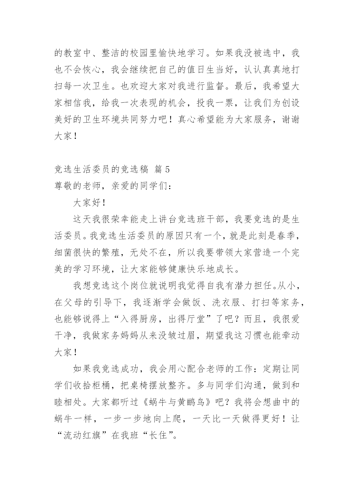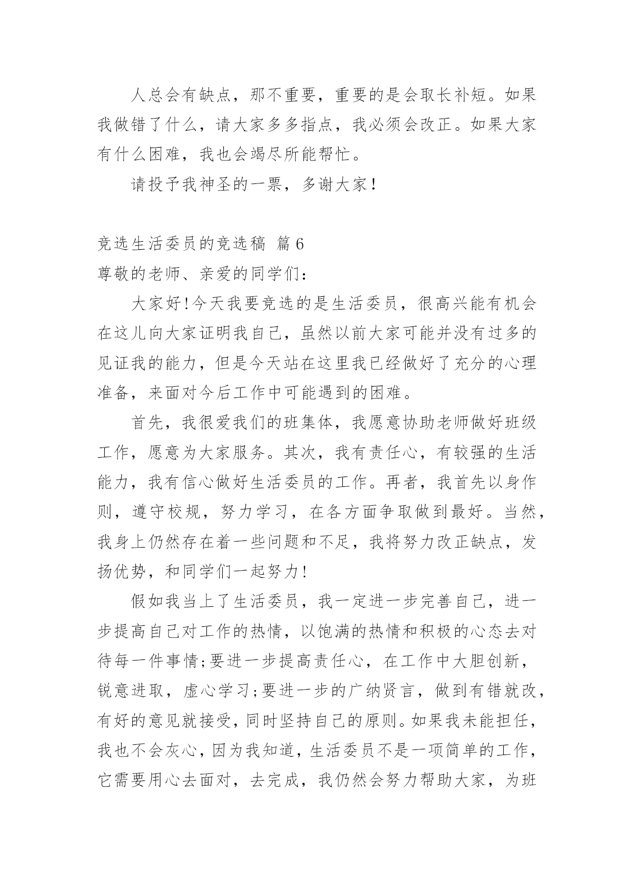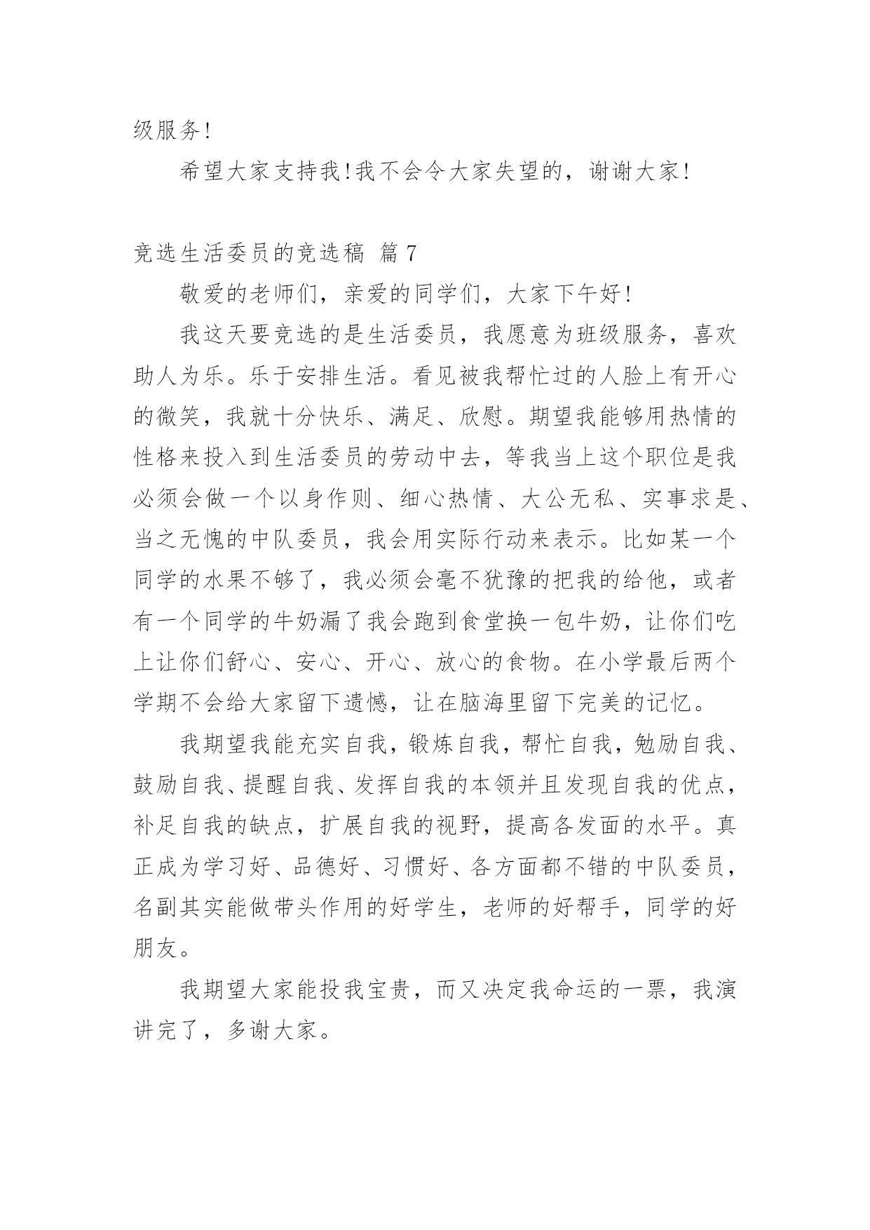 竞选生活委员的竞选稿关于竞选生活委员的竞选稿集合七篇在日新月异的现代社会中,能够利用到竞选稿的场合越来越多,竞选稿可以帮助竞选者更好地表明自己的态度和做某事的意愿。那么,怎么去写竞选稿呢?下面是小编为大家收集的竞选生活委员的竞选稿7篇,欢迎大家分享。竞选生活委员的竞选稿篇1尊敬的老师,亲爱的同学们:您们好,我的名字是xx,在此次竞选中,我将竞选生活委员这一职务。我是一个比较有责任感的人,并且对待事情也很仔细认真谨慎,自从班级公布出这些职务后,我认为我自己比较适合当然也有能力做好生活委员这一职务。竞选生活委员发言稿。钱,一直都是一个比较敏感的字眼,但是生活委员的主要职责就是管理班费,班费,换句话说也就是集体的财产。所以必须需要一位做人做事都比较谨慎,认真,仔细的人来担任,而我认为我能够胜任这一职务。如果有幸能够担任生活委员,我将尽量帮助老师管好这方面的事情,让老师可以少在这方面操心。首先呢,班费是为集体服务的,也就是说是公共财产,所以必须仔细认真的做好班费的收入,支出以及用途,支出收入时间,支出人,支出数目等的详细记录。然后必须定期的向同学们公布帐单,并且请班长以及同学代表查录账目。再者,如果遇见下列情况,例如班级中某同学因钱财丢失而出现的暂时困难,该同学可以申请使用一定限额的班费,此时,生活委员应及时的把申请书送到班主任处,同意批准后方可借出最后:如果遇见特殊情况,则另外视情况而定并且时刻完善班费使用制度。我相信我有能力胜任生活委员这一职务,请老师同学们给我一个证明自己的机会。竞选生活委员的竞选稿篇2敬爱的老师、亲爱的同学们:大家好!很高兴能参加这次班委竞选,我竞选的职位是生活委员。我想,班级不仅仅是我们为了学习而组成的一个集体,而应该是一个温馨的大家庭。每一天,与我们相处时间最长的便是老师和同学们。我们每个人都是这个大家庭中的一员,而生活委员,便起到了其中的组织整体、关怀细节的作用。首先,我很爱我们的班集体,我愿意协助老师做好班级工作,我愿意为大家服务。其次,我有责任心,有较强的生活能力,我有信心做好生活委员的工作。再者,我首先以身作则,遵守校规,努力学习,在各方面争取做到最好。当然,我身上仍然存在着一些问题和不足,我将努力改正缺点,发扬优势,和同学们一起努力,使我们成为学校的骄傲!希望大家支持我!我相信我不会令大家失望。竞选生活委员的竞选稿篇3亲爱的同学们:大家好!我今天要竞选的是生活委员。现在走上讲台,我的心情非常激动,同时,我也自信满满。相信凭着我的热情和智慧,凭着我勇于向前的决心,这次演讲带来的必定是下次的就职演说。我叫张大文,是一个活泼开朗又热与帮助人地小男孩。每天的生活都会发生很多琐碎的事情,作为一个集体,如果没有一个好的、有组织能力的人来做这些事情是不行的。这正好发挥了我“多管闲事”的特长。因此,如果我当上生活委员,首先,在同学们睡觉时,如果有人说话或乱动的,我会小声提醒他。其次,中午,同学们在餐厅就餐时,我会做好纪律监督工作,帮同学们养成“茶不言饭不语”的好习惯。平时我会帮助那些需要帮助的同学。最后,我会协助老师及其他班干部做好班里学习生活的一切工作。拿破仑说过,不想当元帅的士兵不是好士兵。我不但要当元帅,还要当个称职的好元帅!还有一位伟人说过:“一滴水要流进大海才会永不干涸”,我就是那一滴水!我的成功要靠大家的支持!也许平时的我太过平凡,但是我相信,有了同学们对我的支持和帮助,我一定会扬长避短,改掉自己的缺点,不断完善自己!请大家支持我,托给我你手中那宝贵的一票吧!谢谢!竞选生活委员的`竞选稿篇4敬爱的老师,亲爱的同学们:你们好!我很荣幸站在这里竞选生活委员,也感谢大家给我这次机会。我是一个活泼开朗、学习认真,但偶尔也会有一点粗心的开朗女孩。我想借着这次竞选班干部的机会,竞选卫生委员一职。我相信自己能把班里的卫生管理好,而且,在卫生方面,我还是很有经验的。每次我家进行卫生扫除时,我可是主力军啊。我会把厨子擦得干干净净,地面也扫得光溜溜的。如果让蚂蚁在地面上爬,肯定会摔几个跟头呢!爸爸妈妈常夸我卫生打扫的干净,为此,还特意送我一个光荣的称号:“家庭卫生打扫小能手”。这次竞选卫生委员,爸爸妈妈也特别支持我。不管竞选结果怎样,我都希望大家相信我。如果我有幸被选中,我会好好的、认真的为大家服务。我会和同学们一起把个人卫生、室内、走廊、卫生区的卫生打扫好。我坚信会带给大家一个良好的学习环境,让大家在干净的教室中、整洁的校园里愉快地学习。如果我没被选中,我也不会恢心,我会继续把自己的值日生当好,认认真真地打扫每一次卫生。也欢迎大家对我进行监督。最后,我希望大家相信我,给我一次表现的机会,投我一票,让我们为创设美好的卫生环境共同努力吧!真心希望能为大家服务,谢谢大家!竞选生活委员的竞选稿篇5尊敬的老师,亲爱的同学们:
