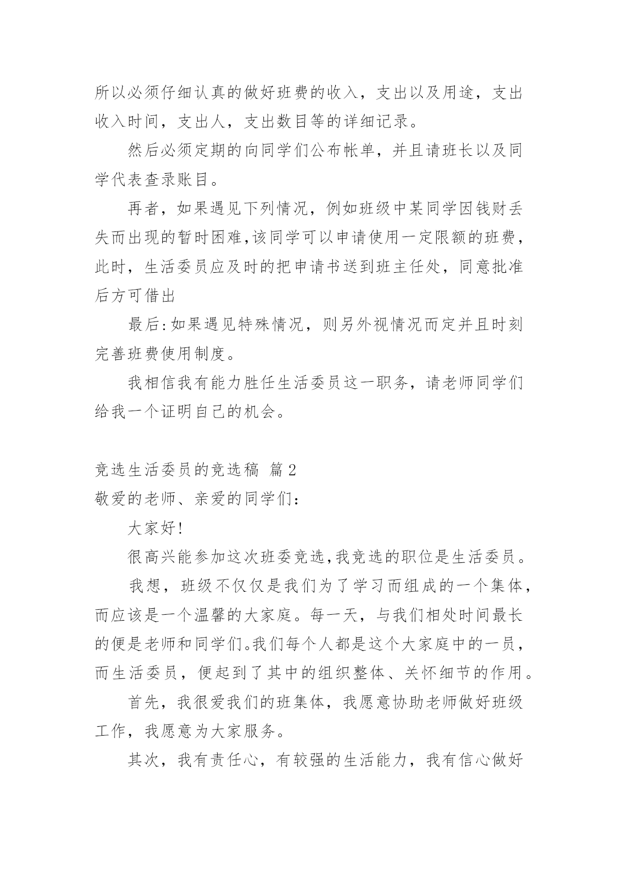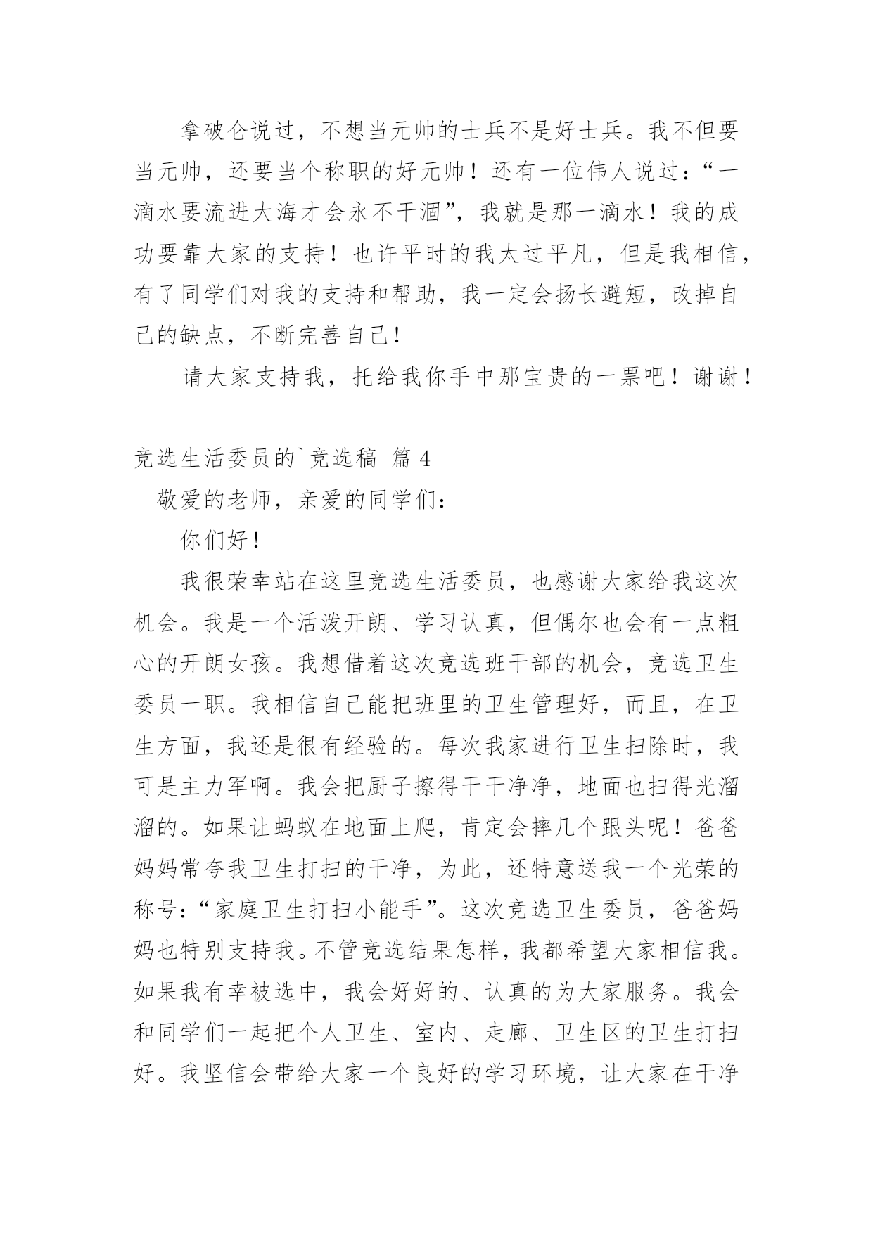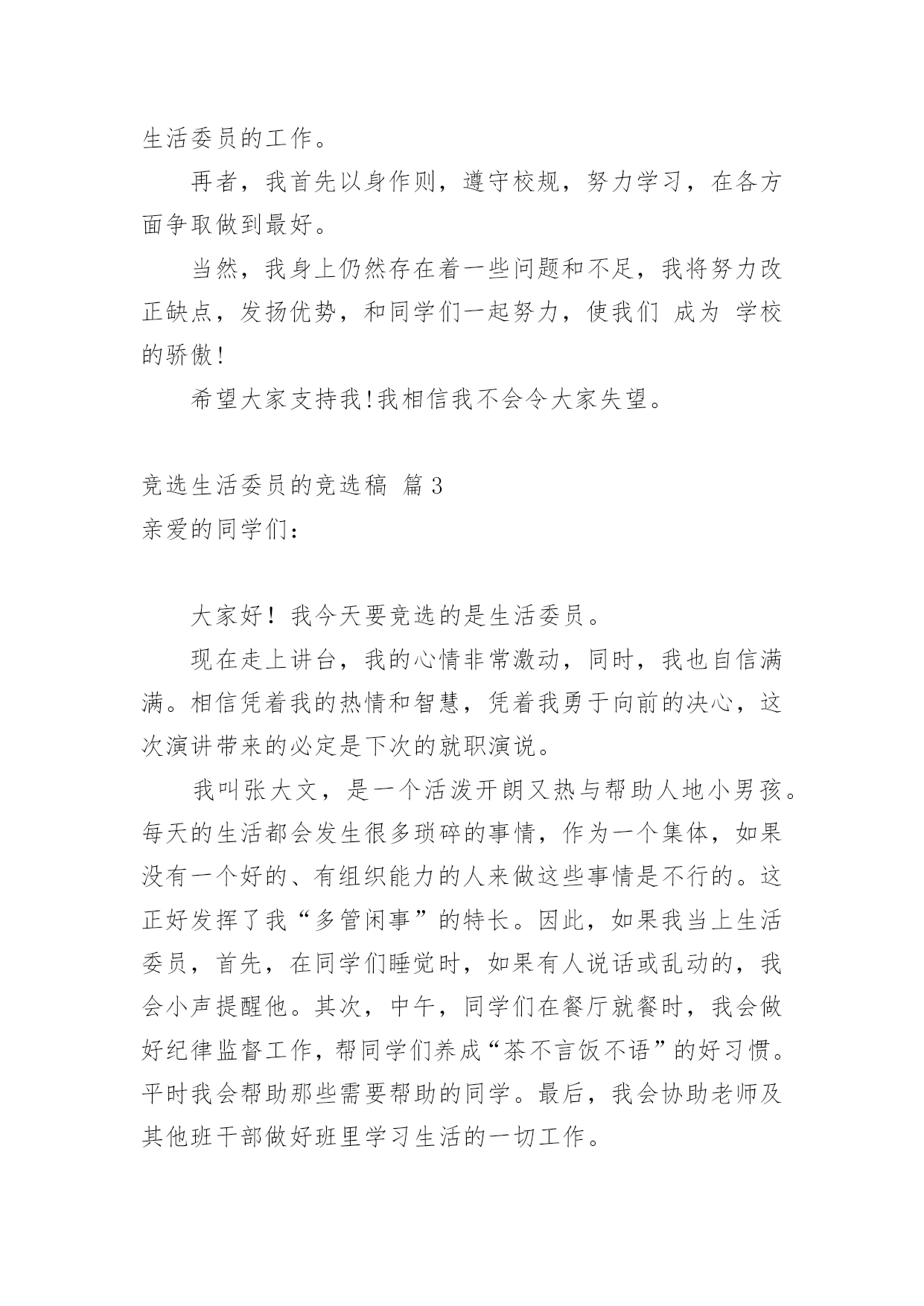 竞选生活委员的竞选稿关于竞选生活委员的竞选稿集合七篇在日新月异的现代社会中,能够利用到竞选稿的场合越来越多,竞选稿可以帮助竞选者更好地表明自己的态度和做某事的意愿。那么,怎么去写竞选稿呢?下面是小编为大家收集的竞选生活委员的竞选稿7篇,欢迎大家分享。竞选生活委员的竞选稿篇1尊敬的老师,亲爱的同学们:您们好,我的名字是xx,在此次竞选中,我将竞选生活委员这一职务。我是一个比较有责任感的人,并且对待事情也很仔细认真谨慎,自从班级公布出这些职务后,我认为我自己比较适合当然也有能力做好生活委员这一职务。竞选生活委员发言稿。钱,一直都是一个比较敏感的字眼,但是生活委员的主要职责就是管理班费,班费,换句话说也就是集体的财产。所以必须需要一位做人做事都比较谨慎,认真,仔细的人来担任,而我认为我能够胜任这一职务。如果有幸能够担任生活委员,我将尽量帮助老师管好这方面的事情,让老师可以少在这方面操心。首先呢,班费是为集体服务的,也就是说是公共财产,所以必须仔细认真的做好班费的收入,支出以及用途,支出收入时间,支出人,支出数目等的详细记录。然后必须定期的向同学们公布帐单,并且请班长以及同学代表查录账目。再者,如果遇见下列情况,例如班级中某同学因钱财丢失而出现的暂时困难,该同学可以申请使用一定限额的班费,此时,生活委员应及时的把申请书送到班主任处,同意批准后方可借出最后:如果遇见特殊情况,则另外视情况而定并且时刻完善班费使用制度。我相信我有能力胜任生活委员这一职务,请老师同学们给我一个证明自己的机会。竞选生活委员的竞选稿篇2敬爱的老师、亲爱的同学们:大家好!很高兴能参加这次班委竞选,我竞选的职位是生活委员。我想,班级不仅仅是我们为了学习而组成的一个集体,而应该是一个温馨的大家庭。每一天,与我们相处时间最长的便是老师和同学们。我们每个人都是这个大家庭中的一员,而生活委员,便起到了其中的组织整体、关怀细节的作用。首先,我很爱我们的班集体,我愿意协助老师做好班级工作,我愿意为大家服务。其次,我有责任心,有较强的生活能力,我有信心做好生活委员的工作。再者,我首先以身作则,遵守校规,努力学习,在各方面争取做到最好。当然,我身上仍然存在着一些问题和不足,我将努力改正缺点,发扬优势,和同学们一起努力,使我们成为学校的骄傲!希望大家支持我!我相信我不会令大家失望。竞选生活委员的竞选稿篇3亲爱的同学们:大家好!我今天要竞选的是生活委员。现在走上讲台,我的心情非常激动,同时,我也自信满满。相信凭着我的热情和智慧,凭着我勇于向前的决心,这次演讲带来的必定是下次的就职演说。我叫张大文,是一个活泼开朗又热与帮助人地小男孩。每天的生活都会发生很多琐碎的事情,作为一个集体,如果没有一个好的、有组织能力的人来做这些事情是不行的。这正好发挥了我“多管闲事”的特长。因此,如果我当上生活委员,首先,在同学们睡觉时,如果有人说话或乱动的,我会小声提醒他。其次,中午,同学们在餐厅就餐时,我会做好纪律监督工作,帮同学们养成“茶不言饭不语”的好习惯。平时我会帮助那些需要帮助的同学。最后,我会协助老师及其他班干部做好班里学习生活的一切工作。拿破仑说过,不想当元帅的士兵不是好士兵。我不但要当元帅,还要当个称职的好元帅!还有一位伟人说过:“一滴水要流进大海才会永不干涸”,我就是那一滴水!我的成功要靠大家的支持!也许平时的我太过平凡,但是我相信,有了同学们对我的支持和帮助,我一定会扬长避短,改掉自己的缺点,不断完善自己!请大家支持我,托给我你手中那宝贵的一票吧!谢谢!竞选生活委员的`竞选稿篇4敬爱的老师,亲爱的同学们:你们好!我很荣幸站在这里竞选生活委员,也感谢大家给我这次机会。我是一个活泼开朗、学习认真,但偶尔也会有一点粗心的开朗女孩。我想借着这次竞选班干部的机会,竞选卫生委员一职。我相信自己能把班里的卫生管理好,而且,在卫生方面,我还是很有经验的。每次我家进行卫生扫除时,我可是主力军啊。我会把厨子擦得干干净净,地面也扫得光溜溜的。如果让蚂蚁在地面上爬,肯定会摔几个跟头呢!爸爸妈妈常夸我卫生打扫的干净,为此,还特意送我一个光荣的称号:“家庭卫生打扫小能手”。这次竞选卫生委员,爸爸妈妈也特别支持我。不管竞选结果怎样,我都希望大家相信我。如果我有幸被选中,我会好好的、认真的为大家服务。我会和同学们一起把个人卫生、室内、走廊、卫生区的卫生打扫好。我坚信会带给大家一个良好的学习环境,让大家在干净的教室中、整洁的校园里愉快地学习。如果我没被选中,我也不会恢心,我会继续把自己的值日生当好,认认真真地打扫每一次卫生。也欢迎大家对我进行监督。最后,我希望大家相信我,给我一次表现的机会,投我一票,让我们为创设美好的卫生环境共同努力吧!真心希望能为大家服务,谢谢大家!竞选生活委员的竞选稿篇5尊敬的老师,亲爱的同学们: