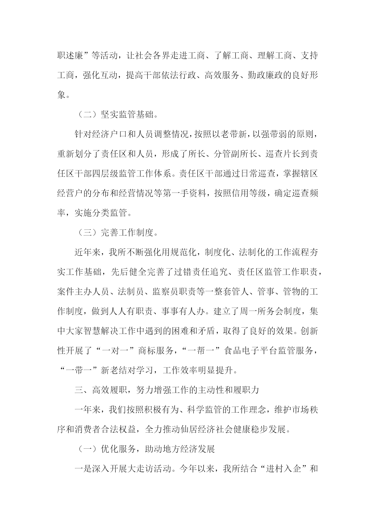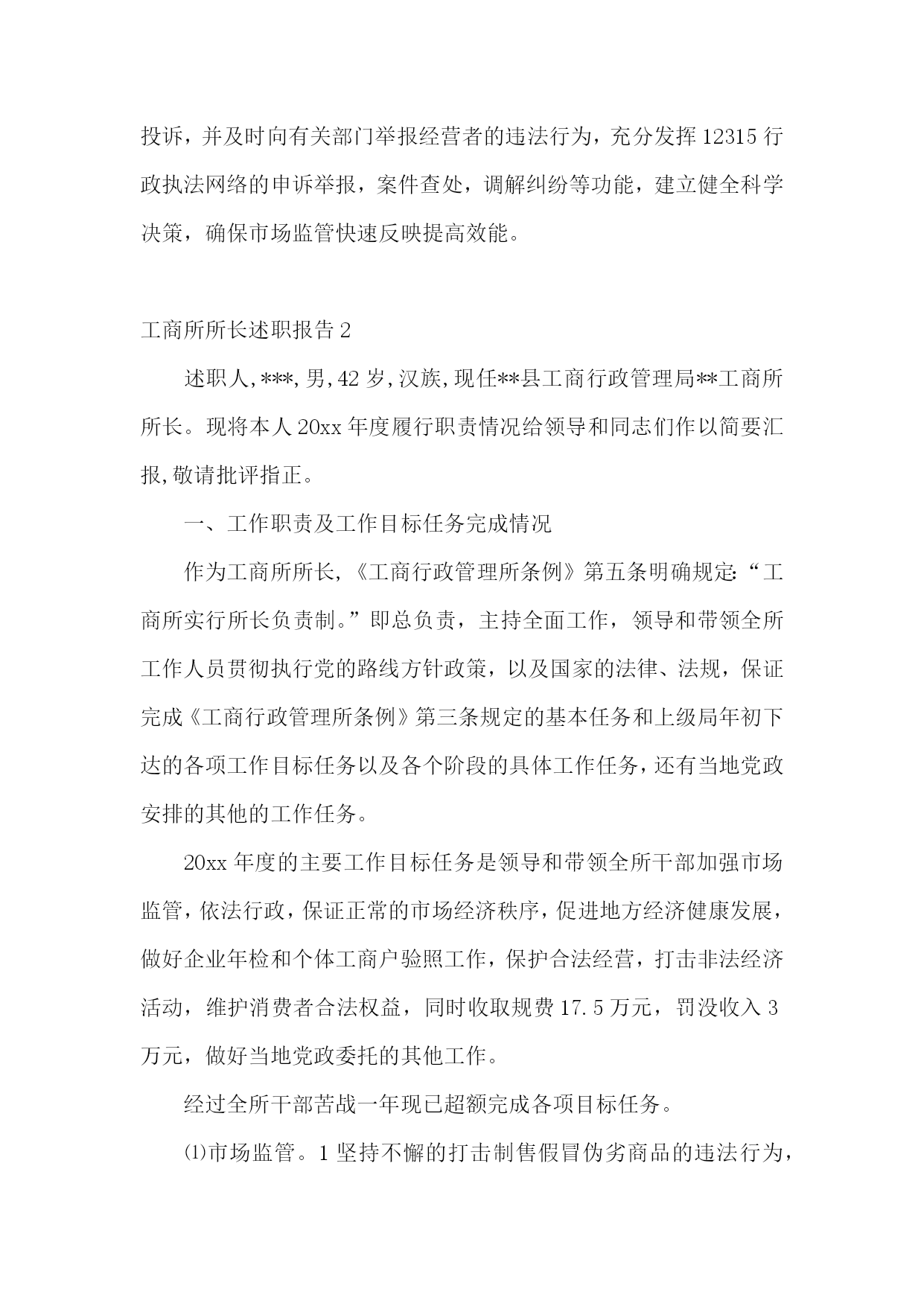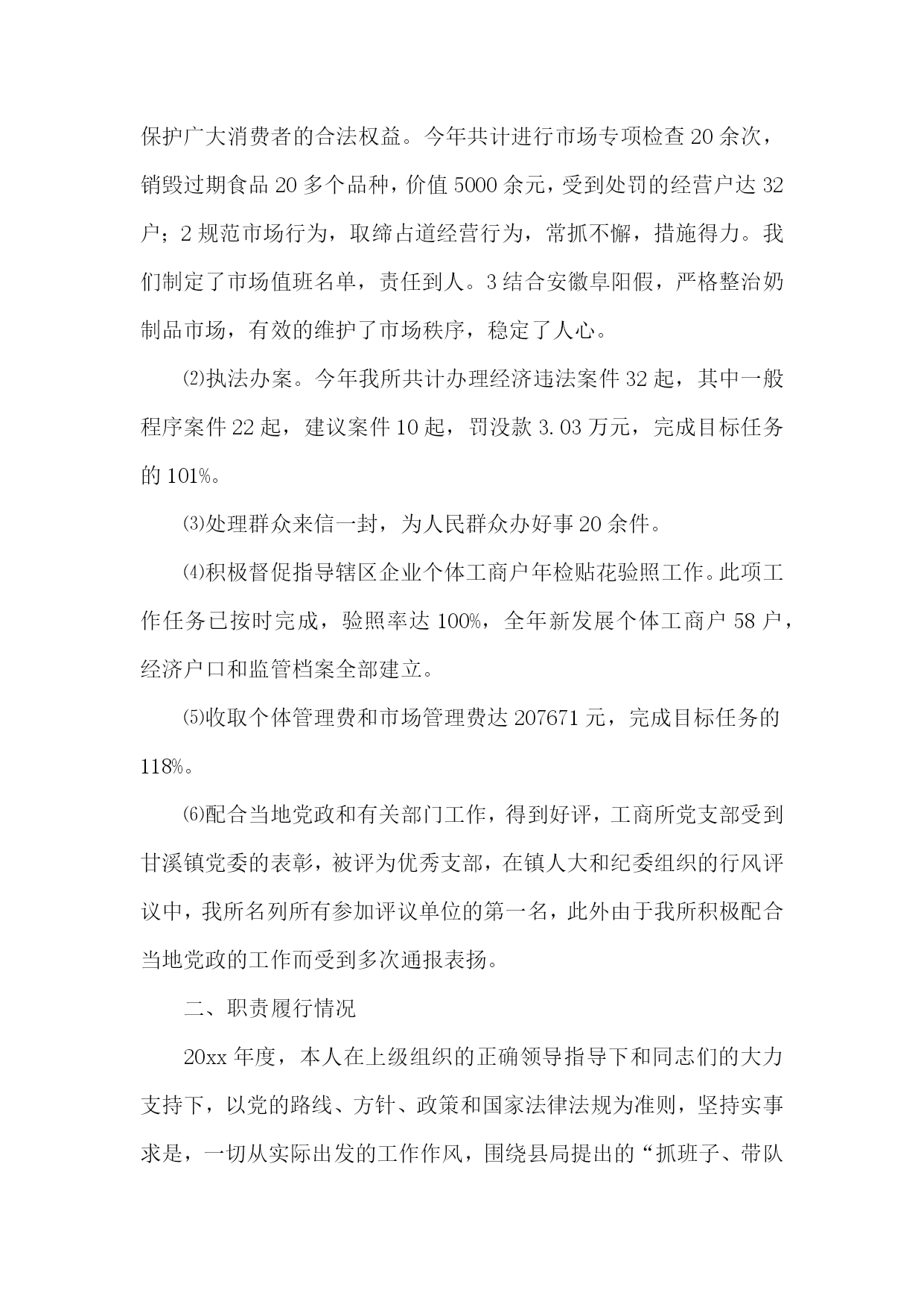 工商所所长述职报告工商所所长述职报告1工商机关作为市场监管和行政执法部门,肩负着促进经济发展、维护市场秩序的重任,不断创新市场监管理念,积极营造安全、和谐的消费环境、为促进社会的公平和正义,构建社会主义和谐社会做出应有努力,我所在市场监管中,始终坚持用科学发展观统领各项工作的全局,把促进科学发展作为履行市场监管职责的出发点和落脚点,把握“监管只是手段而不是目的”的原则,尽责尽职抓监管、尽心尽力促发展。首先是积极促进各类市场主体健康发展。发展多种形式的集体经济,支持非公制经济发展,大力支持外商投资企业健康发展,我所共注册个体工商户登记300多户,引导企业注册8户。农业丰则基础强、农民富则国家盛、农村稳则社会安、“三农”问题始终是全党工作的重中之重,是构建社会主义和谐社会的关键所在,我所在镇党委、政府和县工商局的领导下,以切实维护农民利益、促进农民增收为着力点,紧紧围绕爱农、护农、帮农行动,铲除坑农、损农、害农行为,以整顿规范市场经济秩序、营造公平竞争的市场环境为切入点,着力解决农民群众最关心、最直接、最现实的利益问题,扎实推进社会主义新农村建设,“红盾护农”行动取得阶段性成果。近几年,共开展“红盾护农”专项行动75次,出动执法人员200多人次;检查农资经营主体82户,查处农资经营案件30多件,罚款5000多元,案值10多万元。积极促进农村经济发展、紧紧抓住“三农”这个工作重心,推进社会主义新农村建设,加强商标注册宣传,引导农民通过注册农产品商标和地理标志。在本辖区内共引导商标注册2户。一是沿河土家族自治县天然富硒食品开发有限公司的“天赋”商标,二是沿河沙子空心李果园场的“沙子空心”商标,通过商标注册提升了企业知名度,带动了经济发展,实现农民增收,真正实现商标富农,政策支农、权益保农。积极支持发展农村经纪人,以促进农业生产和市场需求的衔接,推动农村经济结构调整,促进农民增收,积极开展合同帮农工作,扶持发展多种形式的订单农业,发挥农业龙头的带动作用,实现农业增效。农民增收,做好登记工作,依法赋予其市场主体合法,以促进农业生产市场化、产业化、规模化发展。积极支持做好就业和再就业工作。在市场准入政策支持、收费减免、提供服务和优化市场环境等方面采取措施,促进经济发展与扩大就业的良性互动,从落实国家优惠政策以来,我所共为下岗失业人员免除登记费2400元,免收个体工商业户管理费36000元,免费登记下岗人员120户。指导行业协会加强自律。以沙子商会为代表,充分发挥行业协会在构建和谐社会中的自律作用,以及政府联系群众的桥梁作用,指导协会努力构筑消费教育和咨询服务,引导教育经营者守法经营,引导消费者理性消费,共调解消费纠纷50余起,利用各种媒介引导消费者自觉抵制假冒伪劣商品,当自身权益受到损害时及时向消费者协会投诉,并及时向有关部门举报经营者的违法行为,充分发挥12315行政执法网络的申诉举报,案件查处,调解纠纷等功能,建立健全科学决策,确保市场监管快速反映提高效能。工商所所长述职报告2述职人,***,男,42岁,汉族,现任**县工商行政管理局**工商所所长。现将本人20xx年度履行职责情况给领导和同志们作以简要汇报,敬请批评指正。一、工作职责及工作目标任务完成情况作为工商所所长,《工商行政管理所条例》第五条明确规定:“工商所实行所长负责制。”即总负责,主持全面工作,领导和带领全所工作人员贯彻执行党的路线方针政策,以及国家的法律、法规,保证完成《工商行政管理所条例》第三条规定的基本任务和上级局年初下达的各项工作目标任务以及各个阶段的具体工作任务,还有当地党政安排的其他的工作任务。20xx年度的主要工作目标任务是领导和带领全所干部加强市场监管,依法行政,保证正常的市场经济秩序,促进地方经济健康发展,做好企业年检和个体工商户验照工作,保护合法经营,打击非法经济活动,维护消费者合法权益,同时收取规费17.5万元,罚没收入3万元,做好当地党政委托的其他工作。经过全所干部苦战一年现已超额完成各项目标任务。⑴市场监管。1坚持不懈的打击制售假冒伪劣商品的违法行为,保护广大消费者的合法权益。今年共计进行市场专项检查20余次,销毁过期食品20多个品种,价值5000余元,受到处罚的经营户达32户;2规范市场行为,取缔占道经营行为,常抓不懈,措施得力。我们制定了市场值班名单,责任到人。3结合安徽阜阳假,严格整治奶制品市场,有效的维护了市场秩序,稳定了人心。⑵执法办案。今年我所共计办理经济违法案件32起,其中一般程序案件22起,建议案件10起,罚没款3.03万元,完成目标任务的101%。⑶处理群众来信一封,为人民群众办好事20余件。⑷积极督促指导辖区企业个体工商户年检贴花验照工作。此项工作任务已按时完成,验照率达100%,全年新发展个体工商户58户,经济户口和监管档案