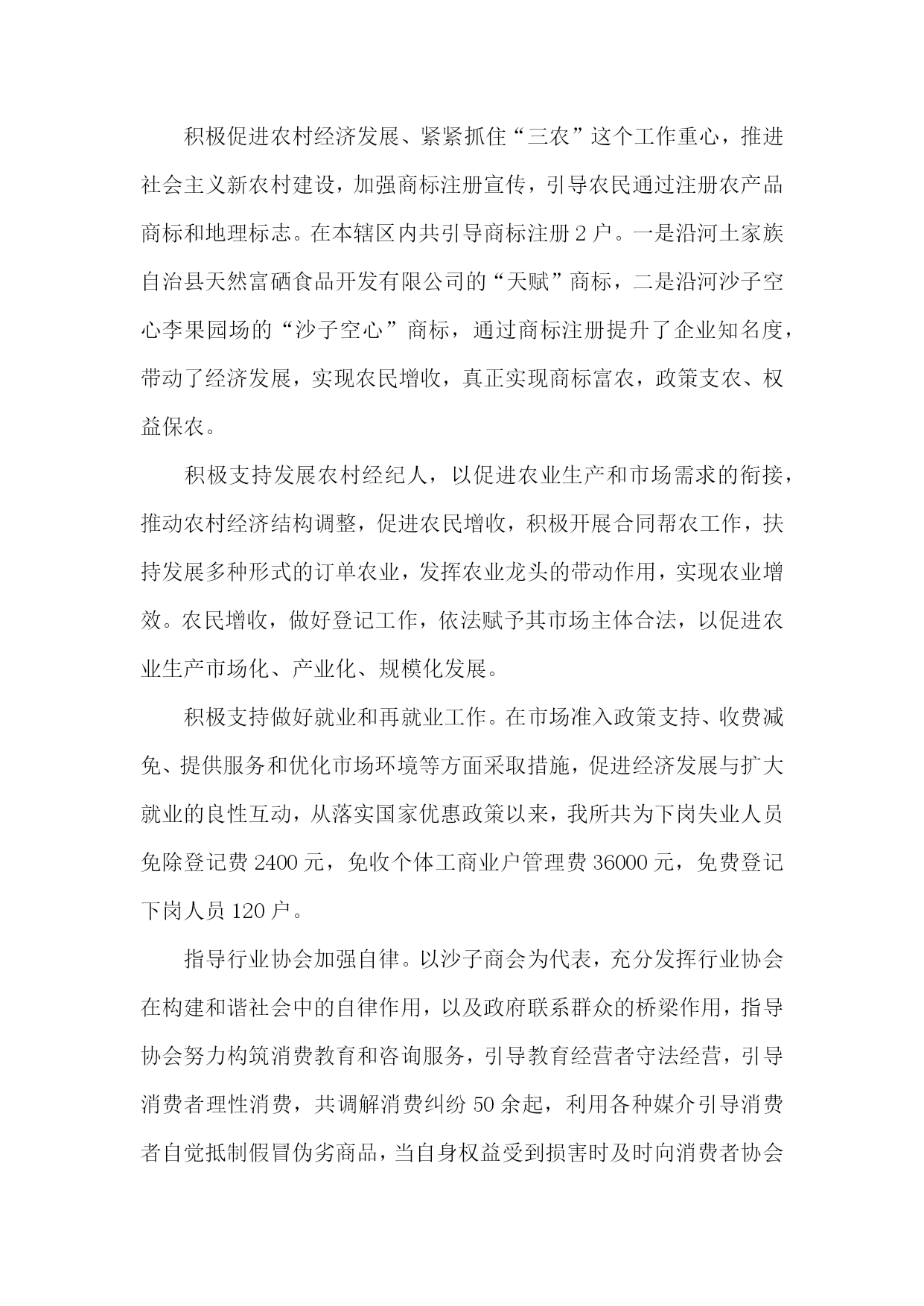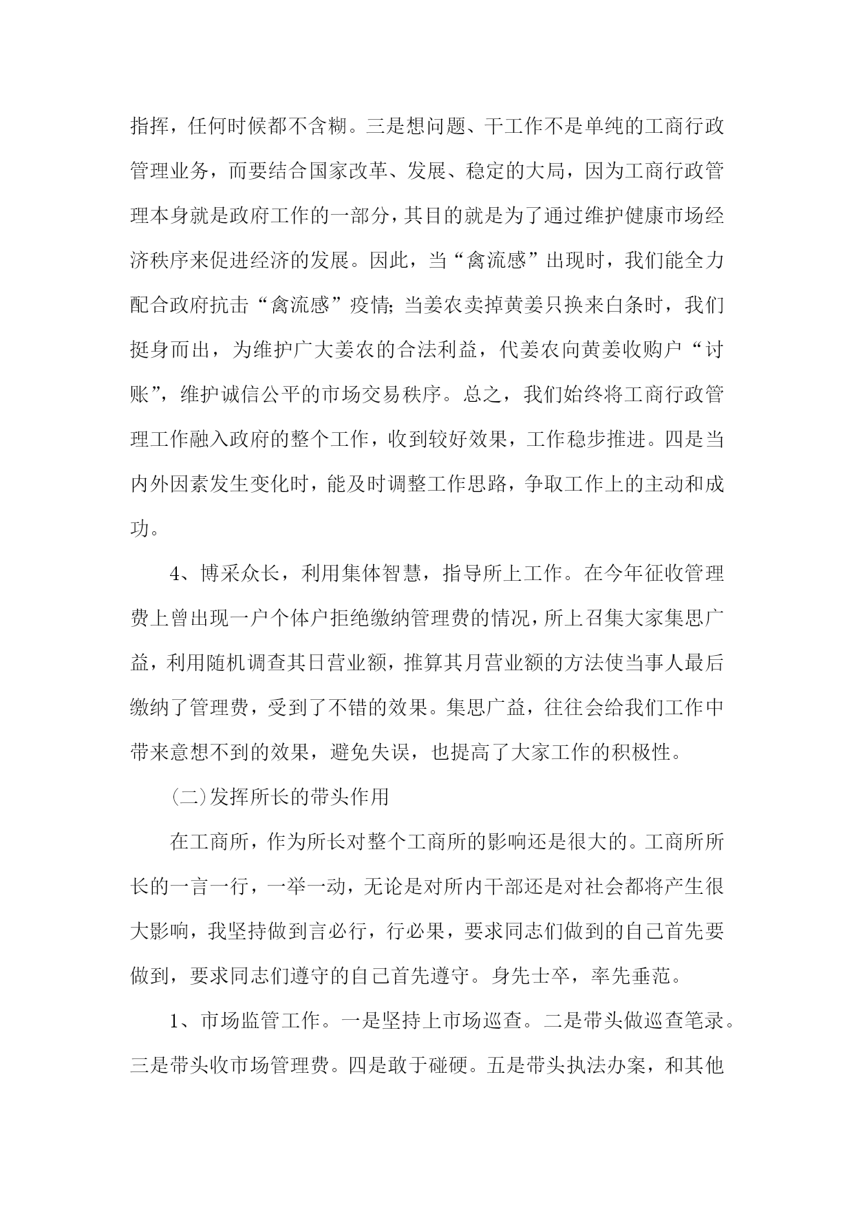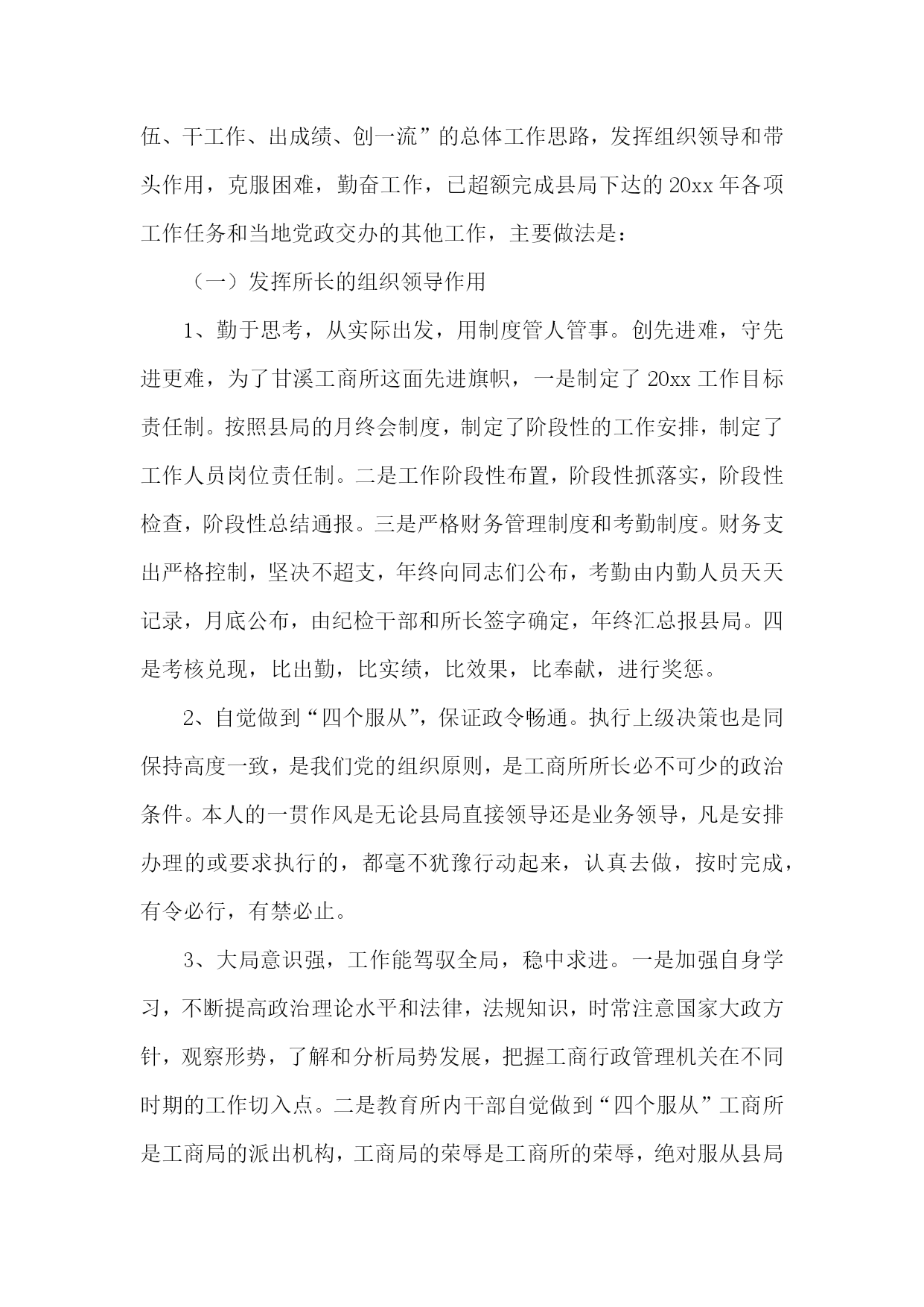 工商所所长述职报告工商所所长述职报告1工商机关作为市场监管和行政执法部门,肩负着促进经济发展、维护市场秩序的重任,不断创新市场监管理念,积极营造安全、和谐的消费环境、为促进社会的公平和正义,构建社会主义和谐社会做出应有努力,我所在市场监管中,始终坚持用科学发展观统领各项工作的全局,把促进科学发展作为履行市场监管职责的出发点和落脚点,把握“监管只是手段而不是目的”的原则,尽责尽职抓监管、尽心尽力促发展。首先是积极促进各类市场主体健康发展。发展多种形式的集体经济,支持非公制经济发展,大力支持外商投资企业健康发展,我所共注册个体工商户登记300多户,引导企业注册8户。农业丰则基础强、农民富则国家盛、农村稳则社会安、“三农”问题始终是全党工作的重中之重,是构建社会主义和谐社会的关键所在,我所在镇党委、政府和县工商局的领导下,以切实维护农民利益、促进农民增收为着力点,紧紧围绕爱农、护农、帮农行动,铲除坑农、损农、害农行为,以整顿规范市场经济秩序、营造公平竞争的市场环境为切入点,着力解决农民群众最关心、最直接、最现实的利益问题,扎实推进社会主义新农村建设,“红盾护农”行动取得阶段性成果。近几年,共开展“红盾护农”专项行动75次,出动执法人员200多人次;检查农资经营主体82户,查处农资经营案件30多件,罚款5000多元,案值10多万元。积极促进农村经济发展、紧紧抓住“三农”这个工作重心,推进社会主义新农村建设,加强商标注册宣传,引导农民通过注册农产品商标和地理标志。在本辖区内共引导商标注册2户。一是沿河土家族自治县天然富硒食品开发有限公司的“天赋”商标,二是沿河沙子空心李果园场的“沙子空心”商标,通过商标注册提升了企业知名度,带动了经济发展,实现农民增收,真正实现商标富农,政策支农、权益保农。积极支持发展农村经纪人,以促进农业生产和市场需求的衔接,推动农村经济结构调整,促进农民增收,积极开展合同帮农工作,扶持发展多种形式的订单农业,发挥农业龙头的带动作用,实现农业增效。农民增收,做好登记工作,依法赋予其市场主体合法,以促进农业生产市场化、产业化、规模化发展。积极支持做好就业和再就业工作。在市场准入政策支持、收费减免、提供服务和优化市场环境等方面采取措施,促进经济发展与扩大就业的良性互动,从落实国家优惠政策以来,我所共为下岗失业人员免除登记费2400元,免收个体工商业户管理费36000元,免费登记下岗人员120户。指导行业协会加强自律。以沙子商会为代表,充分发挥行业协会在构建和谐社会中的自律作用,以及政府联系群众的桥梁作用,指导协会努力构筑消费教育和咨询服务,引导教育经营者守法经营,引导消费者理性消费,共调解消费纠纷50余起,利用各种媒介引导消费者自觉抵制假冒伪劣商品,当自身权益受到损害时及时向消费者协会投诉,并及时向有关部门举报经营者的违法行为,充分发挥12315行政执法网络的申诉举报,案件查处,调解纠纷等功能,建立健全科学决策,确保市场监管快速反映提高效能。工商所所长述职报告2述职人,***,男,42岁,汉族,现任**县工商行政管理局**工商所所长。现将本人20xx年度履行职责情况给领导和同志们作以简要汇报,敬请批评指正。一、工作职责及工作目标任务完成情况作为工商所所长,《工商行政管理所条例》第五条明确规定:“工商所实行所长负责制。”即总负责,主持全面工作,领导和带领全所工作人员贯彻执行党的路线方针政策,以及国家的法律、法规,保证完成《工商行政管理所条例》第三条规定的基本任务和上级局年初下达的各项工作目标任务以及各个阶段的具体工作任务,还有当地党政安排的其他的工作任务。20xx年度的主要工作目标任务是领导和带领全所干部加强市场监管,依法行政,保证正常的市场经济秩序,促进地方经济健康发展,做好企业年检和个体工商户验照工作,保护合法经营,打击非法经济活动,维护消费者合法权益,同时收取规费17.5万元,罚没收入3万元,做好当地党政委托的其他工作。经过全所干部苦战一年现已超额完成各项目标任务。⑴市场监管。1坚持不懈的打击制售假冒伪劣商品的违法行为,保护广大消费者的合法权益。今年共计进行市场专项检查20余次,销毁过期食品20多个品种,价值5000余元,受到处罚的经营户达32户;2规范市场行为,取缔占道经营行为,常抓不懈,措施得力。我们制定了市场值班名单,责任到人。3结合安徽阜阳假,严格整治奶制品市场,有效的维护了市场秩序,稳定了人心。⑵执法办案。今年我所共计办理经济违法案件32起,其中一般程序案件22起,建议案件10起,罚没款3.03万元,完成目标任务的101%。⑶处理群众来信一封,为人民群众办好事20余件。⑷积极督促指导辖区企业个体工商户年检贴花验照工作。此项工作任务已按时完成,验照率达100%,全年新发展个体工商户58户,经济户口和监管档案
