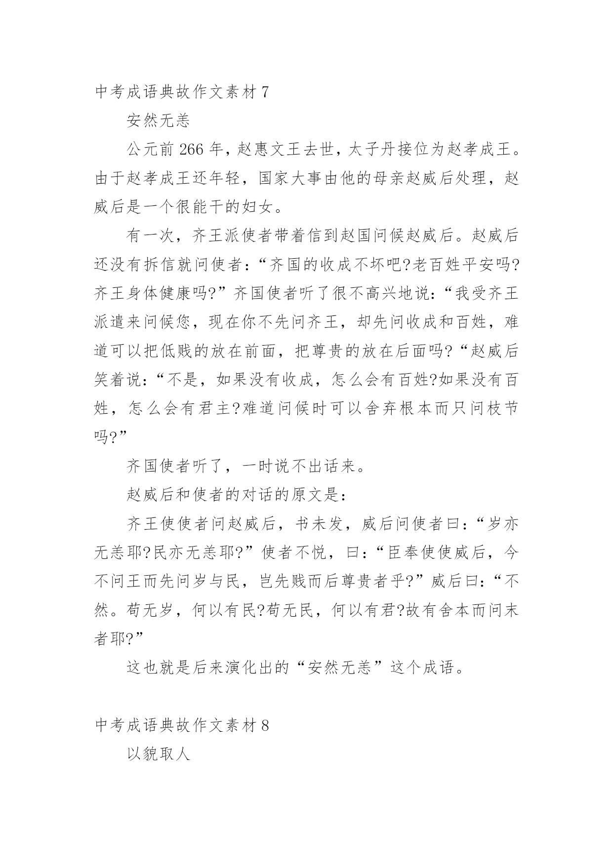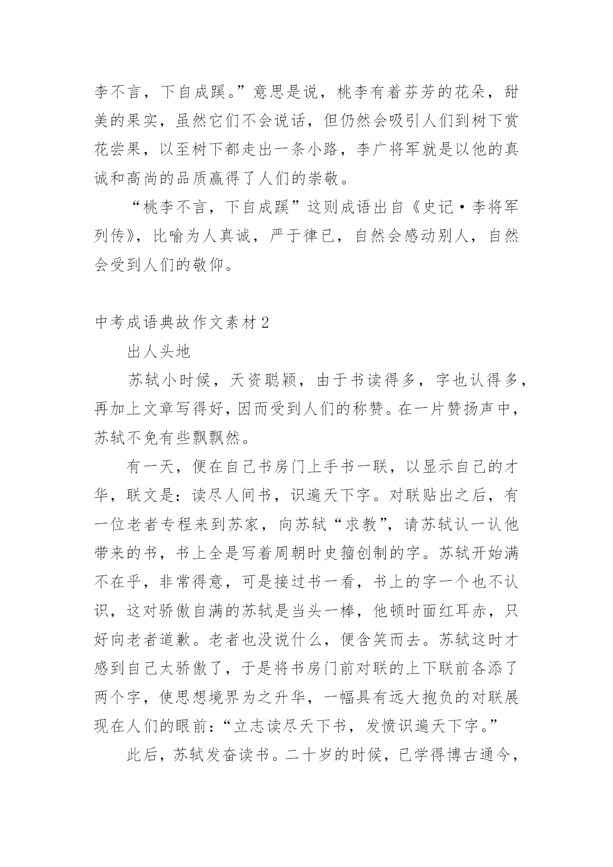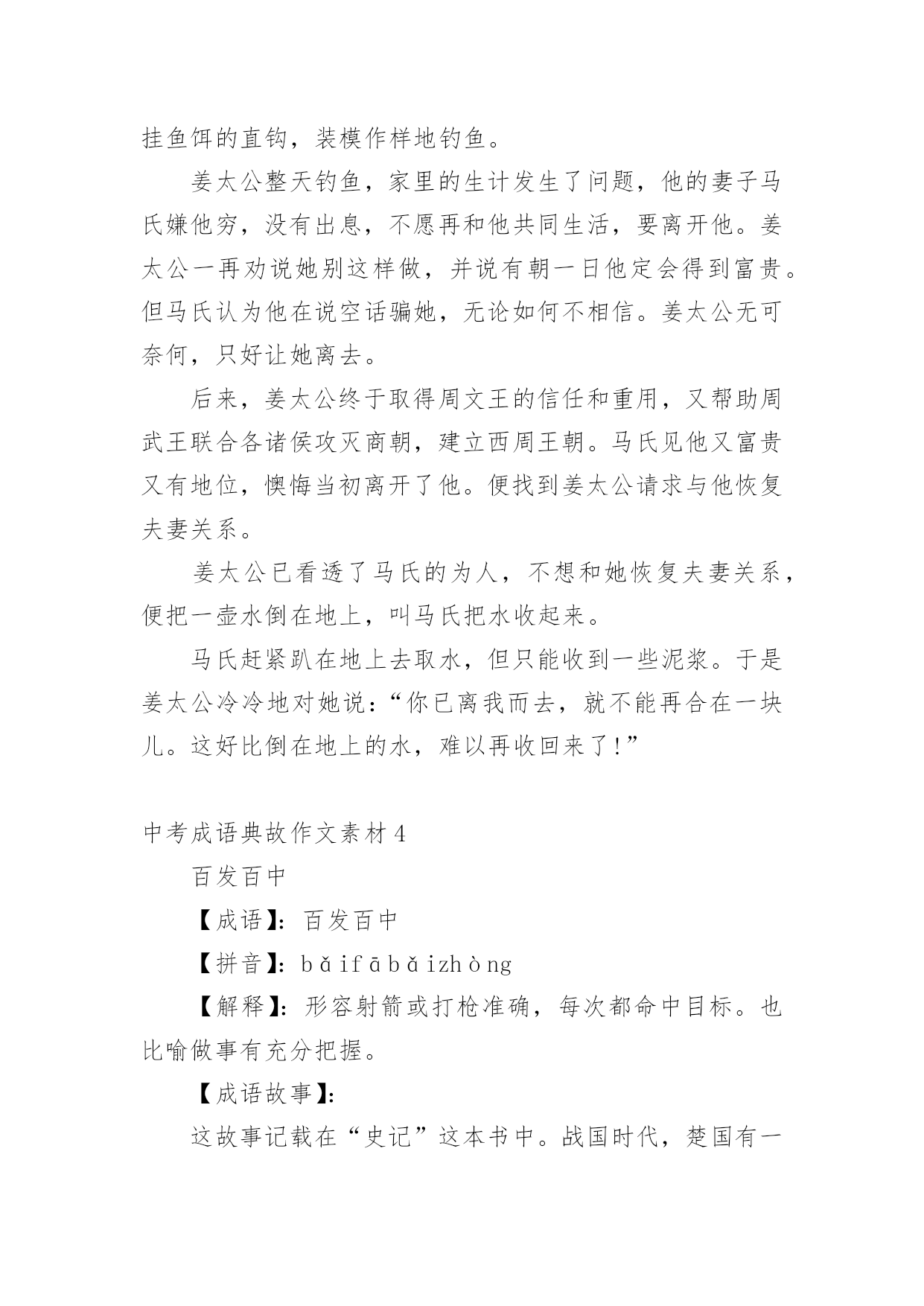 中考成语典故作文素材中考成语典故作文素材13篇在日复一日的学习、工作或生活中,大家都经常接触到作文吧,写作文是培养人们的观察力、联想力、想象力、思考力和记忆力的重要手段。你知道作文怎样才能写的好吗?下面是小编为大家整理的中考成语典故作文素材,供大家参考借鉴,希望可以帮助到有需要的朋友。中考成语典故作文素材1桃李不言,下自成蹊西汉时候,有一位勇猛善战的将军,名叫李广,一生跟匈奴打过七十多次仗,战功卓着,深受官兵和百姓的爱戴。李广虽然身居高位,统领千军万马,而且是保卫国家的功臣,但他一点也不居功自傲。他不仅待人和气,还能和士兵同甘共苦。每次朝廷给他的赏赐,他首先想到的是他的部下,就把那些赏赐统统分给官兵们;行军打仗时,遇到粮食或水供应不上的情况,他自己也同士兵们一样忍饥挨饿;打起仗来,他身先士卒,英勇顽强,只要他一声令下,大家个个奋勇杀敌,不握牺牲。这是一位多么让人崇敬的大将军啊!后来,当李广将军去世的噩耗传到军营时,全军将士无不痛哭流涕,连许多与大将军平时并不熟悉的百姓也纷纷悼念他。在人们心目中,李广将军就是他们崇拜的大英雄。汉朝伟大的史学家司马迁在为李广立传时称赞道:“桃李不言,下自成蹊。”意思是说,桃李有着芬芳的花朵,甜美的果实,虽然它们不会说话,但仍然会吸引人们到树下赏花尝果,以至树下都走出一条小路,李广将军就是以他的真诚和高尚的品质赢得了人们的崇敬。“桃李不言,下自成蹊”这则成语出自《史记·李将军列传》,比喻为人真诚,严于律已,自然会感动别人,自然会受到人们的敬仰。中考成语典故作文素材2出人头地苏轼小时候,天资聪颖,由于书读得多,字也认得多,再加上文章写得好,因而受到人们的称赞。在一片赞扬声中,苏轼不免有些飘飘然。有一天,便在自己书房门上手书一联,以显示自己的才华,联文是:读尽人间书,识遍天下字。对联贴出之后,有一位老者专程来到苏家,向苏轼“求教”,请苏轼认一认他带来的书,书上全是写着周朝时史籀创制的字。苏轼开始满不在乎,非常得意,可是接过书一看,书上的字一个也不认识,这对骄傲自满的苏轼是当头一棒,他顿时面红耳赤,只好向老者道歉。老者也没说什么,便含笑而去。苏轼这时才感到自己太骄傲了,于是将书房门前对联的上下联前各添了两个字,使思想境界为之升华,一幅具有远大抱负的对联展现在人们的眼前:“立志读尽天下书,发愤识遍天下字。”此后,苏轼发奋读书。二十岁的时候,已学得博古通今,便和弟弟苏辙一起参加了京城的考试。当年的主考官是翰林学士欧阳修。欧阳修对当时文坛崇尚诡怪奇涩的文风很是反感,一律不加录取。当他看到一篇《刑赏忠厚论》时,十分高兴,便准备取为第一。由于试卷是密封的,欧阳修并不知道那文章是谁写的。他想了想,觉得能写出这样的文章的人,除了他的弟子曾巩之外,可能不会有别人了。为了避嫌,欧阳修就把苏轼的卷子判为第二。等到发榜公布的时候,欧阳修才知道写那篇好文章的人不是曾巩,而是个叫苏轼的年轻人,心里便有些过意不去。中考成语典故作文素材3覆水难收“覆水难收”这则成语的意思是泼出去的水,无法收回。表示事已定局,不可挽回。这个成语来源于宋。王桃《野客丛书》,太公取一壶水倾于地,令妻收入。乃语之曰:“若言离更合,覆水定难收。”商朝末年,有个足智多谋的人物,姓姜名尚,字子牙,人称姜太公。因先祖封于吕,又名吕尚。他辅佐周文王、周武王攻灭商朝,建立周朝,立了大功。后来封在齐,是春秋时齐国的始祖。姜太公曾在商朝当过官,因为不满纣王的残暴统治,弃官而走,隐居在陕西渭水河边一个比较偏僻的地方。为了取得周族的领袖姬昌(即周文王)的重用,他经常在小河边用不挂鱼饵的直钩,装模作样地钓鱼。姜太公整天钓鱼,家里的生计发生了问题,他的妻子马氏嫌他穷,没有出息,不愿再和他共同生活,要离开他。姜太公一再劝说她别这样做,并说有朝一日他定会得到富贵。但马氏认为他在说空话骗她,无论如何不相信。姜太公无可奈何,只好让她离去。后来,姜太公终于取得周文王的信任和重用,又帮助周武王联合各诸侯攻灭商朝,建立西周王朝。马氏见他又富贵又有地位,懊悔当初离开了他。便找到姜太公请求与他恢复夫妻关系。姜太公已看透了马氏的为人,不想和她恢复夫妻关系,便把一壶水倒在地上,叫马氏把水收起来。马氏赶紧趴在地上去取水,但只能收到一些泥浆。于是姜太公冷冷地对她说:“你已离我而去,就不能再合在一块儿。这好比倒在地上的水,难以再收回来了!”中考成语典故作文素材4百发百中【成语】:百发百中【拼音】:bǎifābǎizhòng【解释】:形容射箭或打枪准确,每次都命中目标。也比喻做事有充分把握。【成语故事】:这故事记载在“史记”这本书中。战国时代,楚国有一个对射箭很精明的人,叫做养由基。养由基小就精通射箭,能够在一百步远的距离,命中那些只有三、四公分宽度的.柳叶,同时,只要旁人指明想射中哪一片柳叶,他都能够很快