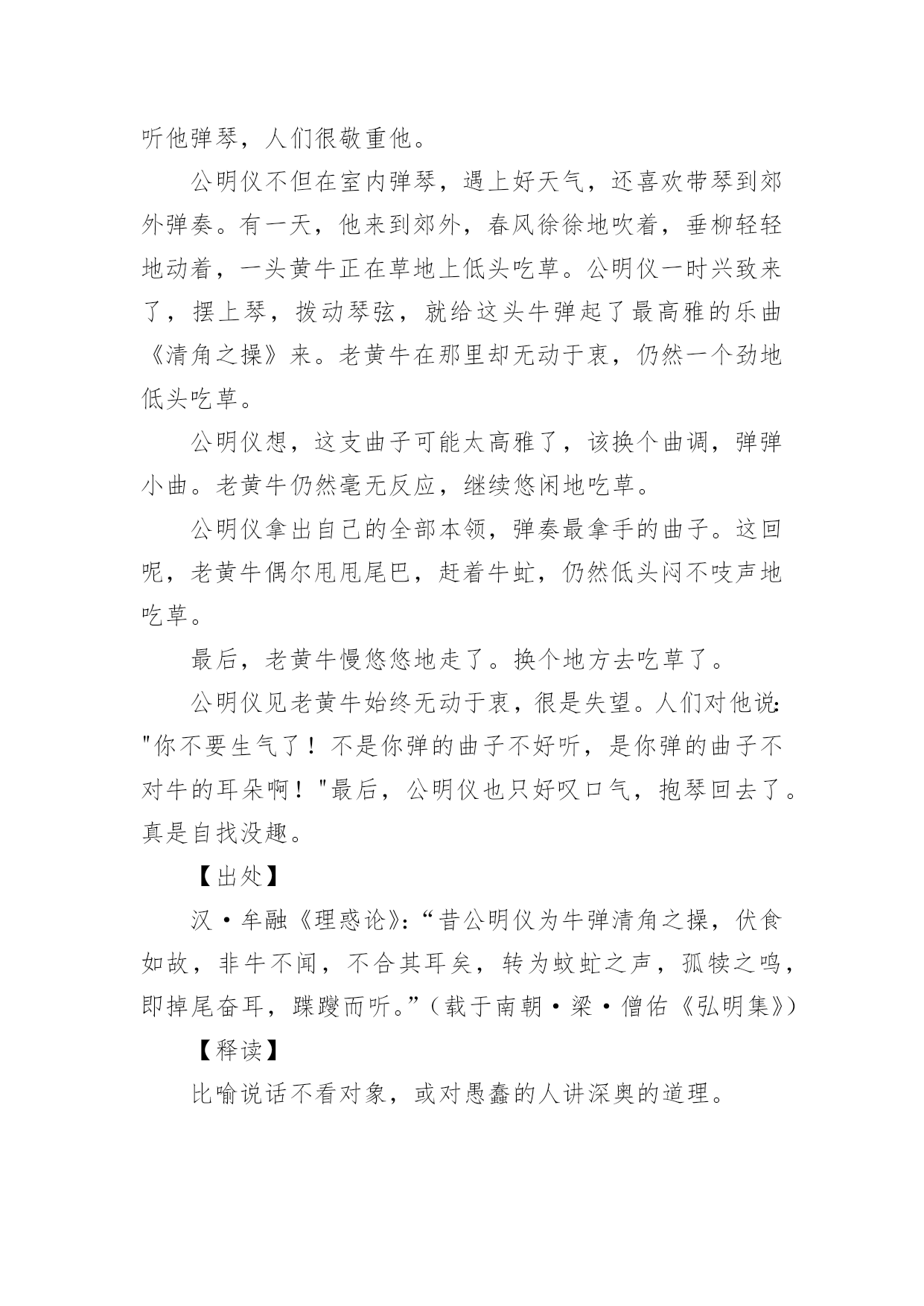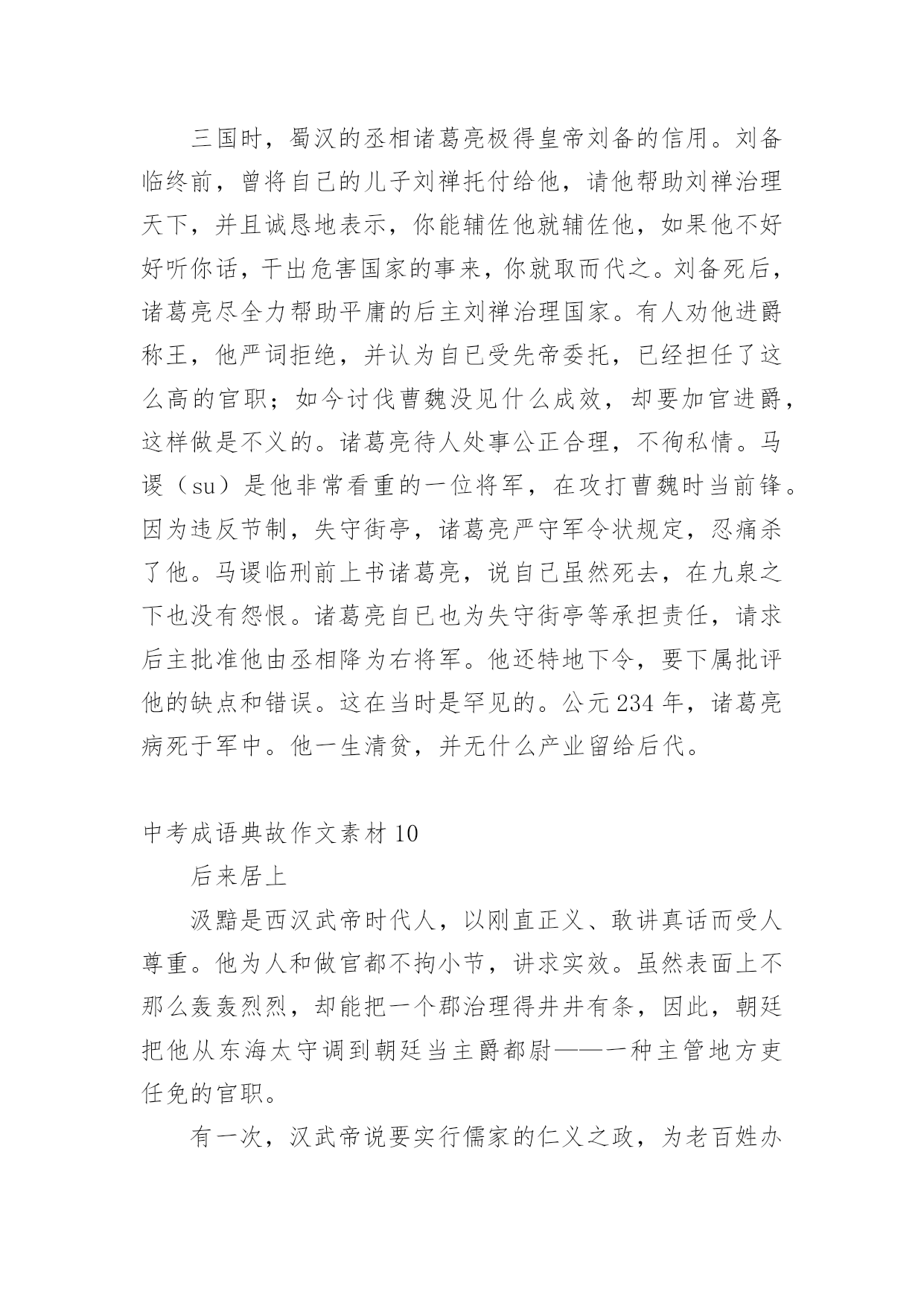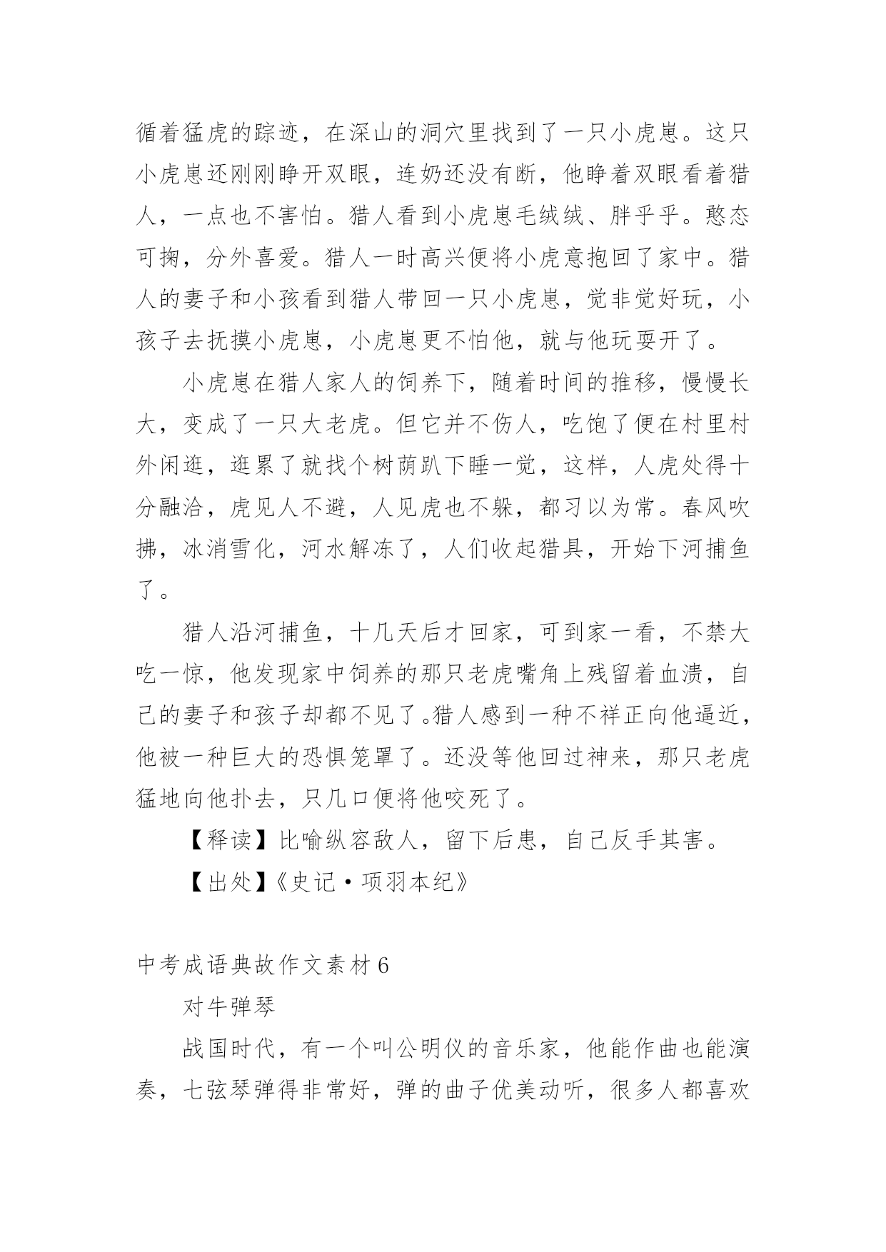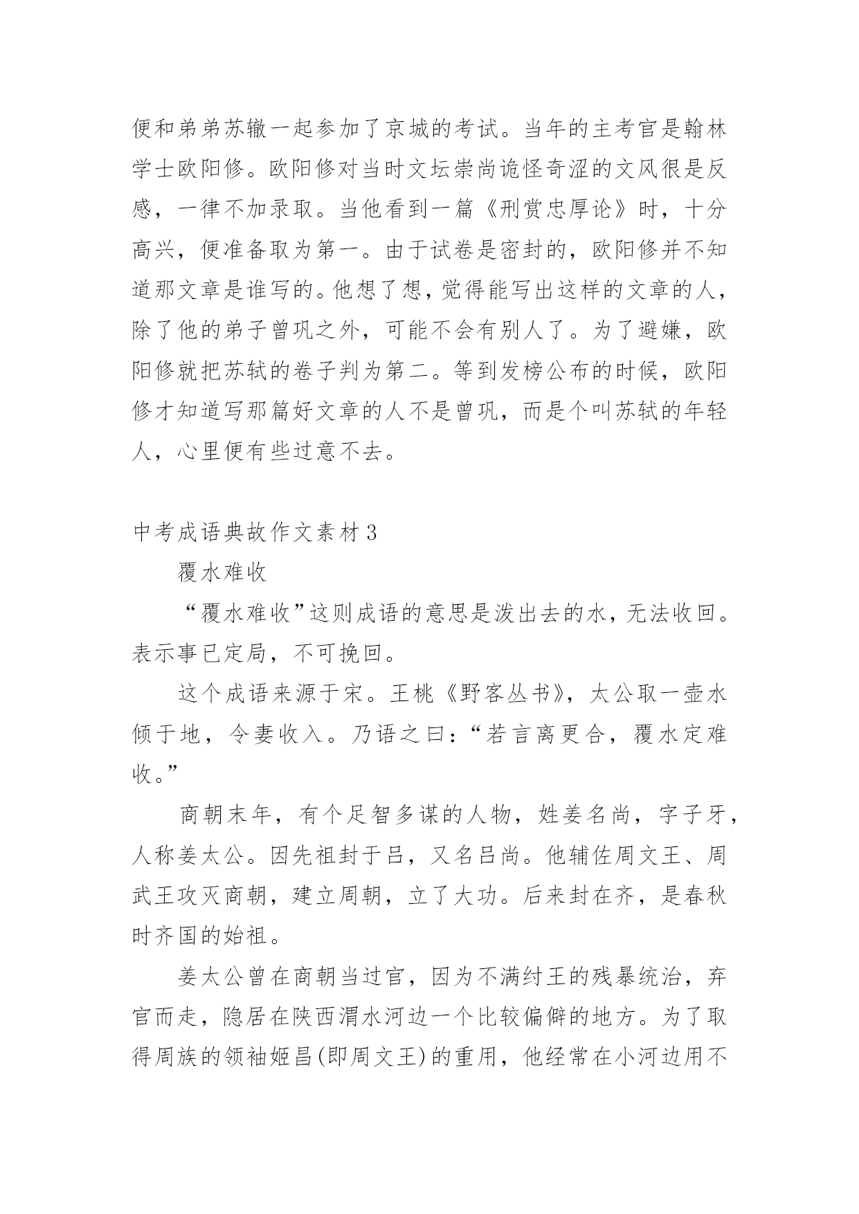 中考成语典故作文素材中考成语典故作文素材13篇在日复一日的学习、工作或生活中,大家都经常接触到作文吧,写作文是培养人们的观察力、联想力、想象力、思考力和记忆力的重要手段。你知道作文怎样才能写的好吗?下面是小编为大家整理的中考成语典故作文素材,供大家参考借鉴,希望可以帮助到有需要的朋友。中考成语典故作文素材1桃李不言,下自成蹊西汉时候,有一位勇猛善战的将军,名叫李广,一生跟匈奴打过七十多次仗,战功卓着,深受官兵和百姓的爱戴。李广虽然身居高位,统领千军万马,而且是保卫国家的功臣,但他一点也不居功自傲。他不仅待人和气,还能和士兵同甘共苦。每次朝廷给他的赏赐,他首先想到的是他的部下,就把那些赏赐统统分给官兵们;行军打仗时,遇到粮食或水供应不上的情况,他自己也同士兵们一样忍饥挨饿;打起仗来,他身先士卒,英勇顽强,只要他一声令下,大家个个奋勇杀敌,不握牺牲。这是一位多么让人崇敬的大将军啊!后来,当李广将军去世的噩耗传到军营时,全军将士无不痛哭流涕,连许多与大将军平时并不熟悉的百姓也纷纷悼念他。在人们心目中,李广将军就是他们崇拜的大英雄。汉朝伟大的史学家司马迁在为李广立传时称赞道:“桃李不言,下自成蹊。”意思是说,桃李有着芬芳的花朵,甜美的果实,虽然它们不会说话,但仍然会吸引人们到树下赏花尝果,以至树下都走出一条小路,李广将军就是以他的真诚和高尚的品质赢得了人们的崇敬。“桃李不言,下自成蹊”这则成语出自《史记·李将军列传》,比喻为人真诚,严于律已,自然会感动别人,自然会受到人们的敬仰。中考成语典故作文素材2出人头地苏轼小时候,天资聪颖,由于书读得多,字也认得多,再加上文章写得好,因而受到人们的称赞。在一片赞扬声中,苏轼不免有些飘飘然。有一天,便在自己书房门上手书一联,以显示自己的才华,联文是:读尽人间书,识遍天下字。对联贴出之后,有一位老者专程来到苏家,向苏轼“求教”,请苏轼认一认他带来的书,书上全是写着周朝时史籀创制的字。苏轼开始满不在乎,非常得意,可是接过书一看,书上的字一个也不认识,这对骄傲自满的苏轼是当头一棒,他顿时面红耳赤,只好向老者道歉。老者也没说什么,便含笑而去。苏轼这时才感到自己太骄傲了,于是将书房门前对联的上下联前各添了两个字,使思想境界为之升华,一幅具有远大抱负的对联展现在人们的眼前:“立志读尽天下书,发愤识遍天下字。”此后,苏轼发奋读书。二十岁的时候,已学得博古通今,便和弟弟苏辙一起参加了京城的考试。当年的主考官是翰林学士欧阳修。欧阳修对当时文坛崇尚诡怪奇涩的文风很是反感,一律不加录取。当他看到一篇《刑赏忠厚论》时,十分高兴,便准备取为第一。由于试卷是密封的,欧阳修并不知道那文章是谁写的。他想了想,觉得能写出这样的文章的人,除了他的弟子曾巩之外,可能不会有别人了。为了避嫌,欧阳修就把苏轼的卷子判为第二。等到发榜公布的时候,欧阳修才知道写那篇好文章的人不是曾巩,而是个叫苏轼的年轻人,心里便有些过意不去。中考成语典故作文素材3覆水难收“覆水难收”这则成语的意思是泼出去的水,无法收回。表示事已定局,不可挽回。这个成语来源于宋。王桃《野客丛书》,太公取一壶水倾于地,令妻收入。乃语之曰:“若言离更合,覆水定难收。”商朝末年,有个足智多谋的人物,姓姜名尚,字子牙,人称姜太公。因先祖封于吕,又名吕尚。他辅佐周文王、周武王攻灭商朝,建立周朝,立了大功。后来封在齐,是春秋时齐国的始祖。姜太公曾在商朝当过官,因为不满纣王的残暴统治,弃官而走,隐居在陕西渭水河边一个比较偏僻的地方。为了取得周族的领袖姬昌(即周文王)的重用,他经常在小河边用不挂鱼饵的直钩,装模作样地钓鱼。姜太公整天钓鱼,家里的生计发生了问题,他的妻子马氏嫌他穷,没有出息,不愿再和他共同生活,要离开他。姜太公一再劝说她别这样做,并说有朝一日他定会得到富贵。但马氏认为他在说空话骗她,无论如何不相信。姜太公无可奈何,只好让她离去。后来,姜太公终于取得周文王的信任和重用,又帮助周武王联合各诸侯攻灭商朝,建立西周王朝。马氏见他又富贵又有地位,懊悔当初离开了他。便找到姜太公请求与他恢复夫妻关系。姜太公已看透了马氏的为人,不想和她恢复夫妻关系,便把一壶水倒在地上,叫马氏把水收起来。马氏赶紧趴在地上去取水,但只能收到一些泥浆。于是姜太公冷冷地对她说:“你已离我而去,就不能再合在一块儿。这好比倒在地上的水,难以再收回来了!”中考成语典故作文素材4百发百中【成语】:百发百中【拼音】:bǎifābǎizhòng【解释】:形容射箭或打枪准确,每次都命中目标。也比喻做事有充分把握。【成语故事】:这故事记载在“史记”这本书中。战国时代,楚国有一个对射箭很精明的人,叫做养由基。养由基小就精通射箭,能够在一百步远的距离,命中那些只有三、四公分宽度的.柳叶,同时,只要旁人指明想射中哪一片柳叶,他都能够很快