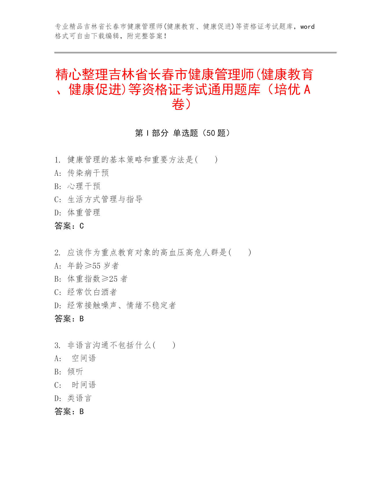 精心整理吉林省长春市健康管理师(健康教育、健康促进)等资格证考试通用题库(培优A卷).docx