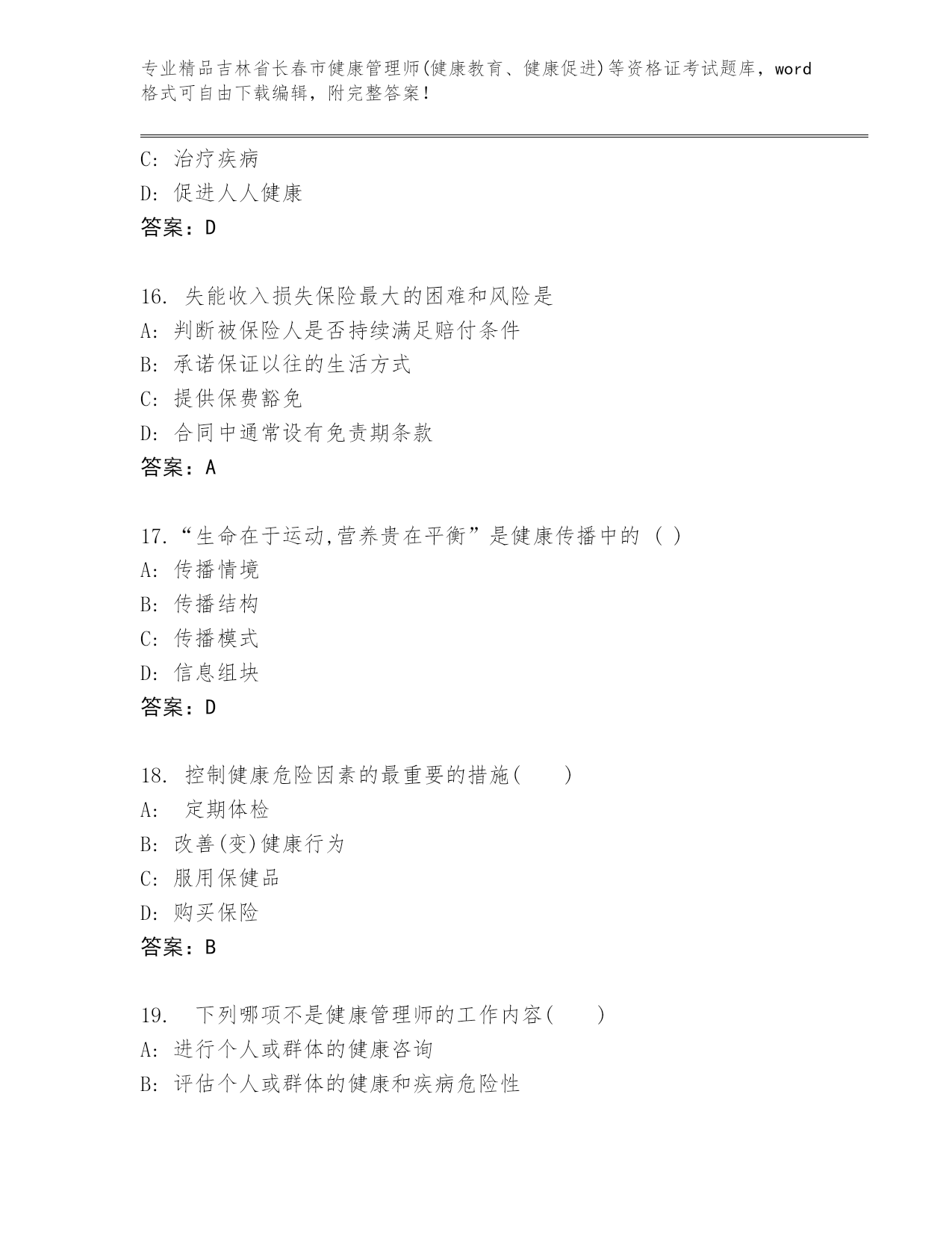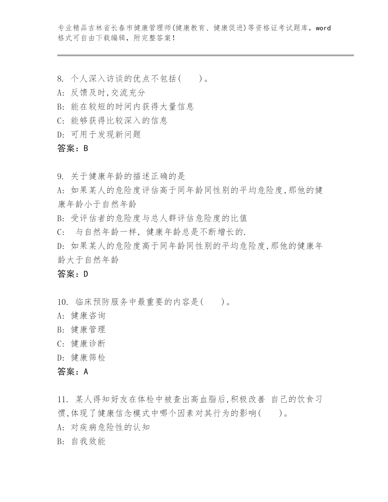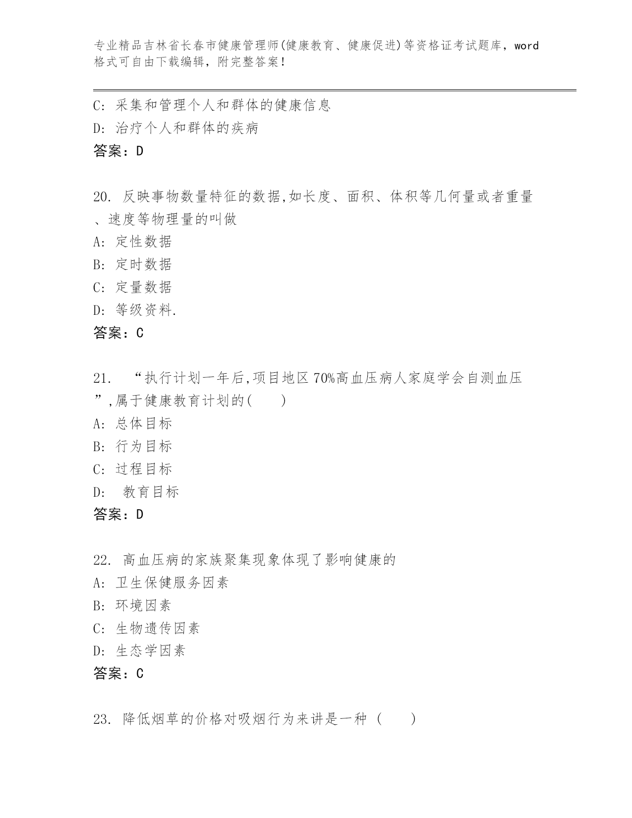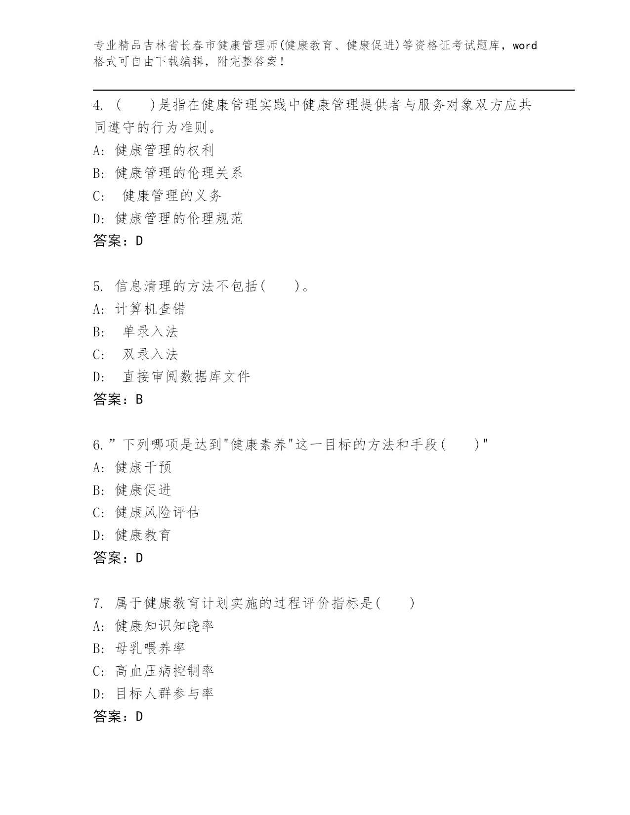 精心整理吉林省长春市健康管理师(健康教育、健康促进)等资格证考试通用题库(培优A卷)