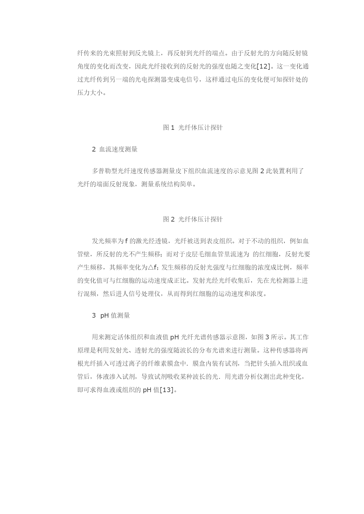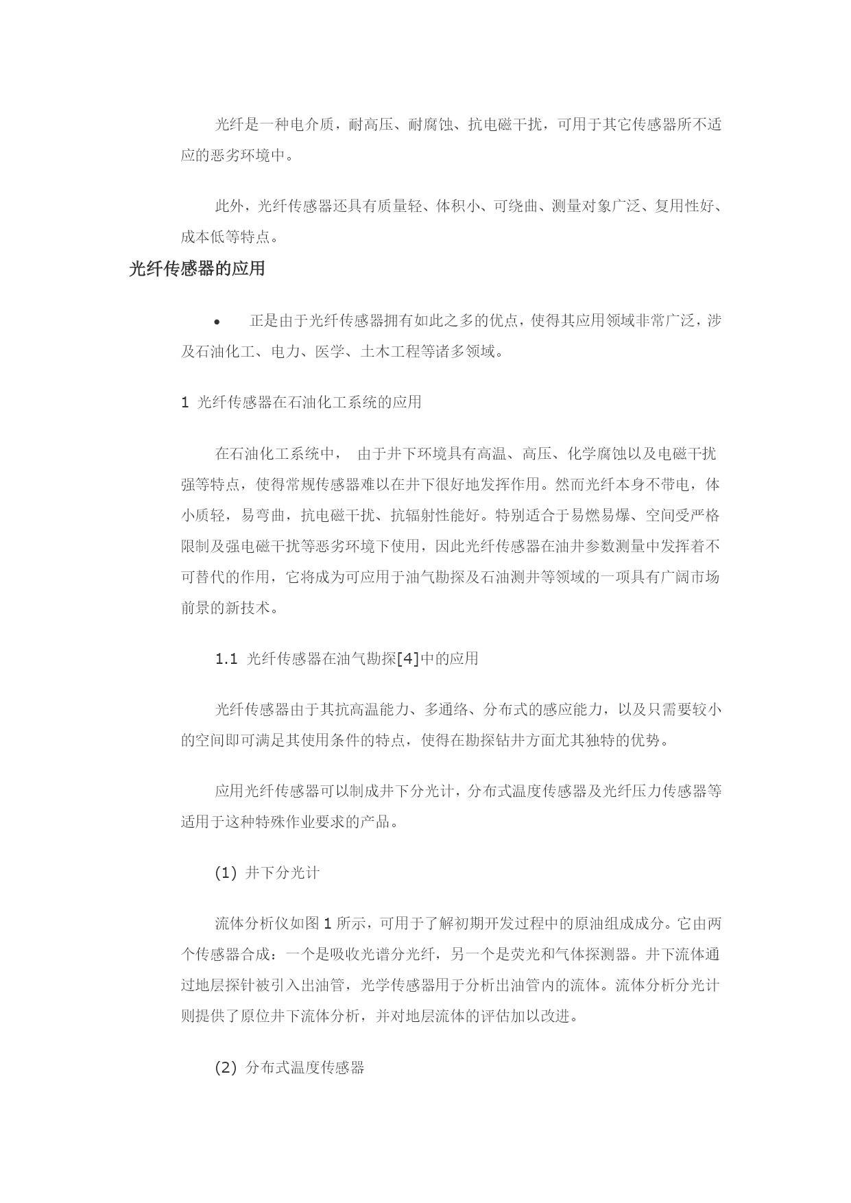 光纤传感器近年来,传感器在朝着灵敏、精确、适应性强、小巧和智能化的方向发展。在这一过程中,光纤传感器这个传感器家族的新成员倍受青睐。光纤具有很多优异的性能,例如:抗电磁干扰和原子辐射的性能,径细、质软、重量轻的机械性能;绝缘、无感应的电气性能;耐水、耐高温、耐腐蚀的化学性能等,它能够在人达不到的地方(如高温区),或者对人有害的地区(如核辐射区),起到人的耳目的作用,而且还能超越人的生理界限,接收人的感官所感受不到的外界信息。光纤传感器基本构成及原理光纤传感器由光源、入射光纤、出射光纤、光调制器、光探测器以及解调制器组成。其基本原理是将光源的光经入射光纤送人调制区,光在调制区内与外界被测参数相互作用,使光的光学性质(如强度、波长、频率、相位、偏正态等)发生变化而成为被调制的信号光,再经出射光纤送入光探测器、解调器而获得被测参数。光纤传感器按传感原理可分为两类:一类是传光型(非功能型)传感器[2],另一类是传感型(功能型)传感器[3]。在传光型光纤传感器中,光纤仅作为光的传输媒质,对被测信号的感觉是靠其它敏感元件来完成的,这种传感器中出射光纤和入射光纤是不连续的,两者之间的调制器是光谱变化的敏感元件或其它性质的敏感元件。在传感型光纤传感器中光纤兼有对被测信号的敏感及光信号的传输作用,将信号的“感”和“传”合而为一,因此这类传感器中光纤是连续的。由于这两种传感器中光纤所起的作用不同,对光纤的要求也不同。在传光型传感器中光纤只起传光的作用,采用通信光纤甚至普通的多模光纤就能满足要求,而敏感元件可以很灵活地选用优质的材料来实现,因此这类传感器的灵敏度可以做得很高,但需要较多的光耦合器件,结构较复杂;传感型光纤传感器的结构相对来说比较简单,可少用一些耦合器件,但对光纤的要求较高,往往需采用对被测信号敏感、传输特性又好的特殊光纤。到目前为止,实际中大多数采用前者,但随着光纤制造工艺的改进,传感型光纤传感器也必将得到广泛的应用。按光在光纤中被调制的原理不同,光纤传感器可分为:强度调制型、相位调制型、偏振态调制型、频率调制型、波长调制型等。迄令为止,光纤传感器能够测定的物理量已达七十多种。光纤传感器特点与传统的传感器相比,光纤传感器具有独特的优点:(1)灵敏度高由于光是一种波长极短的电磁波,通过光的相位便得到其光学长度。以光纤干涉仪为例,由于所使用的光纤直径很小,受到微小的机械外力的作用或温度变化时其光学长度要发生变化,从而引起较大的相位变化。假设用10米的光纤,l℃的变化引起1000ard的相位变化,若能够检测出的最小相位变化为0.01ard,那么所能测出的最小温度变化为l0℃,可见其灵敏度之高。(2)抗电磁干扰、电绝缘、耐腐蚀、本质安全由于光纤传感器是利用光波传输信息,而光纤又是电绝缘、耐腐蚀的传输媒质,并且安全可靠,这使它可以方便有效地用于各种大型机电、石油化工、矿井等强电磁干扰和易燃易爆等恶劣环境中。(3)测量速度快光的传播速度最快且能传送二维信息,因此可用于高速测量。对雷达等信号的分析要求具有极高的检测速率,应用电子学的方法难以实现,利用光的衍射现象的高速频谱分析便可解决。(4)信息容量大被测信号以光波为载体,而光的频率极高,所容纳的频带很宽,同一根光纤可以传输多路信号。(5)适用于恶劣环境光纤是一种电介质,耐高压、耐腐蚀、抗电磁干扰,可用于其它传感器所不适应的恶劣环境中。此外,光纤传感器还具有质量轻、体积小、可绕曲、测量对象广泛、复用性好、成本低等特点。光纤传感器的应用正是由于光纤传感器拥有如此之多的优点,使得其应用领域非常广泛,涉及石油化工、电力、医学、土木工程等诸多领域。1光纤传感器在石油化工系统的应用在石油化工系统中,由于井下环境具有高温、高压、化学腐蚀以及电磁干扰强等特点,使得常规传感器难以在井下很好地发挥作用。然而光纤本身不带电,体小质轻,易弯曲,抗电磁干扰、抗辐射性能好。特别适合于易燃易爆、空间受严格限制及强电磁干扰等恶劣环境下使用,因此光纤传感器在油井参数测量中发挥着不可替代的作用,它将成为可应用于油气勘探及石油测井等领域的一项具有广阔市场前景的新技术。1.1光纤传感器在油气勘探[4]中的应用光纤传感器由于其抗高温能力、多通络、分布式的感应能力,以及只需要较小的空间即可满足其使用条件的特点,使得在勘探钻井方面尤其独特的优势。应用光纤传感器可以制成井下分光计,分布式温度传感器及光纤压力传感器等适用于这种特殊作业要求的产品。(1)井下分光计流体分析仪如图1所示,可用于了解初期开发过程中的原油组成成分。它由两个传感器合成:一个是吸收光谱分光纤,另一个是荧光和气体探测器。井下流体通过地层探针被引入出油管,光学传感器用于分析出油管内的流体。流体分析分光计则提供了原位井下