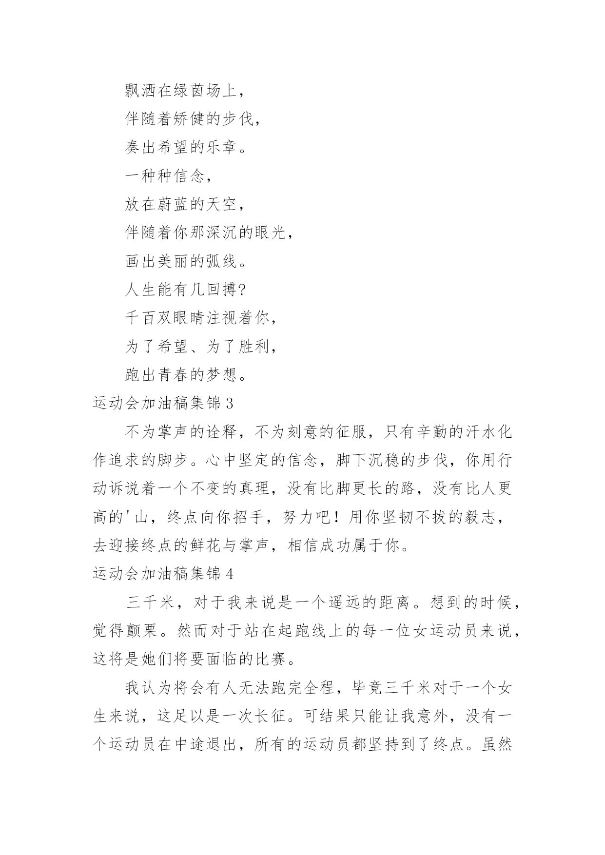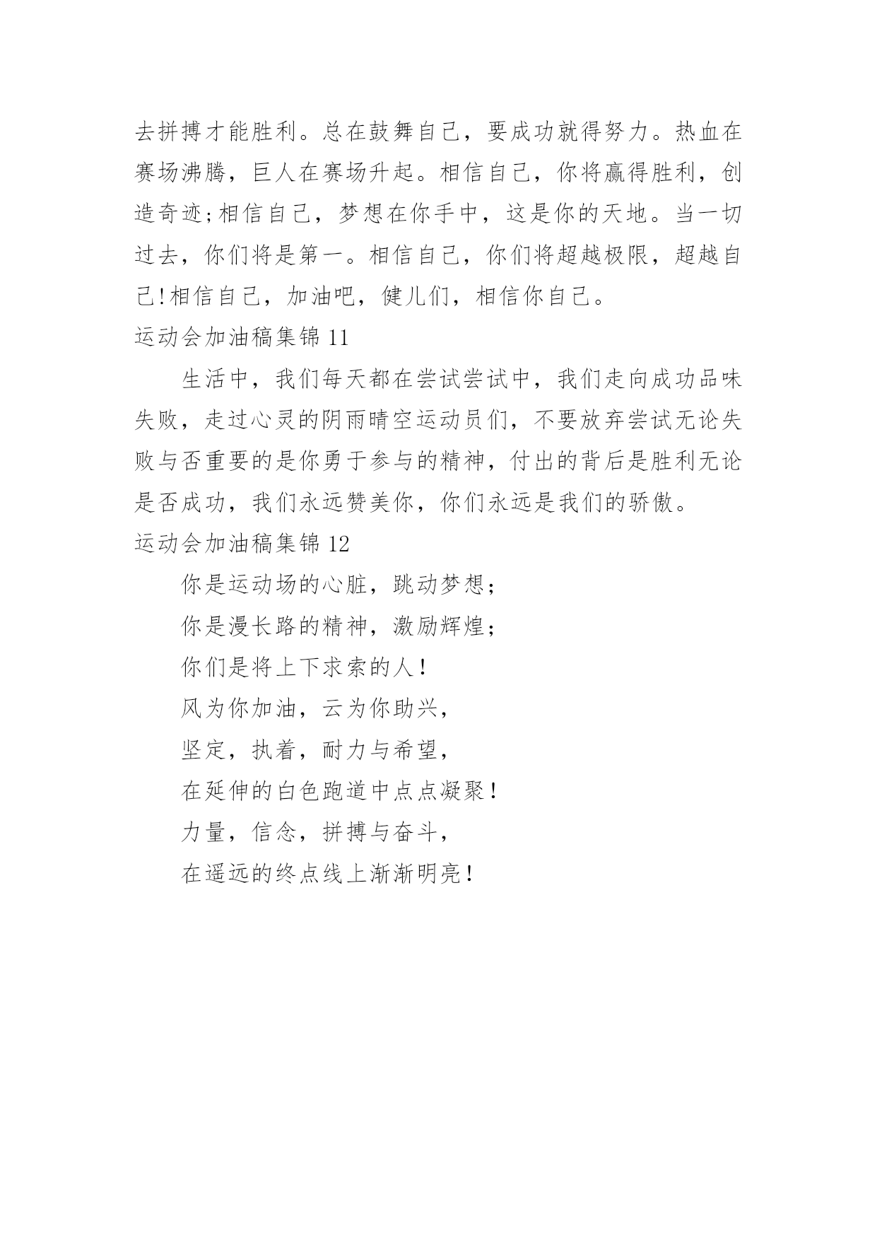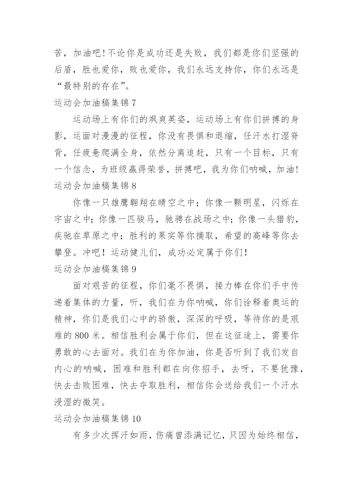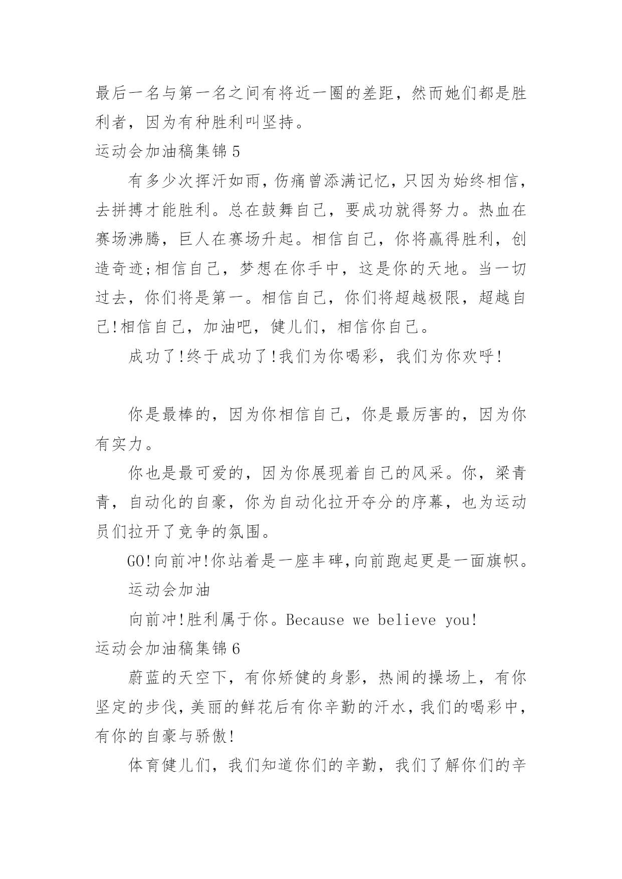 运动会加油稿运动会加油稿集锦在快速变化和不断变革的今天,我们很多时候都不得不用到加油稿,借助加油稿可以活跃气氛,催人奋进。你所见过的加油稿是什么样的呢?以下是小编为大家整理的运动会加油稿集锦,欢迎大家分享。运动会加油稿集锦1犹记得你们每日清晨迎着微弱的晨光早起,急急赶赴田径场训练的身影,带着些许的疲惫,但更多的是坚持不懈的韧劲。尽管你们抱怨过训练的艰辛与疲劳,但是你们却未曾言语过放弃!健儿们,今日便是吹响战斗号角,奋勇拼搏的时刻。请用雄鹰搏击长空的傲然雄姿,展示属于金融的运动风采!请尽情挥洒你们的激情,燃烧你们的斗志,不求争取桂冠,但求展现出王牌金融的独特魅力!健儿们,奋力拼搏吧,金融的兄弟姐妹们将为你们挥动手的海洋,用尽全力呐喊出每一声加油与喝彩!我们将以你们为傲,将为你们欢呼!加油,健儿!运动会加油稿集锦2一滴滴汗水,飘洒在绿茵场上,伴随着矫健的步伐,奏出希望的乐章。一种种信念,放在蔚蓝的天空,伴随着你那深沉的眼光,画出美丽的弧线。人生能有几回搏?千百双眼睛注视着你,为了希望、为了胜利,跑出青春的梦想。运动会加油稿集锦3不为掌声的诠释,不为刻意的征服,只有辛勤的汗水化作追求的脚步。心中坚定的信念,脚下沉稳的步伐,你用行动诉说着一个不变的真理,没有比脚更长的路,没有比人更高的'山,终点向你招手,努力吧!用你坚韧不拔的毅志,去迎接终点的鲜花与掌声,相信成功属于你。运动会加油稿集锦4三千米,对于我来说是一个遥远的距离。想到的时候,觉得颤栗。然而对于站在起跑线上的每一位女运动员来说,这将是她们将要面临的比赛。我认为将会有人无法跑完全程,毕竟三千米对于一个女生来说,这足以是一次长征。可结果只能让我意外,没有一个运动员在中途退出,所有的运动员都坚持到了终点。虽然最后一名与第一名之间有将近一圈的差距,然而她们都是胜利者,因为有种胜利叫坚持。运动会加油稿集锦5有多少次挥汗如雨,伤痛曾添满记忆,只因为始终相信,去拼搏才能胜利。总在鼓舞自己,要成功就得努力。热血在赛场沸腾,巨人在赛场升起。相信自己,你将赢得胜利,创造奇迹;相信自己,梦想在你手中,这是你的天地。当一切过去,你们将是第一。相信自己,你们将超越极限,超越自己!相信自己,加油吧,健儿们,相信你自己。成功了!终于成功了!我们为你喝彩,我们为你欢呼!你是最棒的,因为你相信自己,你是最厉害的,因为你有实力。你也是最可爱的,因为你展现着自己的风采。你,梁青青,自动化的自豪,你为自动化拉开夺分的序幕,也为运动员们拉开了竞争的氛围。GO!向前冲!你站着是一座丰碑,向前跑起更是一面旗帜。运动会加油向前冲!胜利属于你。Becausewebelieveyou!运动会加油稿集锦6蔚蓝的天空下,有你矫健的身影,热闹的操场上,有你坚定的步伐,美丽的鲜花后有你辛勤的汗水,我们的喝彩中,有你的自豪与骄傲!体育健儿们,我们知道你们的辛勤,我们了解你们的辛苦,加油吧!不论你是成功还是失败,我们都是你们坚强的后盾,胜也爱你,败也爱你,我们永远支持你,你们永远是“最特别的存在”。运动会加油稿集锦7运动场上有你们的飒爽英姿,运动场上有你们拼搏的身影,运面对漫漫的征程,你没有畏惧和退缩,任汗水打湿脊背,任疲惫爬满全身,依然分离追赶,只有一个目标,只有一个信念,为班级赢得荣誉,拼搏吧,我为你们呐喊,加油!运动会加油稿集锦8你像一只雄鹰翱翔在晴空之中;你像一颗明星,闪烁在宇宙之中;你像一匹骏马,驰骋在战场之中;你像一头猎豹,疾驰在草原之中;胜利的果实等你摘取,希望的高峰等你去攀登。冲吧!运动健儿们,成功必定属于你们!运动会加油稿集锦9面对艰苦的征程,你们毫不畏惧,接力棒在你们手中传递着集体的力量,听,我们在为你呐喊,你们诠释着奥运的精神,你们是我们心中的骄傲,深深的呼吸,等待你的是艰难的800米。相信胜利会属于你们,但在这征途上,需要你勇敢的心去面对。我们在为你加油,你是否听到了我们发自内心的呐喊,困难和胜利都在向你招手,去呀,不要犹豫,快去击败困难,快去夺取胜利,相信你会送给我们一个汗水浸湿的微笑。运动会加油稿集锦10有多少次挥汗如雨,伤痛曾添满记忆,只因为始终相信,去拼搏才能胜利。总在鼓舞自己,要成功就得努力。热血在赛场沸腾,巨人在赛场升起。相信自己,你将赢得胜利,创造奇迹;相信自己,梦想在你手中,这是你的天地。当一切过去,你们将是第一。相信自己,你们将超越极限,超越自己!相信自己,加油吧,健儿们,相信你自己。运动会加油稿集锦11生活中,我们每天都在尝试尝试中,我们走向成功品味失败,走过心灵的阴雨晴空运动员们,不要放弃尝试无论失败与否重要的是你勇于参与的精神,付出的背后是胜利无论是否成功,我们永远赞美你,你们永远是我们的骄傲。运动会加油稿集锦12你是运动场的心脏,跳动梦想;你是漫长路的精神,激励辉煌;你们是将上下求索的