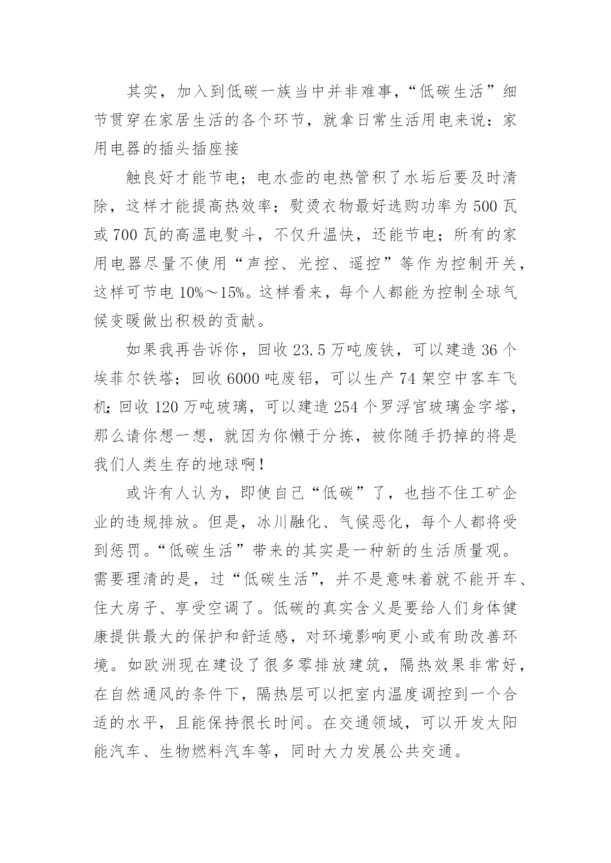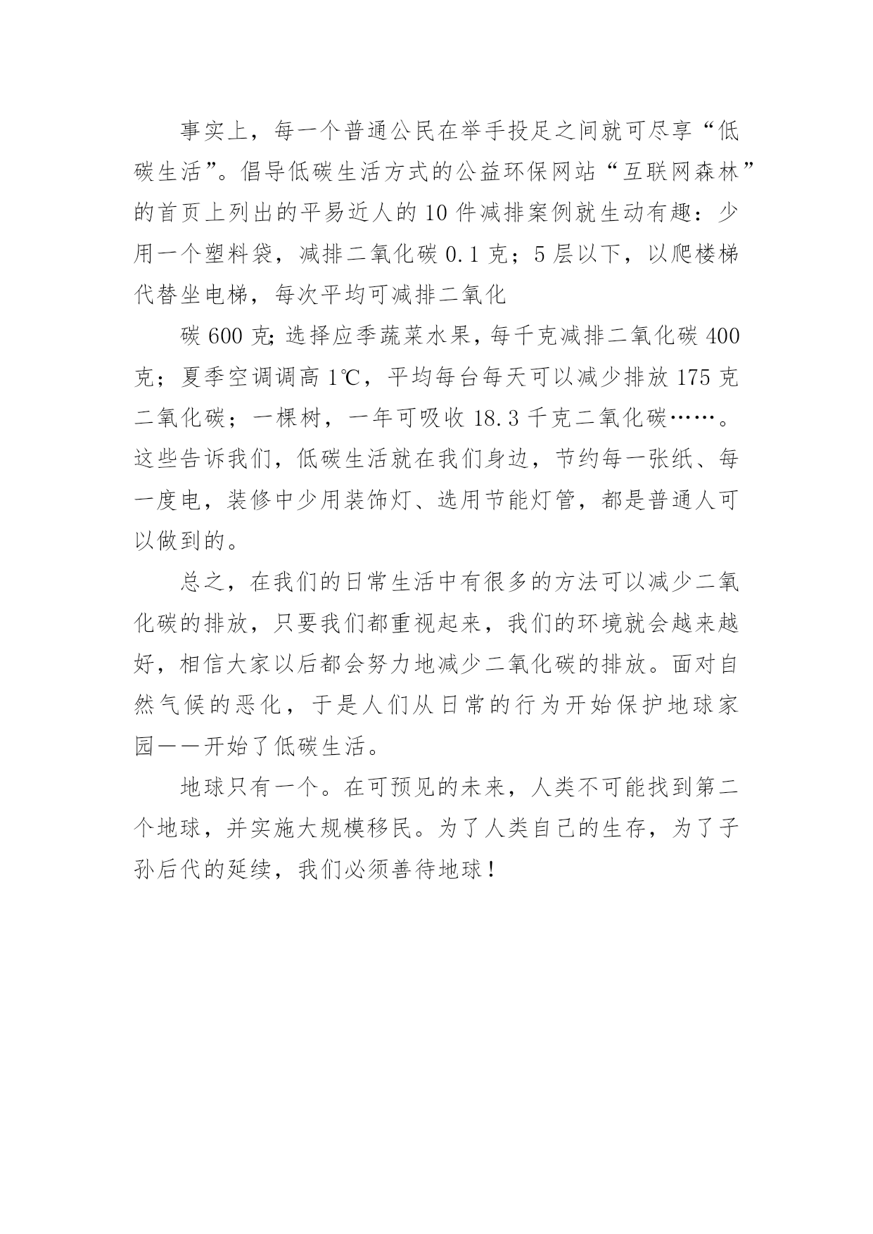 低碳环保为主题的作文低碳环保为主题的作文人人都知道,我们只有一个地球;而地球是人类与所有生命共同的地球。生命的延续,人类的生存,一刻也离不开自然资源。而面对今天地球的现状,每一个稍有良知的人都不能不为地球的明天而忧虑。自从我在电视里了解到二氧化碳的危害,我便意识到低碳生活的重要性。通过看电视、查资料,我明白了什么是低碳生活。低碳生活就是在我们的生活中尽量少排放二氧化碳。因为二氧化碳多了会使我们生活的空间环境变暖,也就是“温室效应”。我们生活的环境温度升高了,就会使南极的冰川融化成水,大量的水流到海里,会使海平面升高,可能就会淹没一些海岛国家上的居民。所以我们在日常生活中要减少二氧化碳的排放。具体到我们的生活中,就是要节约能源。但是对于低碳生活,人们遭遇着类似的尴尬:知道保护环境的重要,也知道保护环境人人有责,但是,为了提高生活质量,却不得不以增加碳排放为代价。专家指出,尽管人们不能避免碳排放,但却可以减少碳排放。每个人都不可能过“零碳”的生活,在资源匮乏的当下,我们要做的是,把有限的资源用于满足人们的基本需要,限制奢侈浪费。同时,养成“低碳生活”理念,在可选择、可替换的条件下,首选自然、环保、健康的生活方式。其实,加入到低碳一族当中并非难事,“低碳生活”细节贯穿在家居生活的各个环节,就拿日常生活用电来说:家用电器的插头插座接触良好才能节电;电水壶的电热管积了水垢后要及时清除,这样才能提高热效率;熨烫衣物最好选购功率为500瓦或700瓦的高温电熨斗,不仅升温快,还能节电;所有的家用电器尽量不使用“声控、光控、遥控”等作为控制开关,这样可节电10%~15%。这样看来,每个人都能为控制全球气候变暖做出积极的贡献。如果我再告诉你,回收23.5万吨废铁,可以建造36个埃菲尔铁塔;回收6000吨废铝,可以生产74架空中客车飞机;回收120万吨玻璃,可以建造254个罗浮宫玻璃金字塔,那么请你想一想,就因为你懒于分拣,被你随手扔掉的将是我们人类生存的地球啊!或许有人认为,即使自己“低碳”了,也挡不住工矿企业的违规排放。但是,冰川融化、气候恶化,每个人都将受到惩罚。“低碳生活”带来的其实是一种新的生活质量观。需要理清的是,过“低碳生活”,并不是意味着就不能开车、住大房子、享受空调了。低碳的真实含义是要给人们身体健康提供最大的保护和舒适感,对环境影响更小或有助改善环境。如欧洲现在建设了很多零排放建筑,隔热效果非常好,在自然通风的条件下,隔热层可以把室内温度调控到一个合适的水平,且能保持很长时间。在交通领域,可以开发太阳能汽车、生物燃料汽车等,同时大力发展公共交通。事实上,每一个普通公民在举手投足之间就可尽享“低碳生活”。倡导低碳生活方式的公益环保网站“互联网森林”的首页上列出的平易近人的10件减排案例就生动有趣:少用一个塑料袋,减排二氧化碳0.1克;5层以下,以爬楼梯代替坐电梯,每次平均可减排二氧化碳600克;选择应季蔬菜水果,每千克减排二氧化碳400克;夏季空调调高1℃,平均每台每天可以减少排放175克二氧化碳;一棵树,一年可吸收18.3千克二氧化碳……。这些告诉我们,低碳生活就在我们身边,节约每一张纸、每一度电,装修中少用装饰灯、选用节能灯管,都是普通人可以做到的。总之,在我们的日常生活中有很多的方法可以减少二氧化碳的排放,只要我们都重视起来,我们的环境就会越来越好,相信大家以后都会努力地减少二氧化碳的排放。面对自然气候的恶化,于是人们从日常的行为开始保护地球家园――开始了低碳生活。地球只有一个。在可预见的未来,人类不可能找到第二个地球,并实施大规模移民。为了人类自己的生存,为了子孙后代的延续,我们必须善待地球!