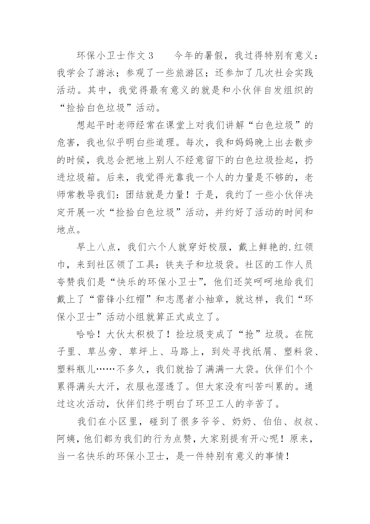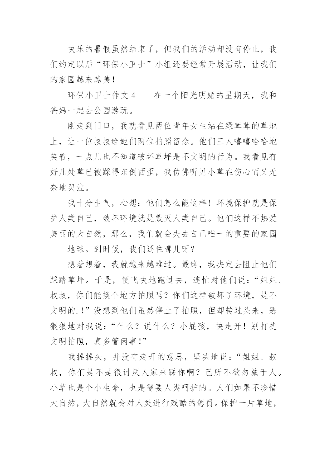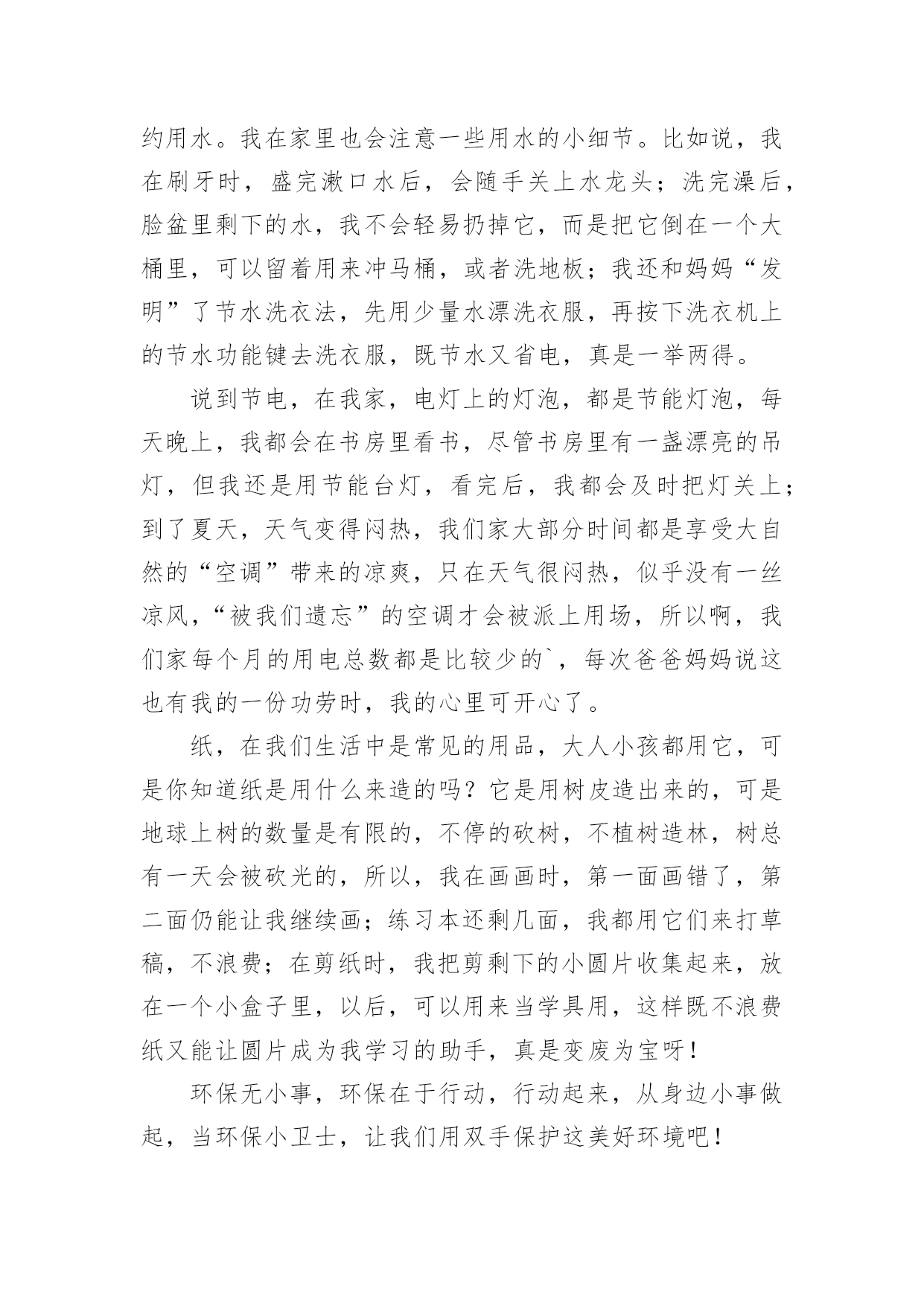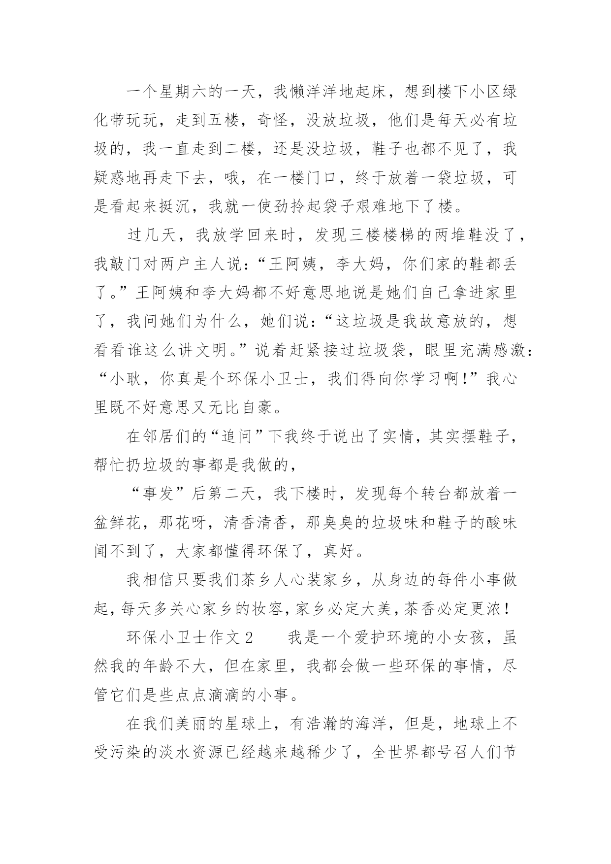环保小卫士作文600字环保小卫士作文600字4篇环保是每个地球公民应尽的义务,以下是小编收集的环保小卫士作文,仅供大家阅读参考!环保小卫士作文1蓝天是白云的家,大海是鱼儿的家,树林是小鸟的家,大地是种子的家,美丽的安溪就是我的家,我爱我家。“大自然是善良的慈母,同时也是冷酷的屠夫。”这是雨果说过的一句话。其实大自然就像一面镜子,你对它好,它也对你好;反之,你对它坏,它也会对你加倍的坏。我相信,只要你心中时时刻刻记着这句话,地球妈妈一定会加倍爱我们的,我的身边就有许多环保小卫士,我正一步步被环保的'正能量吸引着。去年初夏的一天,我照常穿好鞋走出房门,就听见对门的邻居在谈论着:“奇了怪了,最近的清洁工不仅扫楼道,还把我们放在门口的垃圾袋拿去扔了,更感人的是把我们鞋架上的鞋排整齐了,已经接连好多天了,以前只是扫扫楼梯啊,哪管扔垃圾。”我听后神秘一笑,觉得特开心。我走到五层楼时,又听到房内的主人声:“清洁工也够辛苦的了,我们今后别把垃圾随便放么拿进去,她们说:“其实那么小的楼梯口,我们不应该占用,而且还总麻烦清洁工摆放,真不好意思,改天得谢谢她。”我恍然大悟,心里暗喜。一个星期六的一天,我懒洋洋地起床,想到楼下小区绿化带玩玩,走到五楼,奇怪,没放垃圾,他们是每天必有垃圾的,我一直走到二楼,还是没垃圾,鞋子也都不见了,我疑惑地再走下去,哦,在一楼门口,终于放着一袋垃圾,可是看起来挺沉,我就一使劲拎起袋子艰难地下了楼。过几天,我放学回来时,发现三楼楼梯的两堆鞋没了,我敲门对两户主人说:“王阿姨,李大妈,你们家的鞋都丢了。”王阿姨和李大妈都不好意思地说是她们自己拿进家里了,我问她们为什么,她们说:“这垃圾是我故意放的,想看看谁这么讲文明。”说着赶紧接过垃圾袋,眼里充满感激:“小耿,你真是个环保小卫士,我们得向你学习啊!”我心里既不好意思又无比自豪。在邻居们的“追问”下我终于说出了实情,其实摆鞋子,帮忙扔垃圾的事都是我做的,“事发”后第二天,我下楼时,发现每个转台都放着一盆鲜花,那花呀,清香清香,那臭臭的垃圾味和鞋子的酸味闻不到了,大家都懂得环保了,真好。我相信只要我们茶乡人心装家乡,从身边的每件小事做起,每天多关心家乡的妆容,家乡必定大美,茶香必定更浓!环保小卫士作文2我是一个爱护环境的小女孩,虽然我的年龄不大,但在家里,我都会做一些环保的事情,尽管它们是些点点滴滴的小事。在我们美丽的星球上,有浩瀚的海洋,但是,地球上不受污染的淡水资源已经越来越稀少了,全世界都号召人们节约用水。我在家里也会注意一些用水的小细节。比如说,我在刷牙时,盛完漱口水后,会随手关上水龙头;洗完澡后,脸盆里剩下的水,我不会轻易扔掉它,而是把它倒在一个大桶里,可以留着用来冲马桶,或者洗地板;我还和妈妈“发明”了节水洗衣法,先用少量水漂洗衣服,再按下洗衣机上的节水功能键去洗衣服,既节水又省电,真是一举两得。说到节电,在我家,电灯上的灯泡,都是节能灯泡,每天晚上,我都会在书房里看书,尽管书房里有一盏漂亮的吊灯,但我还是用节能台灯,看完后,我都会及时把灯关上;到了夏天,天气变得闷热,我们家大部分时间都是享受大自然的“空调”带来的凉爽,只在天气很闷热,似乎没有一丝凉风,“被我们遗忘”的空调才会被派上用场,所以啊,我们家每个月的用电总数都是比较少的`,每次爸爸妈妈说这也有我的一份功劳时,我的心里可开心了。纸,在我们生活中是常见的用品,大人小孩都用它,可是你知道纸是用什么来造的吗?它是用树皮造出来的,可是地球上树的数量是有限的,不停的砍树,不植树造林,树总有一天会被砍光的,所以,我在画画时,第一面画错了,第二面仍能让我继续画;练习本还剩几面,我都用它们来打草稿,不浪费;在剪纸时,我把剪剩下的小圆片收集起来,放在一个小盒子里,以后,可以用来当学具用,这样既不浪费纸又能让圆片成为我学习的助手,真是变废为宝呀!环保无小事,环保在于行动,行动起来,从身边小事做起,当环保小卫士,让我们用双手保护这美好环境吧!环保小卫士作文3今年的暑假,我过得特别有意义:我学会了游泳;参观了一些旅游区;还参加了几次社会实践活动。其中,我觉得最有意义的就是和小伙伴自发组织的“捡拾白色垃圾”活动。想起平时老师经常在课堂上对我们讲解“白色垃圾”的危害,我也似乎明白些道理。每次,我和妈妈晚上出去散步的时候,我总会把地上别人不经意留下的白色垃圾捡起,扔进垃圾箱。后来,我觉得光靠我一个人的力量是不够的,老师常教导我们:团结就是力量!于是,我约了一些小伙伴决定开展一次“捡拾白色垃圾”活动,并约好了活动的时间和地点。早上八点,我们六个人就穿好校服,戴上鲜艳的.红领巾,来到社区领了工具:铁夹子和垃圾袋。社区的工作人员夸赞我们是“快乐的环保小卫士”,他们还笑呵呵地给我们戴上了“雷锋小红帽”和志愿者小袖章,就这样,我们“环保小