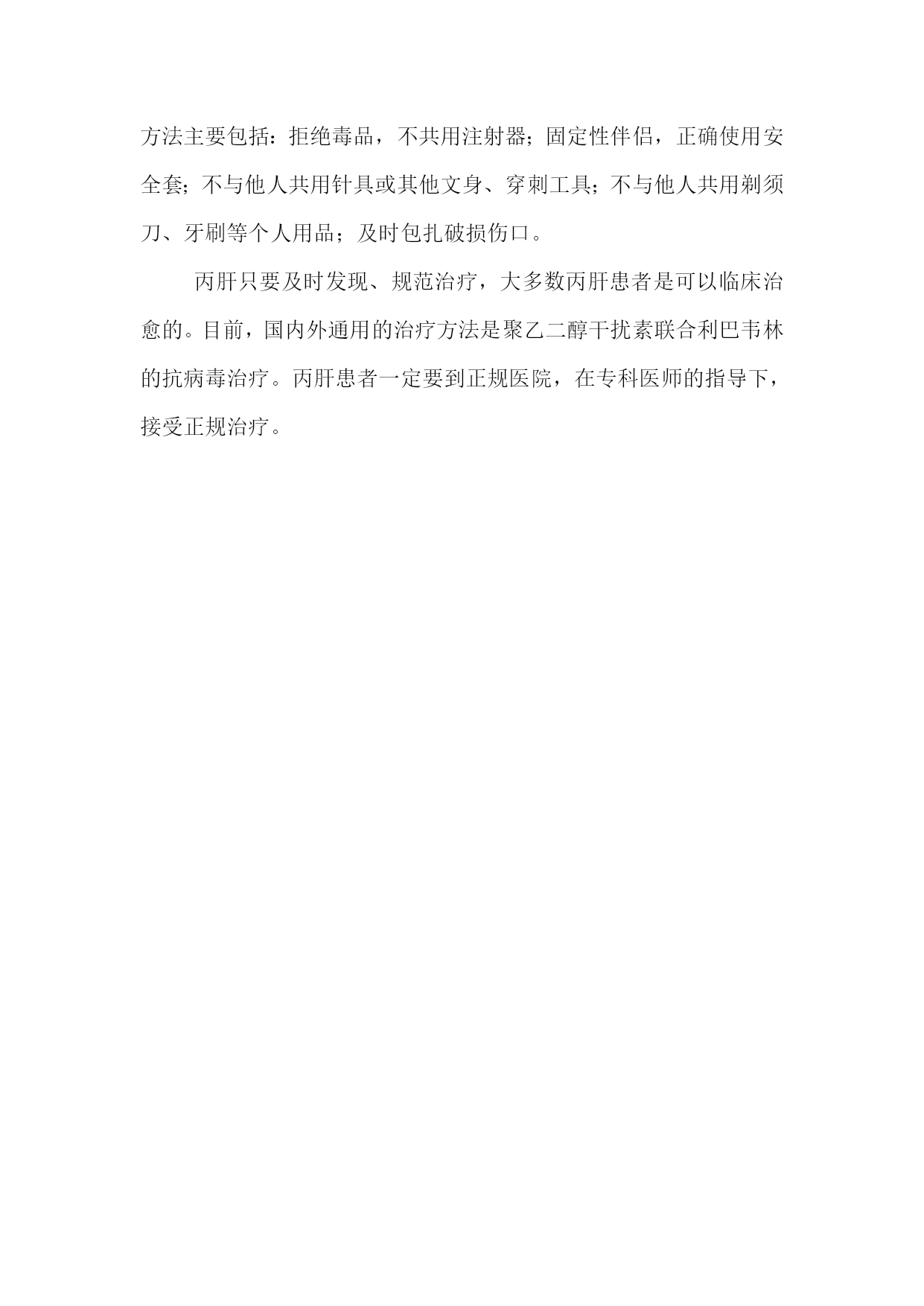 丙肝-----人类健康的隐形杀手在我国,由于人们对丙型肝炎知识了解较少,对丙肝的危害和治疗不够重视,常被患者甚至医生忽视。我国的丙肝病毒感染高达4000万人,平均感染率为3.2%。据武汉、长沙、北京等地调查,正常人及健康献血员抗HCV阳性率为2.0%-3.4%,据我省疾控中心提供的统计监测报告显示,丙肝发病数居法定传染病中第五位,死亡数第六位。近几年发现现症丙肝患者人数明显增多。慢性丙肝是由丙肝病毒(HCV)所引起的一种进展性肝脏疾病。与慢性乙肝不同,感染丙肝病毒后大多数患者都没有明显症状,容易被人们所忽视。感染丙肝病毒后慢性化率极高,慢性丙肝如得不到及时合理治疗,经过20-25年左右,有的丙肝很可能发展为肝硬化,甚至肝癌。丙肝还可合并脂肪肝,可增加患者患糖尿病的概率,除此以外,慢性丙型肝炎病毒感染还可能增加一些其他肿瘤的危险。丙肝的可怕,很大程度上由于其隐匿性,危害性,丙型肝炎已经被比喻成人类健康的“隐形杀手”。丙型肝炎的传播是通过输血或血制品、静脉注射毒品、性传播、母婴传播等引起,或者未经严格消毒的器具进行纹身、纹眉、穿耳环孔等皮肤粘膜创伤性操作引起。拥抱、礼节性接吻、喷嚏、咳嗽、食物、饮水等无皮肤破损的一般接触不会传播丙肝病毒。对于高危人群,尤其是1994年以前有过输血史的人,除了肝功能检查外,还应进行丙肝病毒抗体检测和HCVRNA,做到早发现、早诊断、早治疗。由于丙肝病毒变化多端,目前尚无疫苗可供有效预防。预防丙肝方法主要包括:拒绝毒品,不共用注射器;固定性伴侣,正确使用安全套;不与他人共用针具或其他文身、穿刺工具;不与他人共用剃须刀、牙刷等个人用品;及时包扎破损伤口。丙肝只要及时发现、规范治疗,大多数丙肝患者是可以临床治愈的。目前,国内外通用的治疗方法是聚乙二醇干扰素联合利巴韦林的抗病毒治疗。丙肝患者一定要到正规医院,在专科医师的指导下,接受正规治疗。