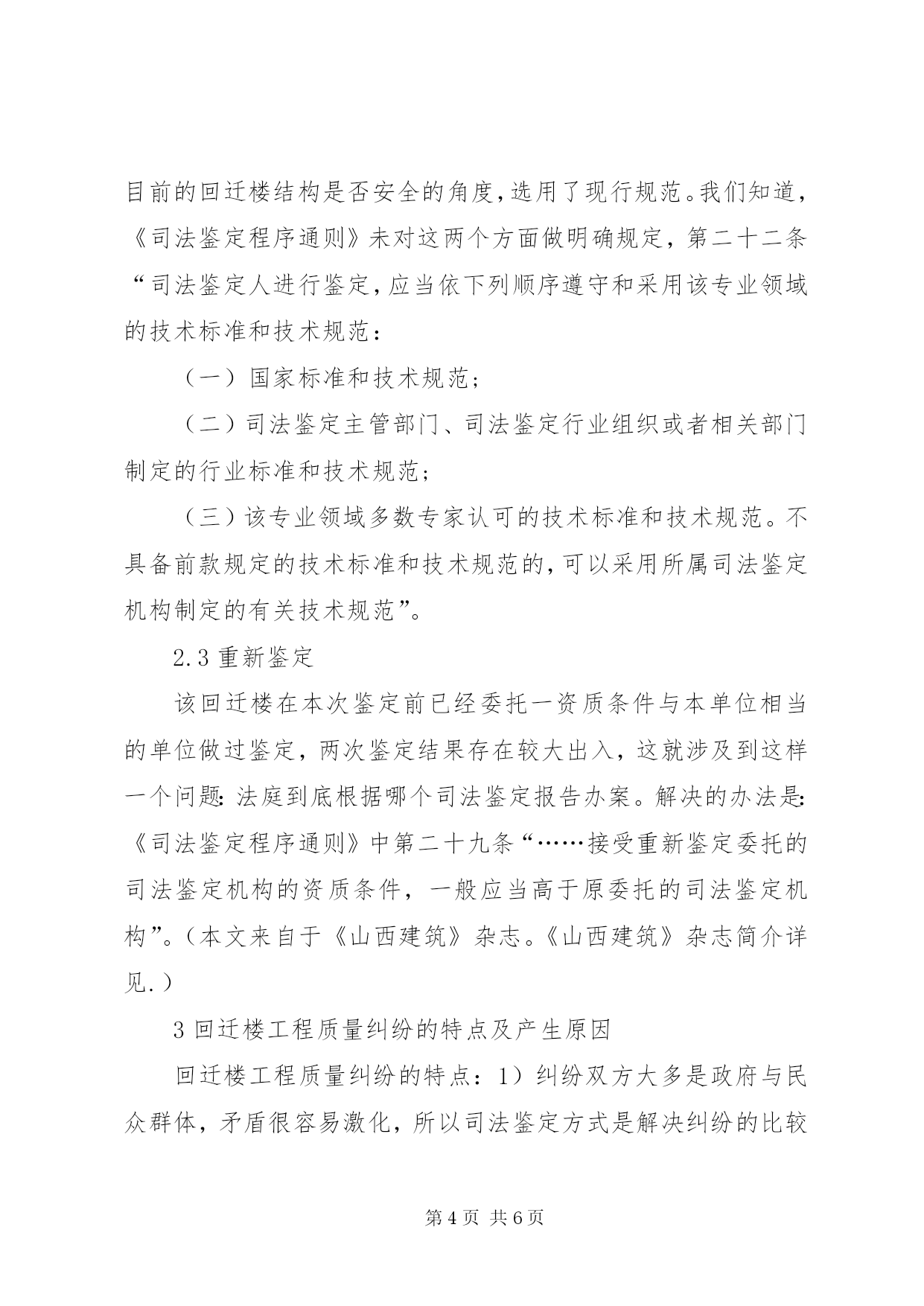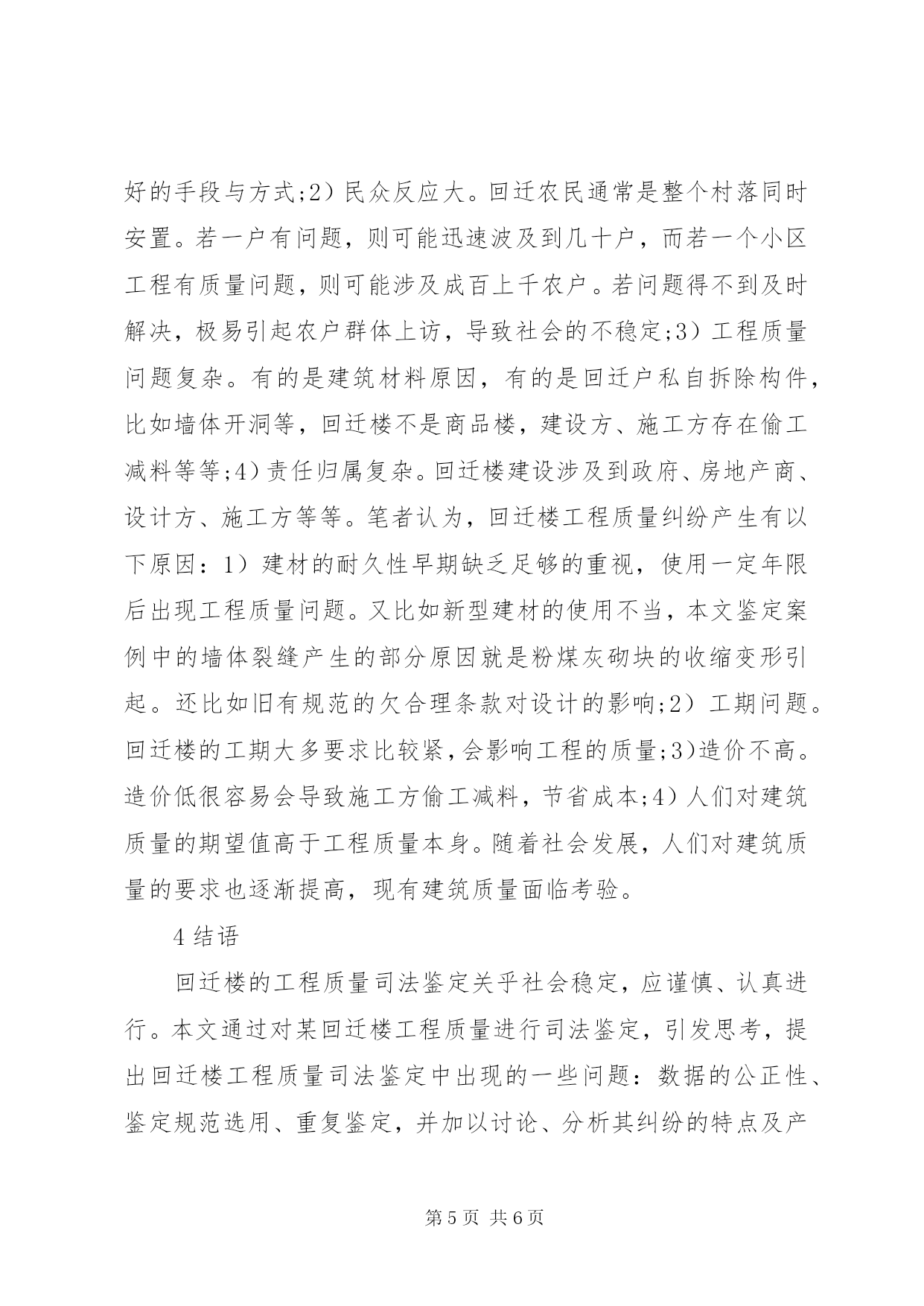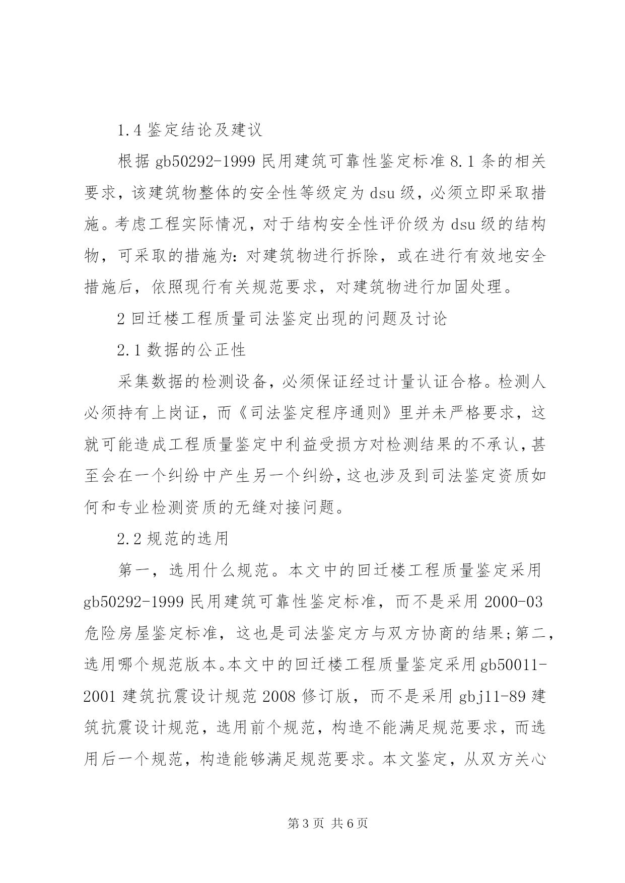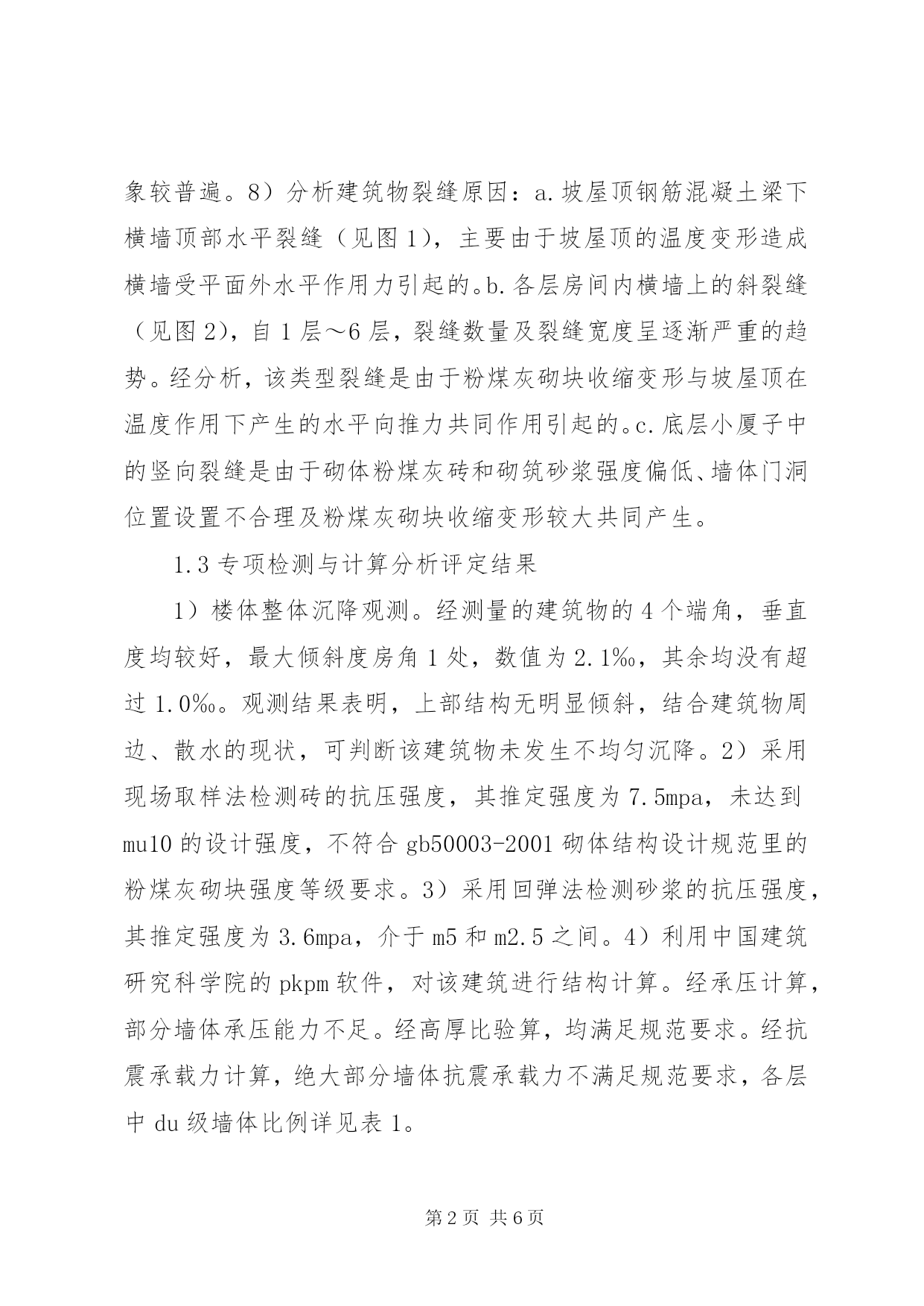 第PAGE\*Arabic\*MERGEFORMAT6页共NUMPAGES\*MERGEFORMAT6页回迁楼质量司法鉴定的探讨1某回迁楼的工程质量司法鉴定1.1检案摘要该回迁楼始建于1997年,1997年12月竣工,为砖混结构,总建筑面积约5000m2,墙体材料为浸渍免烧粉煤灰砖。该楼居民就楼房裂缝问题多次投诉,申请对该楼进行结构鉴定。1.2资料调查和现场勘查1)该建筑地基验槽记录、隐蔽工程验收记录、材料复试、质量监督记录、工程验收手续齐备。2)该建筑建于1997年,1997年12月竣工,当年投入使用。2006年该楼居民就楼房裂缝问题曾上访投诉。3)该回迁楼建筑面积5900m2,为带半地下室及坡屋顶的6层砖混结构,墙体砌筑材料为浸渍免烧粉煤灰砖,经现场检查,其构造措施、结构布置、主要尺寸基本符合原设计要求。4)该建筑的墙体砌筑材料为浸渍免烧粉煤灰砖,共7层,高度为20.55m,超过现行gb50023-95建筑抗震鉴定标准要求的限值。5)房屋的承重墙体系以横墙承重为主,该建筑物局部未设构造柱,不满足gb50011-2001建筑抗震设计规范2008修订版的相关要求。6)经裂缝普查,该建筑的部分墙体,特别是横墙有大量的裂缝,部分产生裂缝的构件,依据裂缝形态、严重程度其安全性等级评为cu级。7)各楼层预制楼板未发现垂直于预制板长向的受力裂缝;平行预制板长向的预制板板缝间底面抹灰层开裂现象较普遍。8)分析建筑物裂缝原因:a.坡屋顶钢筋混凝土梁下横墙顶部水平裂缝(见图1),主要由于坡屋顶的温度变形造成横墙受平面外水平作用力引起的。b.各层房间内横墙上的斜裂缝(见图2),自1层~6层,裂缝数量及裂缝宽度呈逐渐严重的趋势。经分析,该类型裂缝是由于粉煤灰砌块收缩变形与坡屋顶在温度作用下产生的水平向推力共同作用引起的。c.底层小厦子中的竖向裂缝是由于砌体粉煤灰砖和砌筑砂浆强度偏低、墙体门洞位置设置不合理及粉煤灰砌块收缩变形较大共同产生。1.3专项检测与计算分析评定结果1)楼体整体沉降观测。经测量的建筑物的4个端角,垂直度均较好,最大倾斜度房角1处,数值为2.1‰,其余均没有超过1.0‰。观测结果表明,上部结构无明显倾斜,结合建筑物周边、散水的现状,可判断该建筑物未发生不均匀沉降。2)采用现场取样法检测砖的抗压强度,其推定强度为7.5mpa,未达到mu10的设计强度,不符合gb50003-2001砌体结构设计规范里的粉煤灰砌块强度等级要求。3)采用回弹法检测砂浆的抗压强度,其推定强度为3.6mpa,介于m5和m2.5之间。4)利用中国建筑研究科学院的pkpm软件,对该建筑进行结构计算。经承压计算,部分墙体承压能力不足。经高厚比验算,均满足规范要求。经抗震承载力计算,绝大部分墙体抗震承载力不满足规范要求,各层中du级墙体比例详见表1。1.4鉴定结论及建议根据gb50292-1999民用建筑可靠性鉴定标准8.1条的相关要求,该建筑物整体的安全性等级定为dsu级,必须立即采取措施。考虑工程实际情况,对于结构安全性评价级为dsu级的结构物,可采取的措施为:对建筑物进行拆除,或在进行有效地安全措施后,依照现行有关规范要求,对建筑物进行加固处理。2回迁楼工程质量司法鉴定出现的问题及讨论2.1数据的公正性采集数据的检测设备,必须保证经过计量认证合格。检测人必须持有上岗证,而《司法鉴定程序通则》里并未严格要求,这就可能造成工程质量鉴定中利益受损方对检测结果的不承认,甚至会在一个纠纷中产生另一个纠纷,这也涉及到司法鉴定资质如何和专业检测资质的无缝对接问题。2.2规范的选用第一,选用什么规范。本文中的回迁楼工程质量鉴定采用gb50292-1999民用建筑可靠性鉴定标准,而不是采用2000-03危险房屋鉴定标准,这也是司法鉴定方与双方协商的结果;第二,选用哪个规范版本。本文中的回迁楼工程质量鉴定采用gb50011-2001建筑抗震设计规范2008修订版,而不是采用gbj11-89建筑抗震设计规范,选用前个规范,构造不能满足规范要求,而选用后一个规范,构造能够满足规范要求。本文鉴定,从双方关心目前的回迁楼结构是否安全的角度,选用了现行规范。我们知道,《司法鉴定程序通则》未对这两个方面做明确规定,第二十二条“司法鉴定人进行鉴定,应当依下列顺序遵守和采用该专业领域的技术标准和技术规范:(一)国家标准和技术规范;(二)司法鉴定主管部门、司法鉴定行业组织或者相关部门制定的行业标准和技术规范;(三)该专业领域多数专家认可的技术标准和技术规范。不具备前款规定的技术标准和技术规范的,可以采用所属司法鉴定机构制定的有关技术规范”。2.3重新鉴定该回迁楼在本次鉴定前已经委托一资质条件与本单位相当的单位做过鉴定,两次鉴定结果存在较大出入,这就涉及到这样一个问题:法