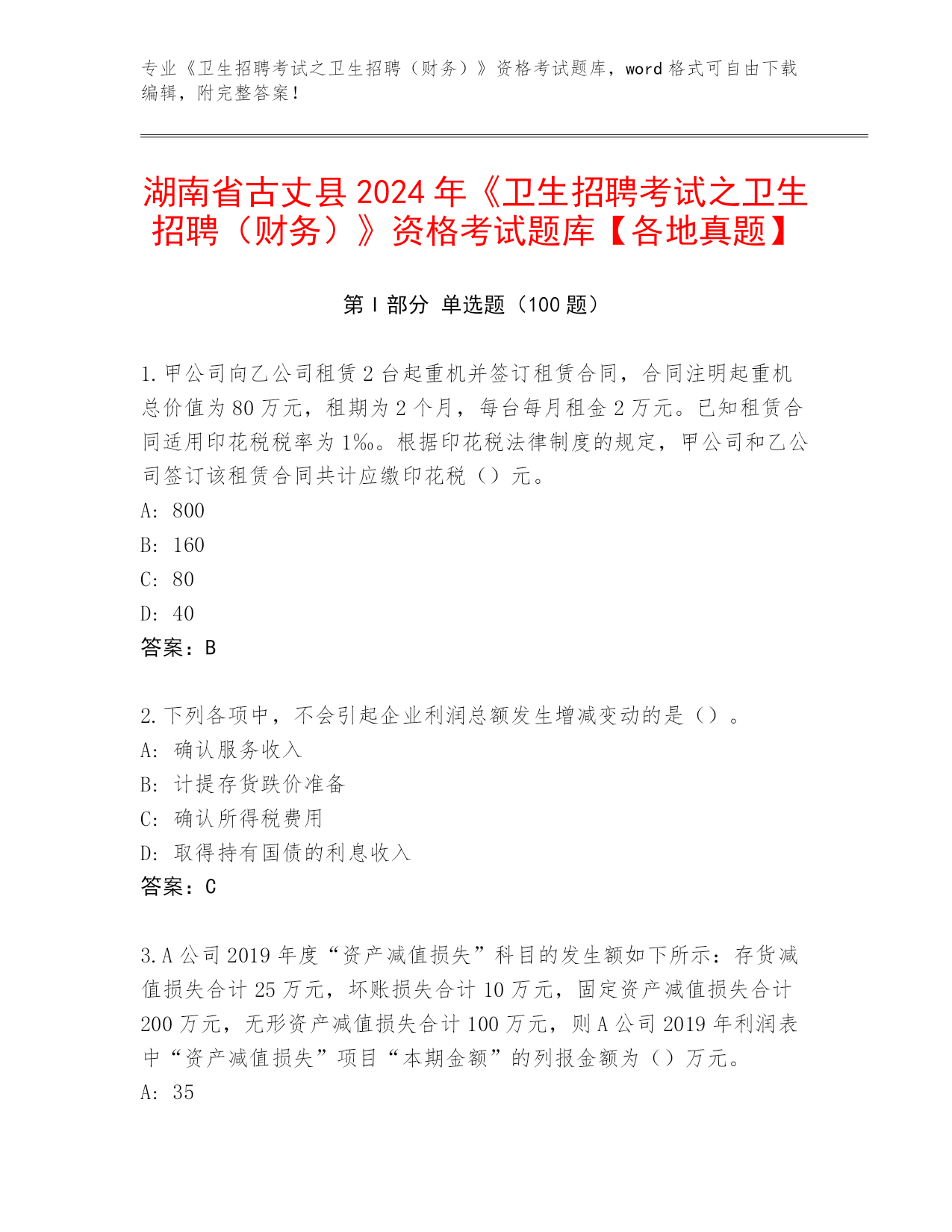 湖南省古丈县2024年《卫生招聘考试之卫生招聘(财务)》资格考试题库【各地真题】
