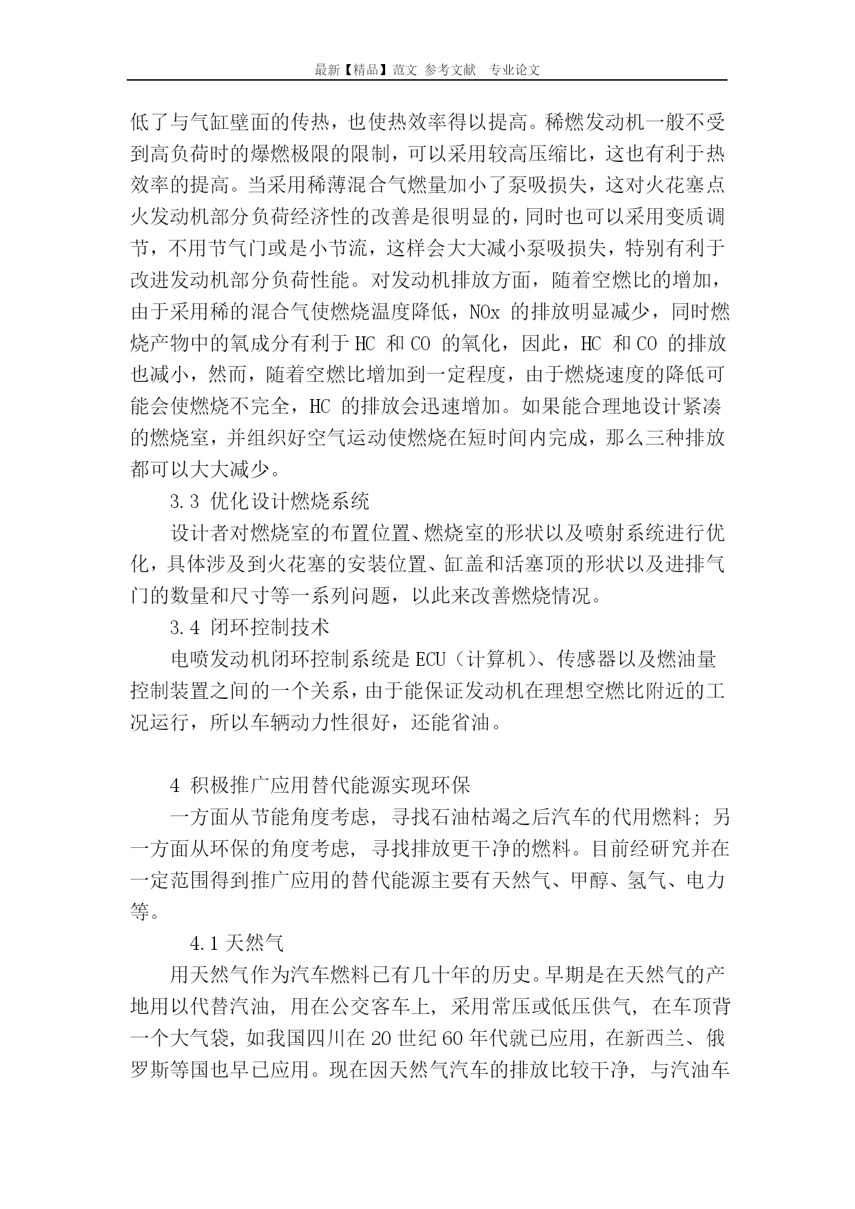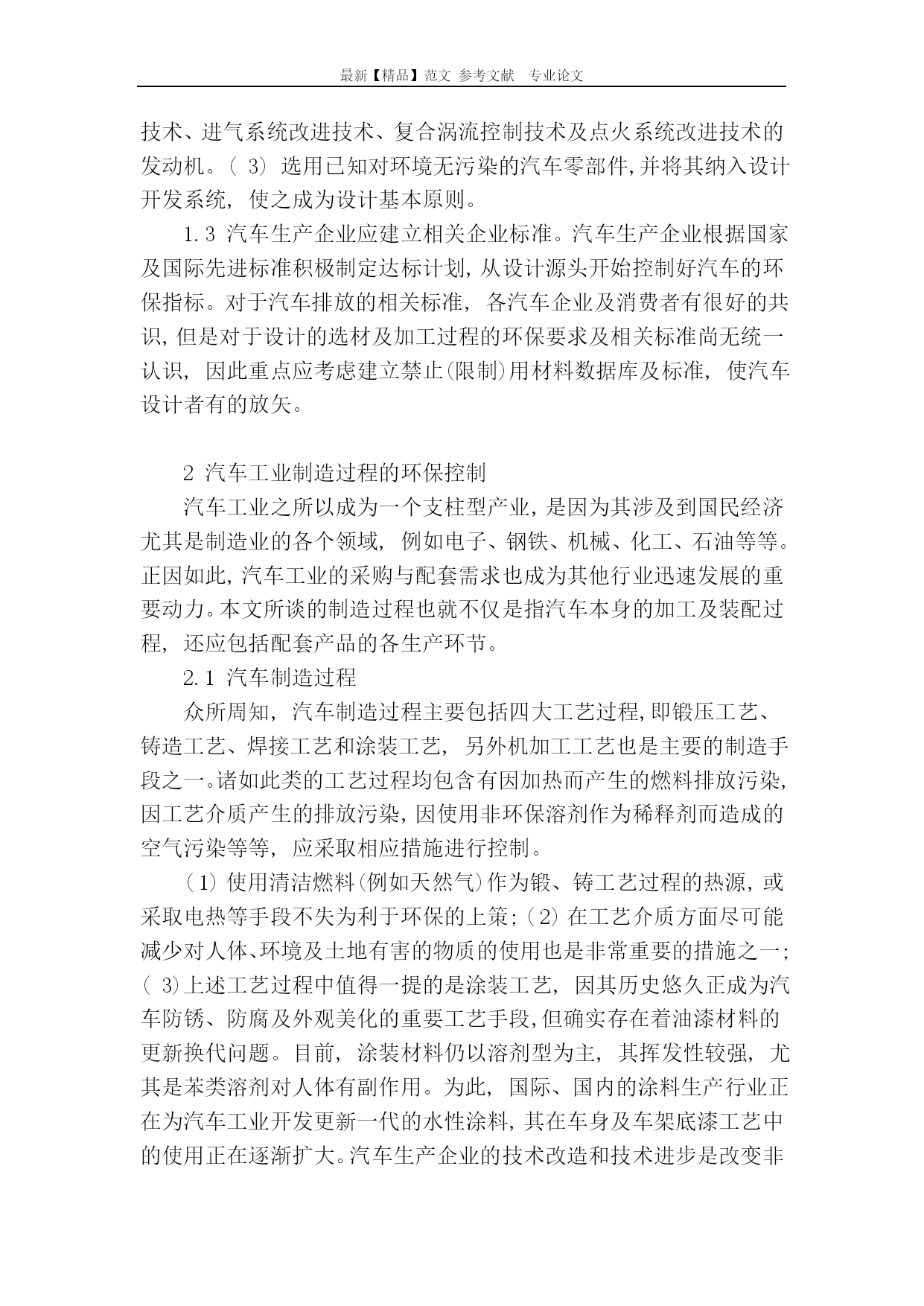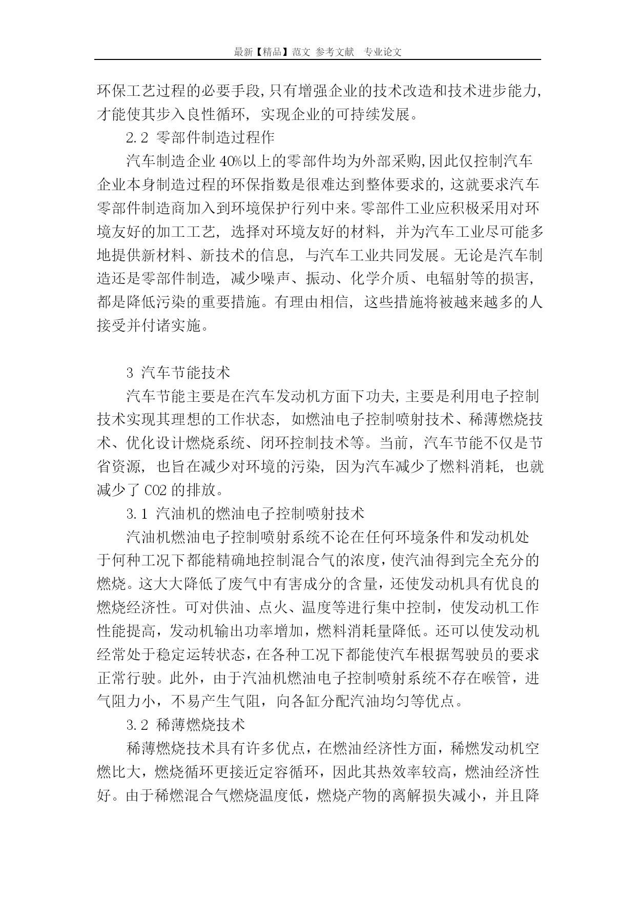 最新【精品】范文参考文献专业论文小议汽车节能与环保技术小议汽车节能与环保技术摘要:在汽车行业中,减少破坏环境的汽车的生产和使用是现在节能减排的当务之急,而相应的互补对策则是尽可能的开发绿色能源去补充动力能源,满足工业发展和人民正常生活的使用和需要。本文主要对汽车节能环保技术进行了探讨分析,可供同行参考。关键词:汽车;环保控制;节能技术中图分类号:F407.471文献标识码:A文章编号:随着汽车保有量的增加,汽车的尾气污染已经成为大气污染的元凶。因此世界各国纷纷出台更加严厉的排放法规,而汽车生产商为了自身发展,迎合消费者日益增加的环保意识,也投入巨大的精力进行汽车环保方面的研究,采用了许多新技术。从环保技术的分类来说,可以分为在现有燃料(汽油/柴油)汽车领域的技术和在利用新能源开发新汽车方面的技术。1从汽车生产设计开始建立环保理念可持续发展是人类经过大量实践探索和深刻反思形成的突破性共识,汽车设计也应遵循可持续发展的原则,在产品开发阶段对其整个生命周期予以评价,最大限度地消除对制造和使用环境乃至生态环境的不利影响,并对产品的可回收性、再生性以及不可回收时对环境所产生的影响予以充分考虑。1.1汽车设计者应更新观念树立环保意识。汽车开发的传统方法是以人的需要为中心,无视后续的产品生产及使用过程中的资源污染和能源消耗以及对生态环境的影响。只有改变这种意识,树立新的观念,才能适应汽车工业可持续发展的要求。1.2汽车设计应选用利于环保的零部件及机器总成。(1)选用已经达到先进排放标准的发动机。目前,国内发动机制造技术与国际上差距较大。(2)选择采用先进技术的发动机,例如选择采用均质稀燃技术、进气系统改进技术、复合涡流控制技术及点火系统改进技术的发动机。(3)选用已知对环境无污染的汽车零部件,并将其纳入设计开发系统,使之成为设计基本原则。1.3汽车生产企业应建立相关企业标准。汽车生产企业根据国家及国际先进标准积极制定达标计划,从设计源头开始控制好汽车的环保指标。对于汽车排放的相关标准,各汽车企业及消费者有很好的共识,但是对于设计的选材及加工过程的环保要求及相关标准尚无统一认识,因此重点应考虑建立禁止(限制)用材料数据库及标准,使汽车设计者有的放矢。2汽车工业制造过程的环保控制汽车工业之所以成为一个支柱型产业,是因为其涉及到国民经济尤其是制造业的各个领域,例如电子、钢铁、机械、化工、石油等等。正因如此,汽车工业的采购与配套需求也成为其他行业迅速发展的重要动力。本文所谈的制造过程也就不仅是指汽车本身的加工及装配过程,还应包括配套产品的各生产环节。2.1汽车制造过程众所周知,汽车制造过程主要包括四大工艺过程,即锻压工艺、铸造工艺、焊接工艺和涂装工艺,另外机加工工艺也是主要的制造手段之一。诸如此类的工艺过程均包含有因加热而产生的燃料排放污染,因工艺介质产生的排放污染,因使用非环保溶剂作为稀释剂而造成的空气污染等等,应采取相应措施进行控制。(1)使用清洁燃料(例如天然气)作为锻、铸工艺过程的热源,或采取电热等手段不失为利于环保的上策;(2)在工艺介质方面尽可能减少对人体、环境及土地有害的物质的使用也是非常重要的措施之一;(3)上述工艺过程中值得一提的是涂装工艺,因其历史悠久正成为汽车防锈、防腐及外观美化的重要工艺手段,但确实存在着油漆材料的更新换代问题。目前,涂装材料仍以溶剂型为主,其挥发性较强,尤其是苯类溶剂对人体有副作用。为此,国际、国内的涂料生产行业正在为汽车工业开发更新一代的水性涂料,其在车身及车架底漆工艺中的使用正在逐渐扩大。汽车生产企业的技术改造和技术进步是改变非环保工艺过程的必要手段,只有增强企业的技术改造和技术进步能力,才能使其步入良性循环,实现企业的可持续发展。2.2零部件制造过程作汽车制造企业40%以上的零部件均为外部采购,因此仅控制汽车企业本身制造过程的环保指数是很难达到整体要求的,这就要求汽车零部件制造商加入到环境保护行列中来。零部件工业应积极采用对环境友好的加工工艺,选择对环境友好的材料,并为汽车工业尽可能多地提供新材料、新技术的信息,与汽车工业共同发展。无论是汽车制造还是零部件制造,减少噪声、振动、化学介质、电辐射等的损害,都是降低污染的重要措施。有理由相信,这些措施将被越来越多的人接受并付诸实施。3汽车节能技术汽车节能主要是在汽车发动机方面下功夫,主要是利用电子控制技术实现其理想的工作状态,如燃油电子控制喷射技术、稀薄燃烧技术、优化设计燃烧系统、闭环控制技术等。当前,汽车节能不仅是节省资源,也旨在减少对环境的污染,因为汽车减少了燃料消耗,也就减少了CO2的排放。3.1汽油机的燃油电子控制喷射技术汽油机燃油电子控制喷射系统不论在任何环境条件和发动机处于何种工况下都能精