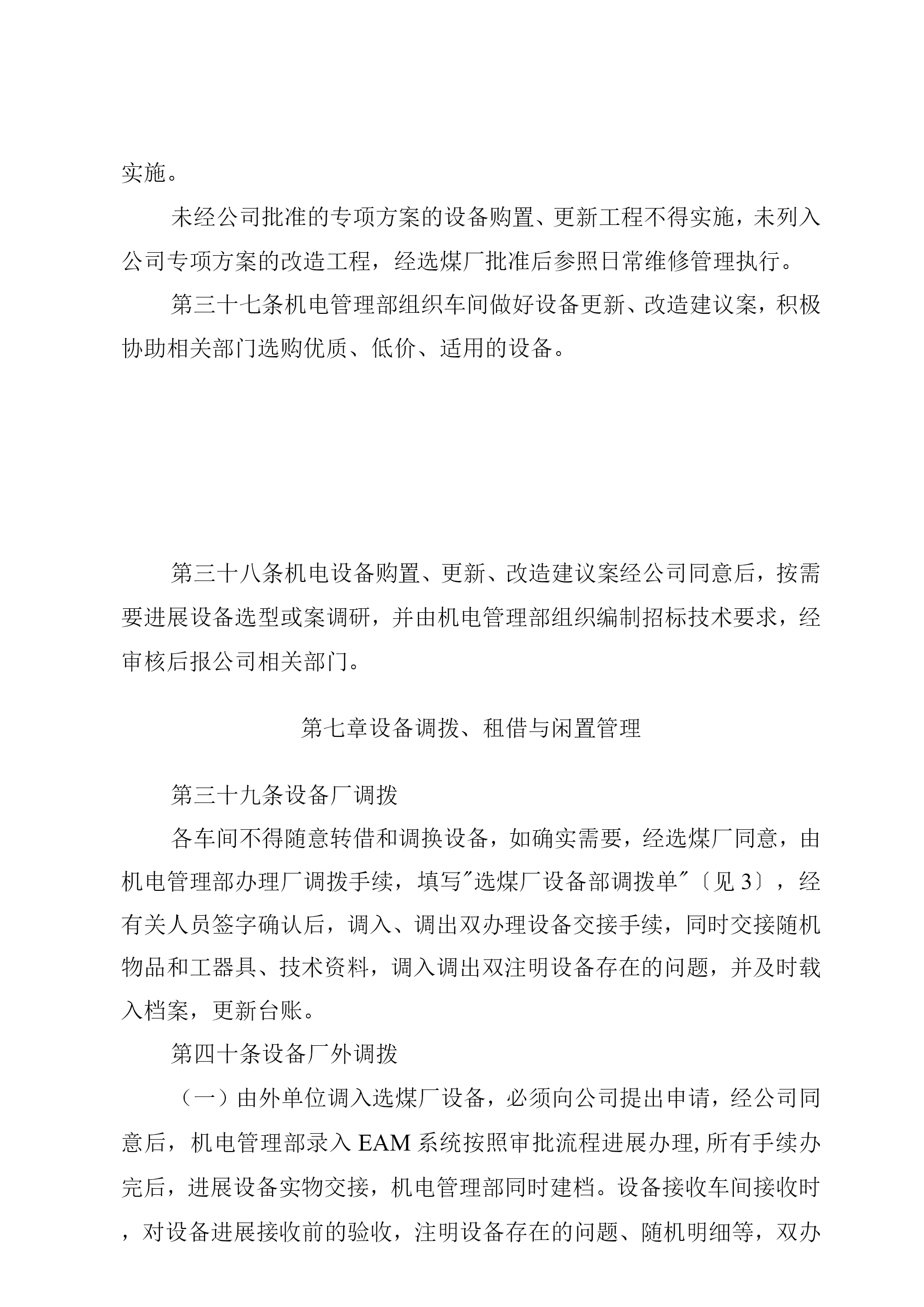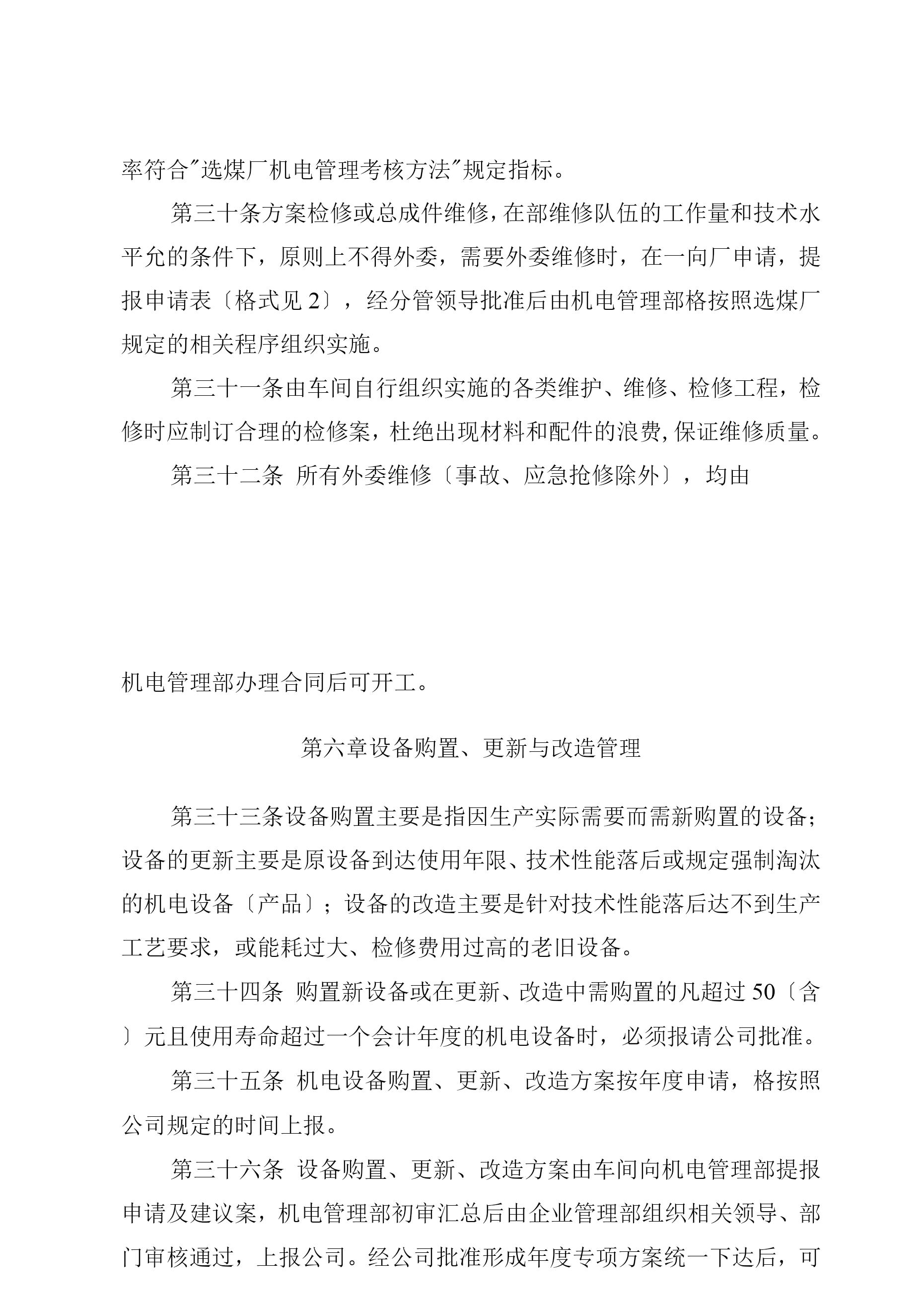 选煤厂机电设备管理方法〔2021年6月修订〕第一章总则第一条为保障选煤厂机电设备的正常运转,最大发挥机电设备生产效能,规机电设备的管理工作,依据"*雌能集团公司机电设备管理方法"〔准能企字〔2021〕268号〕,结合选煤厂生产实际,制定本方法。第二条机电设备管理坚持职能部门管理与使用车间管理相结合、正确操作与精心保养相结合、日常维护与方案检修相结合、专业管理与全员管理相结合、技术管理与经济管理相结合的原则。推行全员、全过程、全位、全寿命期的管理模式。第三条本方法规定了机电设备的根底管理、购置、使用、维修、改造、更新、封存、启封、调拨、报废、相关验收等环节的设备全寿命期的管理工作。第四条本方法适用于**准格尔能源**公司选煤厂、中国**能源股份**哈尔乌素露天煤矿选煤厂各车间、部室及外委切块承包单位〔下称车间〕。第二章组织与职责第五条机电设备管理实行厂、车间二级管理,分级负责的原则。第六条选煤厂机电管理部是机电设备管理的主管部门,在机电厂长的领导下开展工作,主要职责:〔一〕落实公司机电管理各项制度,建立健全选煤厂机电设备管理制度,组织制定设备点检标准、设备维护保养规程、设备润滑手册等;〔二〕负责新购设备采购方案的提报、招标技术要求的编制以及合同技术的签订;〔三〕配合、组织设备到货的验收工作;〔四〕负责设备技术资料存档;〔五〕建立、更新主要生产设备档案以及机电设备台账;〔六〕汇总分析各车间机电报表并向公司上报选煤厂机电报表;〔七〕办理机电设备调拨、租借、封存、启封、报废等手续;〔八〕负责组织设备外委维修实施工作;〔九〕机电设备资产的实物管理。第七条财务部负责办理设备管理在资产面的关联业务。第八条车间是设备管理的主体单位,主要职责:〔一〕负责选煤厂各项机电设备管理方法的执行,制定本车间机电设备管理相关容;〔二〕负责建立、更新本车间机电设备台账,并对设备技术资料存档;〔三〕负责设备使用的岗位责任制的编制执行;〔四〕负责设备使用管理、维护、检修工作以及备用设备〔总成件〕的存放、保管、定期维护保养工作;〔五〕负责本车间设备状态分析、上报机电月报表;〔六〕负责上传机电设备、总成件维护保养、维修记录;〔七〕负责进入本车间机电工程外委施工监修工作及按照属地管理原则对外委施工现场管理;〔八〕配合各类验收工作;〔九〕配合厂部修订机电设备点检标准、操作规程、设备维护保养规程、润滑手册等;〔十〕完成机电设备管理其它工作。第三章设备根底管理第九条机电管理部建立全厂机电设备台账,台账中要标明设备位置号、序列号、设备名称、规格型号、生产厂家、投使日期、设备原值、使用地点、相关影像资料等信息,并且及时更新。特种设备、计量器具、机动车辆单独建立台账。第十条各车间对本车间设备建立台账,及时更新,并逐步完善设备总成、零件进展的拆清楚细,设备和零部件的规格型号、参数必须规、准确,做到账物相符。第十一条新购、改造等设备技术资料由机电管理部统一收集、存档,并按使用需要发放给设备使用车间。设备技术资料包括:验收资料、设备使用说明书、维修保养手册、配件图册、机械电气图纸、合格证等;特种设备、计量器具检验合格证及定检检验资料由机电管理部存档。设备更新、改造后,技术资料一并更新。第十二条机电管理部建立全厂主要生产设备档案并及时更新。档案主要包括:机电设备根本信息、运行记录、总成件更换记录、大修、技改、更新、封存、启封、调拨、租借记录、事故记录等容。机电设备以台为单位建立档案,档案随机电设备终身保存。第十三条机电设备主管技术人员及时将技术资料、各类手续表单整理归档,统一交设备档案、报表管理员保管,并由设备档案、报表管理员统一登记造册。第十四条各车间每月对设备运行状态和维修情况进展统计分析形成月〔上月26日至本月25日〕报表,于每月25号〔节假日不顺延,如公司调整上报时间,选煤厂随之调整〕报机电管理部,月报表容包括:设备运行时间、故障时间统计、保养时间、设备月末状态、故障分析及机电说明等。机电设备月报表由车间机电负责人审核签字后上报。机电管理部将车间上报数据汇总分析后上报公司。所有报表数据准确无误,并有电子存档。第十五条车间及时将机电设备检修记录、润滑记录、点检维保记录、大修理记录、故障记录、总成件转记录以及配件消耗录入信息系统。第四章设备使用管理第十六条各车间必须建立机电操作人员、维修人员岗位责任制,明确其在机电设备使用、维护、维修过程中的职责。第十七条机电设备操作人员格执行设备操作规程、标准作业流程,具备懂用途、懂功能、会操作、会检查、会排除一般运行故障的能力;检修维护、维修人员格执行设备检修规程、设备维护保养规程、润滑保养规程、标准作业流程,必须做到懂原理、懂性能、懂构造,会操作、会