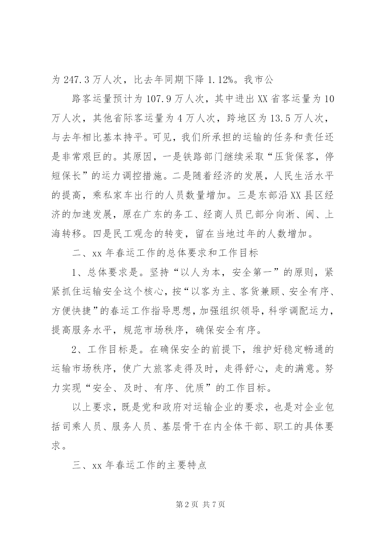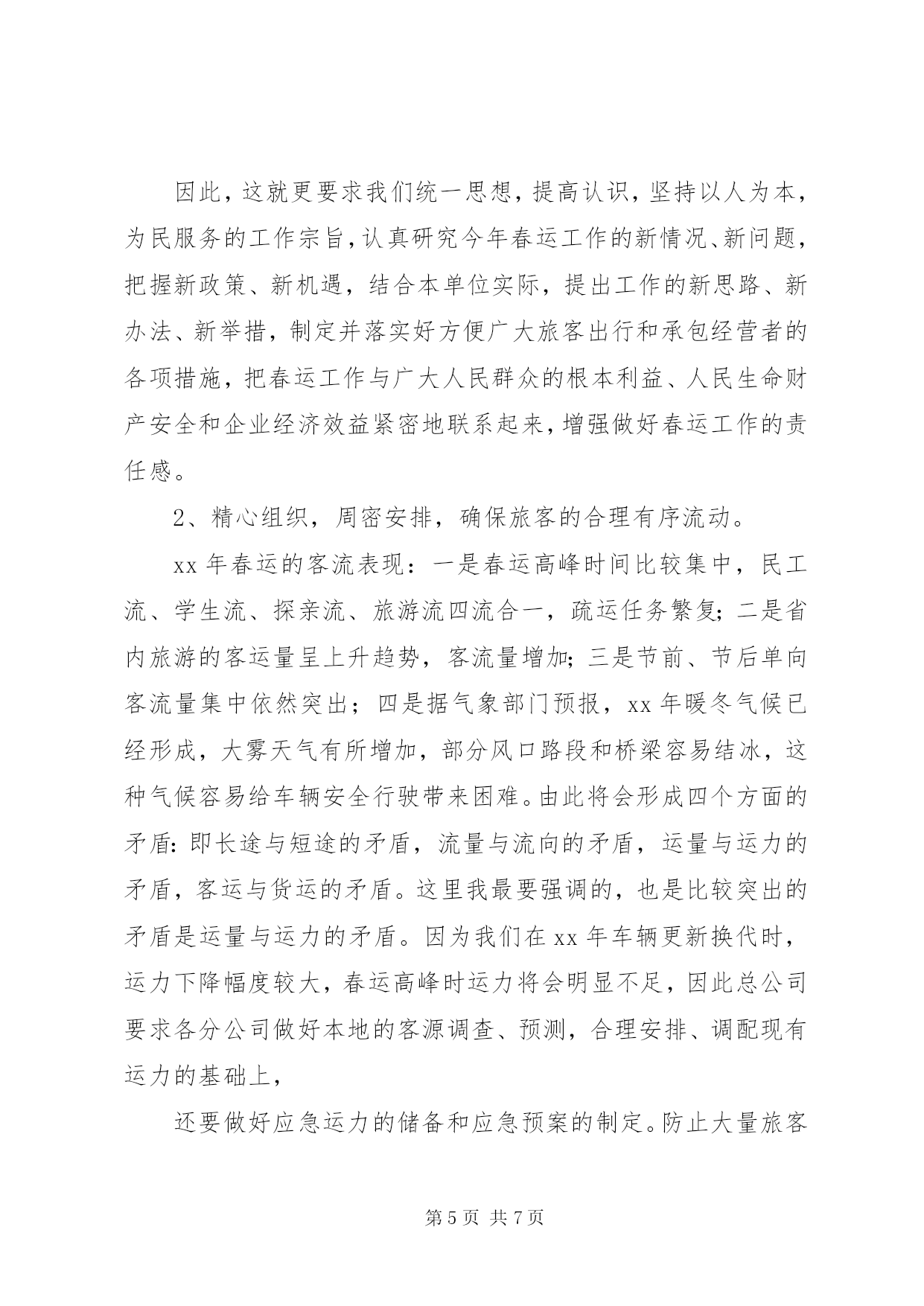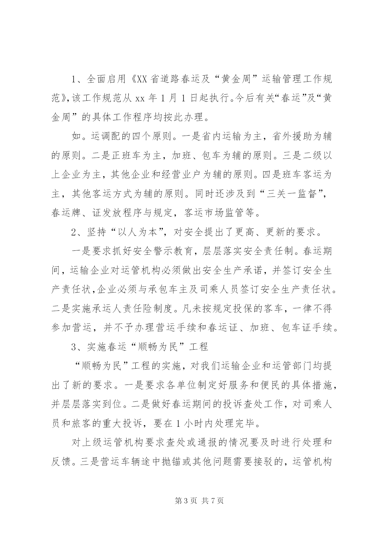 第PAGE\*Arabic\*MERGEFORMAT7页共NUMPAGES\*MERGEFORMAT7页交通企业春运工作会议发言提高认识狠抓落实认真做好xx年春节运输工作XX市汽车运输有限责任公司XX各位领导、同志们:xx年春运即将来临,根据国家规定,今年春节运输从1月25日开始,至3月5日结束,为期40天,即节前15天,节后25天,今天我司在此召开春运工作会议,传达部署和研究我司xx年的春运工作。下面,我就如何做好我司xx年春运工作讲几点意见:一、xx年春运工作的总体形势1、从对今年春运重视程度看,各级党委政府,交通主管部门将xx年的春运工作,提高到了实践“三个代表”重要思想,坚持以人为本,为民服务,和对执政能力的检验的高度。春运工作是一项涉及面广,综合性强,事关国家和人民生命财产安全及社会稳定的大事。必须增强我们的责任感和使命感,这充分体现了各级党和政府、交通主管部门对今年春运工作的高度重视。2、从对道路运输市场调查、预测情况看,预计全省客源总量为8526万人次,比去年同期下降1.2%,其中广东方向客源量为247.3万人次,比去年同期下降1.12%。我市公路客运量预计为107.9万人次,其中进出XX省客运量为10万人次,其他省际客运量为4万人次,跨地区为13.5万人次,与去年相比基本持平。可见,我们所承担的运输的任务和责任还是非常艰巨的。其原因,一是铁路部门继续采取“压货保客,停短保长”的运力调控措施。二是随着经济的发展,人民生活水平的提高,乘私家车出行的人员数量增加。三是东部沿XX县区经济的加速发展,原在广东的务工、经商人员已部分向淅、闽、上海转移。四是民工观念的转变,留在当地过年的人数增加。二、xx年春运工作的总体要求和工作目标1、总体要求是。坚持“以人为本,安全第一”的原则,紧紧抓住运输安全这个核心,按“以客为主、客货兼顾、安全有序、方便快捷”的春运工作指导思想,加强组织领导,科学调配运力,提高服务水平,规范市场秩序,确保安全有序。2、工作目标是。在确保安全的前提下,维护好稳定畅通的运输市场秩序,使广大旅客走得及时,走得舒心,走的满意。努力实现“安全、及时、有序、优质”的工作目标。以上要求,既是党和政府对运输企业的要求,也是对企业包括司乘人员、服务人员、基层骨干在内全体干部、职工的具体要求。三、xx年春运工作的主要特点1、全面启用《XX省道路春运及“黄金周”运输管理工作规范》,该工作规范从xx年1月1日起执行。今后有关“春运”及“黄金周”的具体工作程序均按此办理。如。运调配的四个原则。一是省内运输为主,省外援助为辅的原则。二是正班车为主,加班、包车为辅的原则。三是二级以上企业为主,其他企业和经营业户为辅的原则。四是班车客运为主,其他客运方式为辅的原则。同时还涉及到“三关一监督”,春运牌、证发放程序与规定,客运市场监管等。2、坚持“以人为本”,对安全提出了更高、更新的要求。一是要求抓好安全警示教育,层层落实安全责任制。春运期间,运输企业对运管机构必须做出安全生产承诺,并签订安全生产责任状,企业必须与承包车主及司乘人员签订安全生产责任状。二是实施承运人责任险制度。凡未按规定投保的客车,一律不得参加营运,并不予办理营运手续和春运证、加班、包车证手续。3、实施春运“顺畅为民”工程“顺畅为民”工程的实施,对我们运输企业和运管部门均提出了新的要求。一是要求各单位制定好服务和便民的具体措施,并层层落实到位。二是做好春运期间的投诉查处工作,对司乘人员和旅客的重大投诉,要在1小时内处理完毕。对上级运管机构要求查处或通报的情况要及时进行处理和反馈。三是营运车辆途中抛锚或其他问题需要接驳的,运管机构要积极督促或协助运输企业尽快组织运力接驳。四是要加强对春运运价的监管,各客运站要在候车大厅的主要位置设立运价咨询台,做好春运价格的宣传解释工作。目的就是树立良好的行业形象,营造良好的经营环境。4、建立了省际道路执法联动机制。主要内容。一是建立五省运管机构首接责任制。二是建立营运车辆违法通报制度。三是联合稽查执法,并统一执法标准。四、结合我司实际提出以下几点要求。1、统一思想,提高认识,增强做好春运工作的政治责任感、社会责任感和企业责任感。春运工作虽然已成为阶段性的常规工作,其工作的内容、程序和要求基本上已形成程序化、制度化,但具体到每年的春运,仍有别于往年的各种特殊情况,各级政府和上级主管部门对我们都相应地提出了新的要求,新的规定,如何在往年春运工作的基础上做到有新的突破;如何通过“春运”这一运输需求急剧增长、各级政府高度重视、社会各界密切关注的非常时期,提高“湘运”企业社会影响力、市场适应能力和竞争能力,展示行业风采,创新服务理念,是值得我们好好研究和探索的一个课题。认真组织好xx年的春运工作,并通过“春运”取得企业