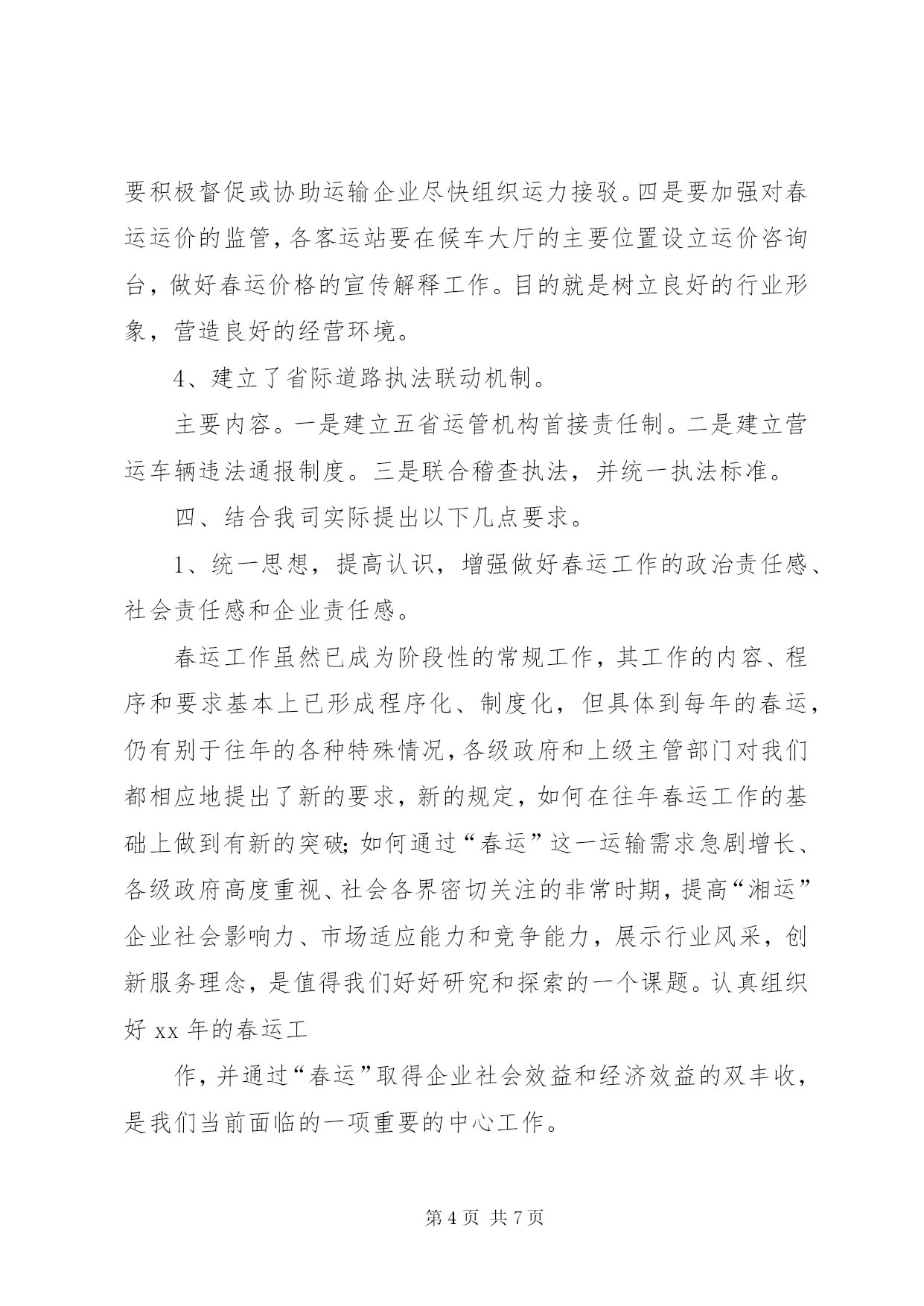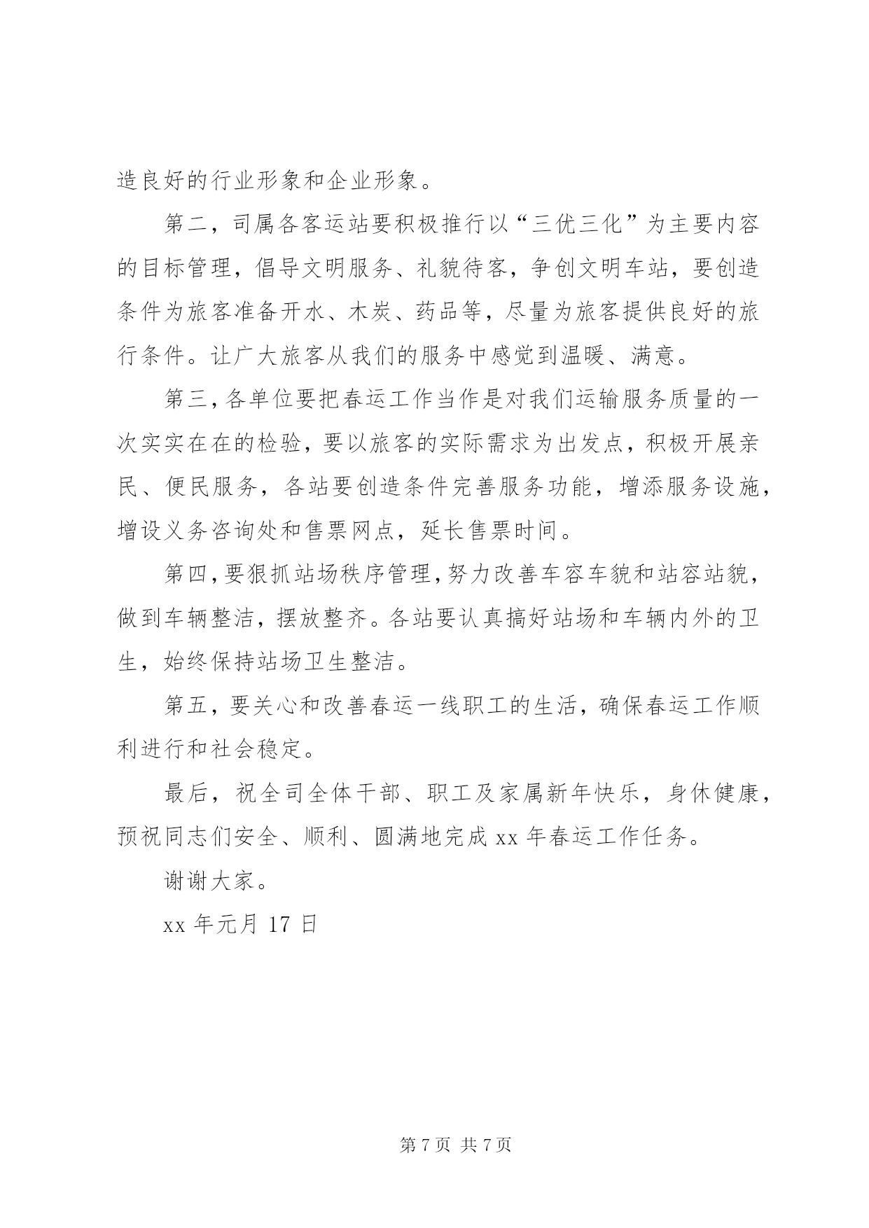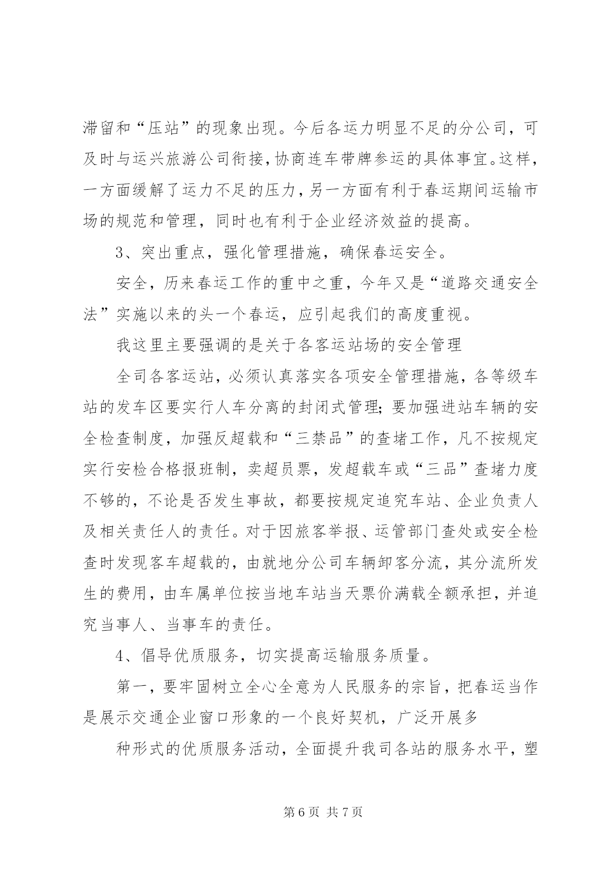 第PAGE\*Arabic\*MERGEFORMAT7页共NUMPAGES\*MERGEFORMAT7页交通企业春运工作会议发言提高认识狠抓落实认真做好xx年春节运输工作XX市汽车运输有限责任公司XX各位领导、同志们:xx年春运即将来临,根据国家规定,今年春节运输从1月25日开始,至3月5日结束,为期40天,即节前15天,节后25天,今天我司在此召开春运工作会议,传达部署和研究我司xx年的春运工作。下面,我就如何做好我司xx年春运工作讲几点意见:一、xx年春运工作的总体形势1、从对今年春运重视程度看,各级党委政府,交通主管部门将xx年的春运工作,提高到了实践“三个代表”重要思想,坚持以人为本,为民服务,和对执政能力的检验的高度。春运工作是一项涉及面广,综合性强,事关国家和人民生命财产安全及社会稳定的大事。必须增强我们的责任感和使命感,这充分体现了各级党和政府、交通主管部门对今年春运工作的高度重视。2、从对道路运输市场调查、预测情况看,预计全省客源总量为8526万人次,比去年同期下降1.2%,其中广东方向客源量为247.3万人次,比去年同期下降1.12%。我市公路客运量预计为107.9万人次,其中进出XX省客运量为10万人次,其他省际客运量为4万人次,跨地区为13.5万人次,与去年相比基本持平。可见,我们所承担的运输的任务和责任还是非常艰巨的。其原因,一是铁路部门继续采取“压货保客,停短保长”的运力调控措施。二是随着经济的发展,人民生活水平的提高,乘私家车出行的人员数量增加。三是东部沿XX县区经济的加速发展,原在广东的务工、经商人员已部分向淅、闽、上海转移。四是民工观念的转变,留在当地过年的人数增加。二、xx年春运工作的总体要求和工作目标1、总体要求是。坚持“以人为本,安全第一”的原则,紧紧抓住运输安全这个核心,按“以客为主、客货兼顾、安全有序、方便快捷”的春运工作指导思想,加强组织领导,科学调配运力,提高服务水平,规范市场秩序,确保安全有序。2、工作目标是。在确保安全的前提下,维护好稳定畅通的运输市场秩序,使广大旅客走得及时,走得舒心,走的满意。努力实现“安全、及时、有序、优质”的工作目标。以上要求,既是党和政府对运输企业的要求,也是对企业包括司乘人员、服务人员、基层骨干在内全体干部、职工的具体要求。三、xx年春运工作的主要特点1、全面启用《XX省道路春运及“黄金周”运输管理工作规范》,该工作规范从xx年1月1日起执行。今后有关“春运”及“黄金周”的具体工作程序均按此办理。如。运调配的四个原则。一是省内运输为主,省外援助为辅的原则。二是正班车为主,加班、包车为辅的原则。三是二级以上企业为主,其他企业和经营业户为辅的原则。四是班车客运为主,其他客运方式为辅的原则。同时还涉及到“三关一监督”,春运牌、证发放程序与规定,客运市场监管等。2、坚持“以人为本”,对安全提出了更高、更新的要求。一是要求抓好安全警示教育,层层落实安全责任制。春运期间,运输企业对运管机构必须做出安全生产承诺,并签订安全生产责任状,企业必须与承包车主及司乘人员签订安全生产责任状。二是实施承运人责任险制度。凡未按规定投保的客车,一律不得参加营运,并不予办理营运手续和春运证、加班、包车证手续。3、实施春运“顺畅为民”工程“顺畅为民”工程的实施,对我们运输企业和运管部门均提出了新的要求。一是要求各单位制定好服务和便民的具体措施,并层层落实到位。二是做好春运期间的投诉查处工作,对司乘人员和旅客的重大投诉,要在1小时内处理完毕。对上级运管机构要求查处或通报的情况要及时进行处理和反馈。三是营运车辆途中抛锚或其他问题需要接驳的,运管机构要积极督促或协助运输企业尽快组织运力接驳。四是要加强对春运运价的监管,各客运站要在候车大厅的主要位置设立运价咨询台,做好春运价格的宣传解释工作。目的就是树立良好的行业形象,营造良好的经营环境。4、建立了省际道路执法联动机制。主要内容。一是建立五省运管机构首接责任制。二是建立营运车辆违法通报制度。三是联合稽查执法,并统一执法标准。四、结合我司实际提出以下几点要求。1、统一思想,提高认识,增强做好春运工作的政治责任感、社会责任感和企业责任感。春运工作虽然已成为阶段性的常规工作,其工作的内容、程序和要求基本上已形成程序化、制度化,但具体到每年的春运,仍有别于往年的各种特殊情况,各级政府和上级主管部门对我们都相应地提出了新的要求,新的规定,如何在往年春运工作的基础上做到有新的突破;如何通过“春运”这一运输需求急剧增长、各级政府高度重视、社会各界密切关注的非常时期,提高“湘运”企业社会影响力、市场适应能力和竞争能力,展示行业风采,创新服务理念,是值得我们好好研究和探索的一个课题。认真组织好xx年的春运工作,并通过“春运”取得企业