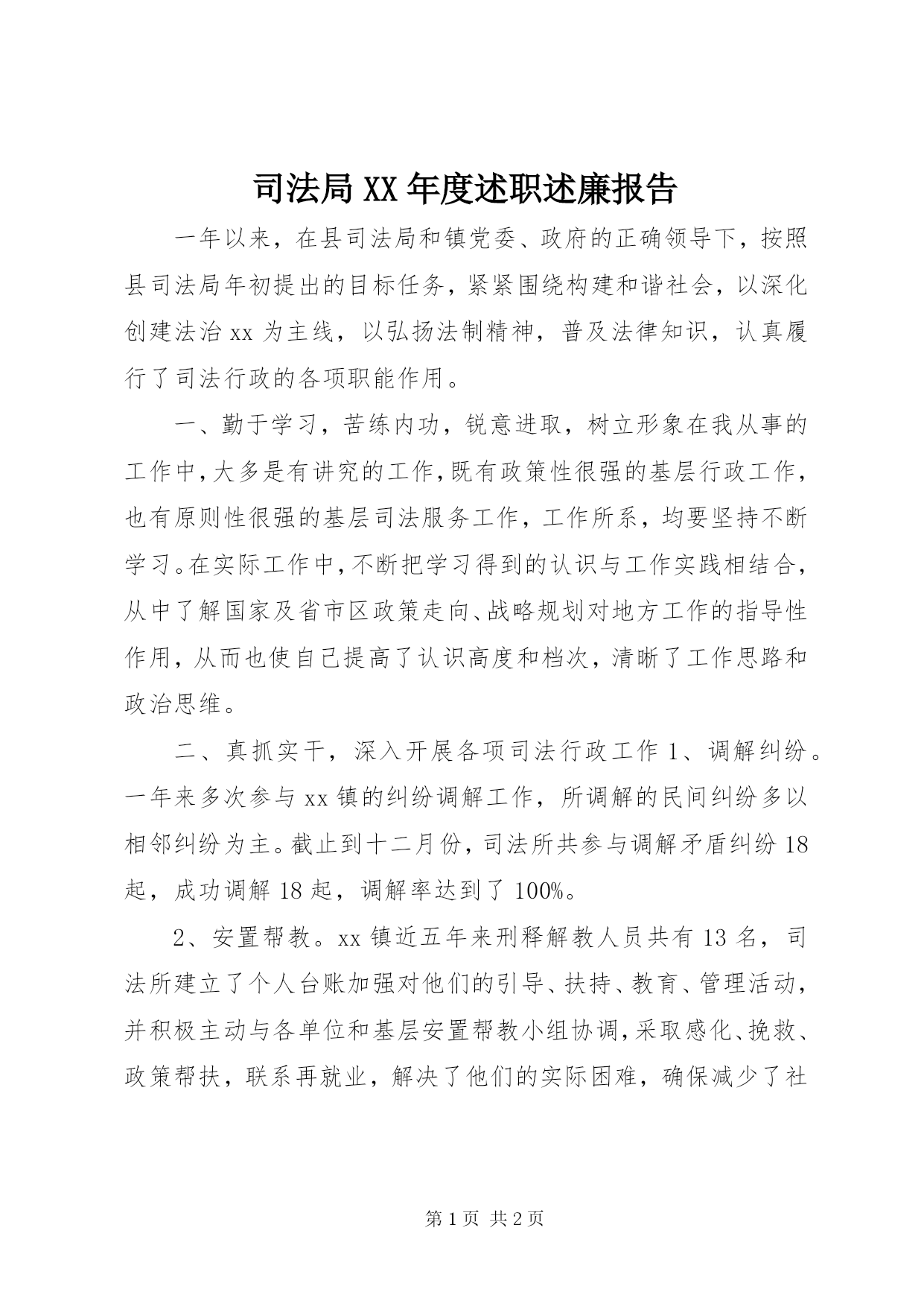 第PAGE\*Arabic\*MERGEFORMAT2页共NUMPAGES\*MERGEFORMAT2页司法局XX年度述职述廉报告一年以来,在县司法局和镇党委、政府的正确领导下,按照县司法局年初提出的目标任务,紧紧围绕构建和谐社会,以深化创建法治xx为主线,以弘扬法制精神,普及法律知识,认真履行了司法行政的各项职能作用。一、勤于学习,苦练内功,锐意进取,树立形象在我从事的工作中,大多是有讲究的工作,既有政策性很强的基层行政工作,也有原则性很强的基层司法服务工作,工作所系,均要坚持不断学习。在实际工作中,不断把学习得到的认识与工作实践相结合,从中了解国家及省市区政策走向、战略规划对地方工作的指导性作用,从而也使自己提高了认识高度和档次,清晰了工作思路和政治思维。二、真抓实干,深入开展各项司法行政工作1、调解纠纷。一年来多次参与xx镇的纠纷调解工作,所调解的民间纠纷多以相邻纠纷为主。截止到十二月份,司法所共参与调解矛盾纠纷18起,成功调解18起,调解率达到了100%。2、安置帮教。xx镇近五年来刑释解教人员共有13名,司法所建立了个人台账加强对他们的引导、扶持、教育、管理活动,并积极主动与各单位和基层安置帮教小组协调,采取感化、挽救、政策帮扶,联系再就业,解决了他们的实际困难,确保减少了社会不稳定的因素。
