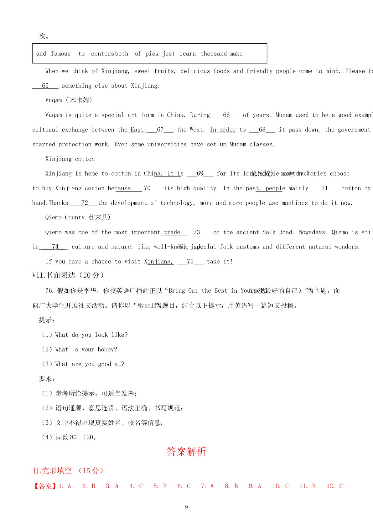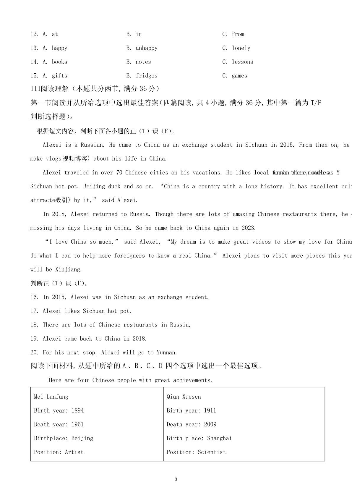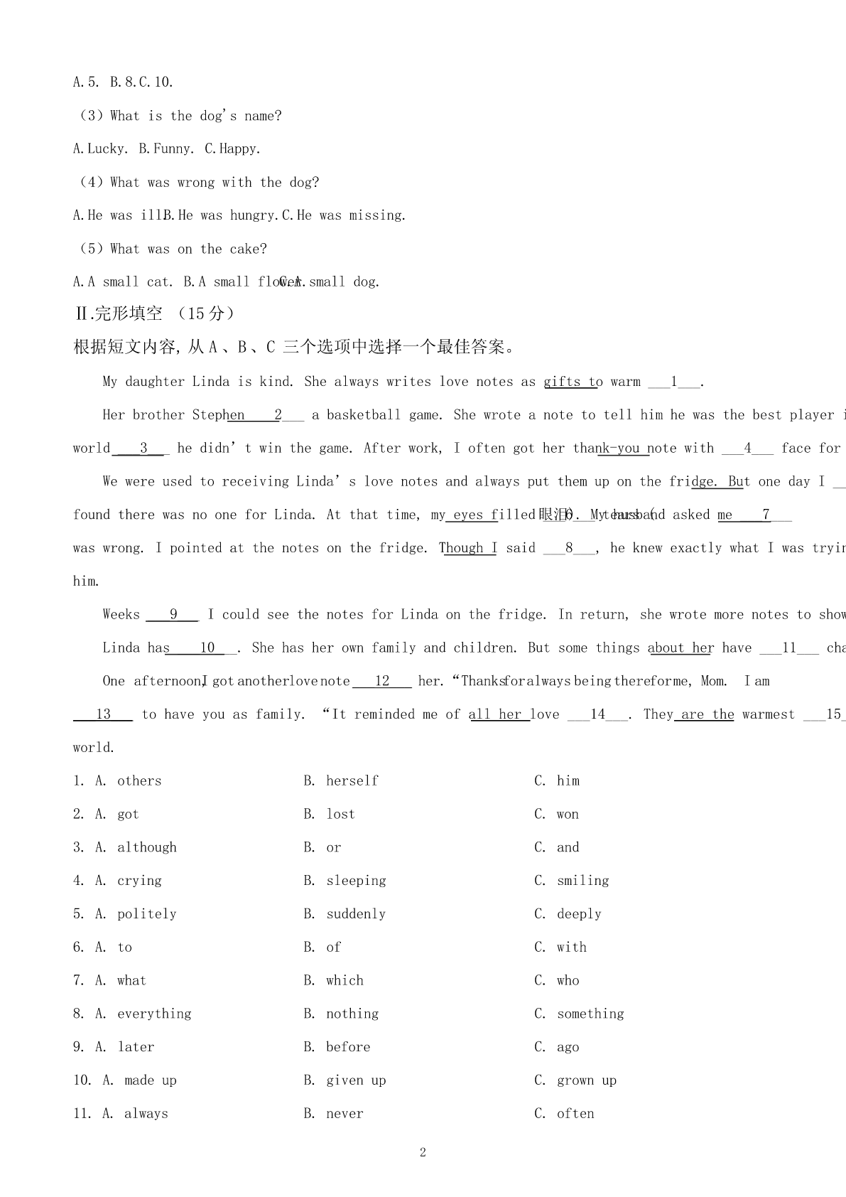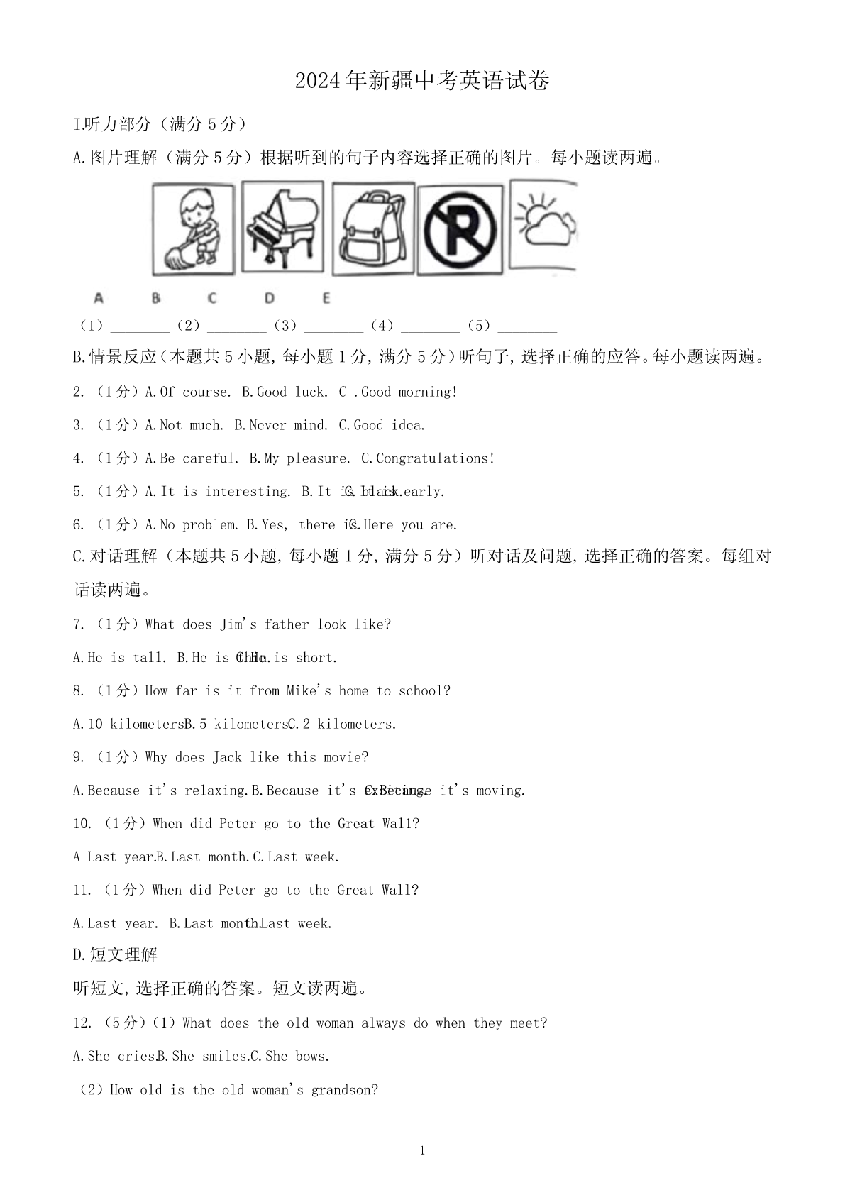 2024年新疆中考英语试卷I.听力部分(满分5分)A.图片理解(满分5分)根据听到的句子内容选择正确的图片。每小题读两遍。(1)________(2)________(3)________(4)________(5)________B.情景反应(本题共5小题,每小题1分,满分5分)听句子,选择正确的应答。每小题读两遍。2.(1分)A.Ofcourse.B.Goodluck.C.Goodmorning!3.(1分)A.Notmuch.B.Nevermind.C.Goodidea.4.(1分)A.Becareful.B.Mypleasure.C.Congratulations!5.(1分)A.Itisinteresting.B.ItisC.Itblack.isearly.6.(1分)A.Noproblem.B.Yes,thereis.C.Hereyouare.C.对话理解(本题共5小题,每小题1分,满分5分)听对话及问题,选择正确的答案。每组对话读两遍。7.(1分)WhatdoesJim'sfatherlooklike?A.Heistall.B.HeisC.Hethin.isshort.8.(1分)HowfarisitfromMike'shometoschool?A.10kilometers.B.5kilometers.C.2kilometers.9.(1分)WhydoesJacklikethismovie?A.Becauseit'srelaxing.B.Becauseit'sexciting.C.Becauseit'smoving.10.(1分)WhendidPetergototheGreatWal1?ALastyear.B.Lastmonth.C.Lastweek.11.(1分)WhendidPetergototheGreatWall?A.Lastyear.B.Lastmonth.C.Lastweek.D.短文理解听短文,选择正确的答案。短文读两遍。12.(5分)(1)Whatdoestheoldwomanalwaysdowhentheymeet?A.Shecries.B.Shesmiles.C.Shebows.(2)Howoldistheoldwoman'sgrandson?1A.5.B.8.C.10.(3)Whatisthedog'sname?A.Lucky.B.Funny.C.Happy.(4)Whatwaswrongwiththedog?A.Hewasill.B.Hewashungry.C.Hewasmissing.(5)Whatwasonthecake?A.Asmallcat.B.Asmallflower.C.Asmalldog.Ⅱ.完形填空(15分)根据短文内容,从A、B、C三个选项中选择一个最佳答案。MydaughterLindaiskind.Shealwayswriteslovenotesasgiftstowarm___1___.HerbrotherStephen___2___abasketballgame.Shewroteanotetotellhimhewasthebestplayerintheworld___3___hedidn’twinthegame.Afterwork,Ioftengotherthank-younotewith___4___faceformyefforts.WewereusedtoreceivingLinda’slovenotesandalwaysputthemuponthefridge.ButonedayI___5___foundtherewasnooneforLinda.Atthattime,myeyesfilled眼泪___6___).Mytearshusband(askedme___7___waswrong.Ipointedatthenotesonthefridge.ThoughIsaid___8___,heknewexactlywhatIwastryingtotellhim.Weeks___9___IcouldseethenotesforLindaonthefridge.Inreturn,shewrotemorenotestoshowherlove.Lindahas___10___.Shehasherownfamilyandchildren.Butsomethingsaboutherhave___11___changed.Oneafternoon,Igotanotherlovenote___1
