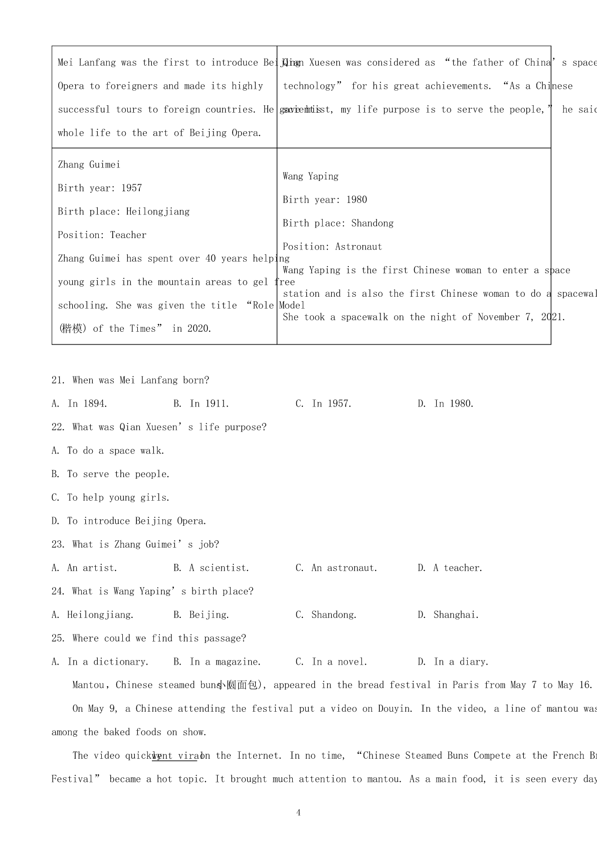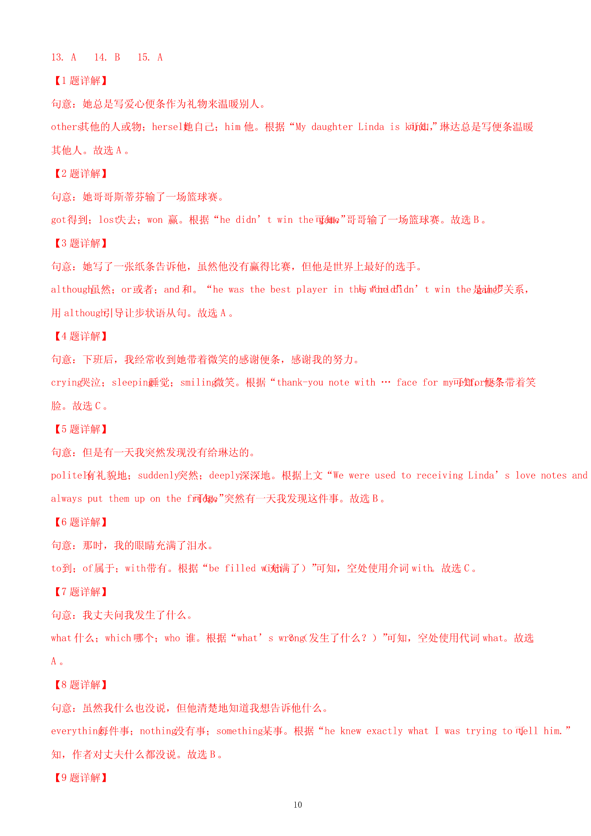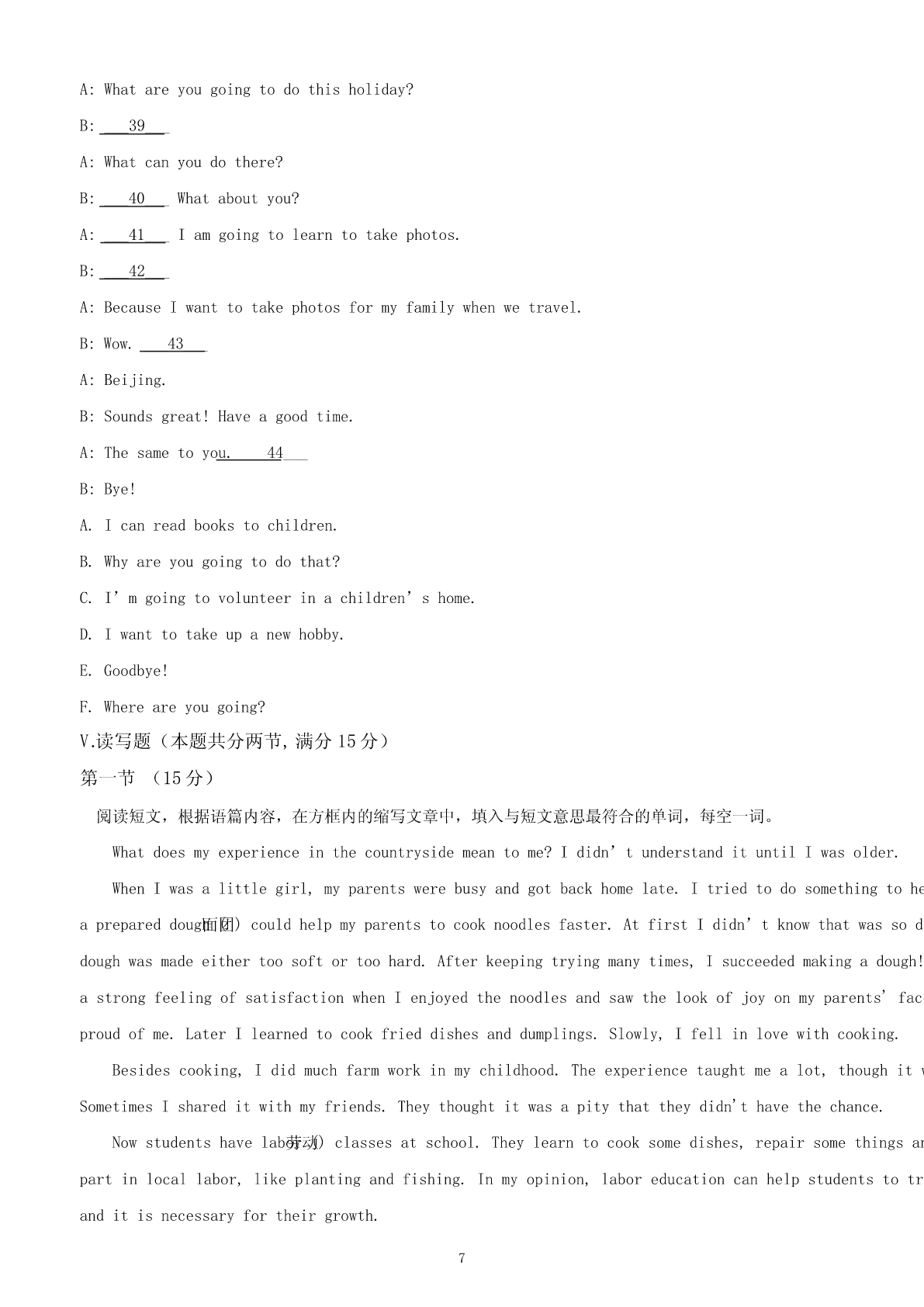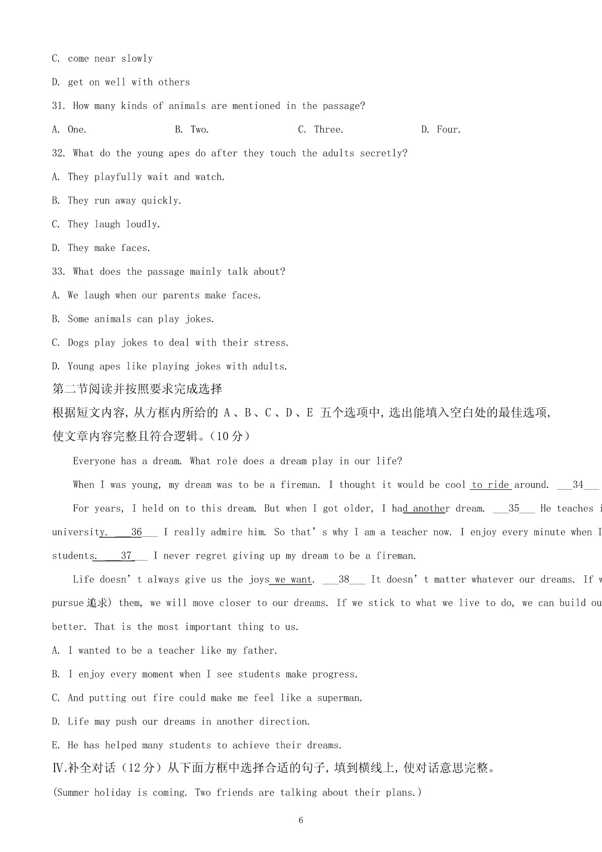 2024年新疆中考英语试卷I.听力部分(满分5分)A.图片理解(满分5分)根据听到的句子内容选择正确的图片。每小题读两遍。(1)________(2)________(3)________(4)________(5)________B.情景反应(本题共5小题,每小题1分,满分5分)听句子,选择正确的应答。每小题读两遍。2.(1分)A.Ofcourse.B.Goodluck.C.Goodmorning!3.(1分)A.Notmuch.B.Nevermind.C.Goodidea.4.(1分)A.Becareful.B.Mypleasure.C.Congratulations!5.(1分)A.Itisinteresting.B.ItisC.Itblack.isearly.6.(1分)A.Noproblem.B.Yes,thereis.C.Hereyouare.C.对话理解(本题共5小题,每小题1分,满分5分)听对话及问题,选择正确的答案。每组对话读两遍。7.(1分)WhatdoesJim'sfatherlooklike?A.Heistall.B.HeisC.Hethin.isshort.8.(1分)HowfarisitfromMike'shometoschool?A.10kilometers.B.5kilometers.C.2kilometers.9.(1分)WhydoesJacklikethismovie?A.Becauseit'srelaxing.B.Becauseit'sexciting.C.Becauseit'smoving.10.(1分)WhendidPetergototheGreatWal1?ALastyear.B.Lastmonth.C.Lastweek.11.(1分)WhendidPetergototheGreatWall?A.Lastyear.B.Lastmonth.C.Lastweek.D.短文理解听短文,选择正确的答案。短文读两遍。12.(5分)(1)Whatdoestheoldwomanalwaysdowhentheymeet?A.Shecries.B.Shesmiles.C.Shebows.(2)Howoldistheoldwoman'sgrandson?1A.5.B.8.C.10.(3)Whatisthedog'sname?A.Lucky.B.Funny.C.Happy.(4)Whatwaswrongwiththedog?A.Hewasill.B.Hewashungry.C.Hewasmissing.(5)Whatwasonthecake?A.Asmallcat.B.Asmallflower.C.Asmalldog.Ⅱ.完形填空(15分)根据短文内容,从A、B、C三个选项中选择一个最佳答案。MydaughterLindaiskind.Shealwayswriteslovenotesasgiftstowarm___1___.HerbrotherStephen___2___abasketballgame.Shewroteanotetotellhimhewasthebestplayerintheworld___3___hedidn’twinthegame.Afterwork,Ioftengotherthank-younotewith___4___faceformyefforts.WewereusedtoreceivingLinda’slovenotesandalwaysputthemuponthefridge.ButonedayI___5___foundtherewasnooneforLinda.Atthattime,myeyesfilled眼泪___6___).Mytearshusband(askedme___7___waswrong.Ipointedatthenotesonthefridge.ThoughIsaid___8___,heknewexactlywhatIwastryingtotellhim.Weeks___9___IcouldseethenotesforLindaonthefridge.Inreturn,shewrotemorenotestoshowherlove.Lindahas___10___.Shehasherownfamilyandchildren.Butsomethingsaboutherhave___11___changed.Oneafternoon,Igotanotherlovenote___1