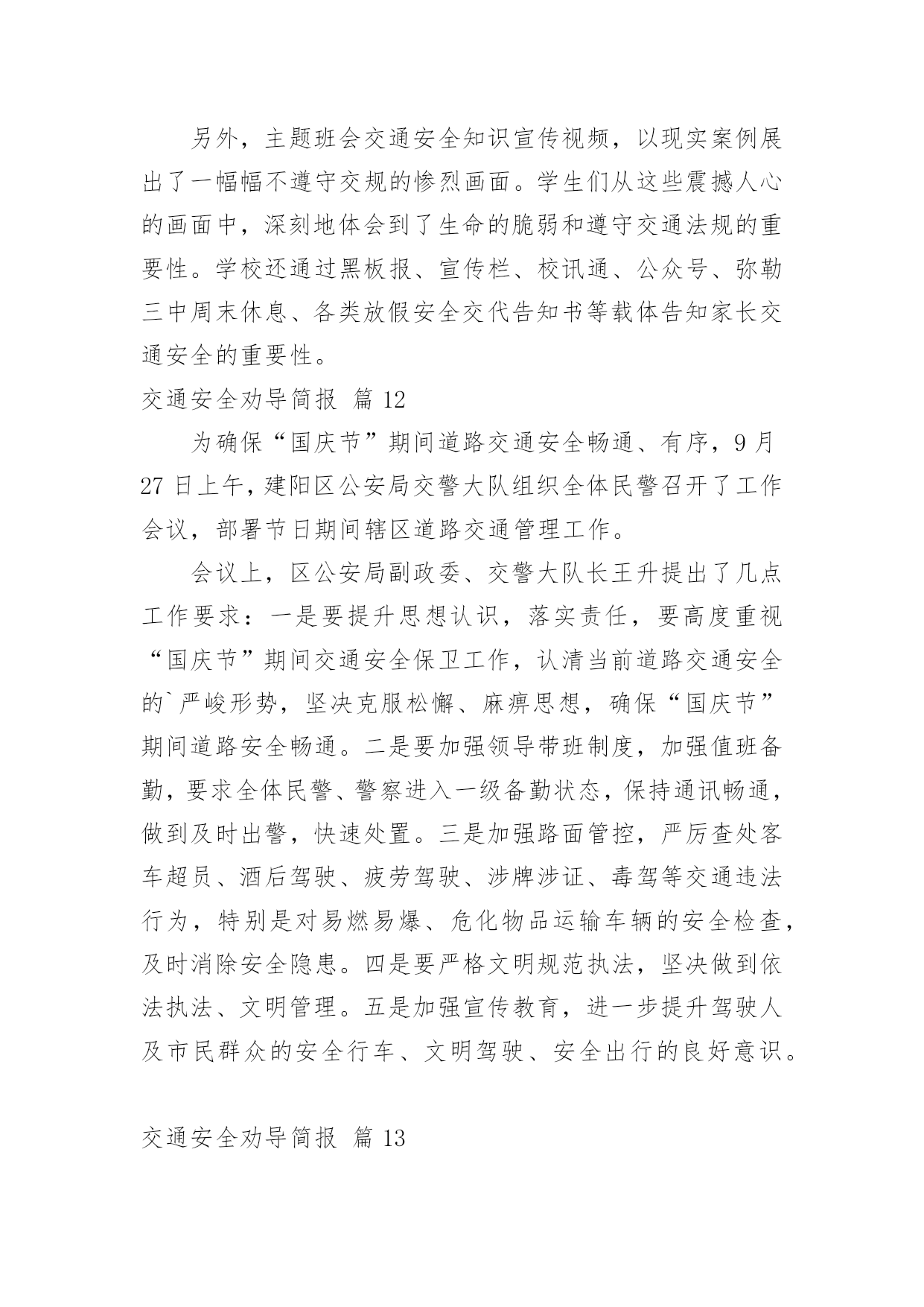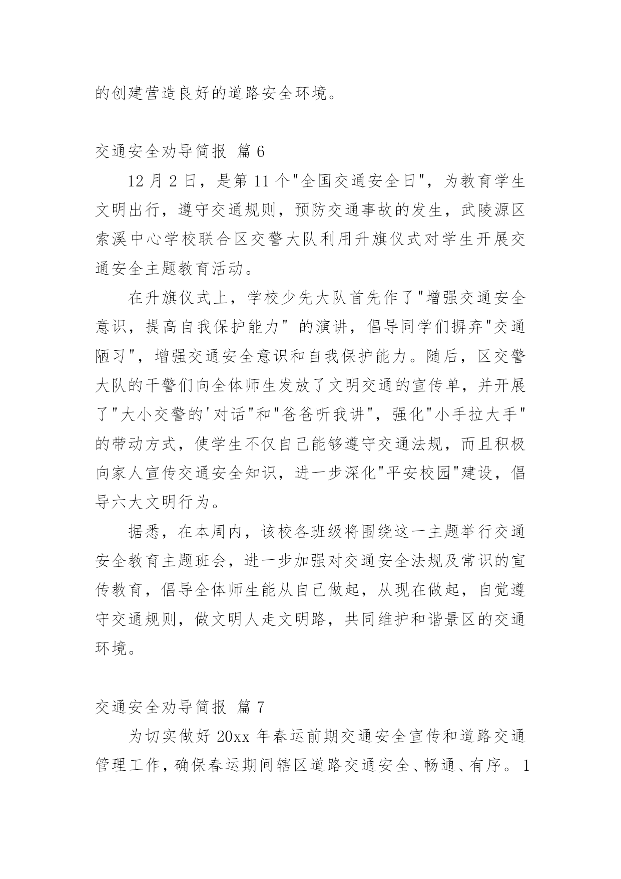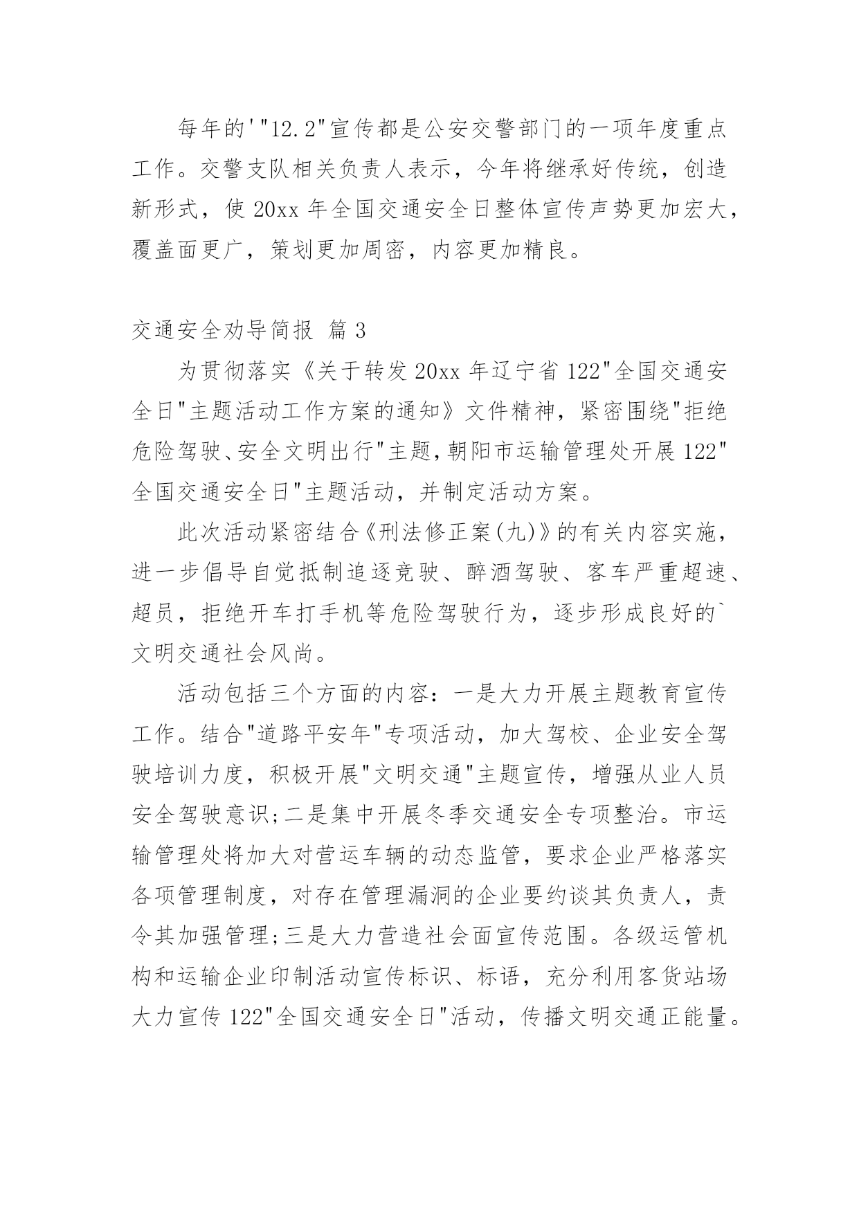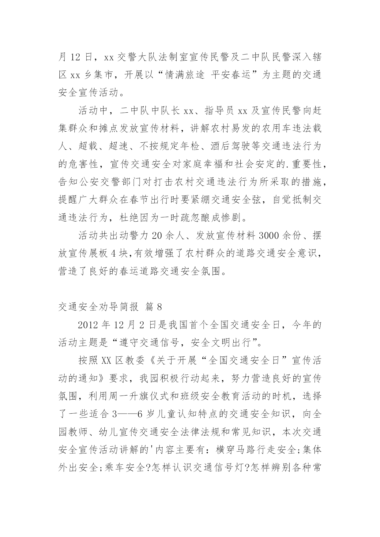 交通安全劝导简报在生活、工作和学习中,简报的使用频率呈上升趋势,简报一般都有固定的报头,包括简报的名称、期号、编发单位、发行日期、保密等级和编号。那要怎么写好简报呢?下面是小编精心整理的交通安全劝导简报范文,供大家参考借鉴,希望可以帮助到有需要的朋友。交通安全劝导简报篇1今年12月2日是我国第11个"全国交通安全日"。近日,公安部、中央文明办、教育部、司法部、交通运输部、国家安全生产监督管理总局联合下发方案,确定今年主题为"拒绝危险驾驶、安全文明出行",并将在全国开展相关活动。今年年初以来,成都女司机因"路怒"被打、占用应急车道延误伤者救治等涉及交通问题的社会事件相继发生,引发舆论热议。11月1日,《刑法修正案(九)》正式实施,将校车、旅客运输车辆严重超速、超员、非法运输危险化学品等严重危害公共安全的行为纳入危险驾驶罪。今年"全国交通安全日"将针对这些热点组织主题活动,进一步倡导通行规则意识、守法自律意识、社会责任意识、文明交通意识、公共道德意识,倡导抵制追逐竞驶、醉酒驾驶等构成危险驾驶罪的交通违法,抵制"路怒"、不礼让斑马线、占用应急车道等危险驾驶行为。根据方案要求,各地将进行联合部署,针对在道路上驾驶未取得校车使用许可的.机动车从事校车业务或者校车、旅客运输车辆严重超员、严重超速,违规运输危险化学品等危险驾驶行为开展集中整治;在城市道路着重整治追逐竞驶、酒驾、闯红灯、不礼让斑马线等危险驾驶行为,在高速公路着重整治超速、货车占道行驶、占用应急车道等违法行为;在农村道路着重整治面包车超员、货车违法载人、摩托车无牌无证等突出违法行为。在源头对违法违规突出的运输企业,集中约谈企业负责人;对问题严重的,依法追究企业负责人、安全管理人员的责任。交通安全劝导简报篇2为组织开展第11个"全国交通安全日"主题活动,在全社会营造共同关注交通安全,携手创建文明交通的良好氛围,11月14日下午,萍乡市公安局交警支队召开"全国交通安全日"主题宣传活动媒体联席会。萍乡市交警支队法宣科科长余汉章介绍了萍乡市20xx年全国交通安全日活动。各交警大队负责人汇报辖区"全国交通安全日"工作重点安排。新闻媒体代表对"全国交通安全日"活动策划提出建议,并结合自身特点和优势提出宣传报道方案。参会的新闻媒体相关负责人表示,将在传统媒体和新媒体中大力弘扬交通法治精神,通过丰富多彩的宣传活动为"全国交通安全日"造势,以"接地气"的报道方式将文明交通理念根植于社会公众的内心,达到良好地传播效果。每年的'"12.2"宣传都是公安交警部门的一项年度重点工作。交警支队相关负责人表示,今年将继承好传统,创造新形式,使20xx年全国交通安全日整体宣传声势更加宏大,覆盖面更广,策划更加周密,内容更加精良。交通安全劝导简报篇3为贯彻落实《关于转发20xx年辽宁省122"全国交通安全日"主题活动工作方案的通知》文件精神,紧密围绕"拒绝危险驾驶、安全文明出行"主题,朝阳市运输管理处开展122"全国交通安全日"主题活动,并制定活动方案。此次活动紧密结合《刑法修正案(九)》的有关内容实施,进一步倡导自觉抵制追逐竞驶、醉酒驾驶、客车严重超速、超员,拒绝开车打手机等危险驾驶行为,逐步形成良好的`文明交通社会风尚。活动包括三个方面的内容:一是大力开展主题教育宣传工作。结合"道路平安年"专项活动,加大驾校、企业安全驾驶培训力度,积极开展"文明交通"主题宣传,增强从业人员安全驾驶意识;二是集中开展冬季交通安全专项整治。市运输管理处将加大对营运车辆的动态监管,要求企业严格落实各项管理制度,对存在管理漏洞的企业要约谈其负责人,责令其加强管理;三是大力营造社会面宣传范围。各级运管机构和运输企业印制活动宣传标识、标语,充分利用客货站场大力宣传122"全国交通安全日"活动,传播文明交通正能量。交通安全劝导简报篇4为全面推动第11个"122全国交通安全日"宣传活动的开展,在全社会营造共同关注交通安全、携手创建文明交通的良好氛围,靖安县公安局交警大队结合今年"社会协同治理安全文明出行"主题深入中小学校开展形式多样的`宣传活动,取得较好成效。11月24日上午10时许,靖安县公安局交警大队法制科民警携带第11个"122全国交通安全日"宣传展板、课件、杂志等资料,联同靖安县电视台《法治靖安》节目记者一行深入靖安县第二小学,开展"122全国交通安全日"宣教活动。民警通过丰富多彩的LED显示屏公布主题、摆放宣传展板、课堂讲座、发放宣传杂志等形式,与学生们亲切互动,达到了良好的宣教效果。交通安全劝导简报篇5为扎实推进创建全国文明城市攻坚工作,近日,况场街道办事处组织交管办、安办、派出所、交警四中队、司法所对辖区内的来往车辆进行了交通安全大排查。主要以排查非法营运、超载车辆及无证驾驶为重点内容,共检查车辆13辆,其中摩托车7辆,
